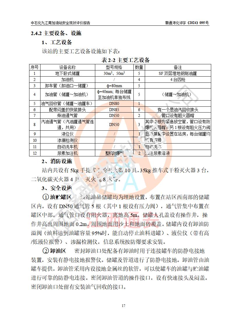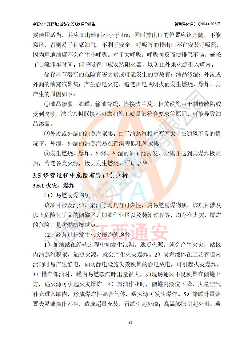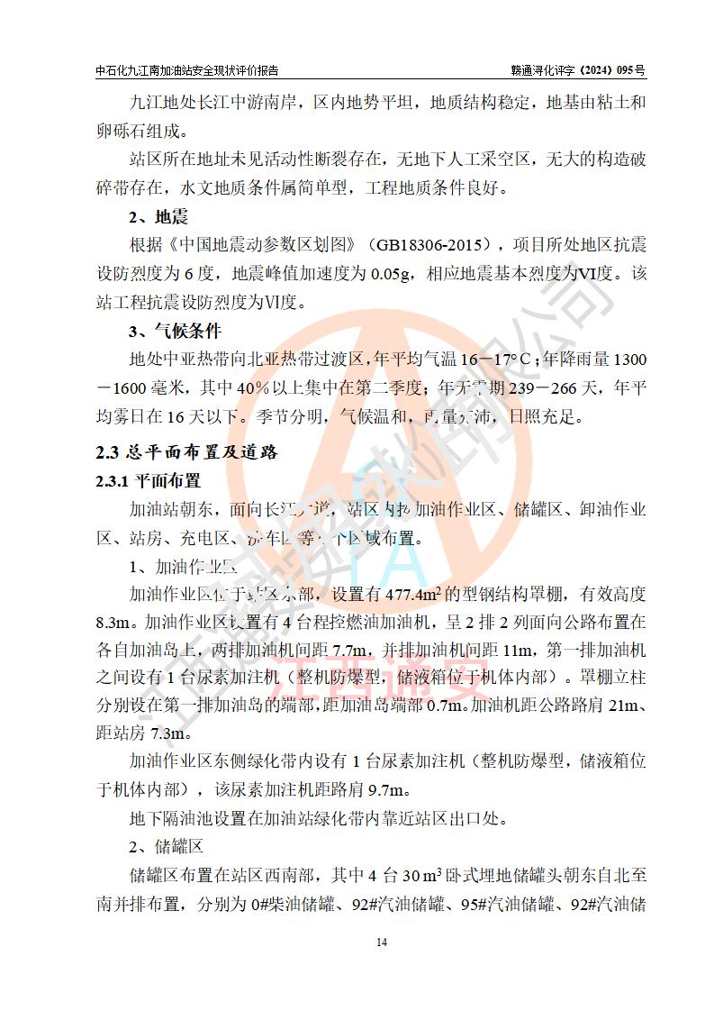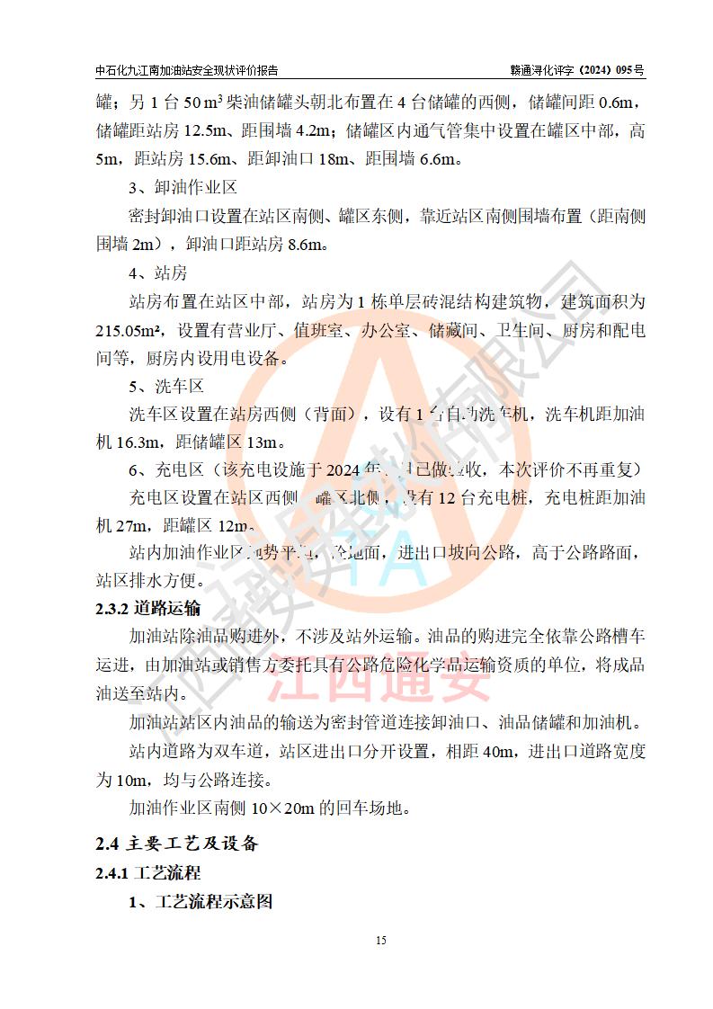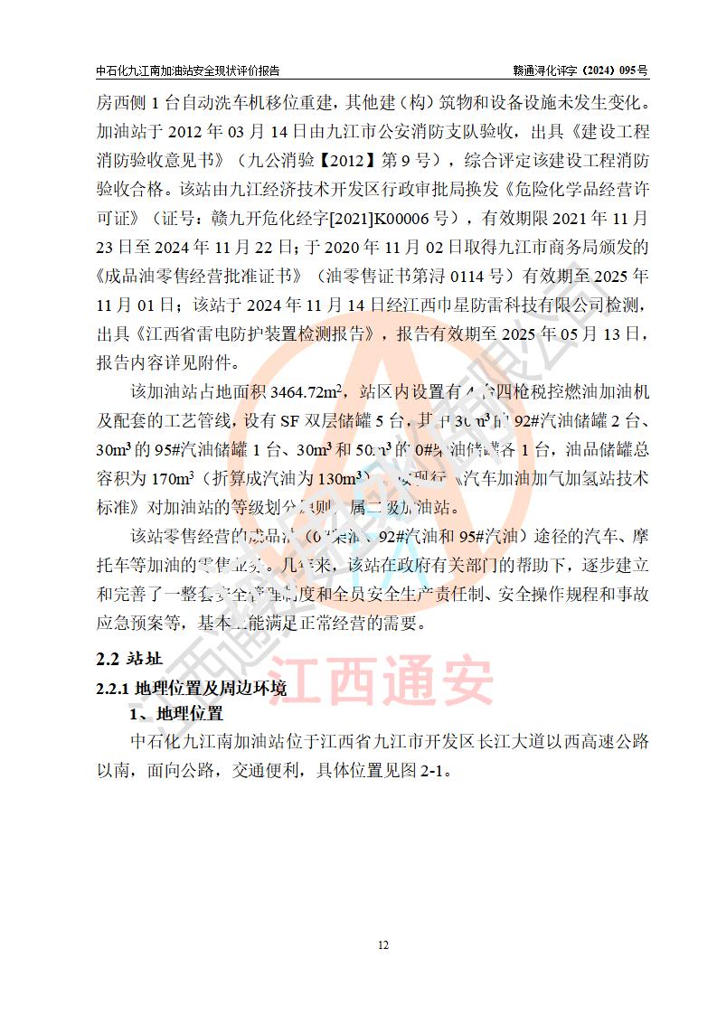 項目簡介 | 中國石化銷售股份有限公司江西九江潯陽石油分公司九江南加油站(以下簡稱“中石化九江南加油站”)是一家專門從事成品油零售經(jīng)營的有限公司分公司(外商投資企業(yè)分公司),經(jīng)營場所位于江西省九江市開發(fā)區(qū)長江大道以西高速公路以南?,F(xiàn)有從業(yè)人員9名,其中安全管理人員1人,加油站負責(zé)人熊瑋。 該加油站占地面積3464.72m2,站區(qū)內(nèi)設(shè)置有4臺四槍稅控燃油加油機及配套的工藝管線,設(shè)有SF雙層儲罐5臺,其中30m3的92#汽油儲罐2臺、30m3的95#汽油儲罐1臺、30m3和50m3的0#柴油儲罐各1臺,油品儲罐總?cè)莘e為170m3(折算成汽油為130m3),按現(xiàn)行《汽車加油加氣加氫站技術(shù)標(biāo)準(zhǔn)》對加油站的等級劃分原則,屬二級加油站。 該站由九江經(jīng)濟技術(shù)開發(fā)區(qū)行政審批局換發(fā)《危險化學(xué)品經(jīng)營許可證》(證號:贛九開?;?jīng)字[2021]K00006號),**期限2021年11月23日至2024年11月22日。 | |||
