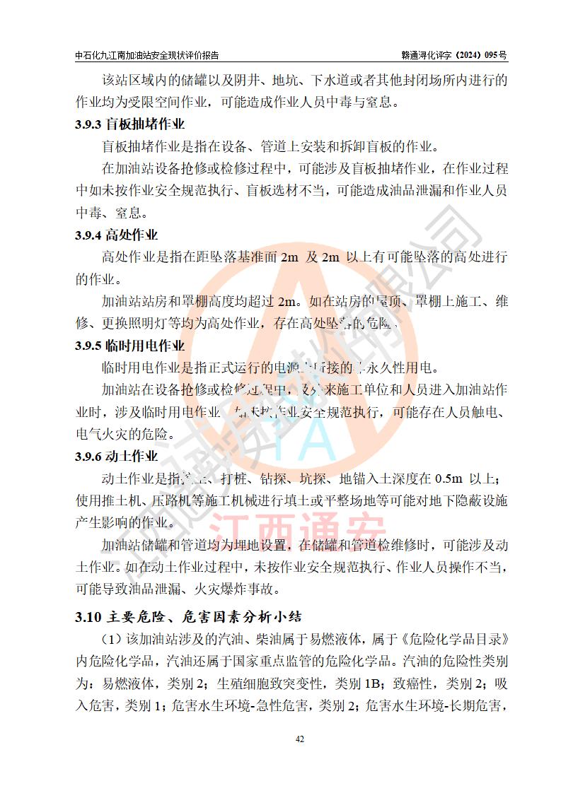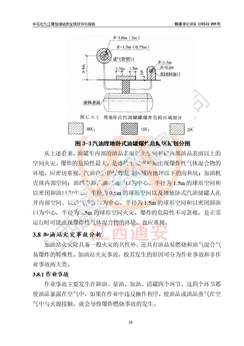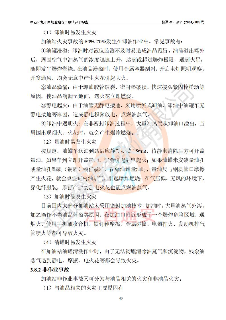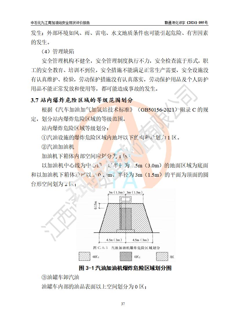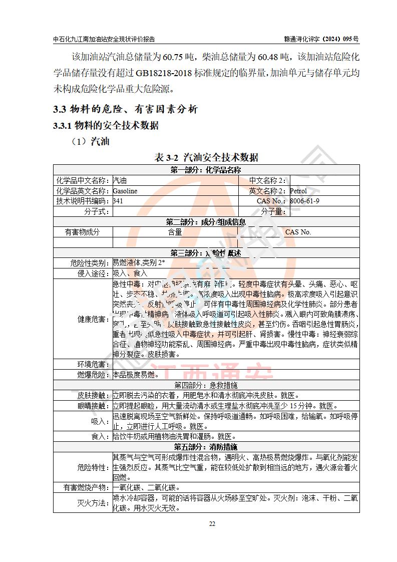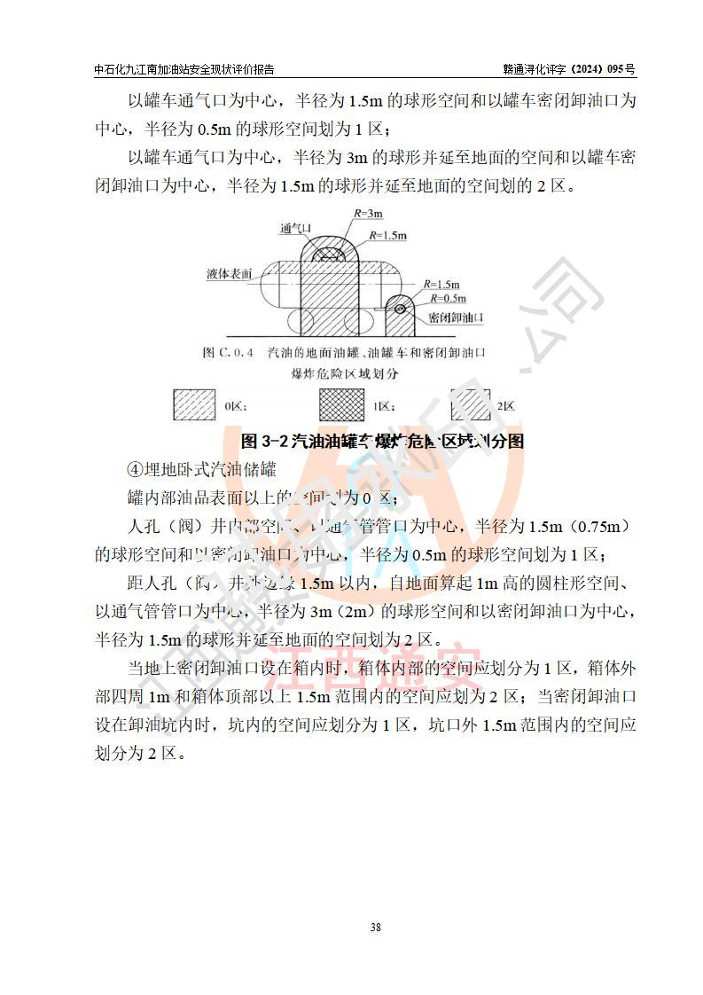 項目簡介 | 中國石化銷售股份有限公司江西九江潯陽石油分公司九江南加油站(以下簡稱“中石化九江南加油站”)是一家專門從事成品油零售經(jīng)營的有限公司分公司(外商投資企業(yè)分公司),經(jīng)營場所位于江西省九江市開發(fā)區(qū)長江大道以西高速公路以南?,F(xiàn)有從業(yè)人員9名,其中安全管理人員1人,加油站負責(zé)人熊瑋。 該加油站占地面積3464.72m2,站區(qū)內(nèi)設(shè)置有4臺四槍稅控燃油加油機及配套的工藝管線,設(shè)有SF雙層儲罐5臺,其中30m3的92#汽油儲罐2臺、30m3的95#汽油儲罐1臺、30m3和50m3的0#柴油儲罐各1臺,油品儲罐總?cè)莘e為170m3(折算成汽油為130m3),按現(xiàn)行《汽車加油加氣加氫站技術(shù)標(biāo)準(zhǔn)》對加油站的等級劃分原則,屬二級加油站。 該站由九江經(jīng)濟技術(shù)開發(fā)區(qū)行政審批局換發(fā)《危險化學(xué)品經(jīng)營許可證》(證號:贛九開?;?jīng)字[2021]K00006號),**期限2021年11月23日至2024年11月22日。 | |||