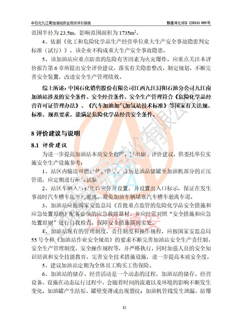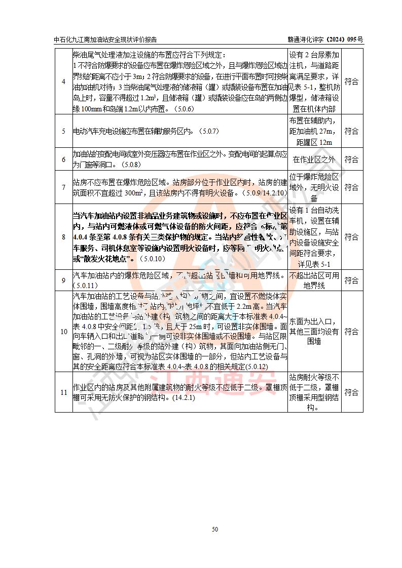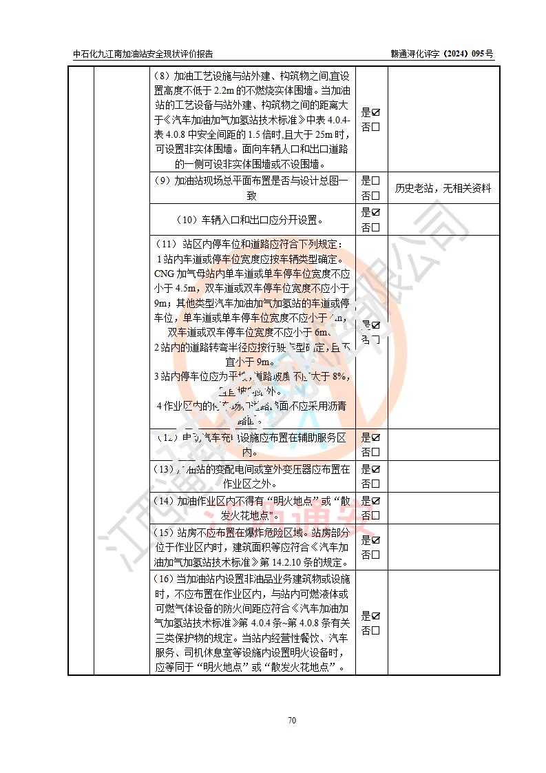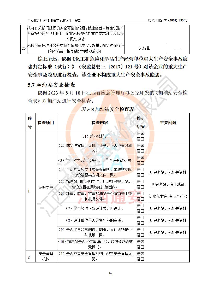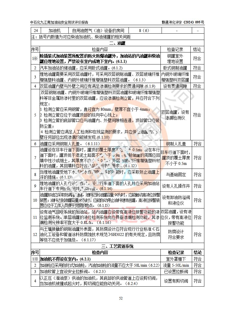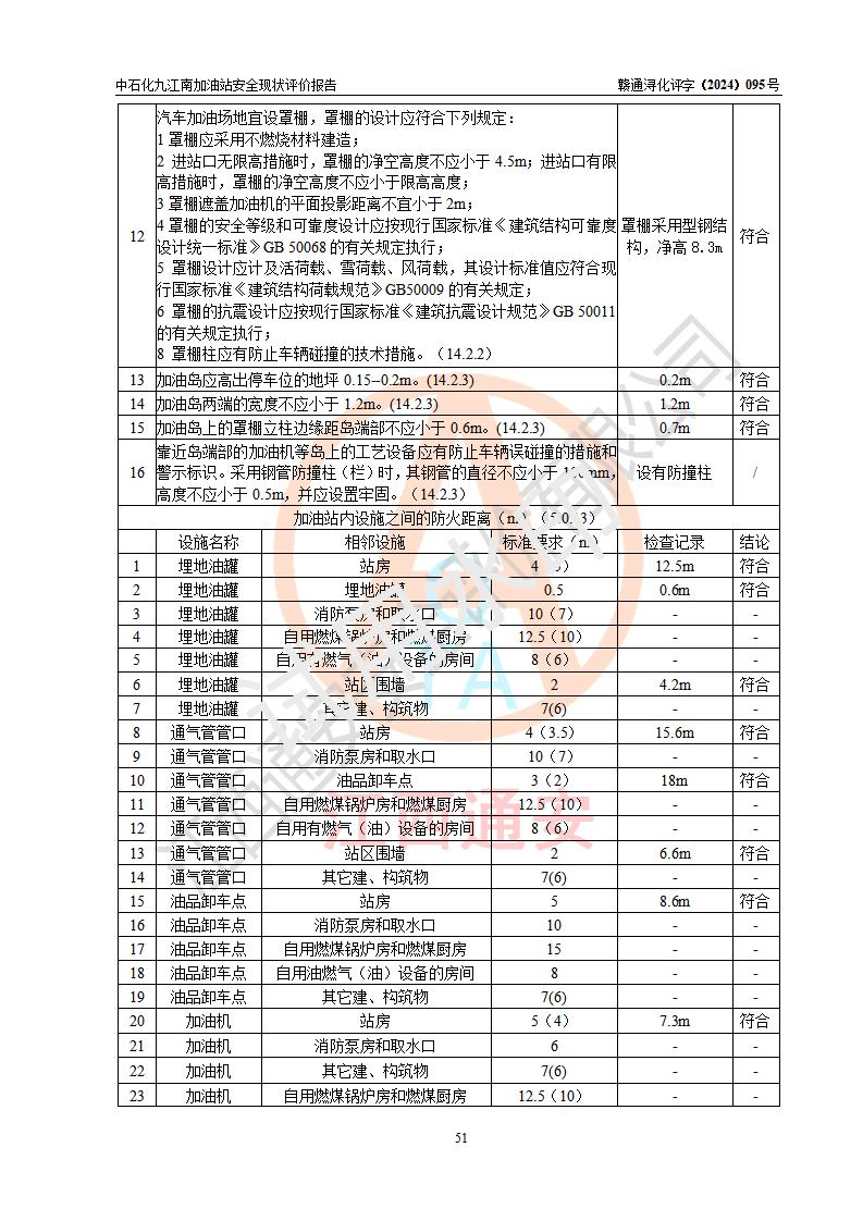 評價結(jié)論 | 中國石化銷售股份有限公司江西九江潯陽石油分公司九江南加油站涉及的安全條件、安全經(jīng)營條件、安全生產(chǎn)管理符合《危險化學(xué)品經(jīng)營許可證管理辦法》、《汽車加油加氣加氫站技術(shù)標(biāo)準(zhǔn)》等**有關(guān)法規(guī)、標(biāo)準(zhǔn)、規(guī)范要求,能滿足危險化學(xué)品經(jīng)營安全條件。 | |||