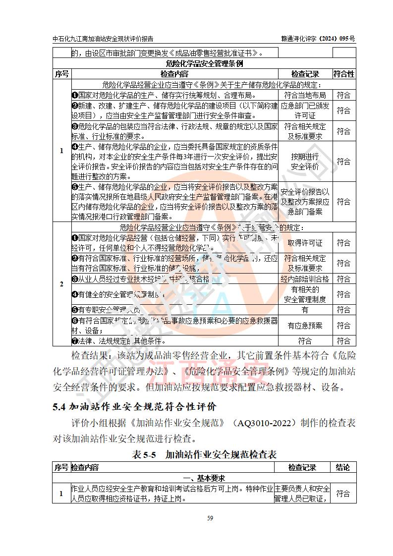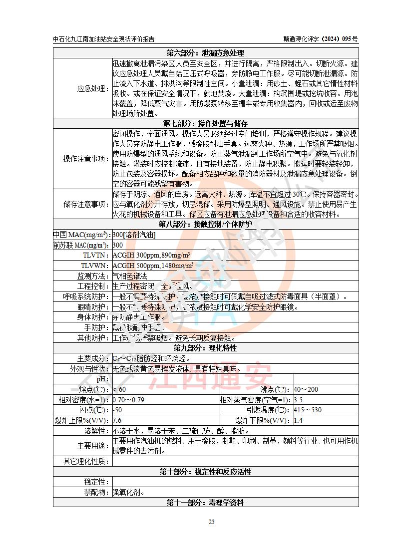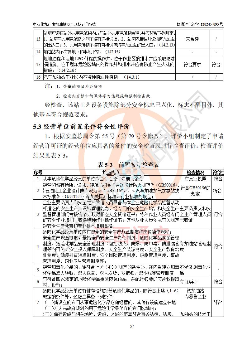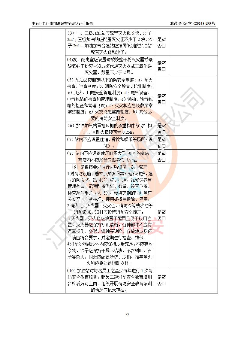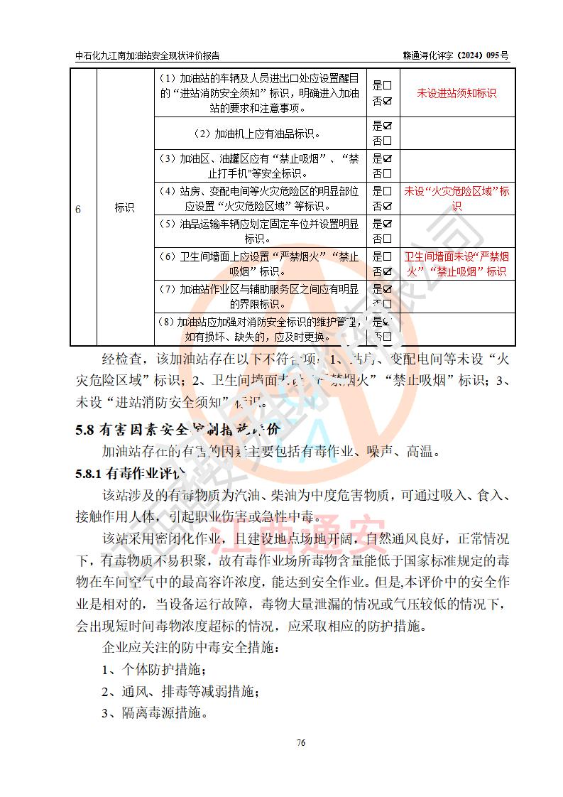 評價結(jié)論 | 中國石化銷售股份有限公司江西九江潯陽石油分公司九江南加油站涉及的安全條件、安全經(jīng)營條件、安全生產(chǎn)管理符合《危險化學(xué)品經(jīng)營許可證管理辦法》、《汽車加油加氣加氫站技術(shù)標(biāo)準(zhǔn)》等**有關(guān)法規(guī)、標(biāo)準(zhǔn)、規(guī)范要求,能滿足危險化學(xué)品經(jīng)營安全條件。 | |||