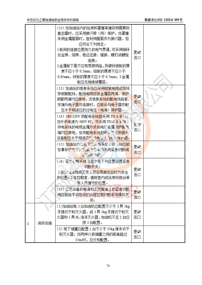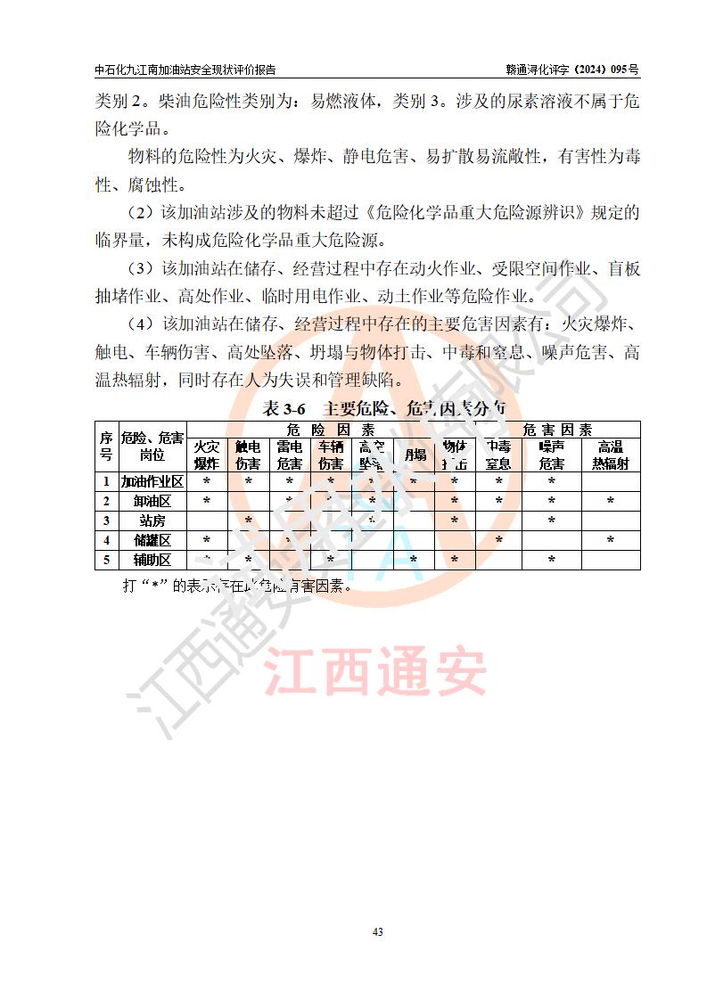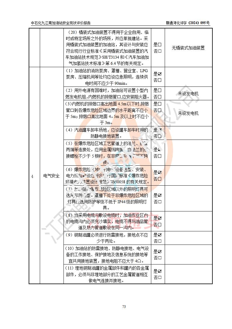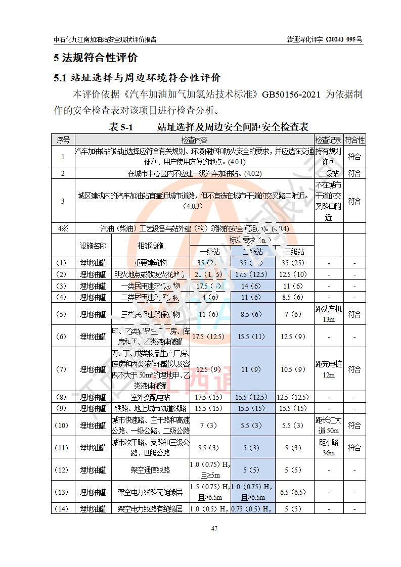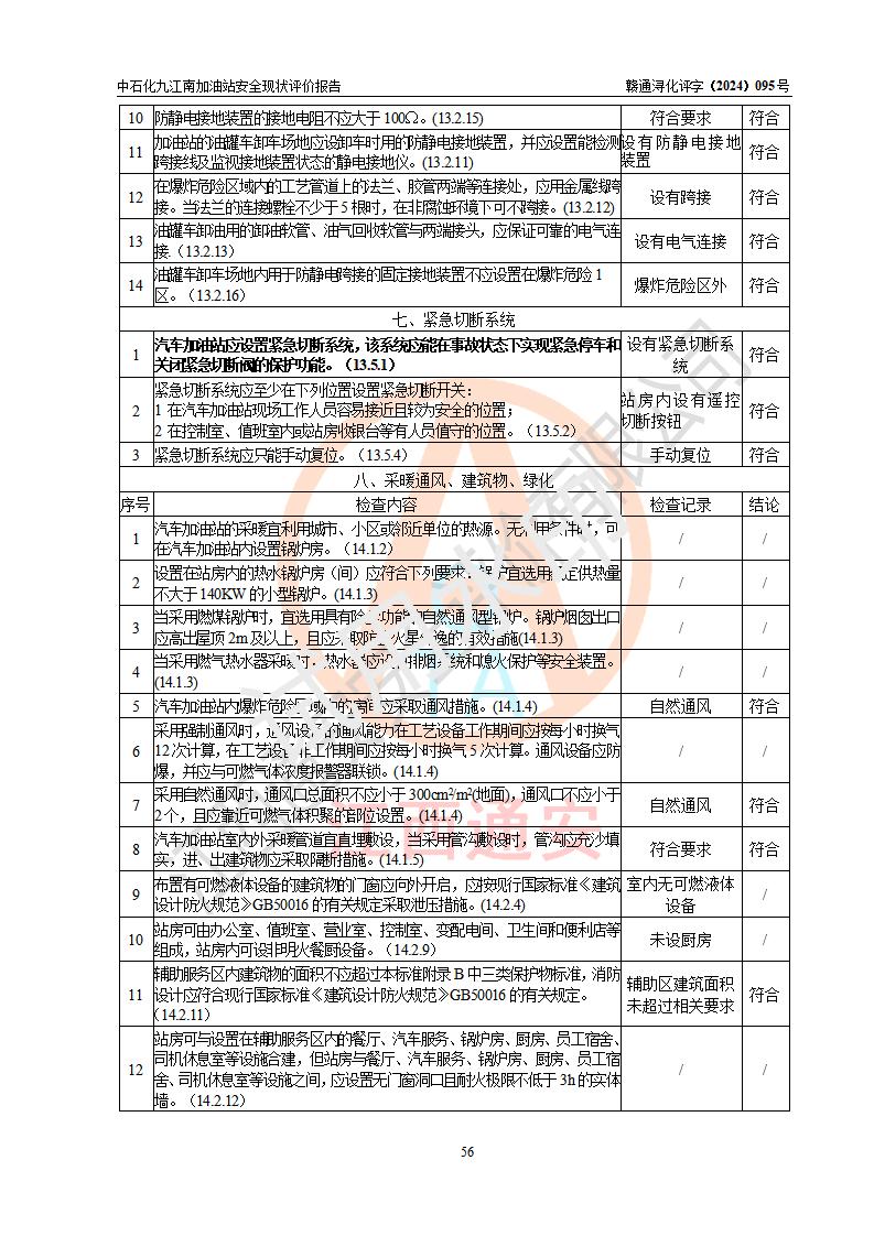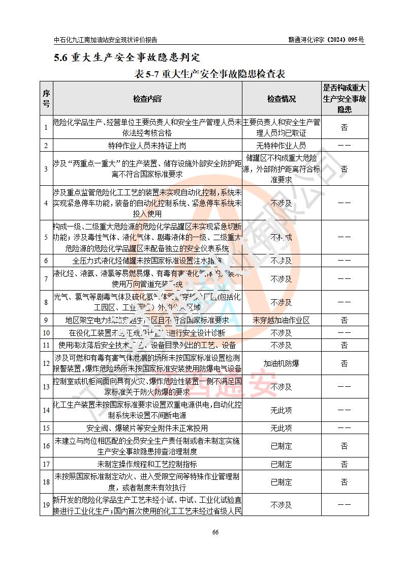 評價結(jié)論 | 中國石化銷售股份有限公司江西九江潯陽石油分公司九江南加油站涉及的安全條件、安全經(jīng)營條件、安全生產(chǎn)管理符合《危險化學(xué)品經(jīng)營許可證管理辦法》、《汽車加油加氣加氫站技術(shù)標(biāo)準(zhǔn)》等**有關(guān)法規(guī)、標(biāo)準(zhǔn)、規(guī)范要求,能滿足危險化學(xué)品經(jīng)營安全條件。 | |||