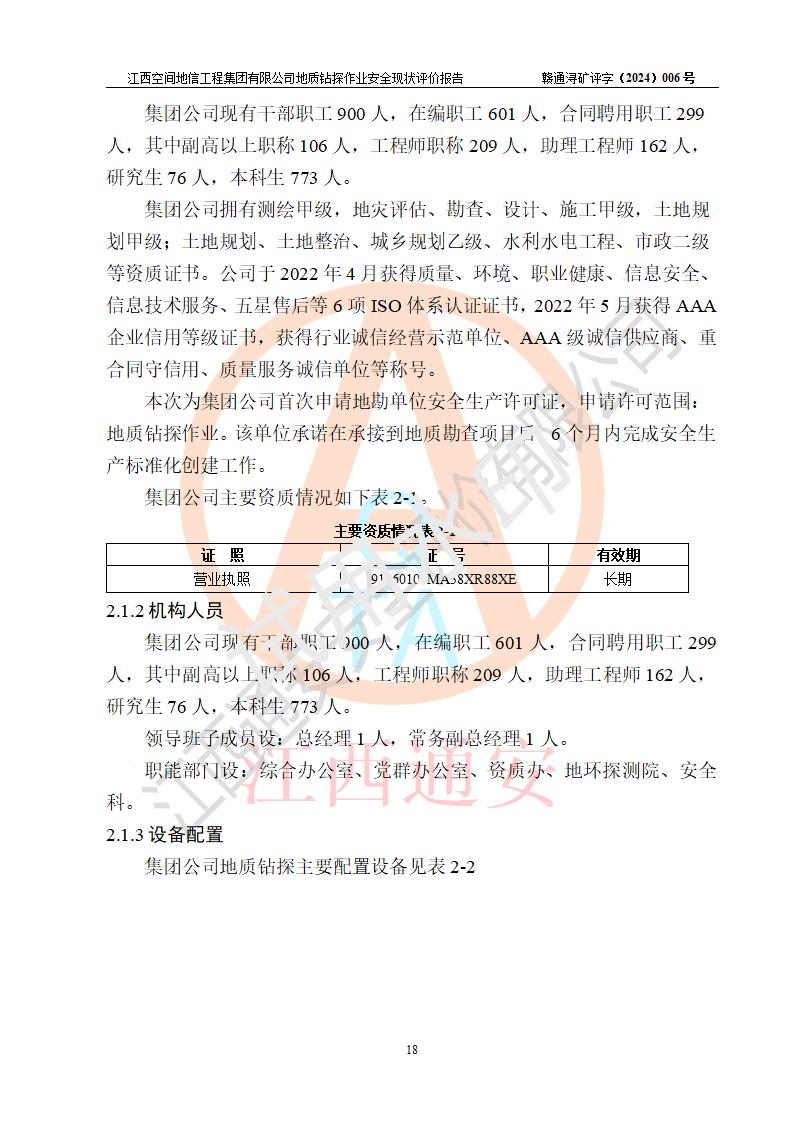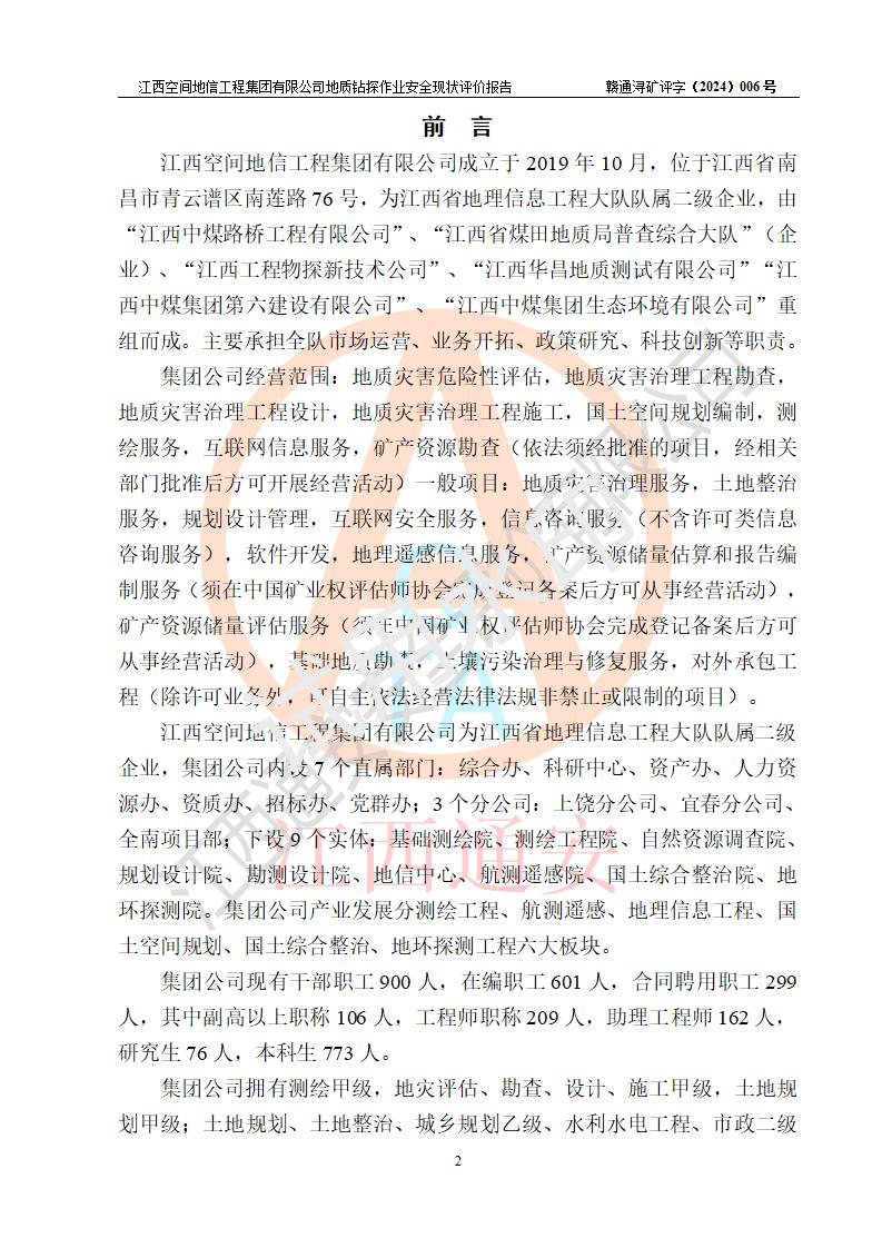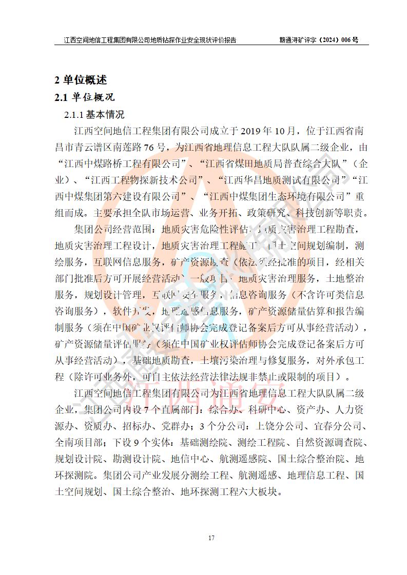 江西空間地信工程集團(tuán)有限公司成立于2019年10月,位于江西省南昌市青云譜區(qū)南蓮路76號,為江西省地理信息工程大隊(duì)隊(duì)屬二級企業(yè),由“江西中煤路橋工程有限公司”、“江西省煤田地質(zhì)局普查綜合大隊(duì)”(企業(yè))、“江西工程物探新技術(shù)公司”、“江西華昌地質(zhì)測試有限公司”“江西中煤集團(tuán)第六建設(shè)有限公司”、“江西中煤集團(tuán)生態(tài)環(huán)境有限公司”重組而成。主要承擔(dān)全隊(duì)市場運(yùn)營、業(yè)務(wù)開拓、政策研究、科技創(chuàng)新等職責(zé)。 集團(tuán)公司經(jīng)營范圍:地質(zhì)災(zāi)害危險性評估,地質(zhì)災(zāi)害治理工程勘查,地質(zhì)災(zāi)害治理工程設(shè)計,地質(zhì)災(zāi)害治理工程施工,國土空間規(guī)劃編制,測繪服務(wù),互聯(lián)網(wǎng)信息服務(wù),礦產(chǎn)資源勘查(依法須經(jīng)批準(zhǔn)的項(xiàng)目,經(jīng)相關(guān)部門批準(zhǔn)后方可開展經(jīng)營活動)一般項(xiàng)目:地質(zhì)災(zāi)害治理服務(wù),土地整治服務(wù),規(guī)劃設(shè)計管理,互聯(lián)網(wǎng)安全服務(wù),信息咨詢服務(wù)(不含許可類信息咨詢服務(wù)),軟件開發(fā),地理遙感信息服務(wù),礦產(chǎn)資源儲量估算和報告編制服務(wù)(須在中國礦業(yè)權(quán)評估師**完成登記備案后方可從事經(jīng)營活動),礦產(chǎn)資源儲量評估服務(wù)(須在中國礦業(yè)權(quán)評估師**完成登記備案后方可從事經(jīng)營活動),基礎(chǔ)地質(zhì)勘查,土壤污染治理與修復(fù)服務(wù),對外承包工程(除許可業(yè)務(wù)外,可自主依法經(jīng)營法律法規(guī)非禁止或限制的項(xiàng)目)。 江西空間地信工程集團(tuán)有限公司為江西省地理信息工程大隊(duì)隊(duì)屬二級企業(yè),集團(tuán)公司內(nèi)設(shè)7個直屬部門:綜合辦、科研中心、資產(chǎn)辦、人力資源辦、資質(zhì)辦、招標(biāo)辦、黨群辦;3個分公司:上饒分公司、宜春分公司、全南項(xiàng)目部;下設(shè)9個實(shí)體:基礎(chǔ)測繪院、測繪工程院、自然資源調(diào)查院、規(guī)劃設(shè)計院、勘測設(shè)計院、地信中心、航測遙感院、國土綜合整治院、地環(huán)探測院。集團(tuán)公司產(chǎn)業(yè)發(fā)展分測繪工程、航測遙感、地理信息工程、國土空間規(guī)劃、國土綜合整治、地環(huán)探測工程六大板塊。 集團(tuán)公司現(xiàn)有干部職工900人,在編職工601人,合同聘用職工299人,其中副高以上職稱106人,工程師職稱209人,助理工程師162人,研究生76人,本科生773人。 集團(tuán)公司擁有測繪**,地災(zāi)評估、勘查、設(shè)計、施工**,土地規(guī)劃**;土地規(guī)劃、土地整治、城鄉(xiāng)規(guī)劃乙級、水利水電工程、市政二級等資質(zhì)證書。公司于2022年4月獲得質(zhì)量、環(huán)境、職業(yè)健康、信息安全、信息技術(shù)服務(wù)、五星售后等6項(xiàng)ISO體系認(rèn)證證書,2022年5月獲得AAA企業(yè)信用等級證書,獲得行業(yè)誠信經(jīng)營示范單位、AAA級誠信供應(yīng)商、重合同守信用、質(zhì)量服務(wù)誠信單位等稱號。 集團(tuán)公司為地勘單位安全生產(chǎn)許可證新設(shè)許可,申請?jiān)S可范圍:地質(zhì)鉆探作業(yè)。按照《安全生產(chǎn)法》、《礦山安全法》和《江西省非煤礦礦山企業(yè)安全生產(chǎn)許可證實(shí)施辦法》等有關(guān)規(guī)定,該單位在申請安全生產(chǎn)許可證前應(yīng)進(jìn)行安全現(xiàn)狀評價。 |