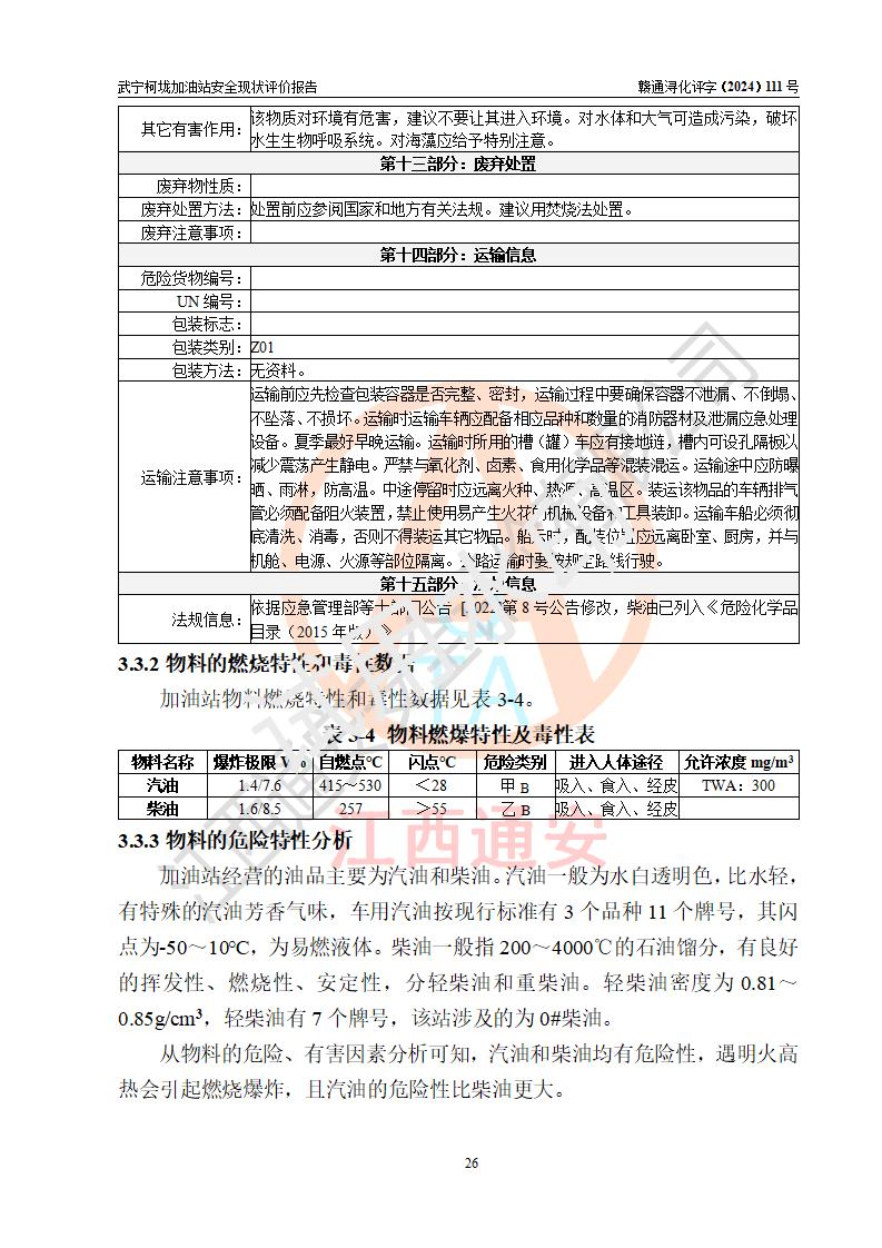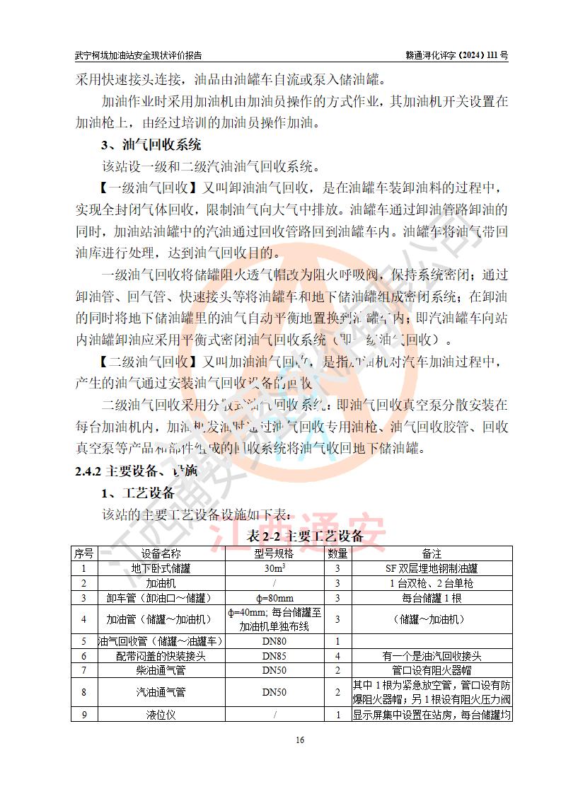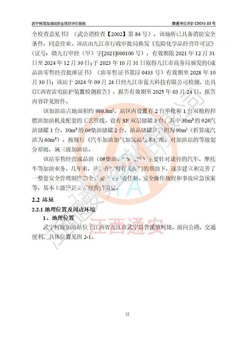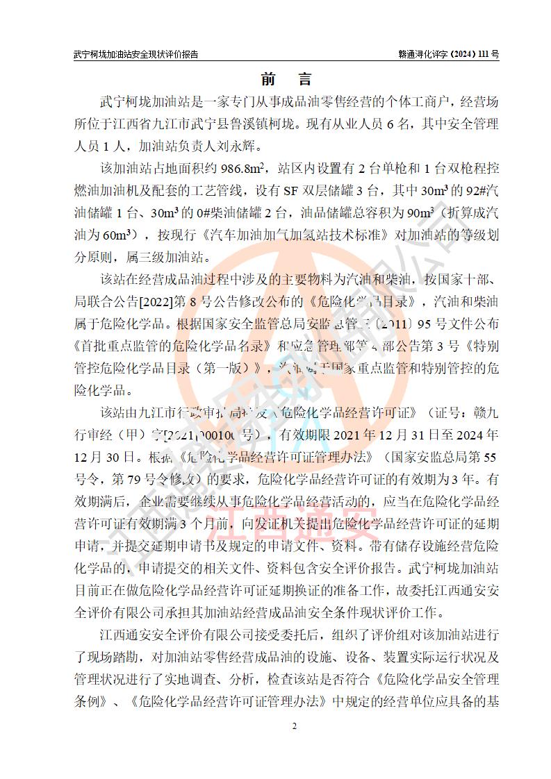 項目簡介 | 武寧柯垅加油站是一家專門從事成品油零售經(jīng)營的個體工商戶,經(jīng)營場所位于江西省九江市武寧縣魯溪鎮(zhèn)柯垅?,F(xiàn)有從業(yè)人員6名,其中安全管理人員1人,加油站負責人劉永輝。 該加油站占地面積約986.8m2,站區(qū)內(nèi)設置有2臺單槍和1臺雙槍程控燃油加油機及配套的工藝管線,設有SF雙層儲罐3臺,其中30m3的92#汽油儲罐1臺、30m3的0#柴油儲罐2臺,油品儲罐總?cè)莘e為90m3(折算成汽油為60m3),按現(xiàn)行《汽車加油加氣加氫站技術(shù)標準》對加油站的等級劃分原則,屬三級加油站。 該站由九江市行政審批局換發(fā)《危險化學品經(jīng)營許可證》(證號:贛九行審經(jīng)(甲)字[2021]000100號),**期限2021年12月31日至2024年12月30日。 | |||