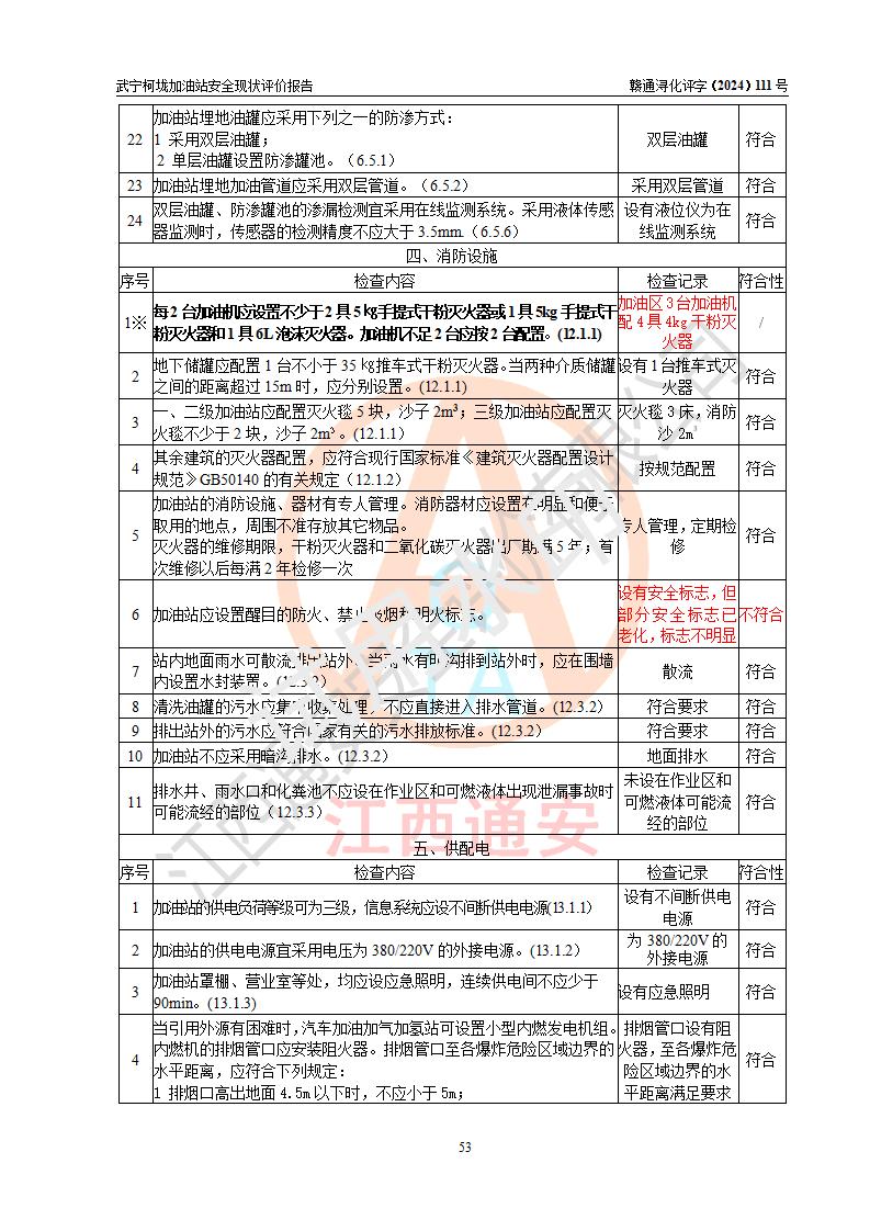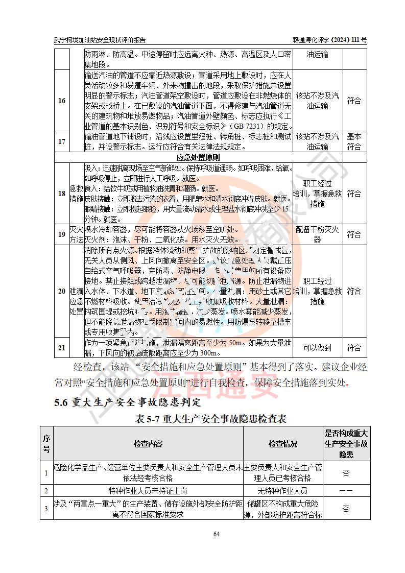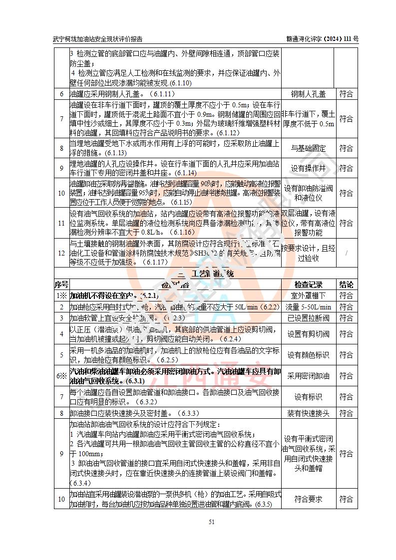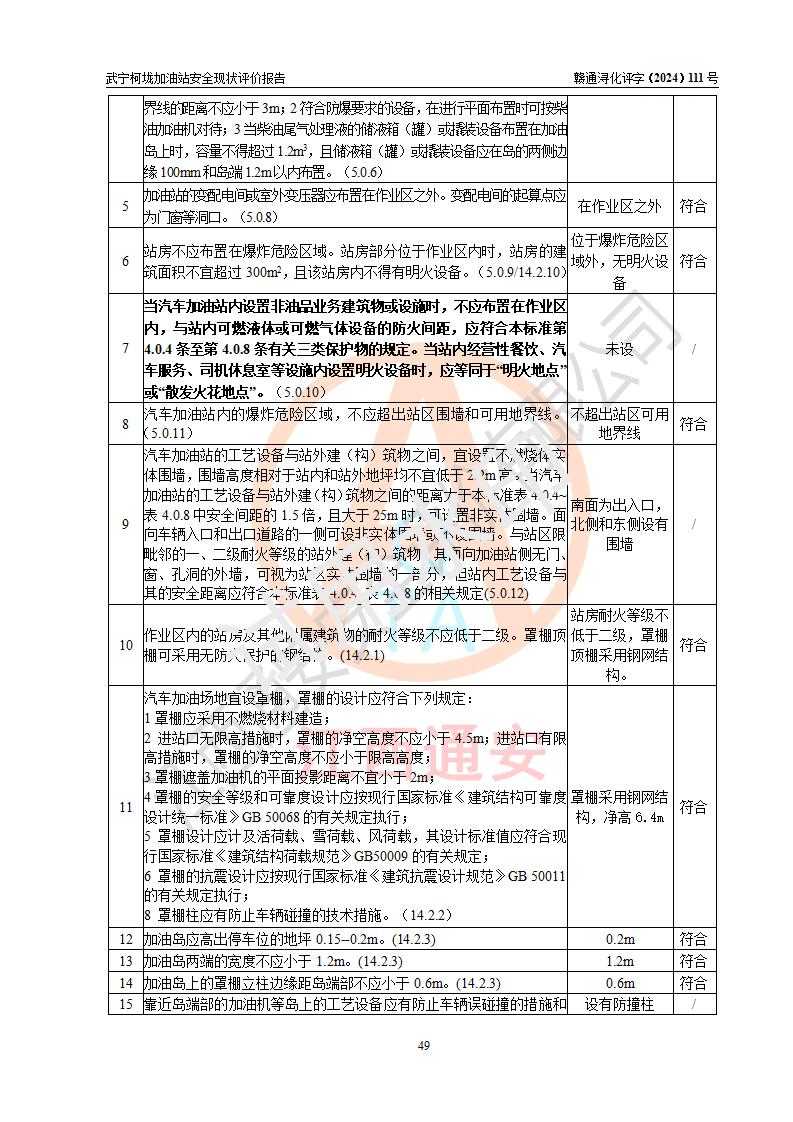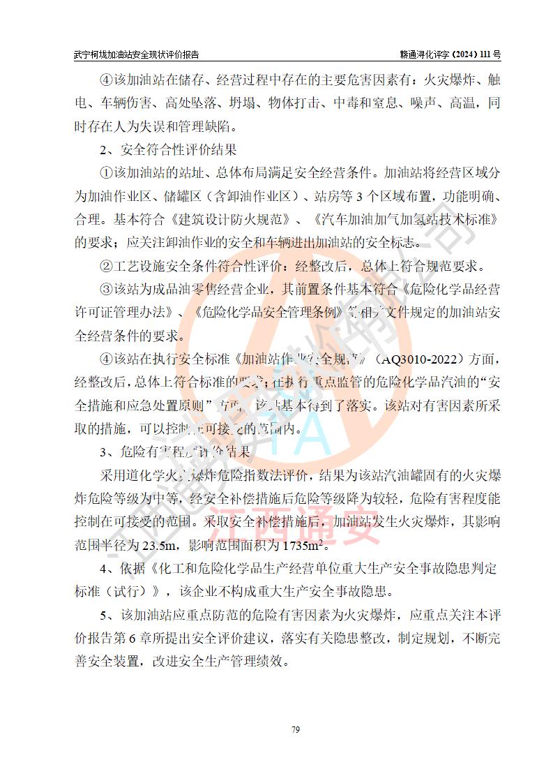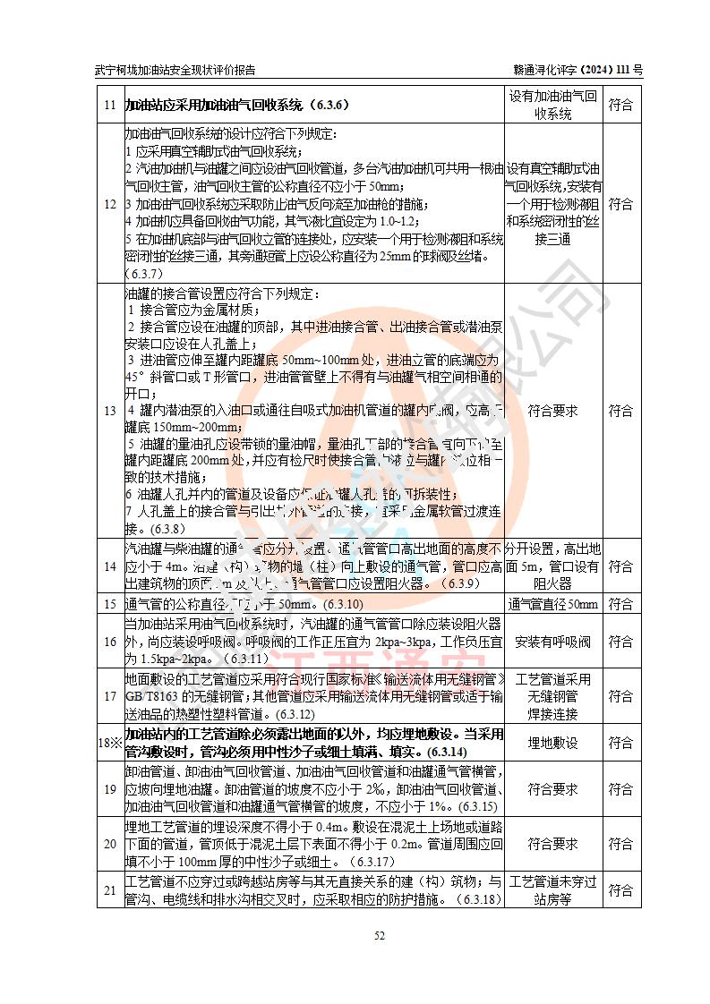 評價結(jié)論 | 武寧柯垅加油站涉及的安全條件、安全經(jīng)營條件、安全生產(chǎn)管理符合《危險化學品經(jīng)營許可證管理辦法》、《汽車加油加氣加氫站技術(shù)標準》等**有關(guān)法規(guī)、標準、規(guī)范要求,能滿足危險化學品經(jīng)營安全條件。 | |||