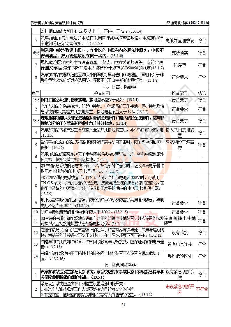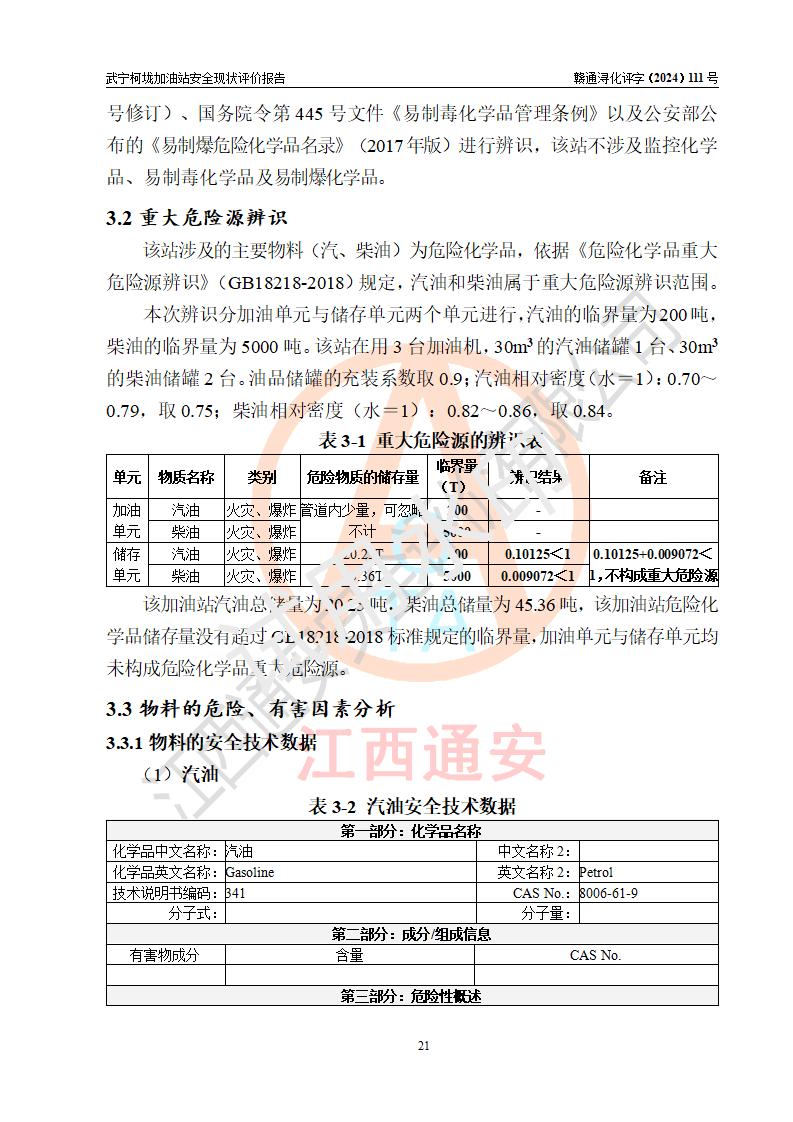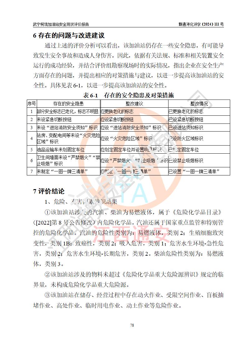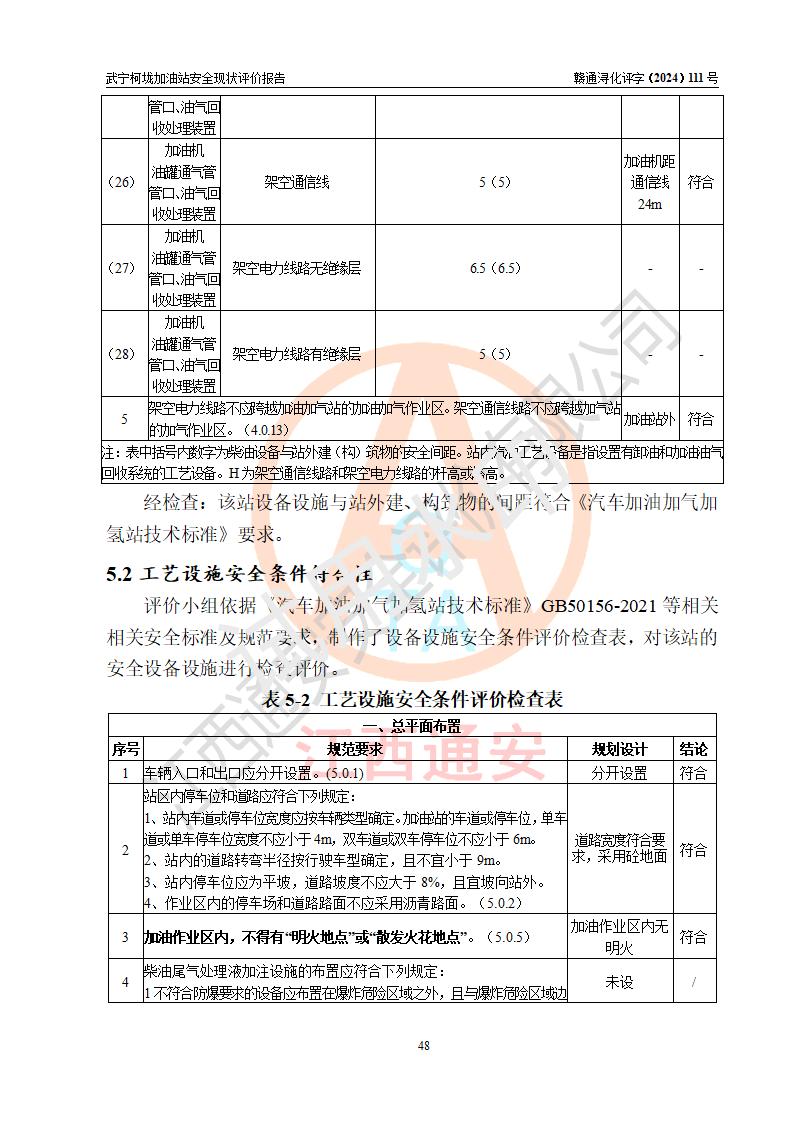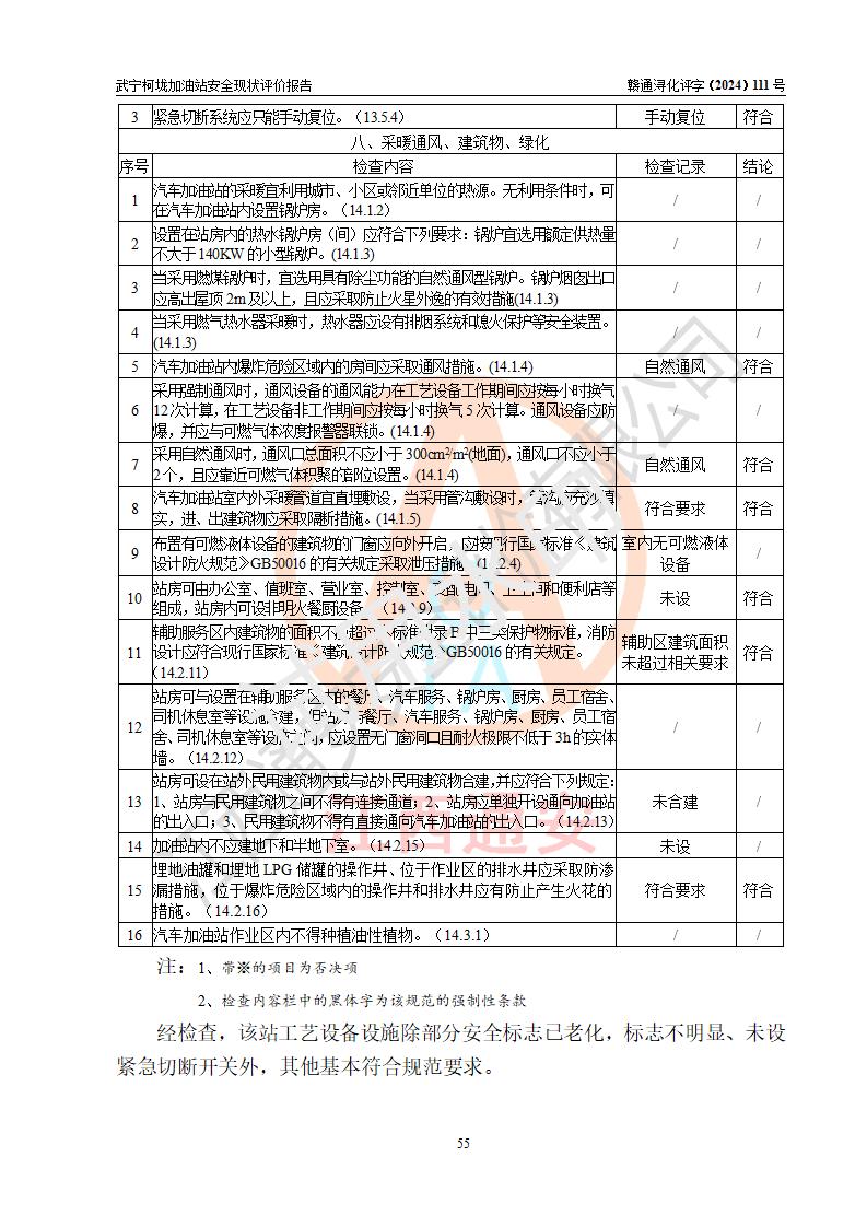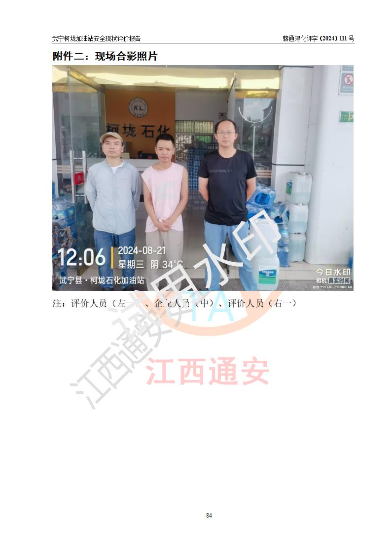 評價結(jié)論 | 武寧柯垅加油站涉及的安全條件、安全經(jīng)營條件、安全生產(chǎn)管理符合《危險化學品經(jīng)營許可證管理辦法》、《汽車加油加氣加氫站技術(shù)標準》等**有關(guān)法規(guī)、標準、規(guī)范要求,能滿足危險化學品經(jīng)營安全條件。 | |||