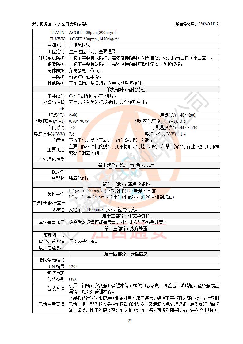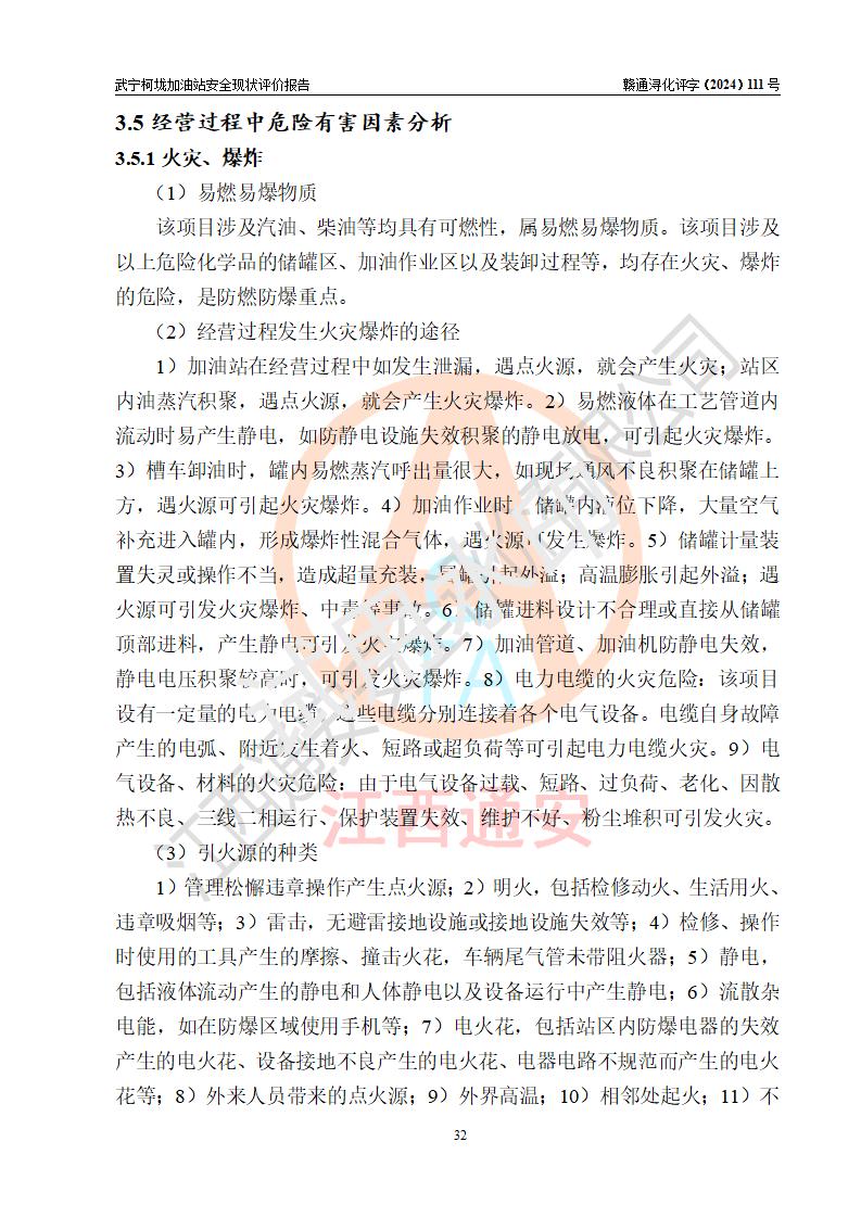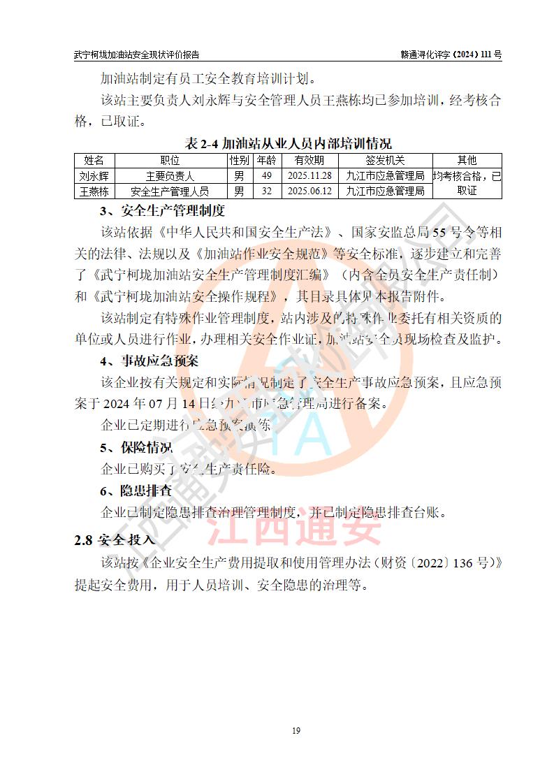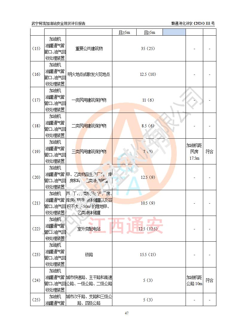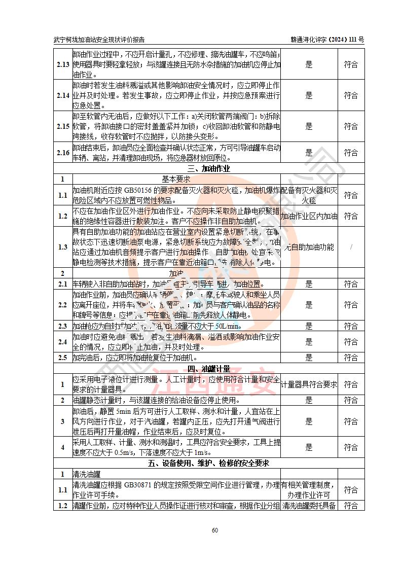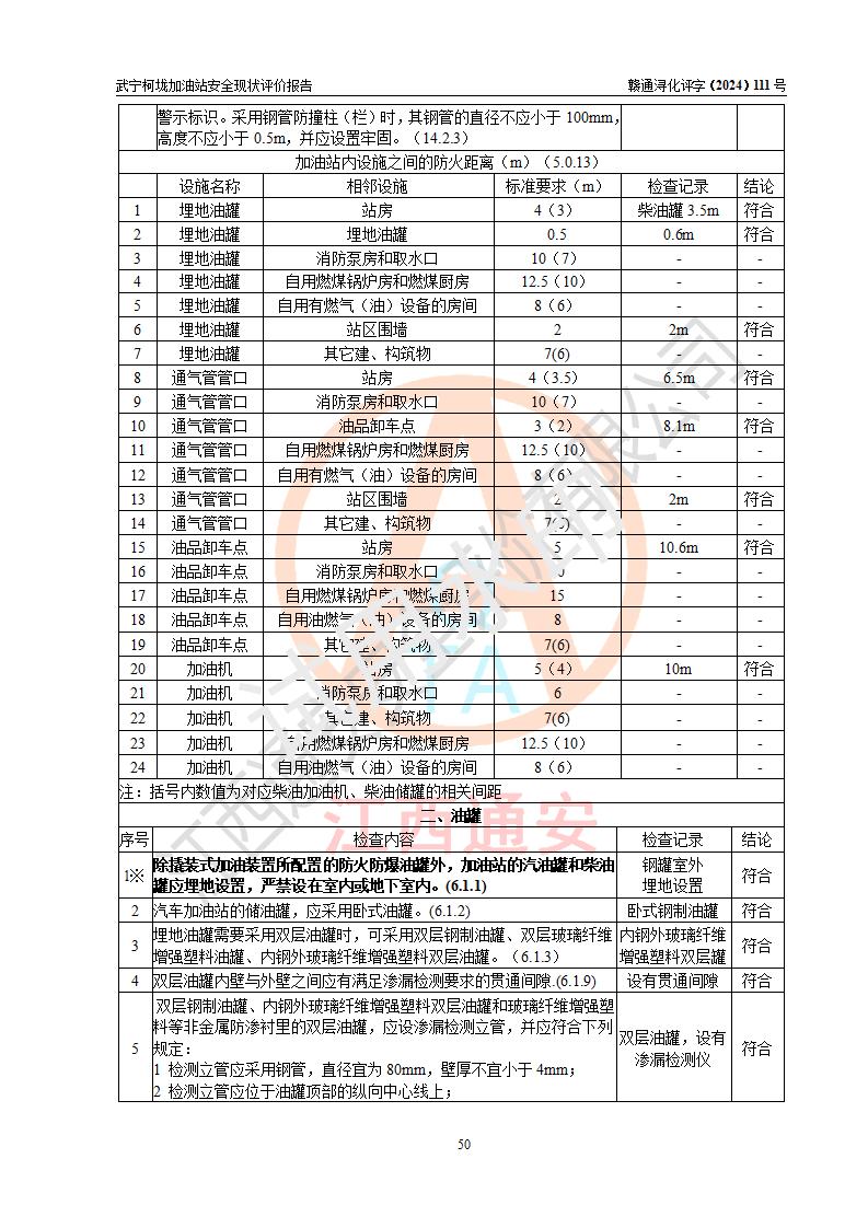 評價結(jié)論 | 武寧柯垅加油站涉及的安全條件、安全經(jīng)營條件、安全生產(chǎn)管理符合《危險化學品經(jīng)營許可證管理辦法》、《汽車加油加氣加氫站技術(shù)標準》等**有關(guān)法規(guī)、標準、規(guī)范要求,能滿足危險化學品經(jīng)營安全條件。 | |||