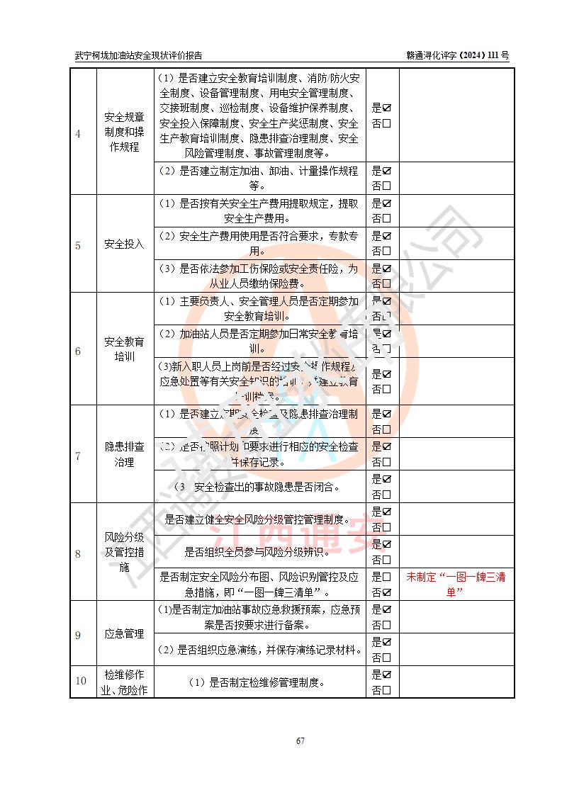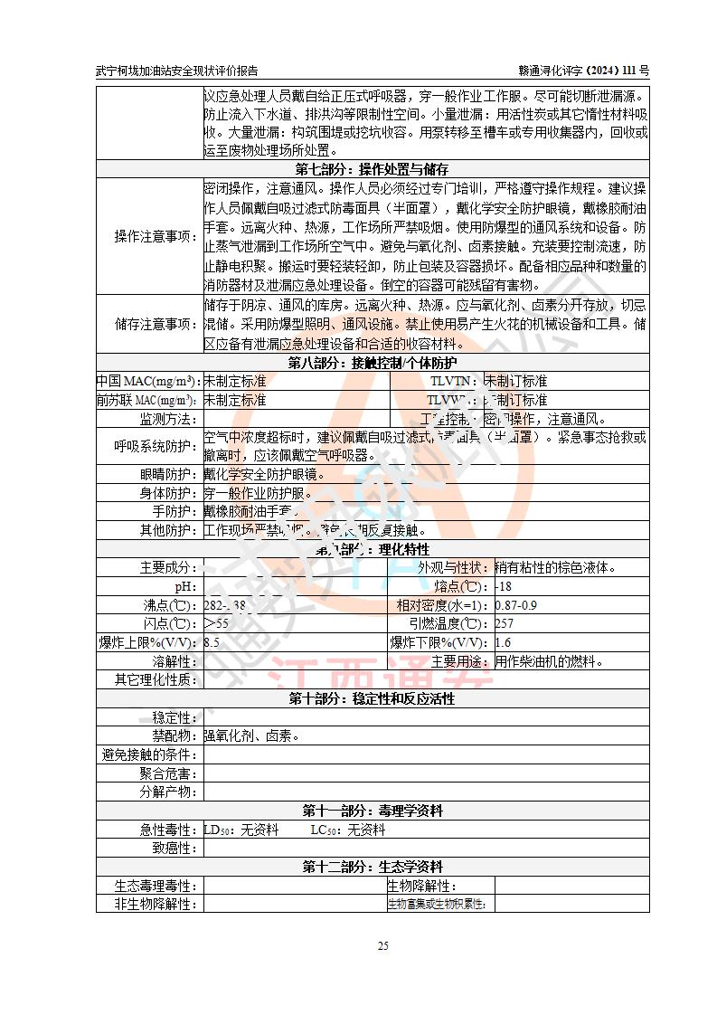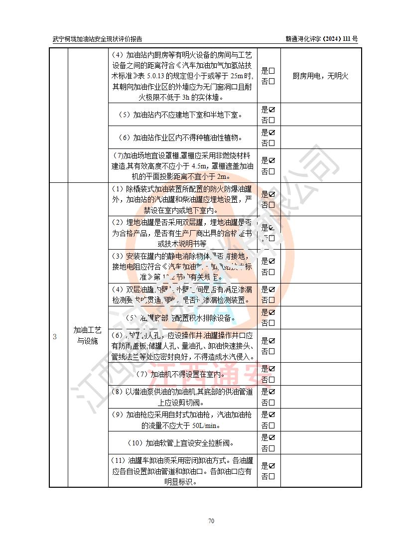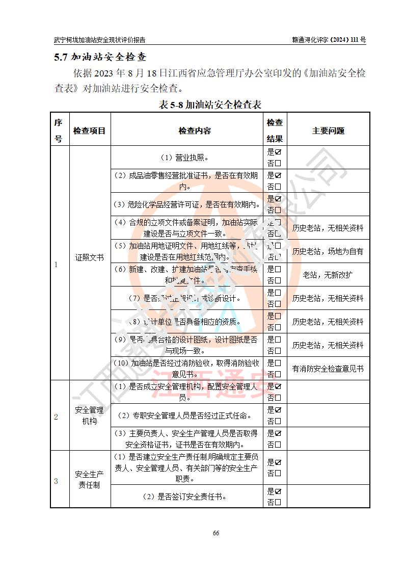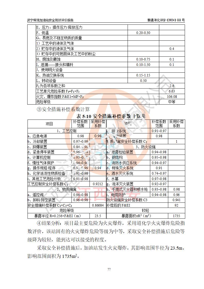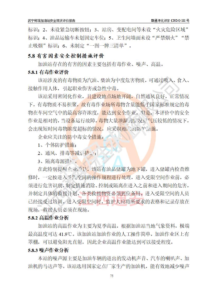 評價結(jié)論 | 武寧柯垅加油站涉及的安全條件、安全經(jīng)營條件、安全生產(chǎn)管理符合《危險化學品經(jīng)營許可證管理辦法》、《汽車加油加氣加氫站技術(shù)標準》等**有關(guān)法規(guī)、標準、規(guī)范要求,能滿足危險化學品經(jīng)營安全條件。 | |||