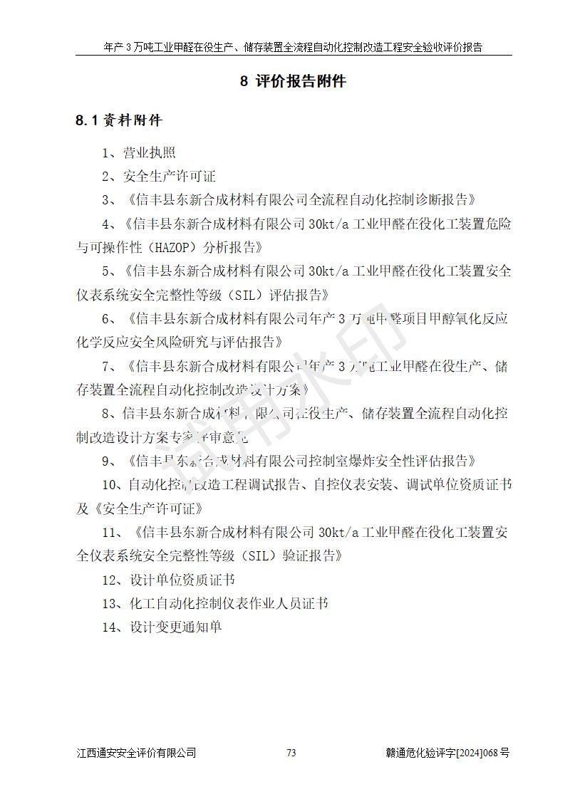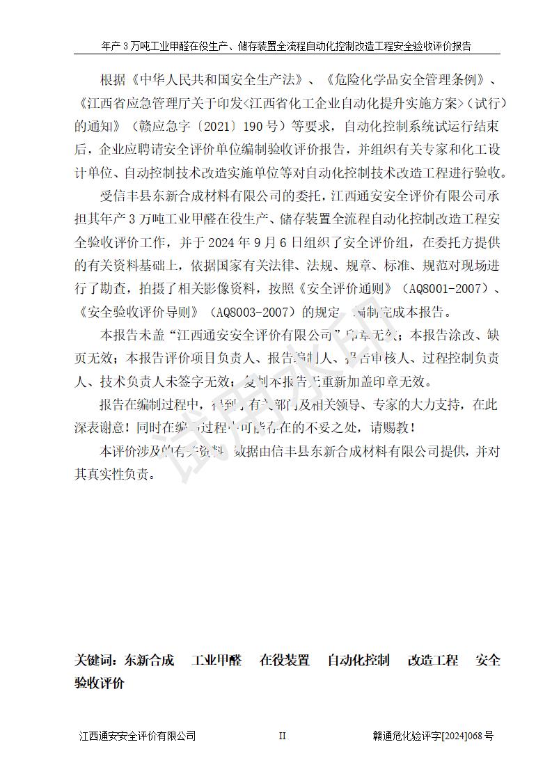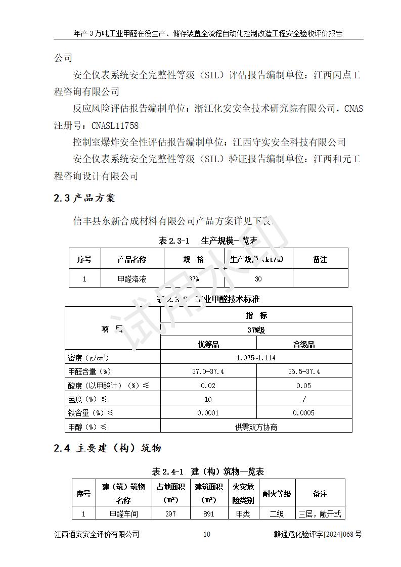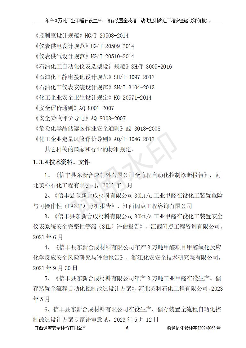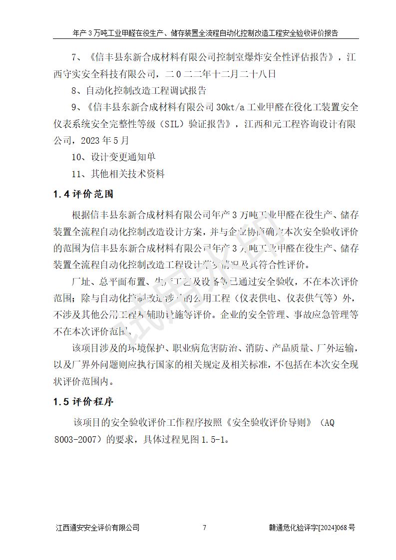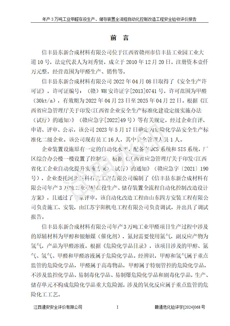 評(píng)價(jià)報(bào)告名稱 | 信豐縣東新合成材料有限公司年產(chǎn)3萬(wàn)噸工業(yè)甲醛在役生產(chǎn)、儲(chǔ)存裝置全流程自動(dòng)化控制改造工程安全驗(yàn)收評(píng)價(jià)報(bào)告 | ||||||