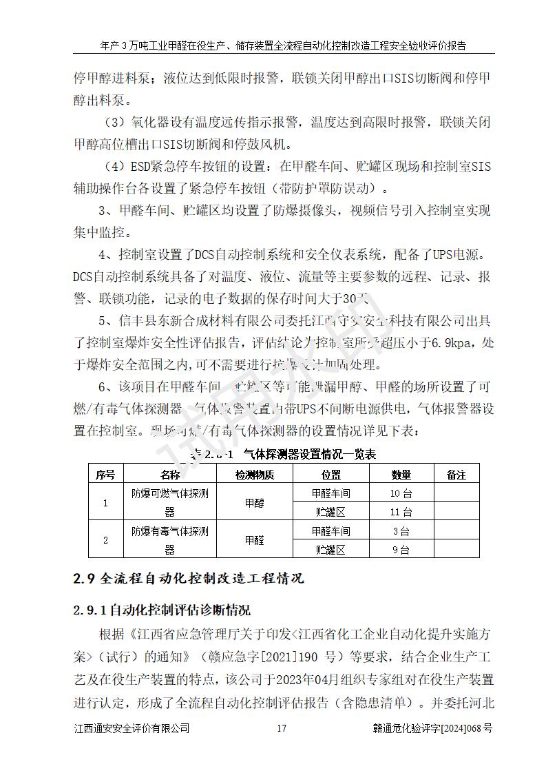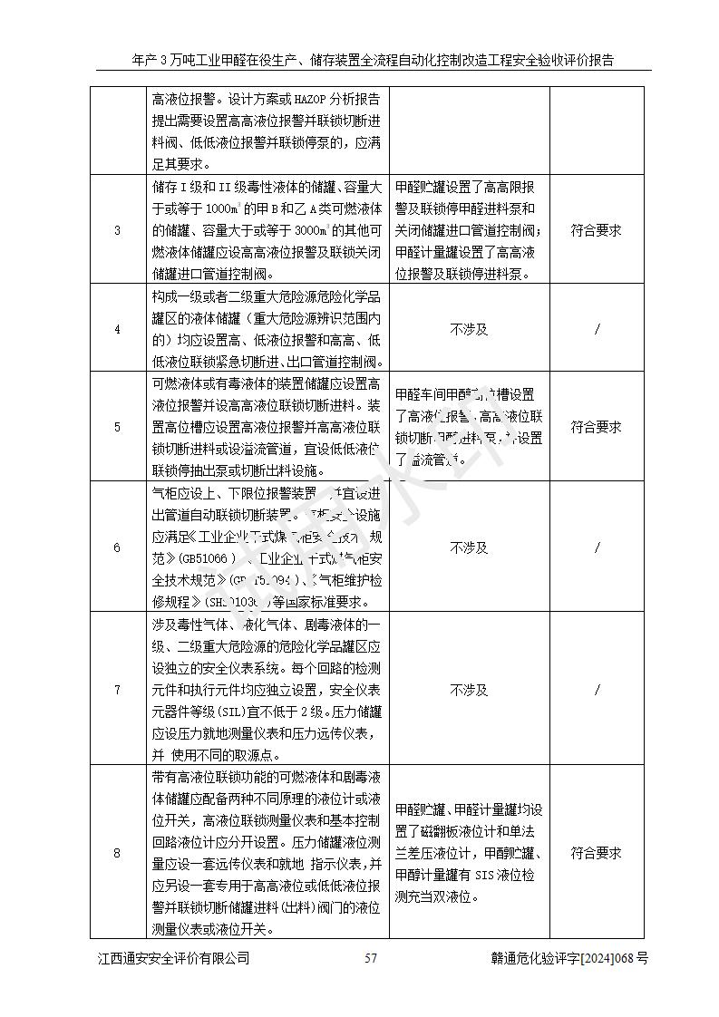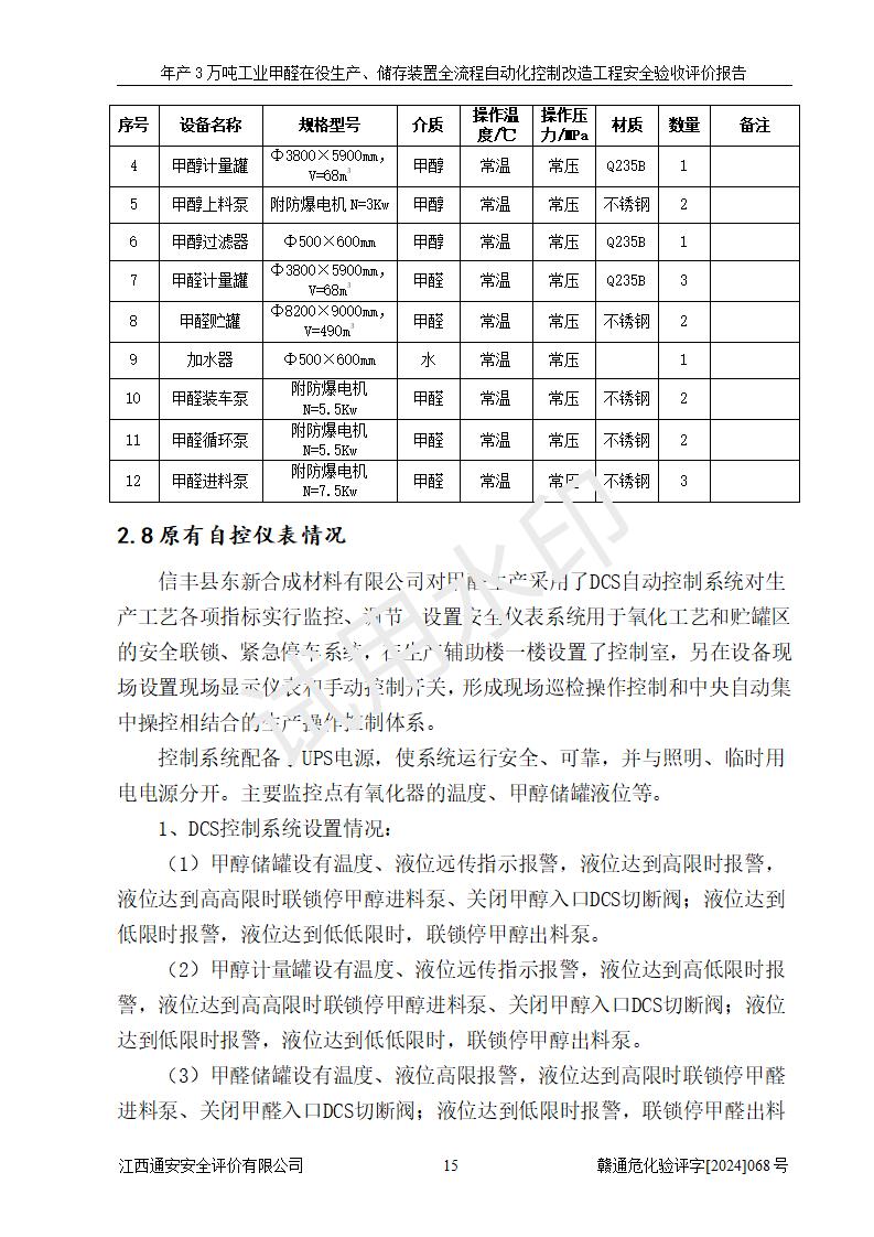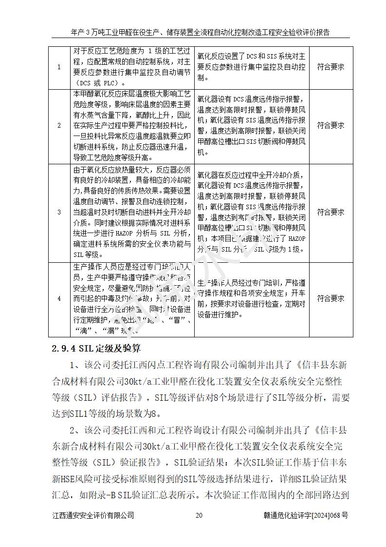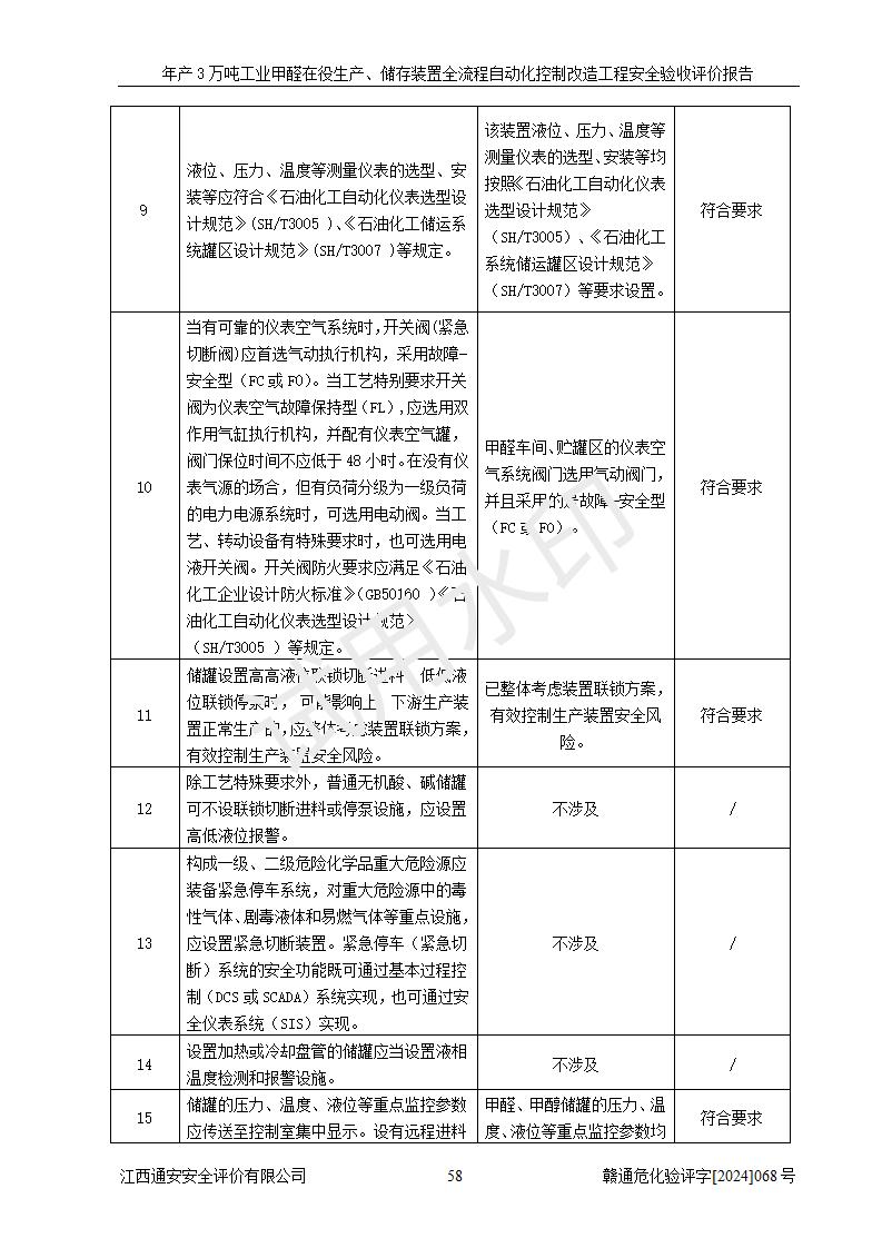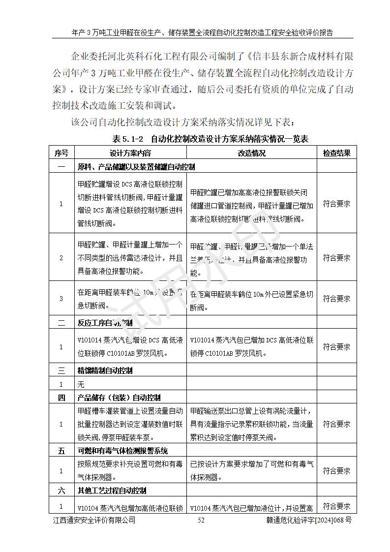 評(píng)價(jià)結(jié)論 | 信豐縣東新合成材料有限公司年產(chǎn)3萬(wàn)噸工業(yè)甲醛在役生產(chǎn)、儲(chǔ)存裝置全流程自動(dòng)化控制改造設(shè)計(jì)方案中提出的控制措施已得到落實(shí),自動(dòng)化控制系統(tǒng)設(shè)置情況與設(shè)計(jì)方案一致,滿足《江西省應(yīng)急管理廳關(guān)于印發(fā)<江西省化工企業(yè)自動(dòng)化提升實(shí)施方案>(試行)的通知》(贛應(yīng)急字〔2021〕190號(hào))的要求,具備自動(dòng)化控制改造工程竣工驗(yàn)收條件。 | ||||||