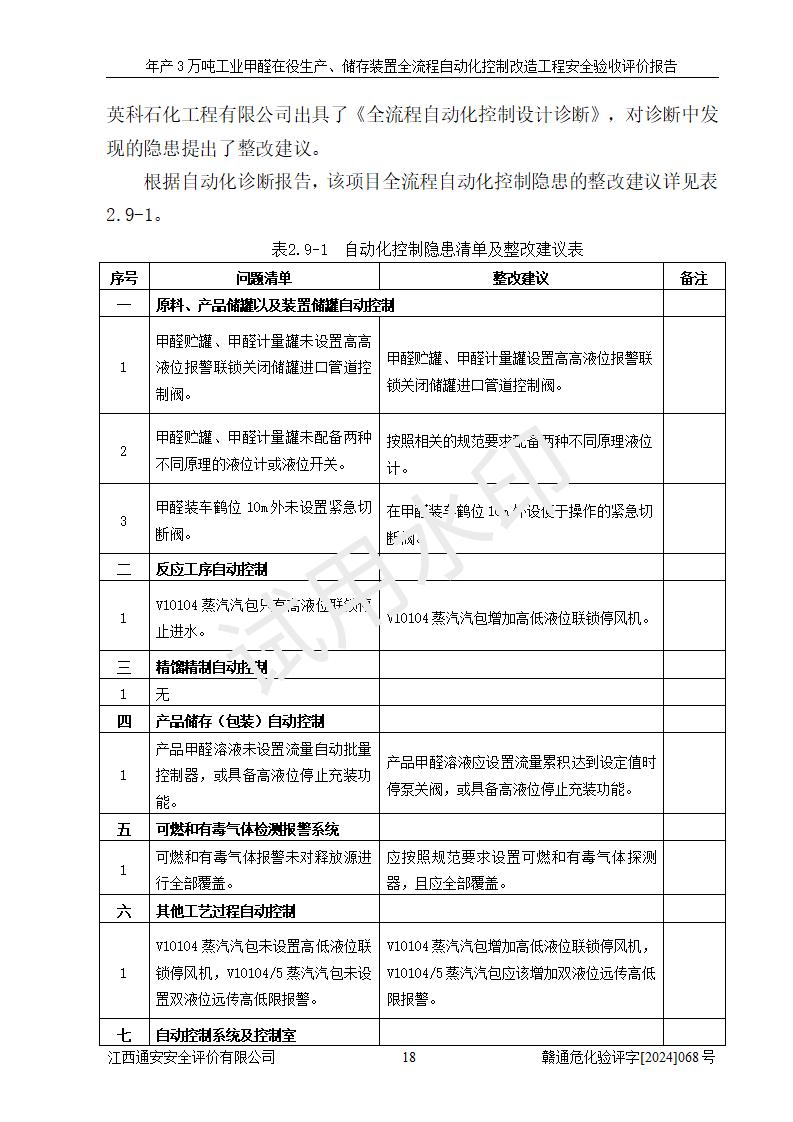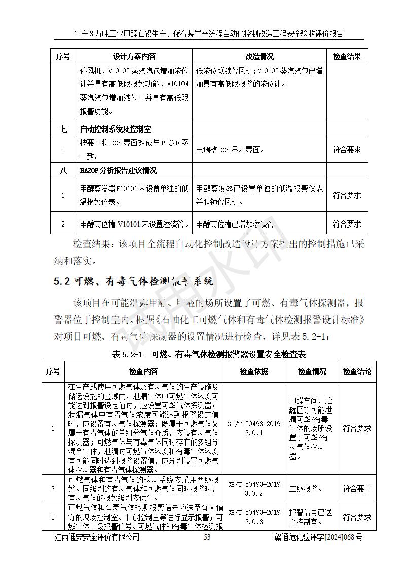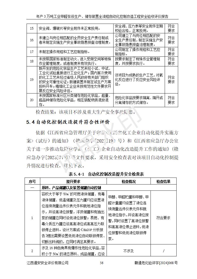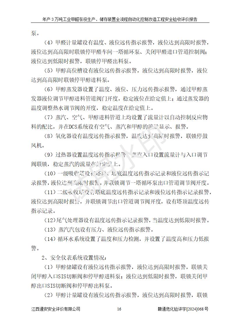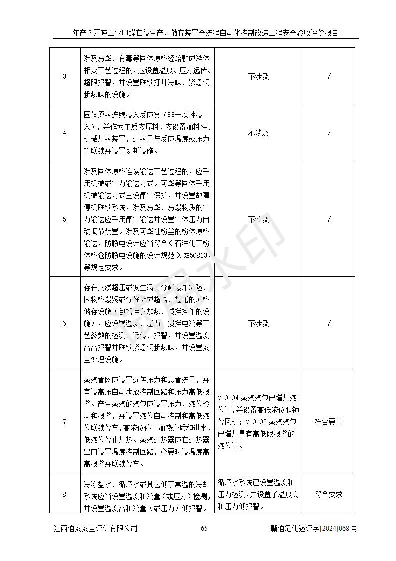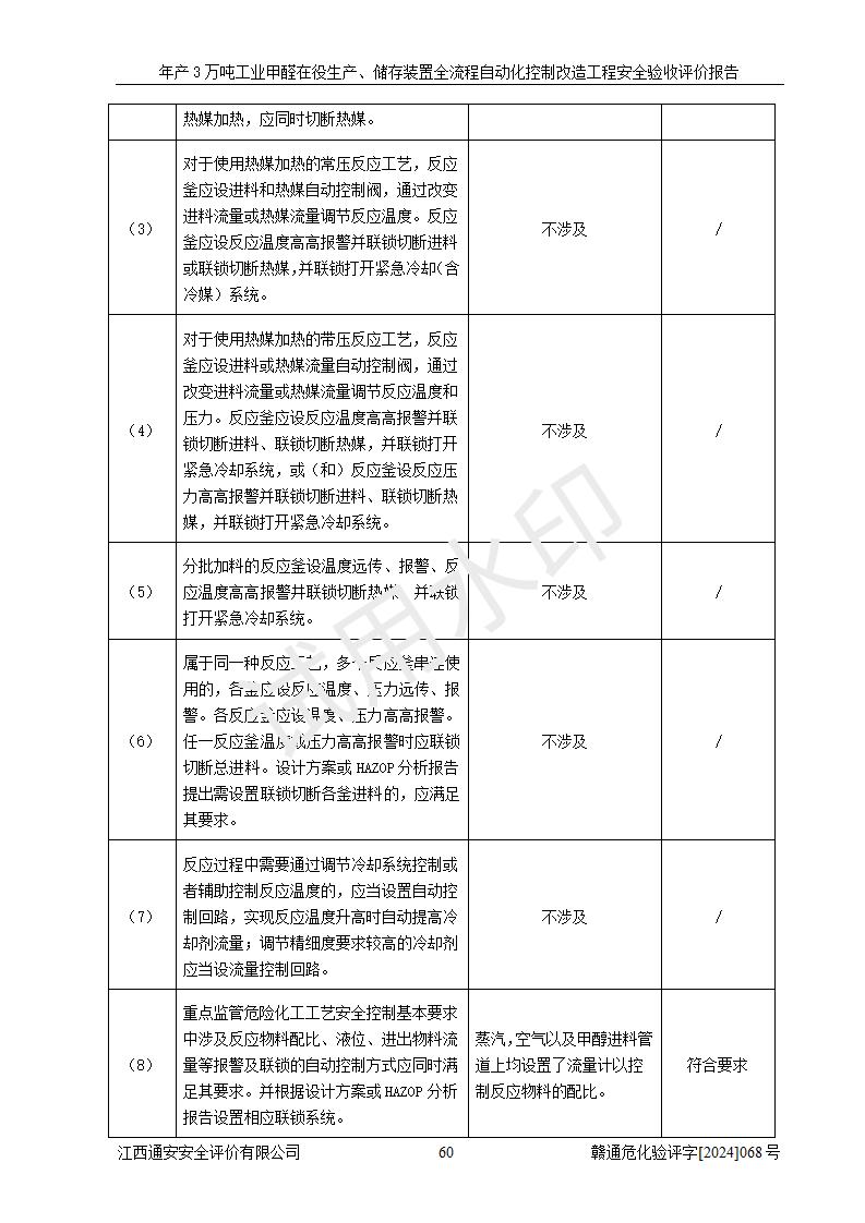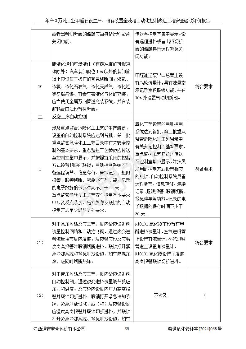 評(píng)價(jià)結(jié)論 | 信豐縣東新合成材料有限公司年產(chǎn)3萬(wàn)噸工業(yè)甲醛在役生產(chǎn)、儲(chǔ)存裝置全流程自動(dòng)化控制改造設(shè)計(jì)方案中提出的控制措施已得到落實(shí),自動(dòng)化控制系統(tǒng)設(shè)置情況與設(shè)計(jì)方案一致,滿足《江西省應(yīng)急管理廳關(guān)于印發(fā)<江西省化工企業(yè)自動(dòng)化提升實(shí)施方案>(試行)的通知》(贛應(yīng)急字〔2021〕190號(hào))的要求,具備自動(dòng)化控制改造工程竣工驗(yàn)收條件。 | ||||||