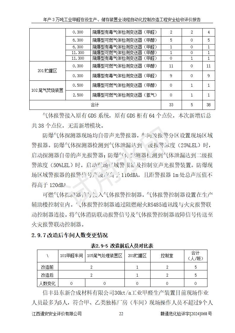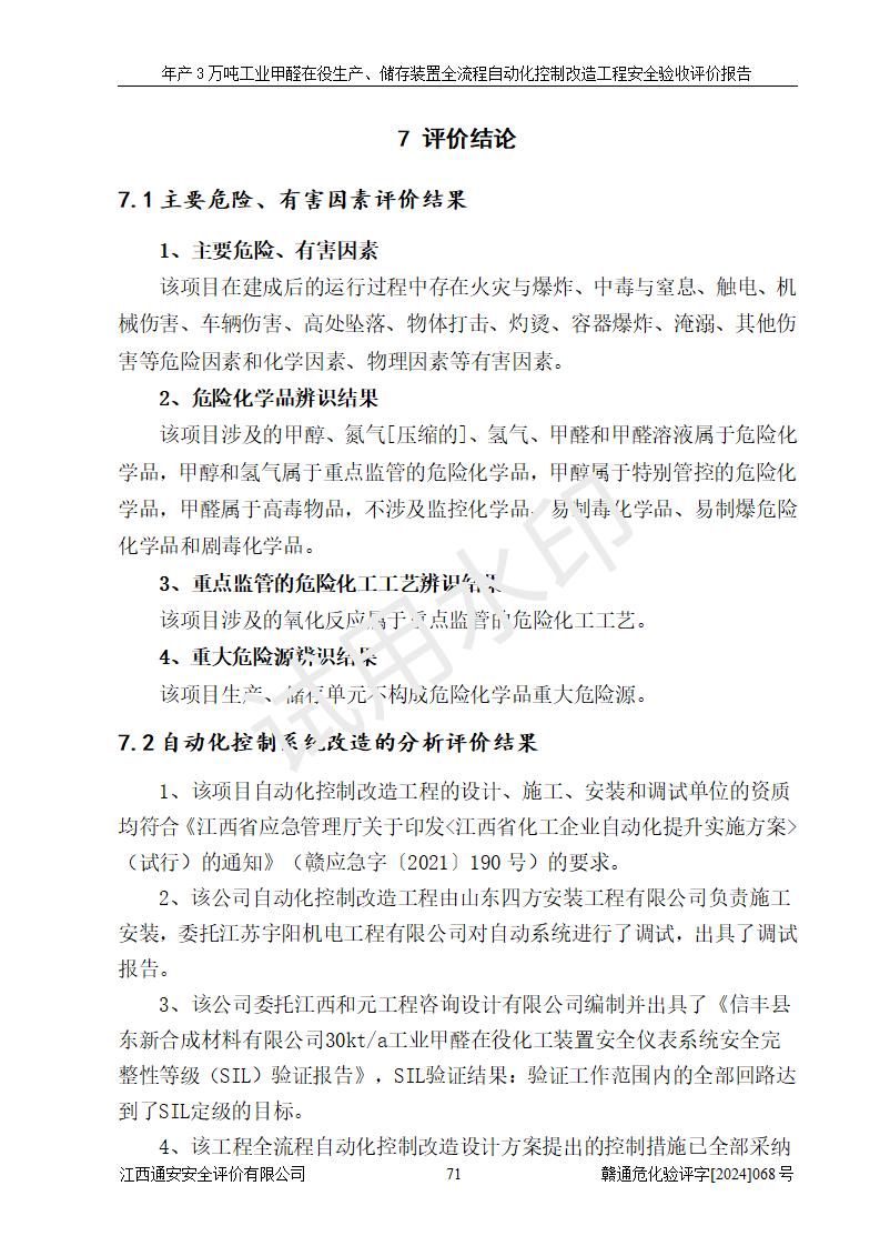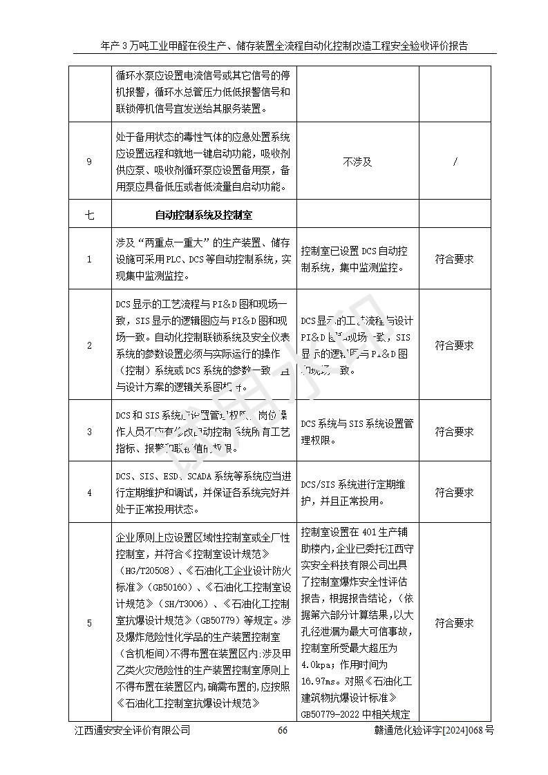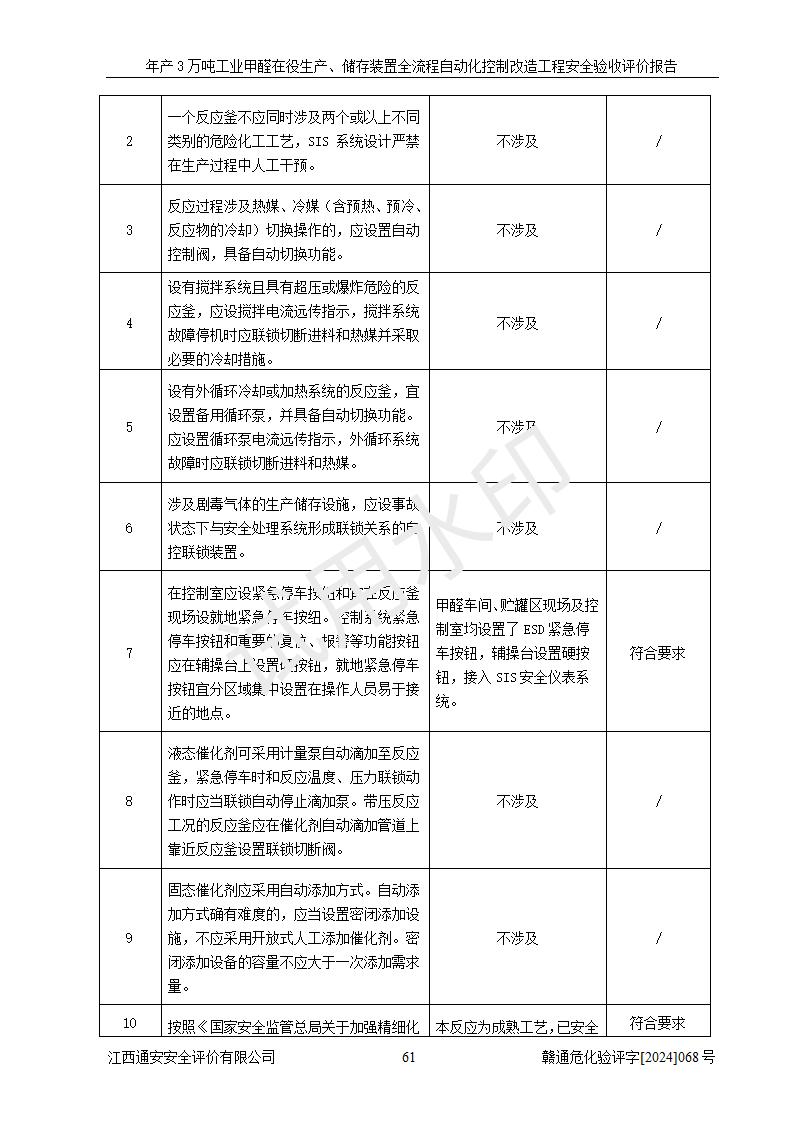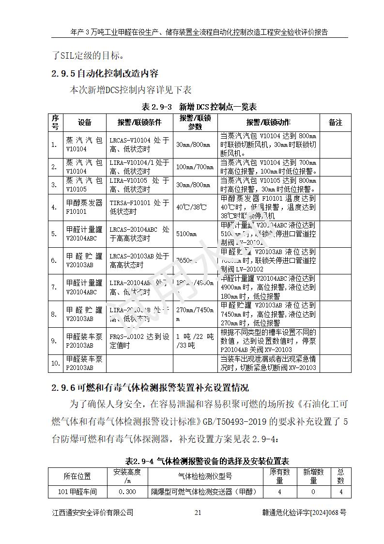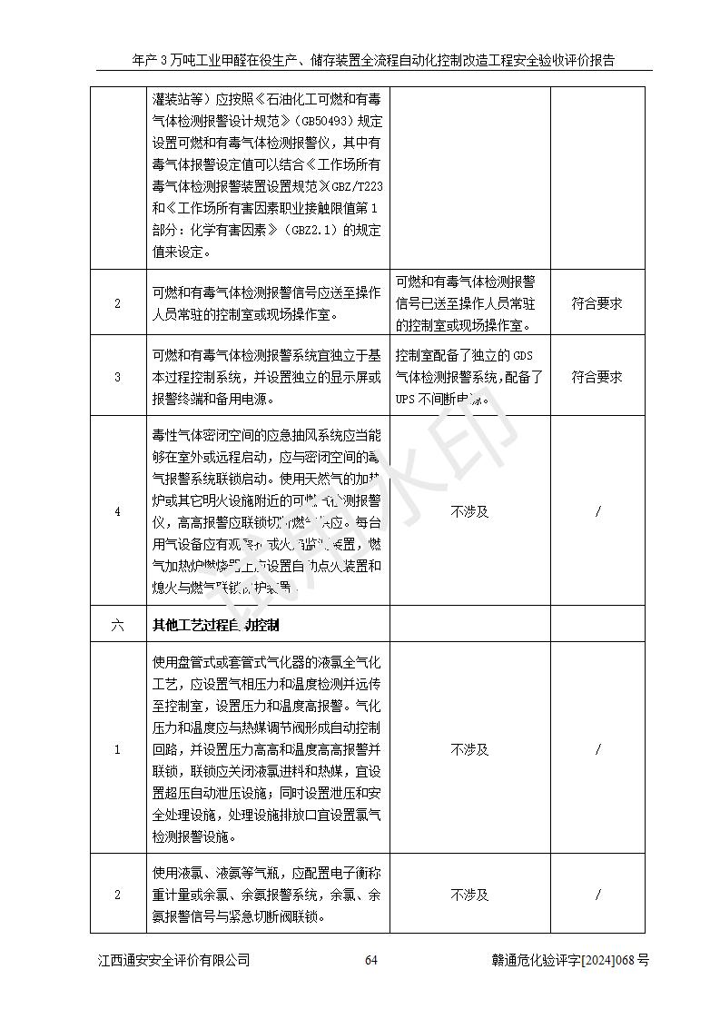 評(píng)價(jià)結(jié)論 | 信豐縣東新合成材料有限公司年產(chǎn)3萬(wàn)噸工業(yè)甲醛在役生產(chǎn)、儲(chǔ)存裝置全流程自動(dòng)化控制改造設(shè)計(jì)方案中提出的控制措施已得到落實(shí),自動(dòng)化控制系統(tǒng)設(shè)置情況與設(shè)計(jì)方案一致,滿足《江西省應(yīng)急管理廳關(guān)于印發(fā)<江西省化工企業(yè)自動(dòng)化提升實(shí)施方案>(試行)的通知》(贛應(yīng)急字〔2021〕190號(hào))的要求,具備自動(dòng)化控制改造工程竣工驗(yàn)收條件。 | ||||||