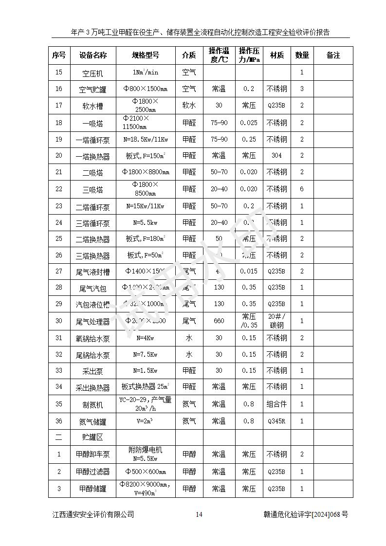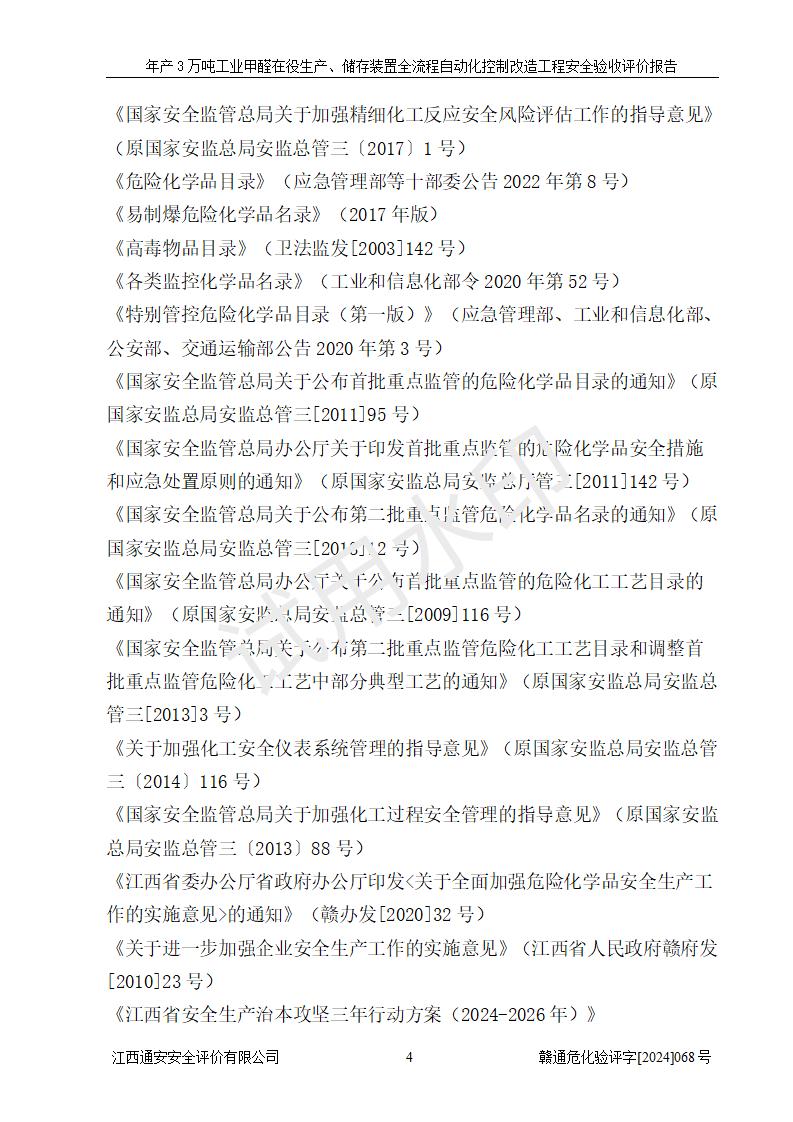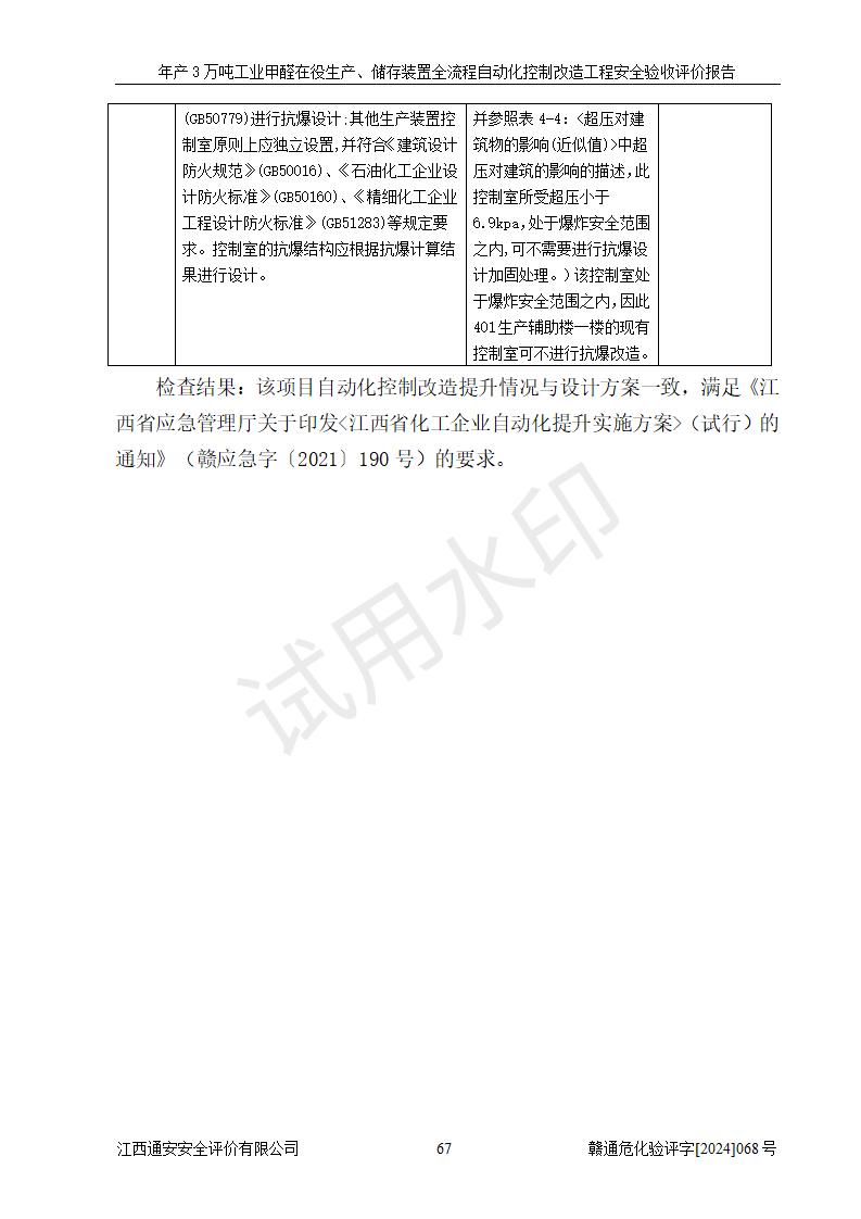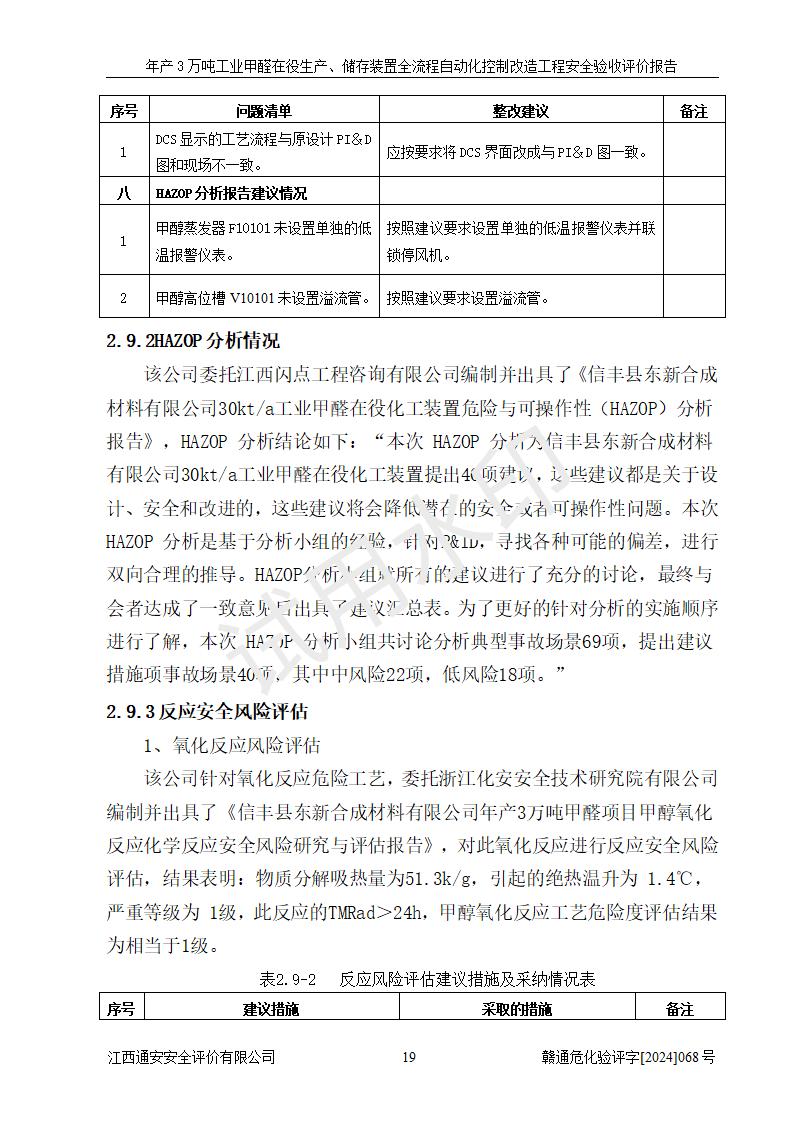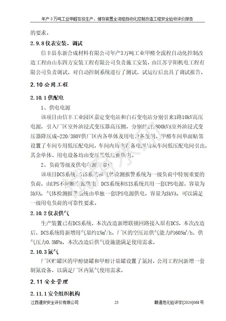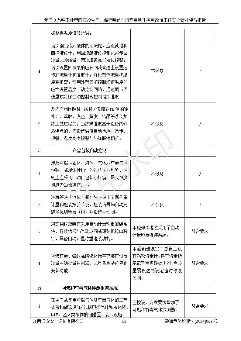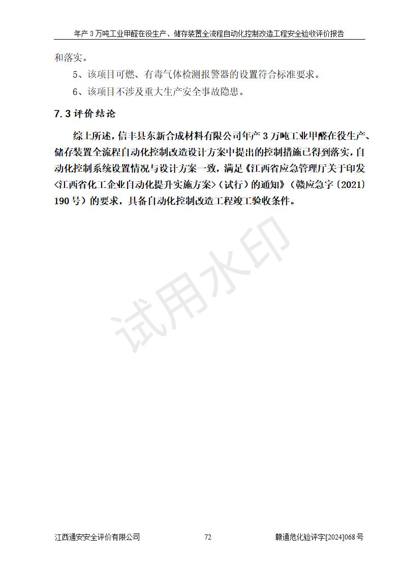 評(píng)價(jià)結(jié)論 | 信豐縣東新合成材料有限公司年產(chǎn)3萬(wàn)噸工業(yè)甲醛在役生產(chǎn)、儲(chǔ)存裝置全流程自動(dòng)化控制改造設(shè)計(jì)方案中提出的控制措施已得到落實(shí),自動(dòng)化控制系統(tǒng)設(shè)置情況與設(shè)計(jì)方案一致,滿足《江西省應(yīng)急管理廳關(guān)于印發(fā)<江西省化工企業(yè)自動(dòng)化提升實(shí)施方案>(試行)的通知》(贛應(yīng)急字〔2021〕190號(hào))的要求,具備自動(dòng)化控制改造工程竣工驗(yàn)收條件。 | ||||||