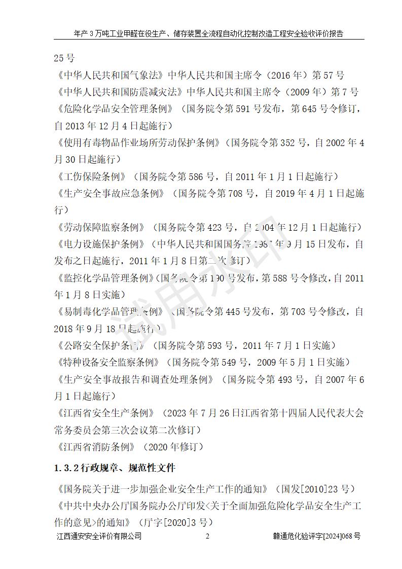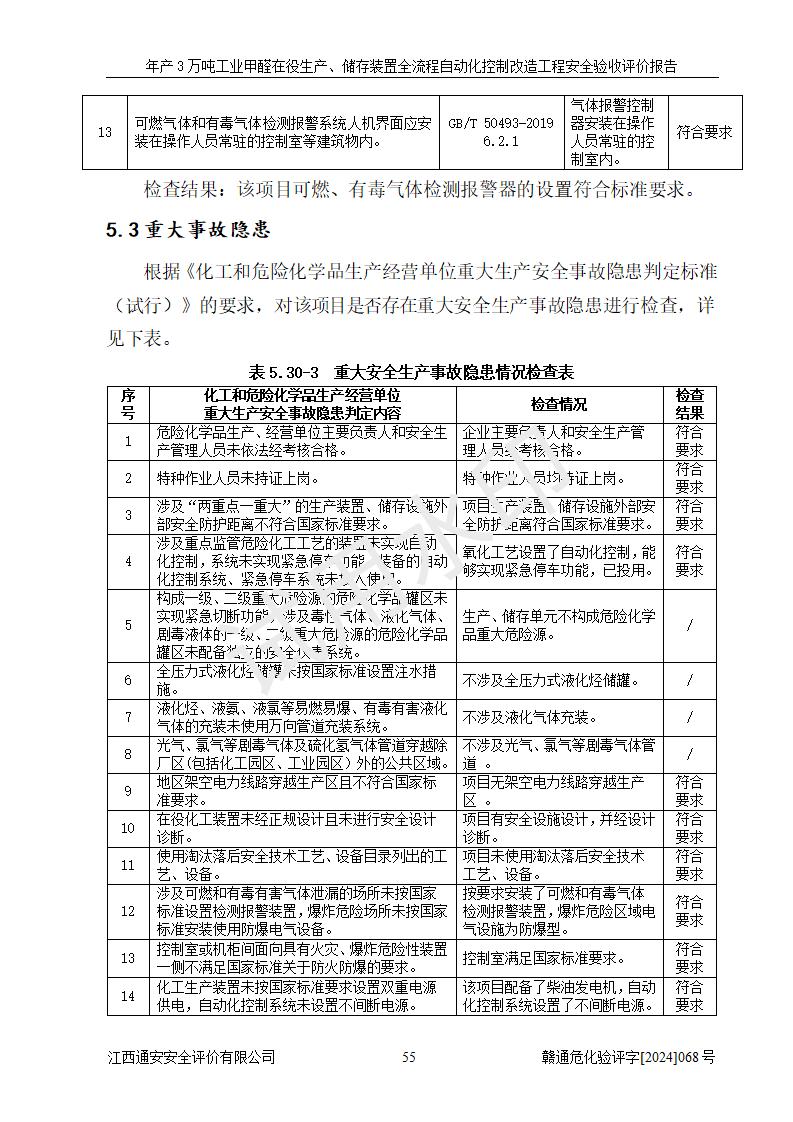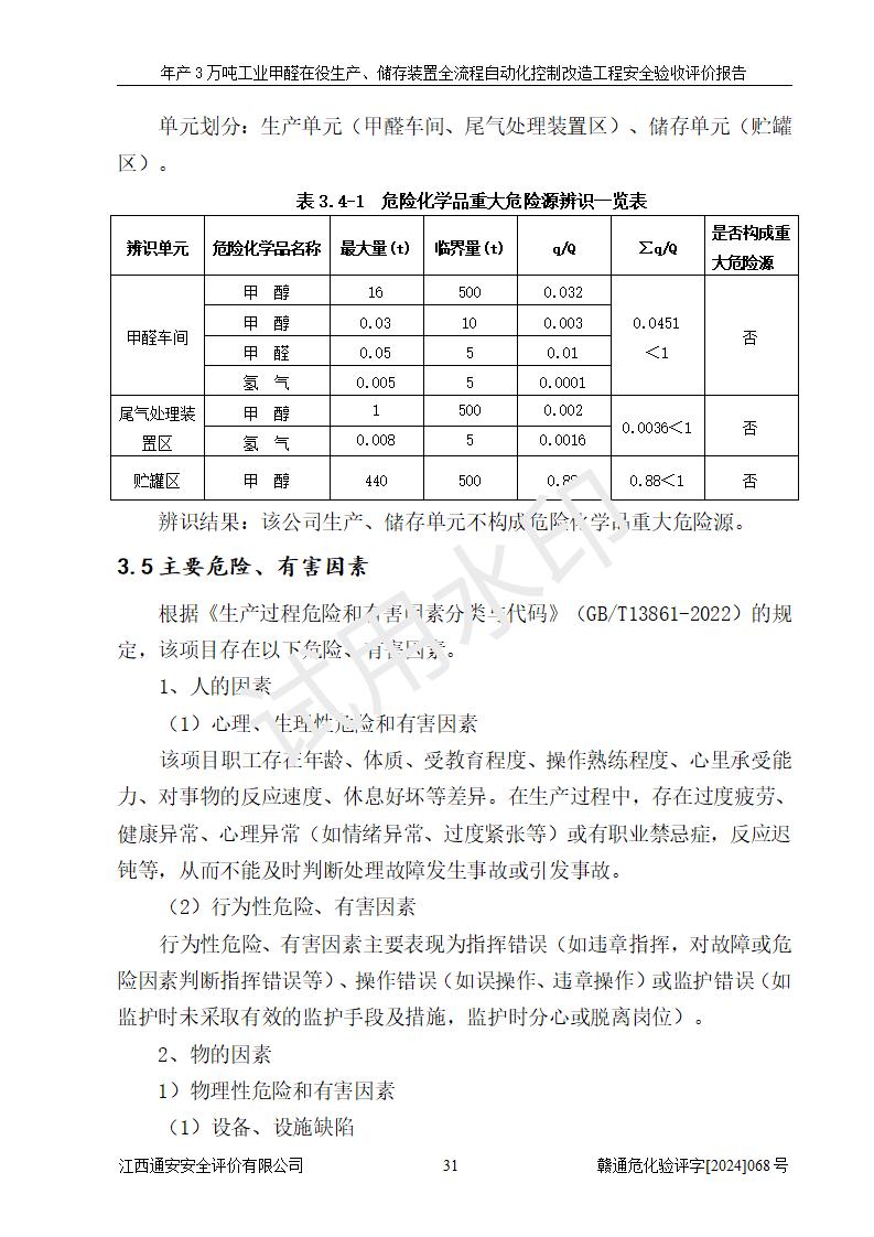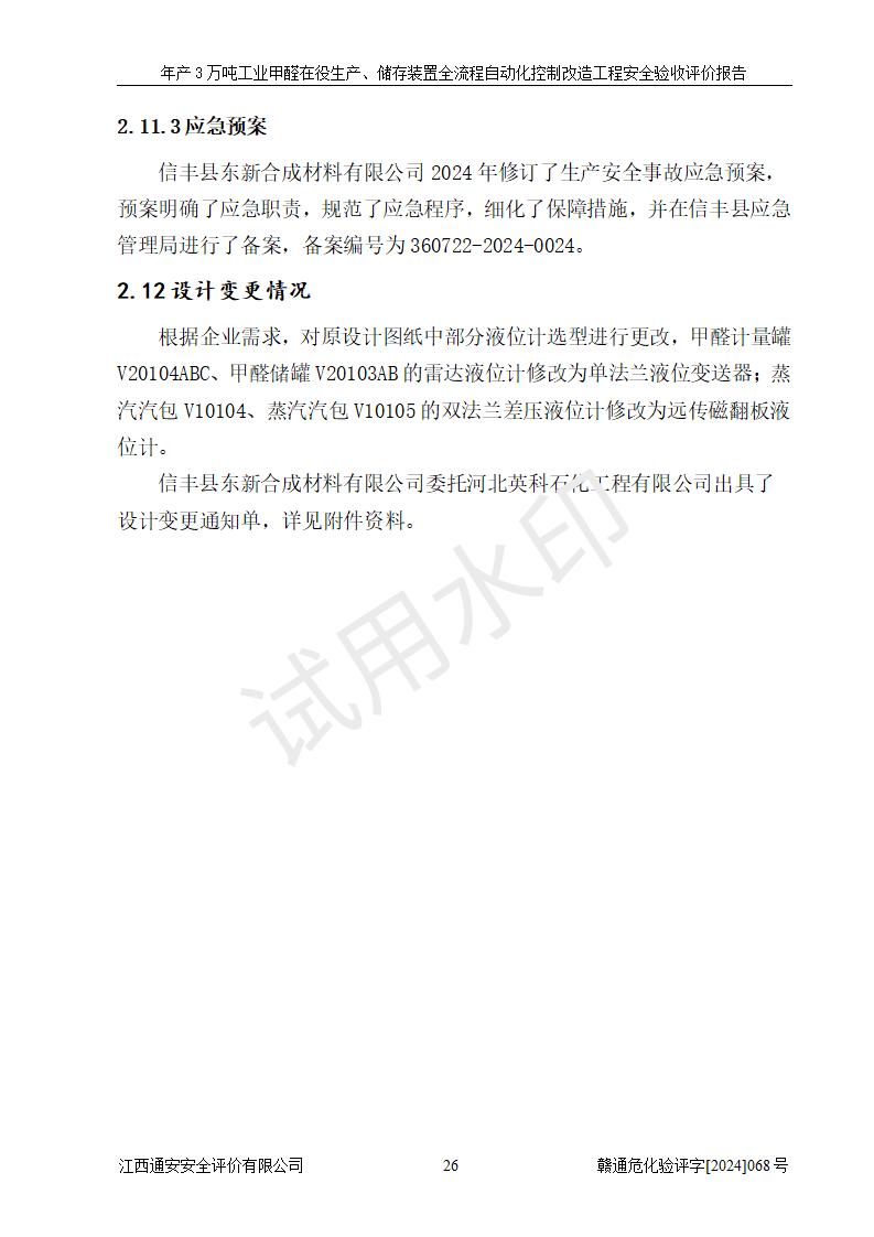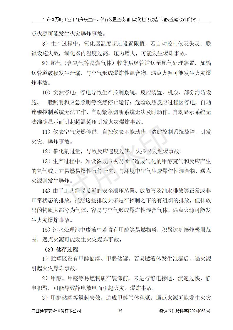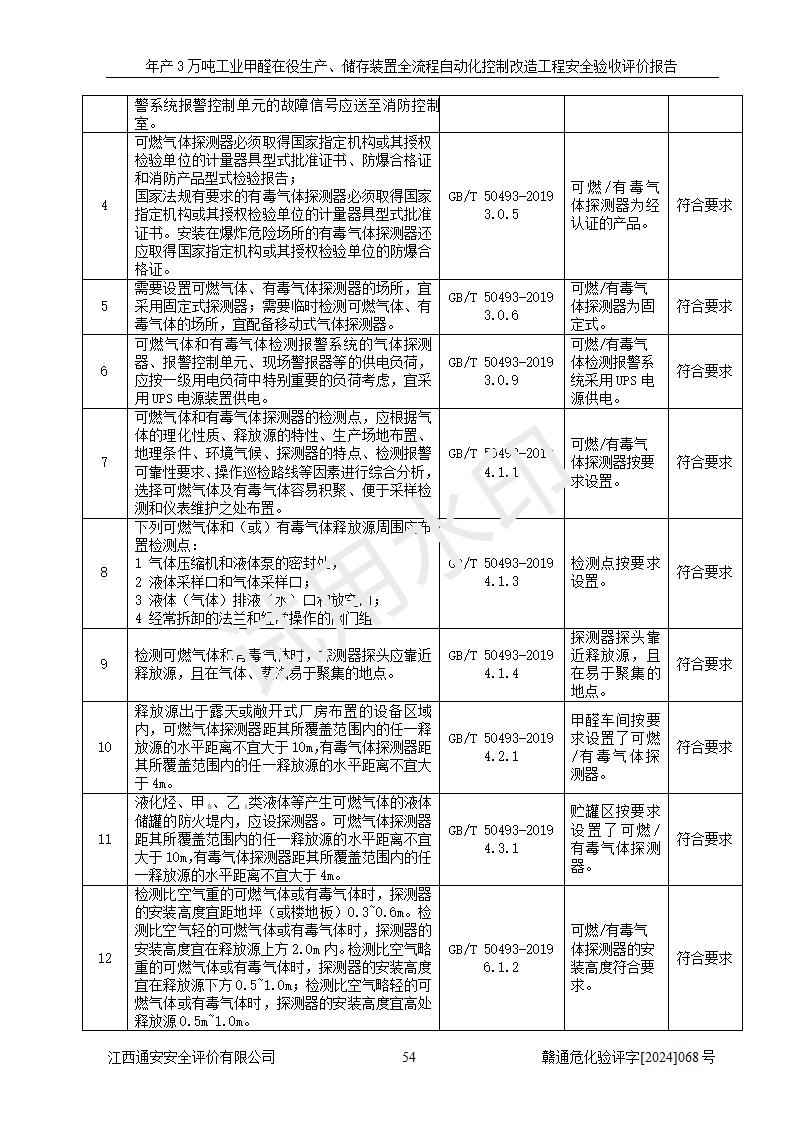 評(píng)價(jià)結(jié)論 | 信豐縣東新合成材料有限公司年產(chǎn)3萬(wàn)噸工業(yè)甲醛在役生產(chǎn)、儲(chǔ)存裝置全流程自動(dòng)化控制改造設(shè)計(jì)方案中提出的控制措施已得到落實(shí),自動(dòng)化控制系統(tǒng)設(shè)置情況與設(shè)計(jì)方案一致,滿足《江西省應(yīng)急管理廳關(guān)于印發(fā)<江西省化工企業(yè)自動(dòng)化提升實(shí)施方案>(試行)的通知》(贛應(yīng)急字〔2021〕190號(hào))的要求,具備自動(dòng)化控制改造工程竣工驗(yàn)收條件。 | ||||||