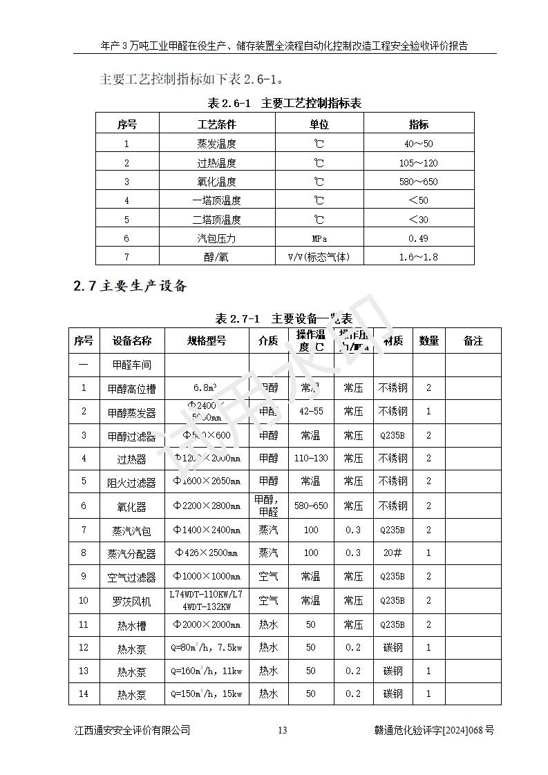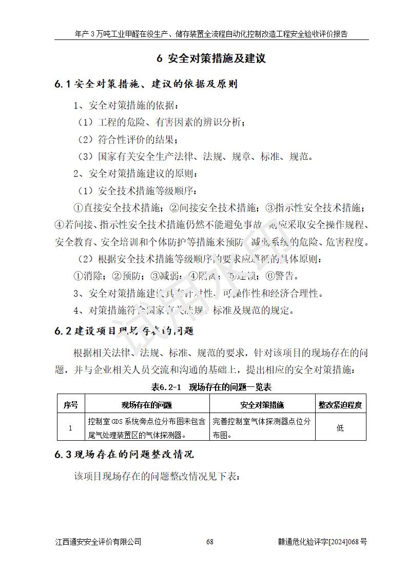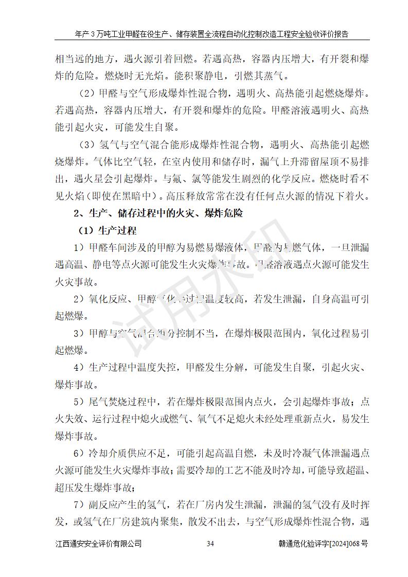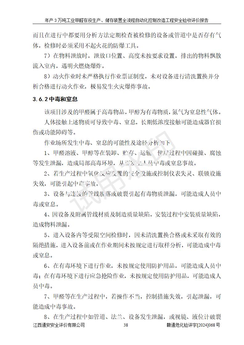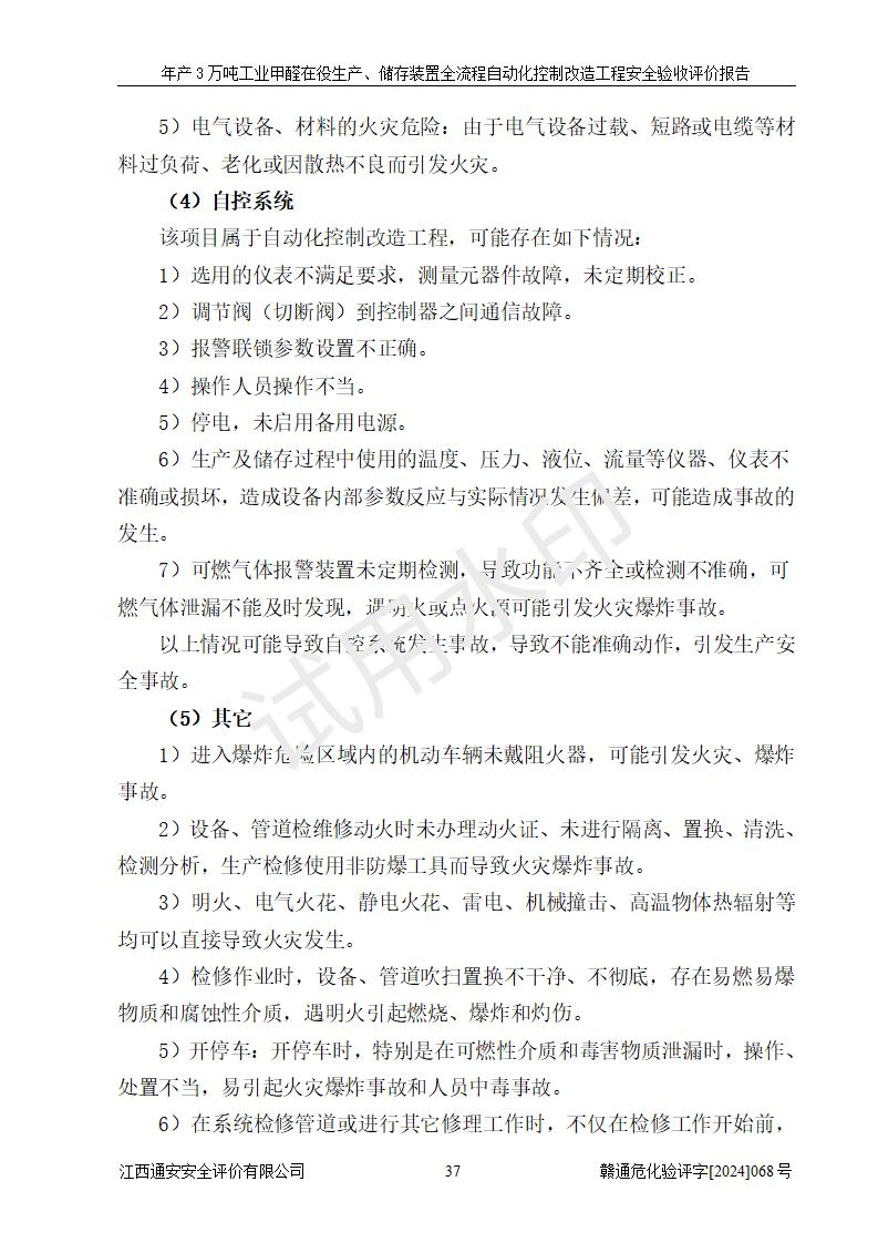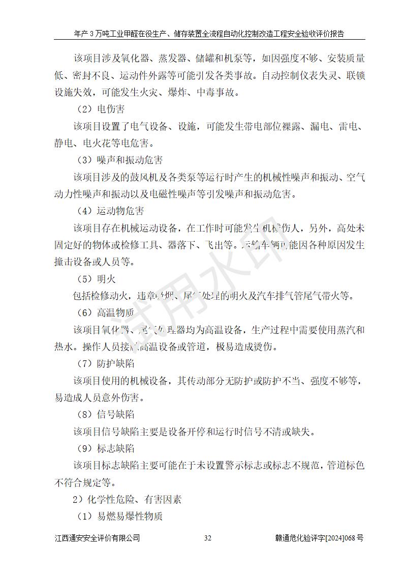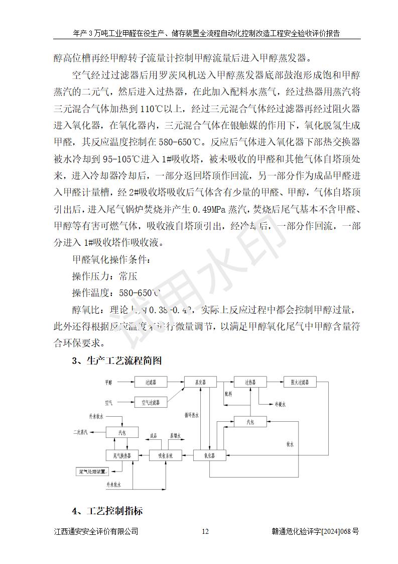 評(píng)價(jià)結(jié)論 | 信豐縣東新合成材料有限公司年產(chǎn)3萬(wàn)噸工業(yè)甲醛在役生產(chǎn)、儲(chǔ)存裝置全流程自動(dòng)化控制改造設(shè)計(jì)方案中提出的控制措施已得到落實(shí),自動(dòng)化控制系統(tǒng)設(shè)置情況與設(shè)計(jì)方案一致,滿足《江西省應(yīng)急管理廳關(guān)于印發(fā)<江西省化工企業(yè)自動(dòng)化提升實(shí)施方案>(試行)的通知》(贛應(yīng)急字〔2021〕190號(hào))的要求,具備自動(dòng)化控制改造工程竣工驗(yàn)收條件。 | ||||||