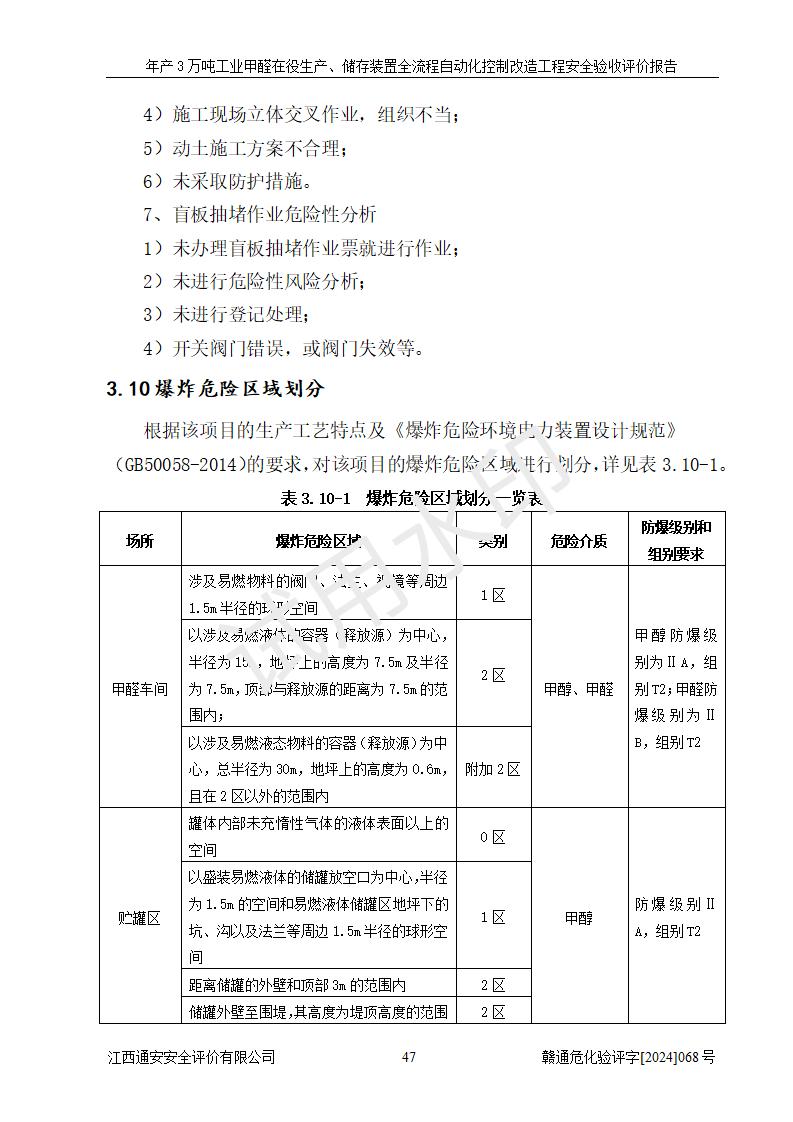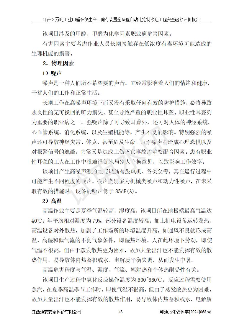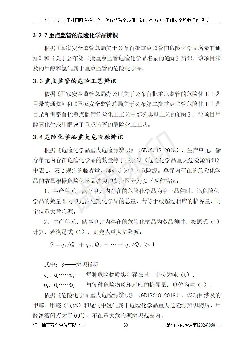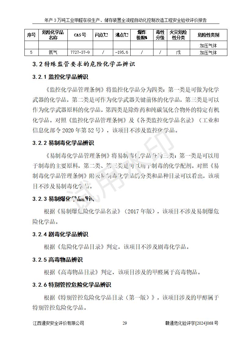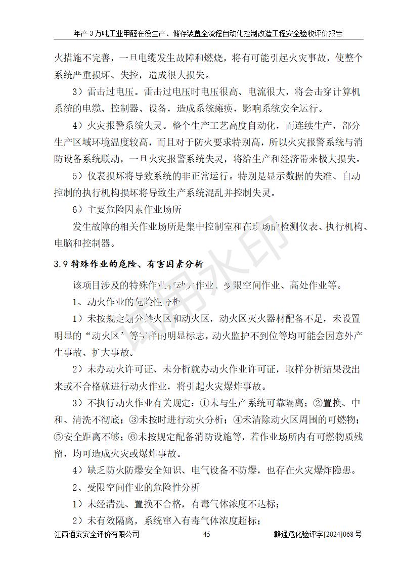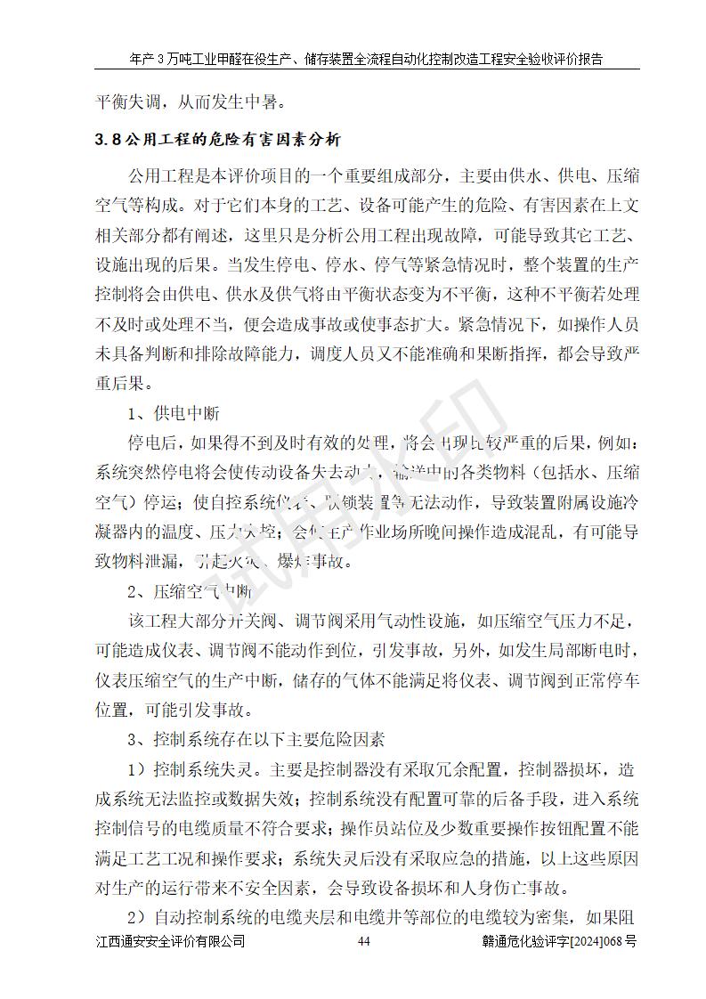 評(píng)價(jià)結(jié)論 | 信豐縣東新合成材料有限公司年產(chǎn)3萬(wàn)噸工業(yè)甲醛在役生產(chǎn)、儲(chǔ)存裝置全流程自動(dòng)化控制改造設(shè)計(jì)方案中提出的控制措施已得到落實(shí),自動(dòng)化控制系統(tǒng)設(shè)置情況與設(shè)計(jì)方案一致,滿足《江西省應(yīng)急管理廳關(guān)于印發(fā)<江西省化工企業(yè)自動(dòng)化提升實(shí)施方案>(試行)的通知》(贛應(yīng)急字〔2021〕190號(hào))的要求,具備自動(dòng)化控制改造工程竣工驗(yàn)收條件。 | ||||||