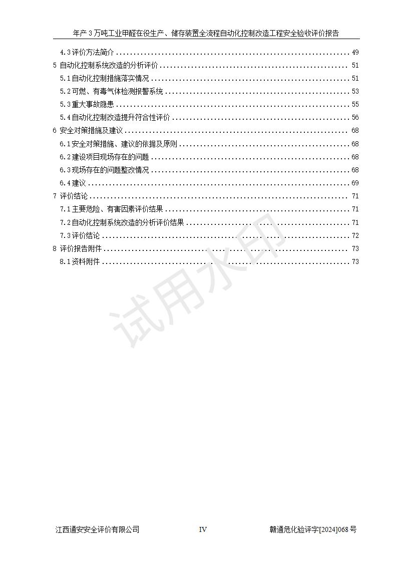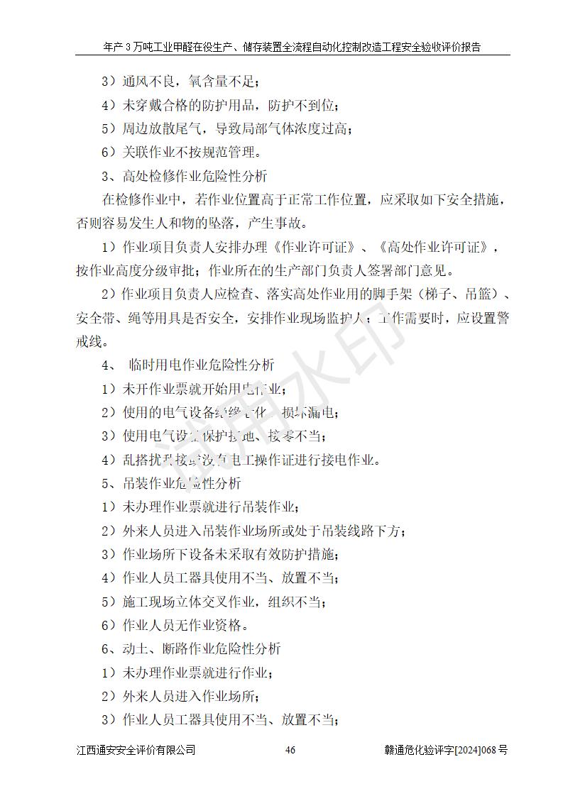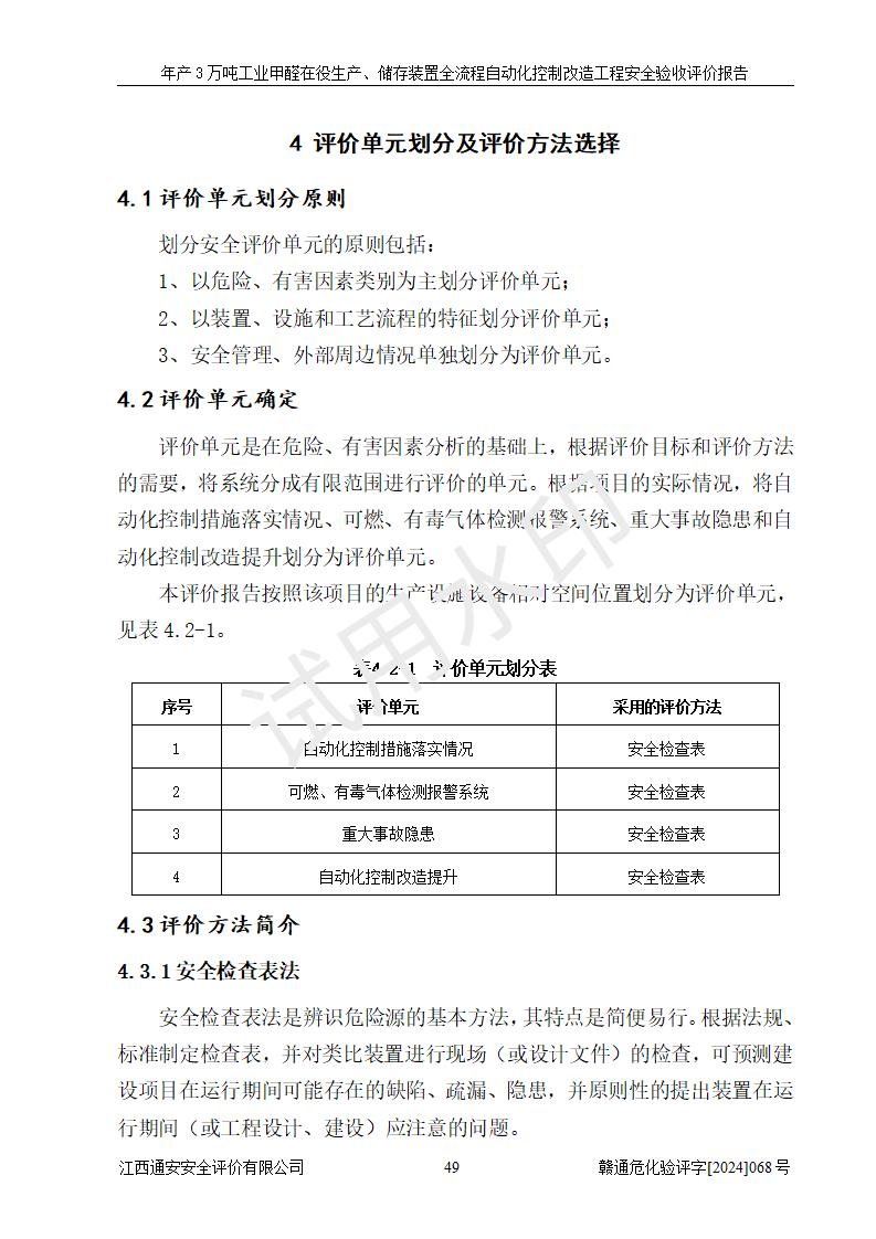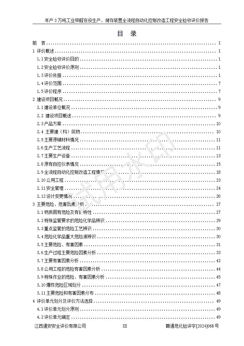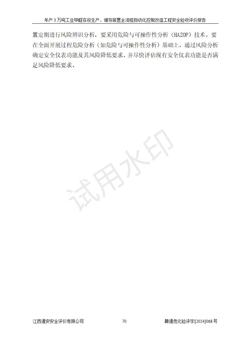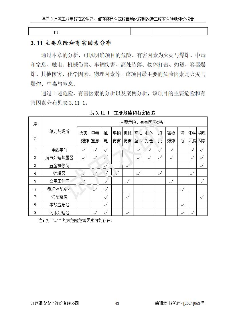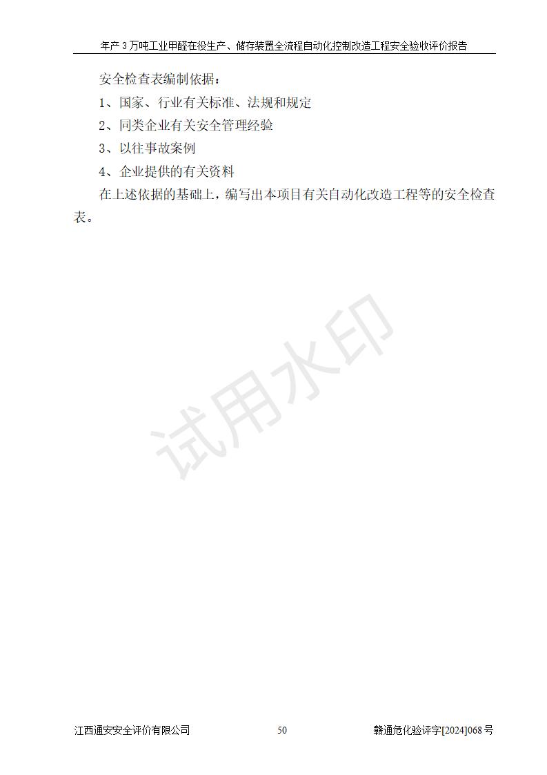 評(píng)價(jià)結(jié)論 | 信豐縣東新合成材料有限公司年產(chǎn)3萬(wàn)噸工業(yè)甲醛在役生產(chǎn)、儲(chǔ)存裝置全流程自動(dòng)化控制改造設(shè)計(jì)方案中提出的控制措施已得到落實(shí),自動(dòng)化控制系統(tǒng)設(shè)置情況與設(shè)計(jì)方案一致,滿足《江西省應(yīng)急管理廳關(guān)于印發(fā)<江西省化工企業(yè)自動(dòng)化提升實(shí)施方案>(試行)的通知》(贛應(yīng)急字〔2021〕190號(hào))的要求,具備自動(dòng)化控制改造工程竣工驗(yàn)收條件。 | ||||||