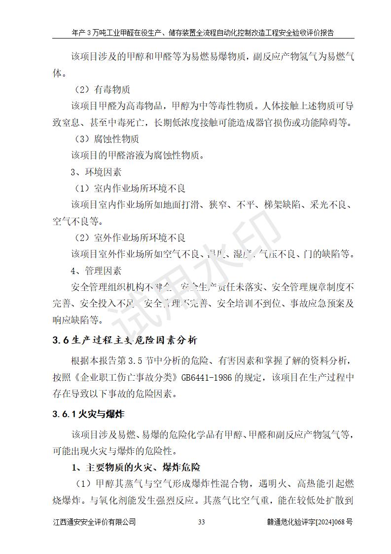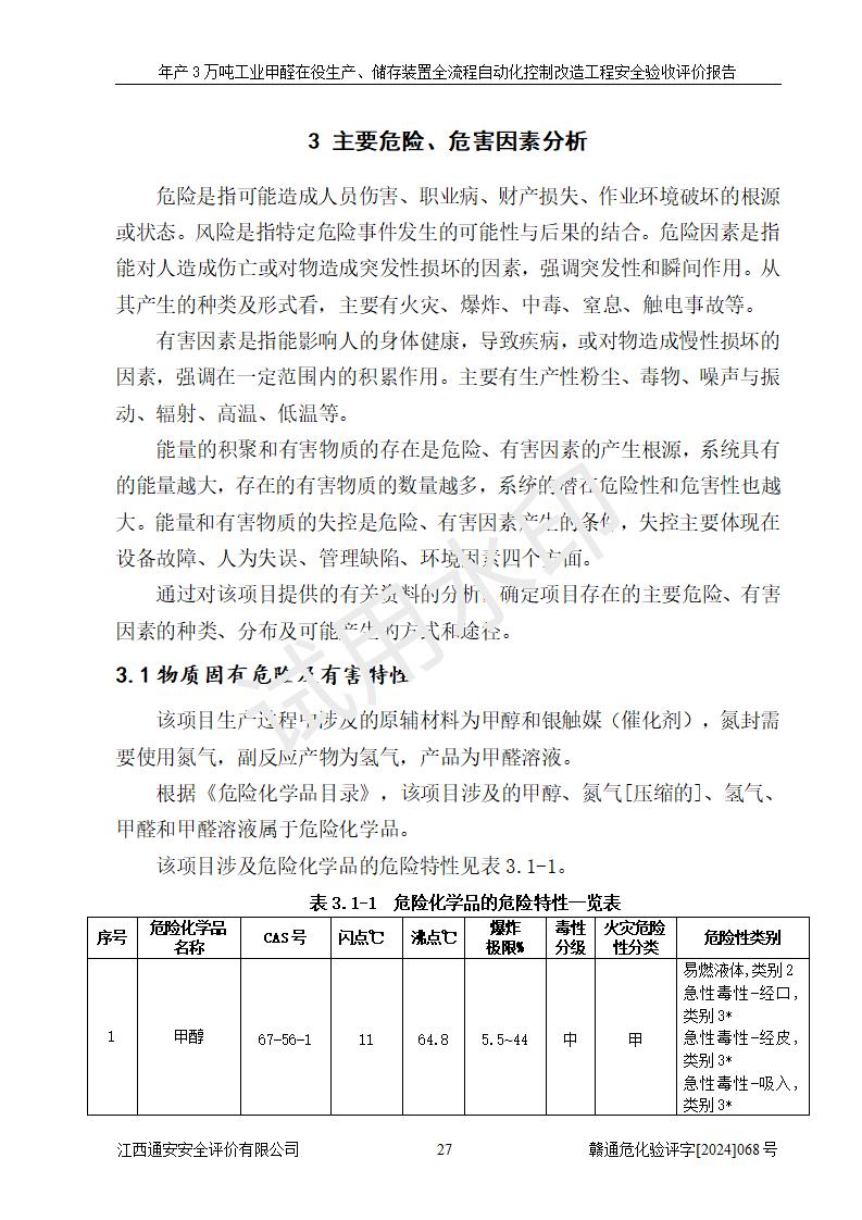 項(xiàng)目簡(jiǎn)介 | 信豐縣東新合成材料有限公司位于江西省贛州市信豐縣工業(yè)園工業(yè)大道10號(hào),法定**人為劉秀賢,成立于2010年12月20日,注冊(cè)資本壹仟萬(wàn)元整,經(jīng)營(yíng)范圍為甲醛生產(chǎn)、銷售等。 信豐縣東新合成材料有限公司2022年04月08日取得了《安全生產(chǎn)許可證》,許可證編號(hào):(贛)WH安許證字[2013]0741號(hào),許可范圍為甲醛(30kt/a),**期為2022年04月23日至2025年04月22日。根據(jù)《江西省應(yīng)急管理廳關(guān)于印發(fā)<江西省企業(yè)安全生產(chǎn)標(biāo)準(zhǔn)化建設(shè)定級(jí)實(shí)施辦法(試行)的通知>》(贛應(yīng)急字[2022]49號(hào))等有關(guān)規(guī)定,經(jīng)過(guò)企業(yè)自評(píng)、申請(qǐng)、評(píng)審、公示,該公司2023年5月17日確定為危險(xiǎn)化學(xué)品安全生產(chǎn)標(biāo)準(zhǔn)化二級(jí)企業(yè)。該公司現(xiàn)有員工16人,其中安全管理人員1人。 企業(yè)裝置設(shè)施原有**的自動(dòng)化水平,配備有DCS系統(tǒng)和SIS系統(tǒng),廠區(qū)綜合辦公樓一樓設(shè)置了控制室。根據(jù)《江西省應(yīng)急管理廳關(guān)于印發(fā)<江西省化工企業(yè)自動(dòng)化提升實(shí)施方案>(試行)的通知》(贛應(yīng)急字〔2021〕190號(hào)),企業(yè)委托河北英科石化工程有限公司編制了《信豐縣東新合成材料有限公司年產(chǎn)3萬(wàn)噸工業(yè)甲醛在役生產(chǎn)、儲(chǔ)存裝置全流程自動(dòng)化控制改造設(shè)計(jì)方案》,且通過(guò)了專家評(píng)審。該自動(dòng)化改造工程由山東四方安裝工程有限公司負(fù)責(zé)施工、安裝,由江蘇宇陽(yáng)機(jī)電工程有限公司負(fù)責(zé)調(diào)試,并出具了調(diào)試報(bào)告。 信豐縣東新合成材料有限公司年產(chǎn)3萬(wàn)噸工業(yè)甲醛項(xiàng)目生產(chǎn)過(guò)程中涉及的原輔材料為甲醇和銀觸媒(催化劑),氮封需要使用氮?dú)?,副反?yīng)產(chǎn)物為氫氣,產(chǎn)品為甲醛溶液。根據(jù)《危險(xiǎn)化學(xué)品目錄》,該項(xiàng)目涉及的甲醇、氮?dú)?、氫氣、甲醛和甲醛溶液屬?/span>危險(xiǎn)化學(xué)品。經(jīng)辨識(shí),甲醇和氫氣屬于重點(diǎn)監(jiān)管的危險(xiǎn)化學(xué)品,甲醛屬于高毒物品,甲醇屬于特別管控的危險(xiǎn)化學(xué)品,不涉及監(jiān)控化學(xué)品、易制毒化學(xué)品、易制爆危險(xiǎn)化學(xué)品和劇毒化學(xué)品,生產(chǎn)、儲(chǔ)存單元不構(gòu)成危險(xiǎn)化學(xué)品重大危險(xiǎn)源,涉及的氧化反應(yīng)屬于重點(diǎn)監(jiān)管的危險(xiǎn)化工工藝。 | ||||||
