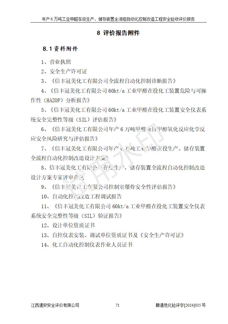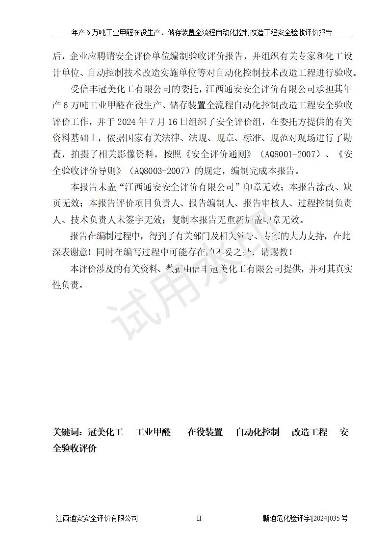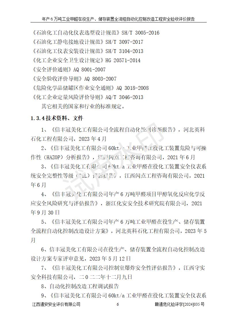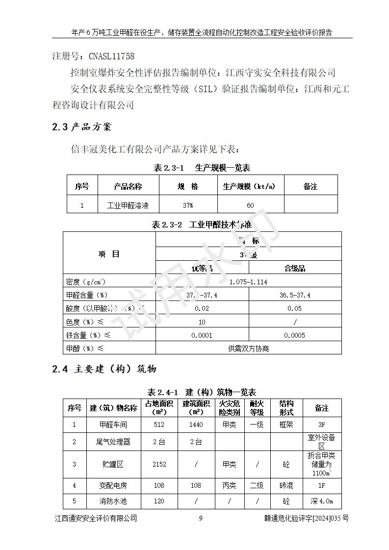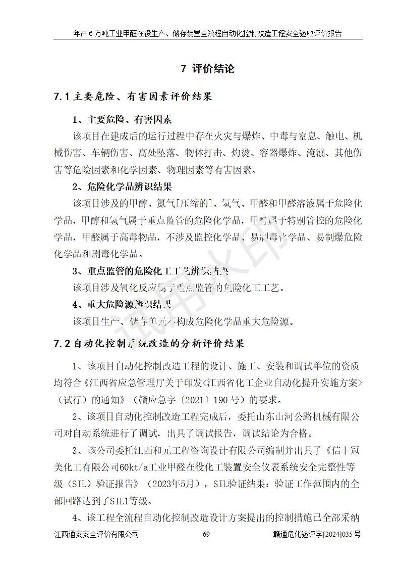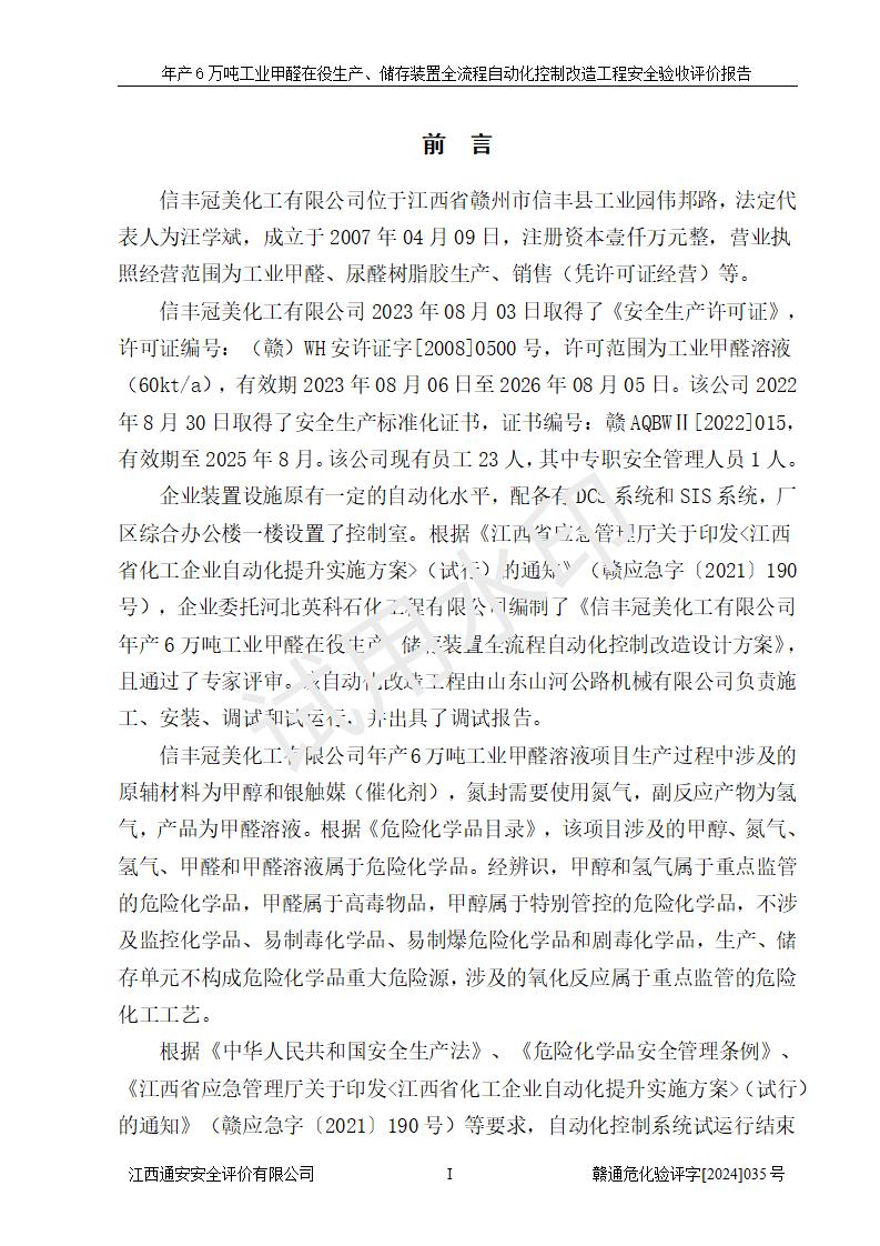 評價報告名稱 | 信豐冠美化工有限公司年產(chǎn)6萬噸工業(yè)甲醛在役生產(chǎn)、儲存裝置全流程自動化控制改造工程安全驗收評價報告 | ||||||