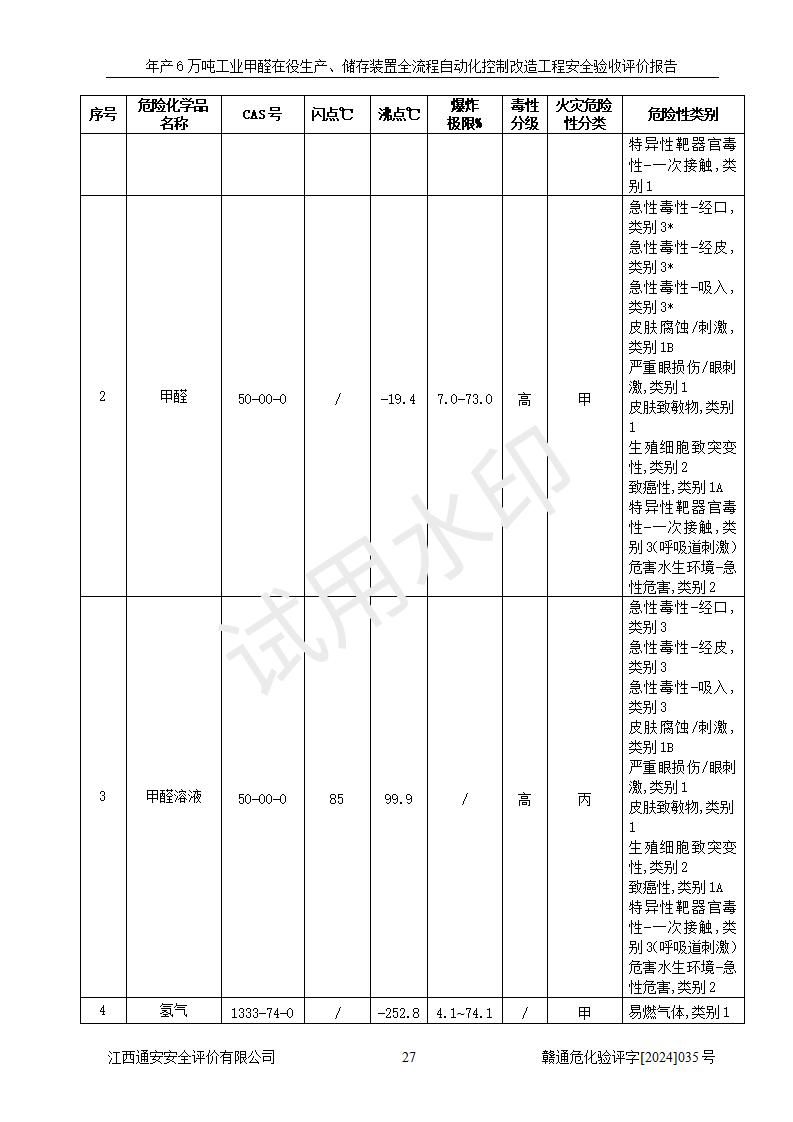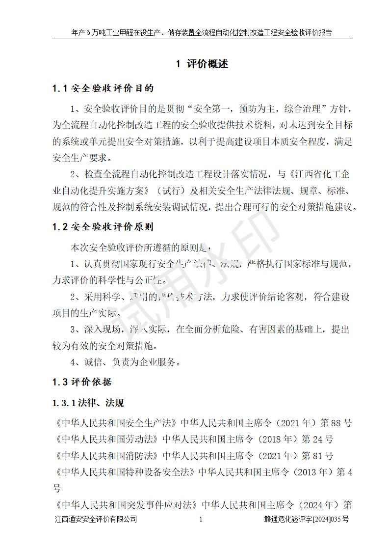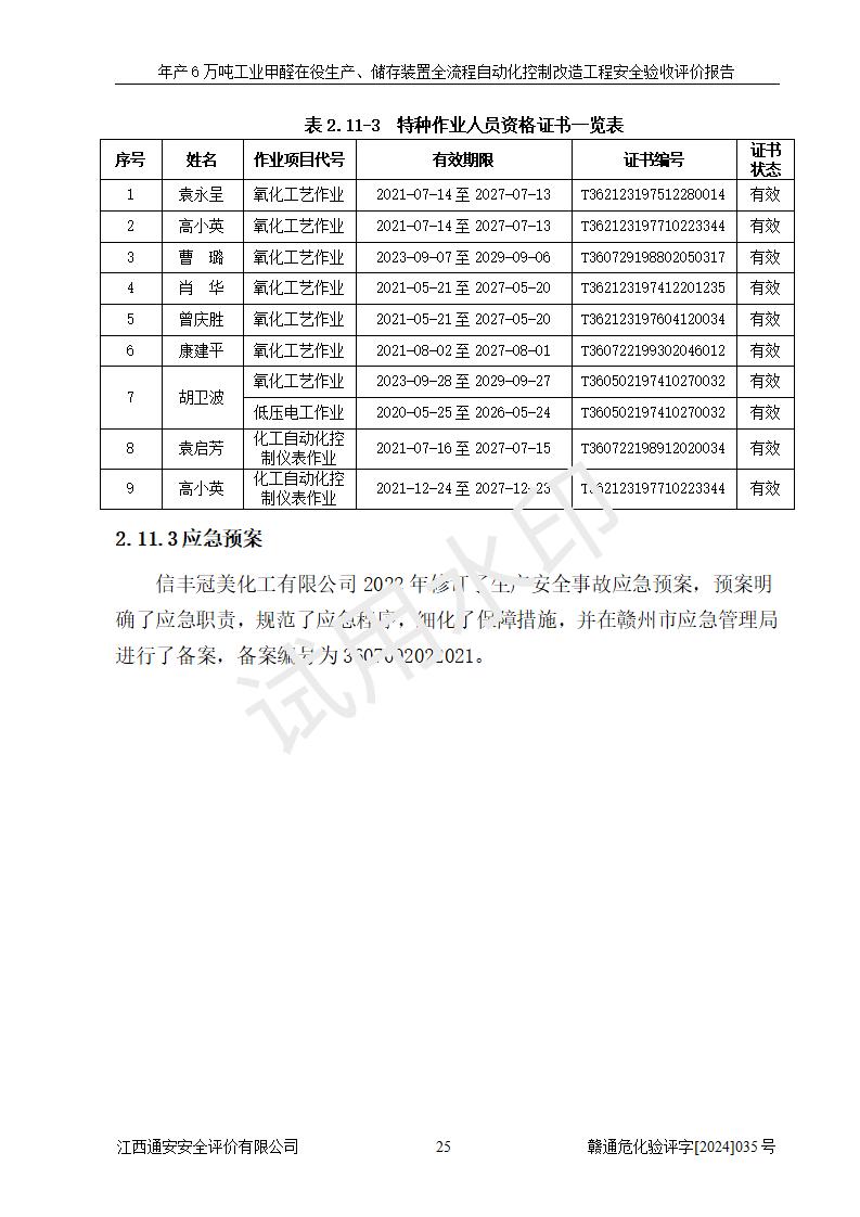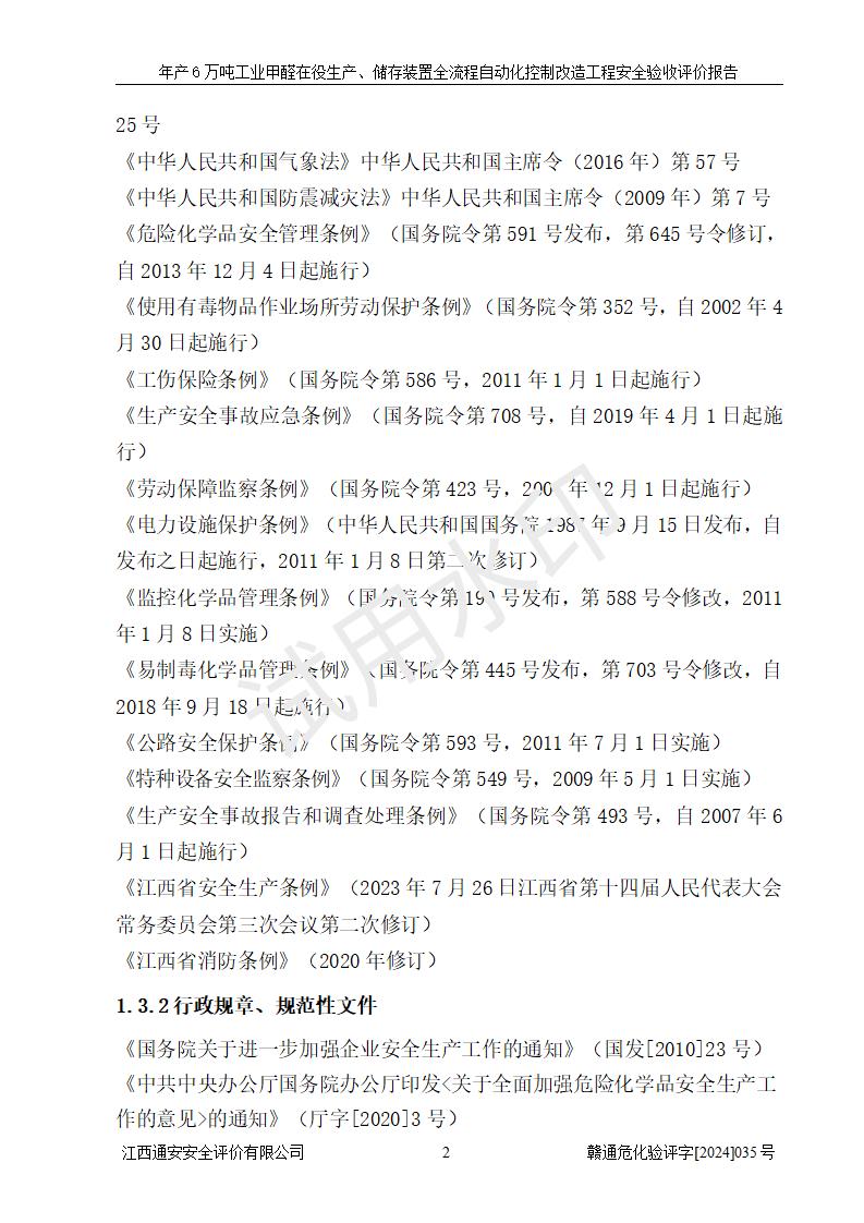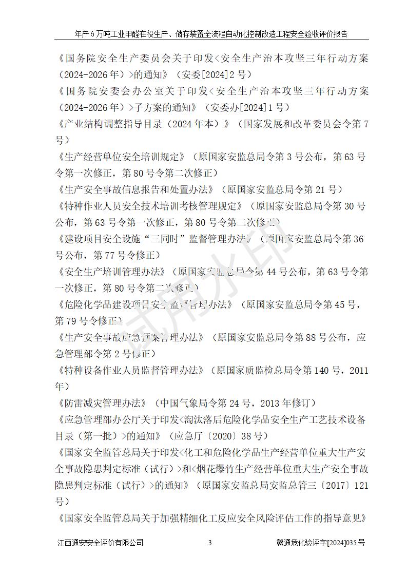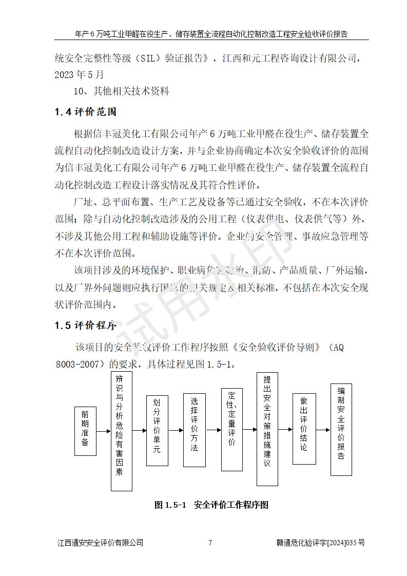 評價報告名稱 | 信豐冠美化工有限公司年產(chǎn)6萬噸工業(yè)甲醛在役生產(chǎn)、儲存裝置全流程自動化控制改造工程安全驗收評價報告 | ||||||