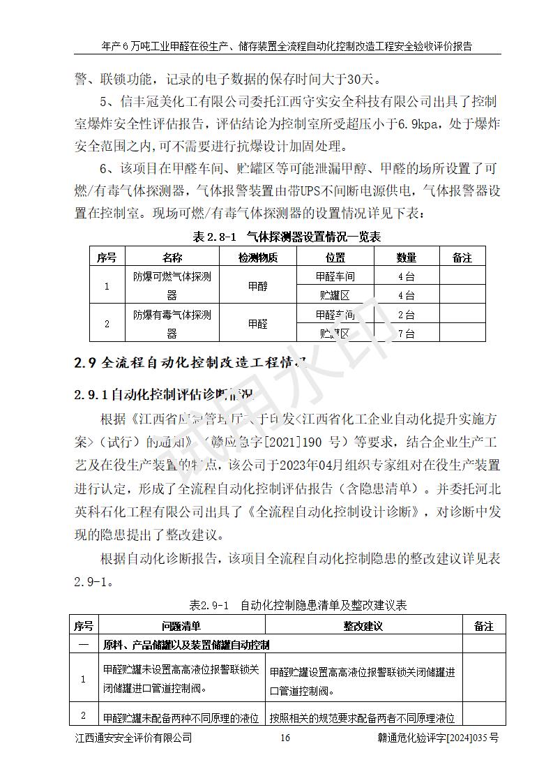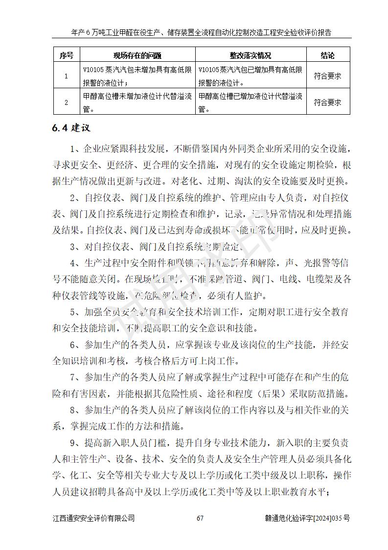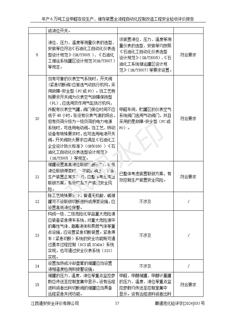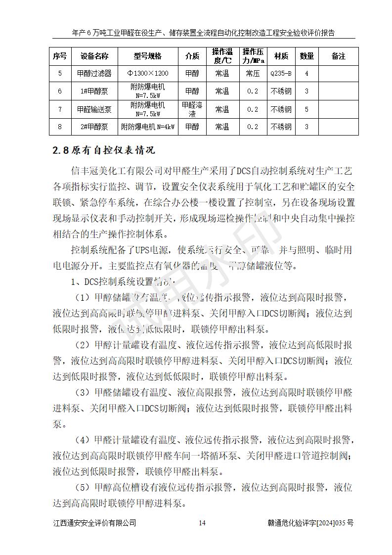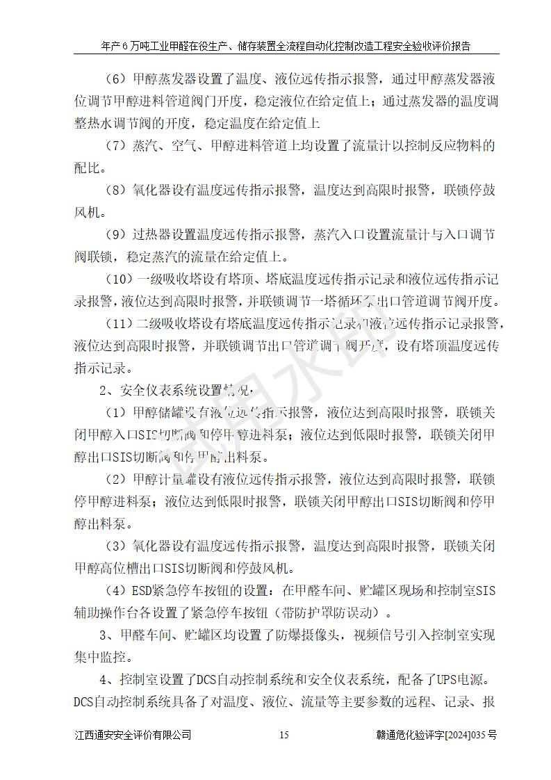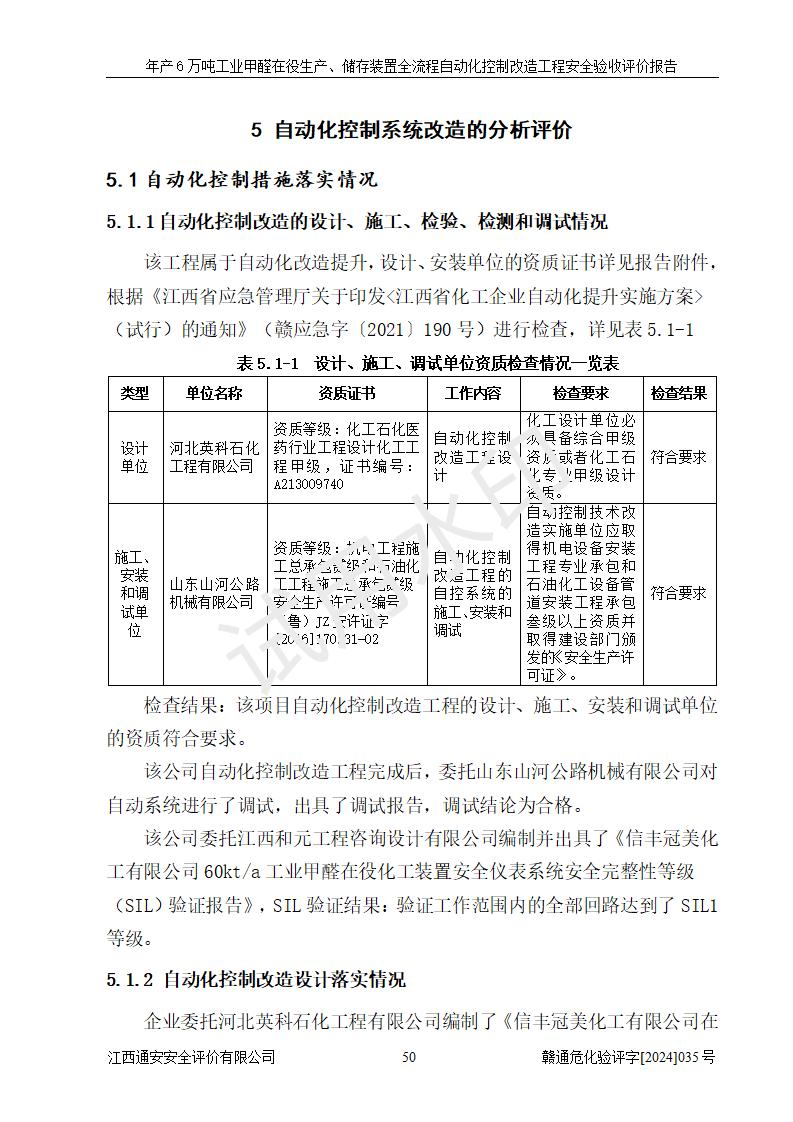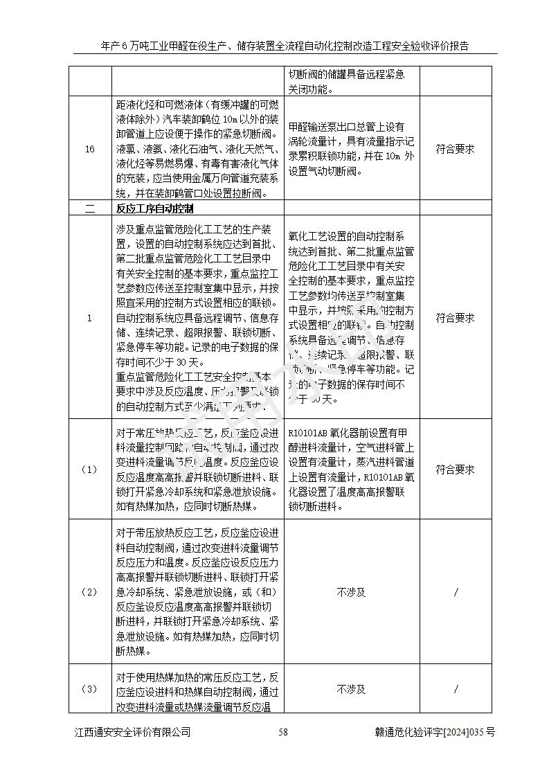 評價結(jié)論 | 信豐冠美化工有限公司年產(chǎn)6萬噸工業(yè)甲醛在役生產(chǎn)、儲存裝置全流程自動化控制改造設(shè)計方案中提出的控制措施已得到落實,自動化控制系統(tǒng)設(shè)置情況與設(shè)計方案一致,滿足《江西省應(yīng)急管理廳關(guān)于印發(fā)<江西省化工企業(yè)自動化提升實施方案>(試行)的通知》(贛應(yīng)急字〔2021〕190號)的要求,具備自動化控制改造工程竣工驗收條件。 | ||||||