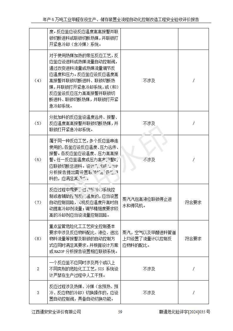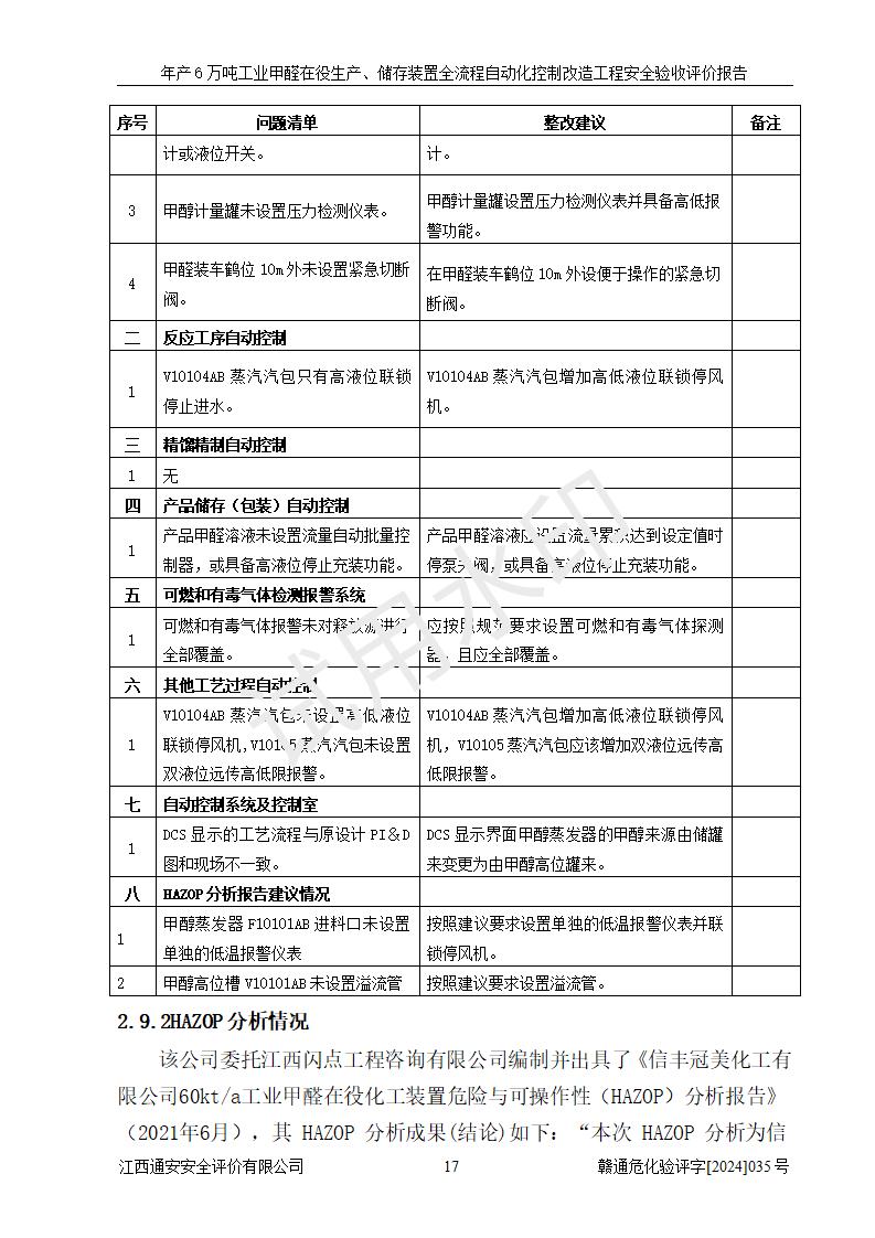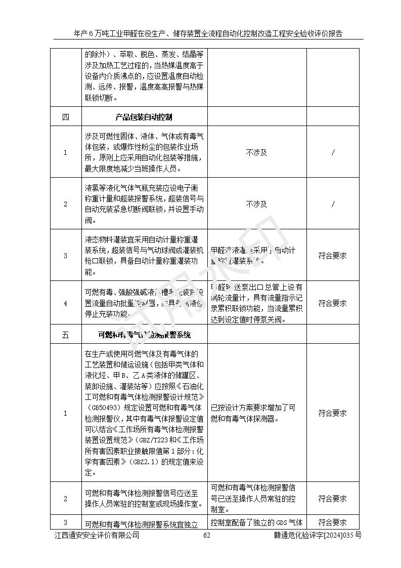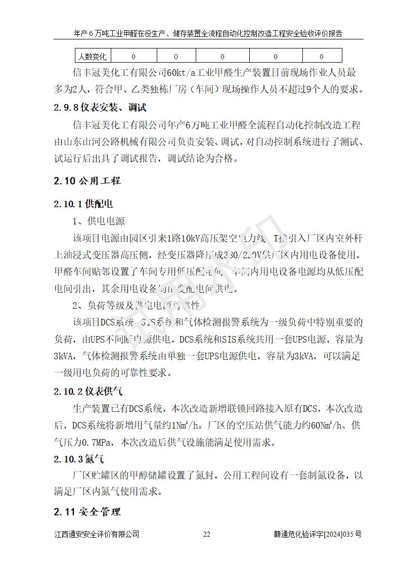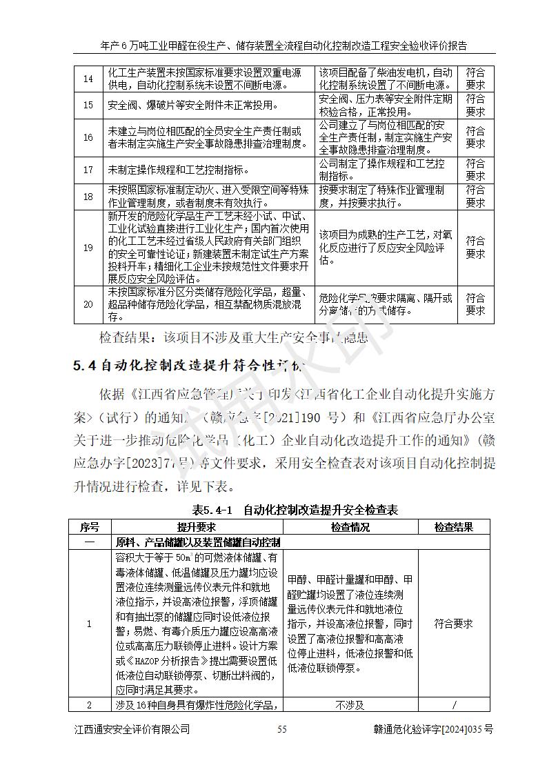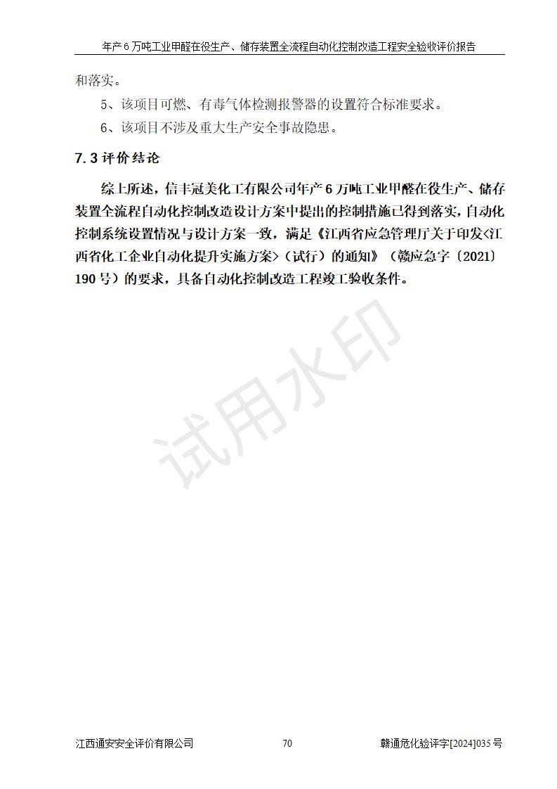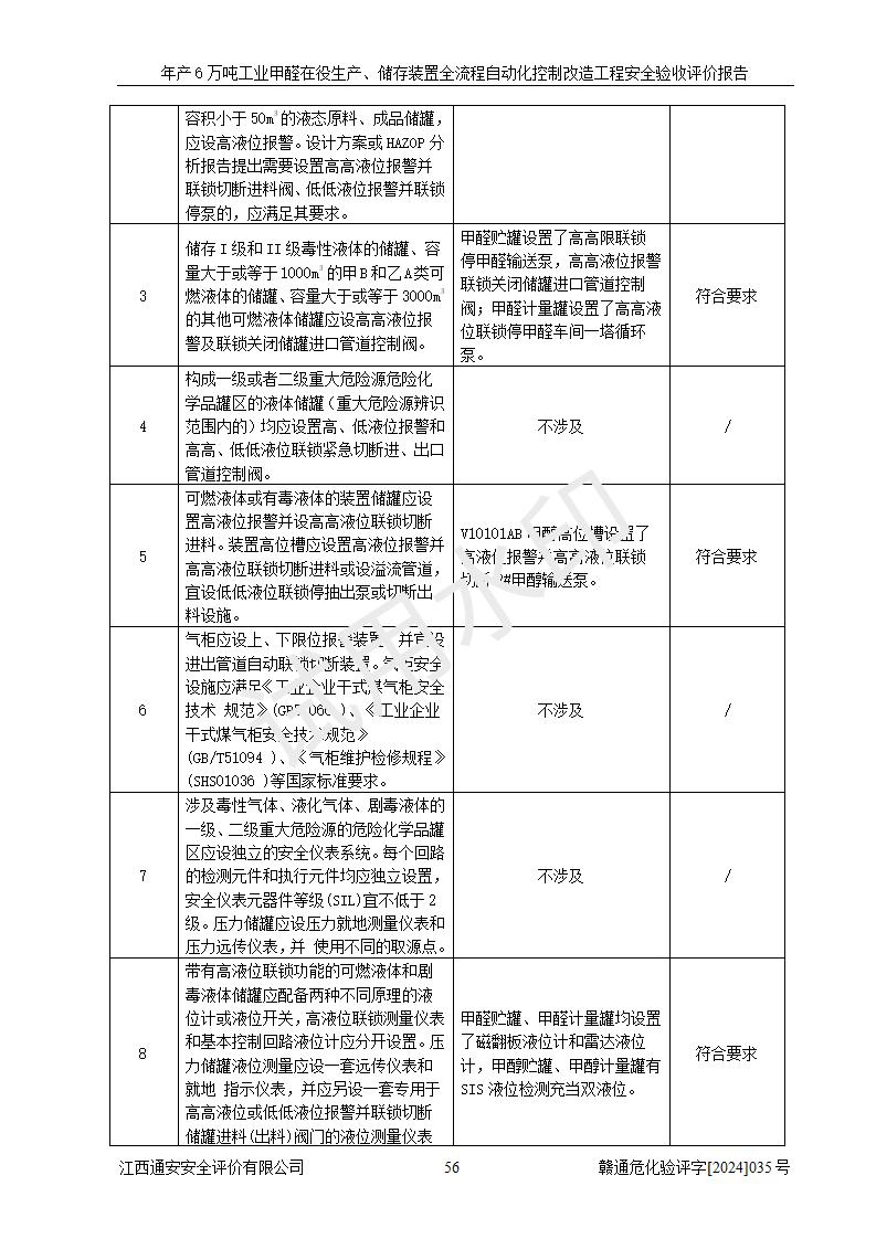 評價結(jié)論 | 信豐冠美化工有限公司年產(chǎn)6萬噸工業(yè)甲醛在役生產(chǎn)、儲存裝置全流程自動化控制改造設(shè)計方案中提出的控制措施已得到落實,自動化控制系統(tǒng)設(shè)置情況與設(shè)計方案一致,滿足《江西省應(yīng)急管理廳關(guān)于印發(fā)<江西省化工企業(yè)自動化提升實施方案>(試行)的通知》(贛應(yīng)急字〔2021〕190號)的要求,具備自動化控制改造工程竣工驗收條件。 | ||||||