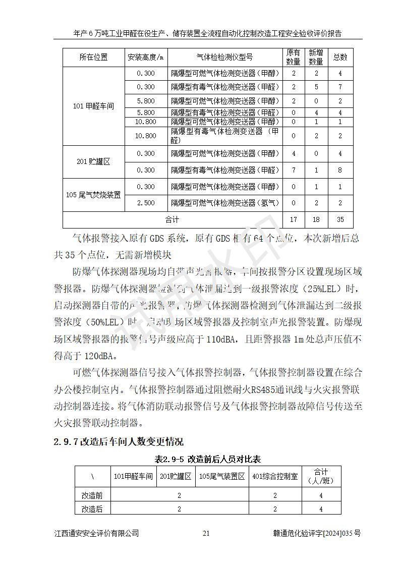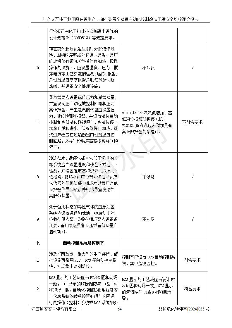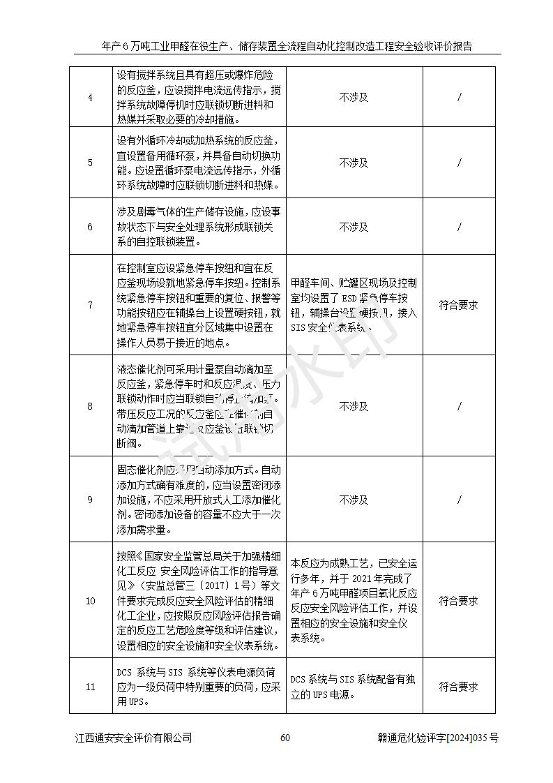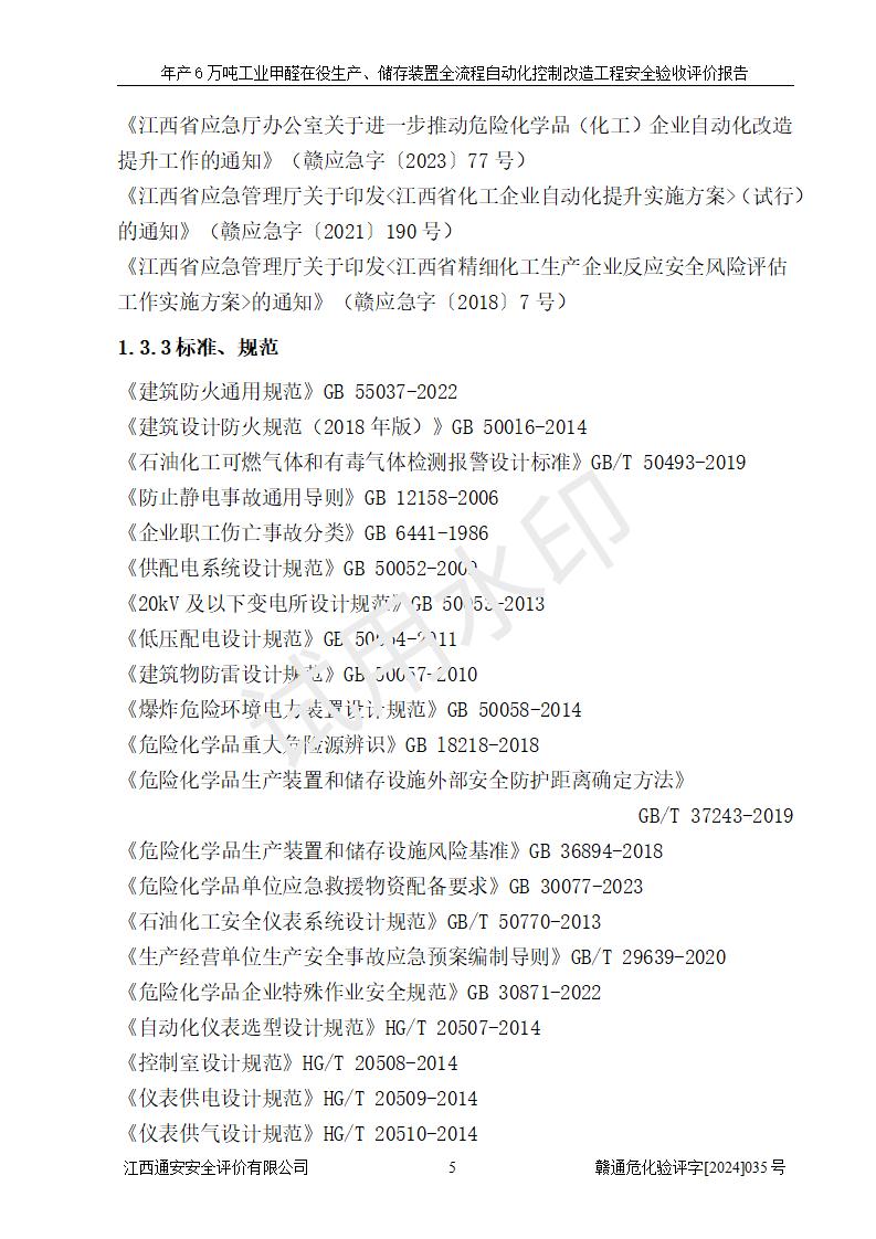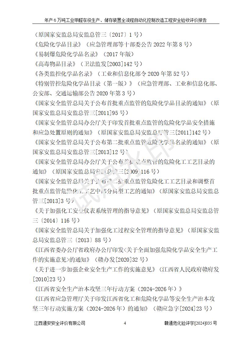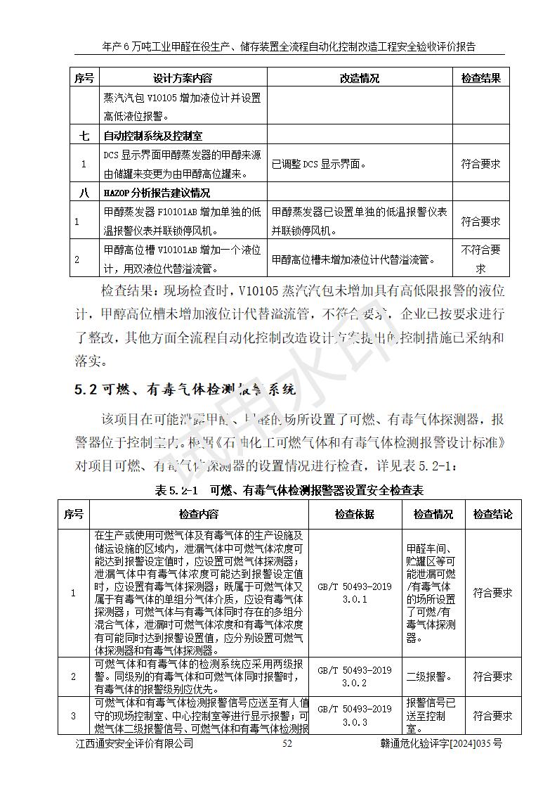 評價結(jié)論 | 信豐冠美化工有限公司年產(chǎn)6萬噸工業(yè)甲醛在役生產(chǎn)、儲存裝置全流程自動化控制改造設(shè)計方案中提出的控制措施已得到落實,自動化控制系統(tǒng)設(shè)置情況與設(shè)計方案一致,滿足《江西省應(yīng)急管理廳關(guān)于印發(fā)<江西省化工企業(yè)自動化提升實施方案>(試行)的通知》(贛應(yīng)急字〔2021〕190號)的要求,具備自動化控制改造工程竣工驗收條件。 | ||||||