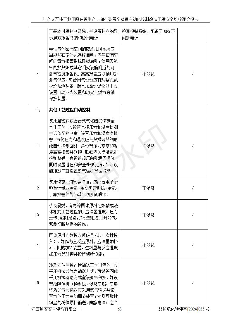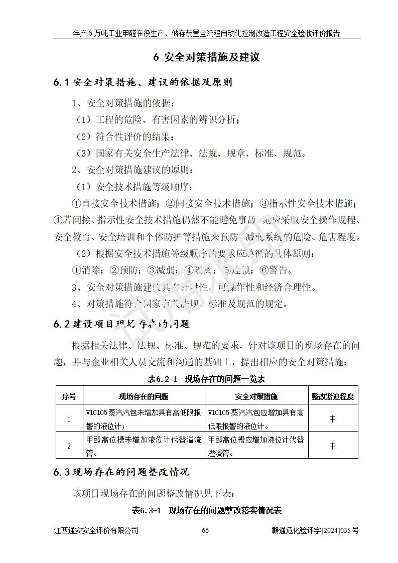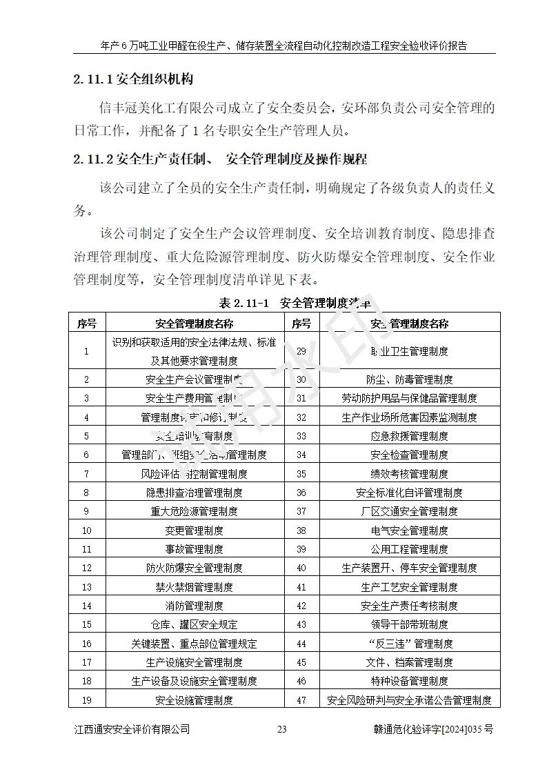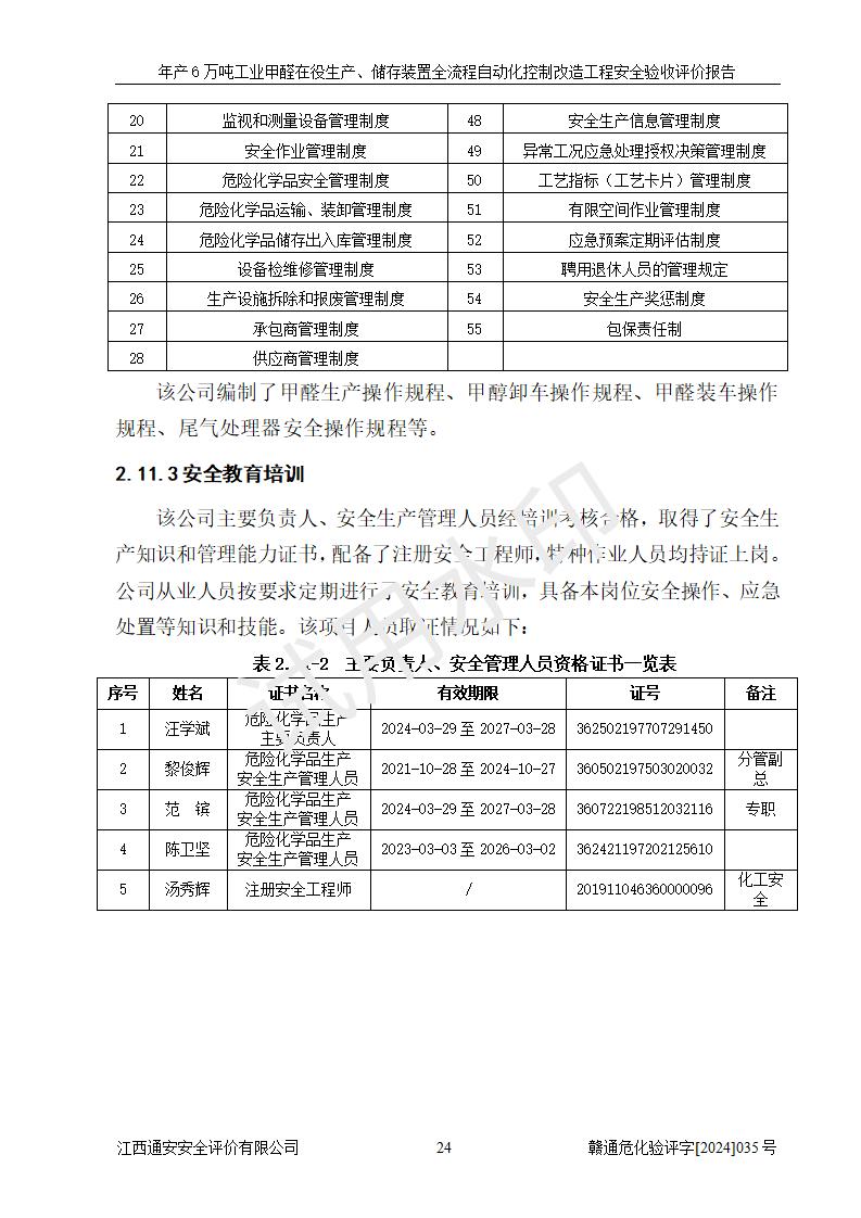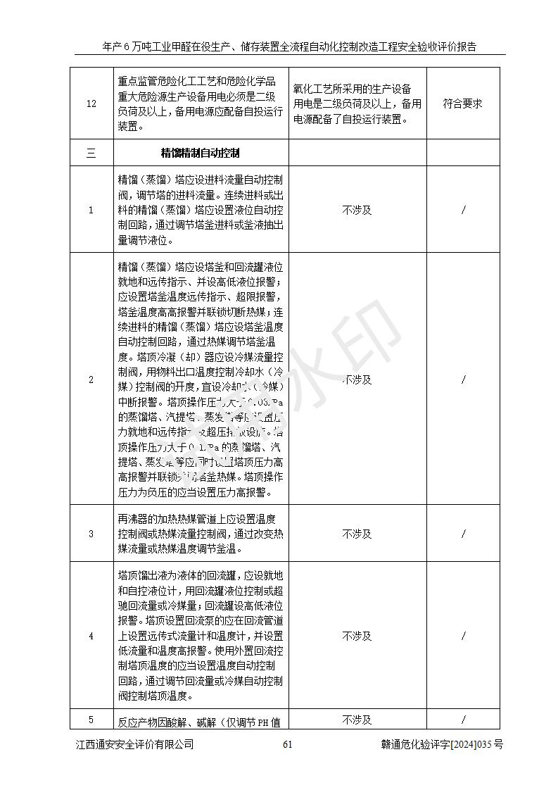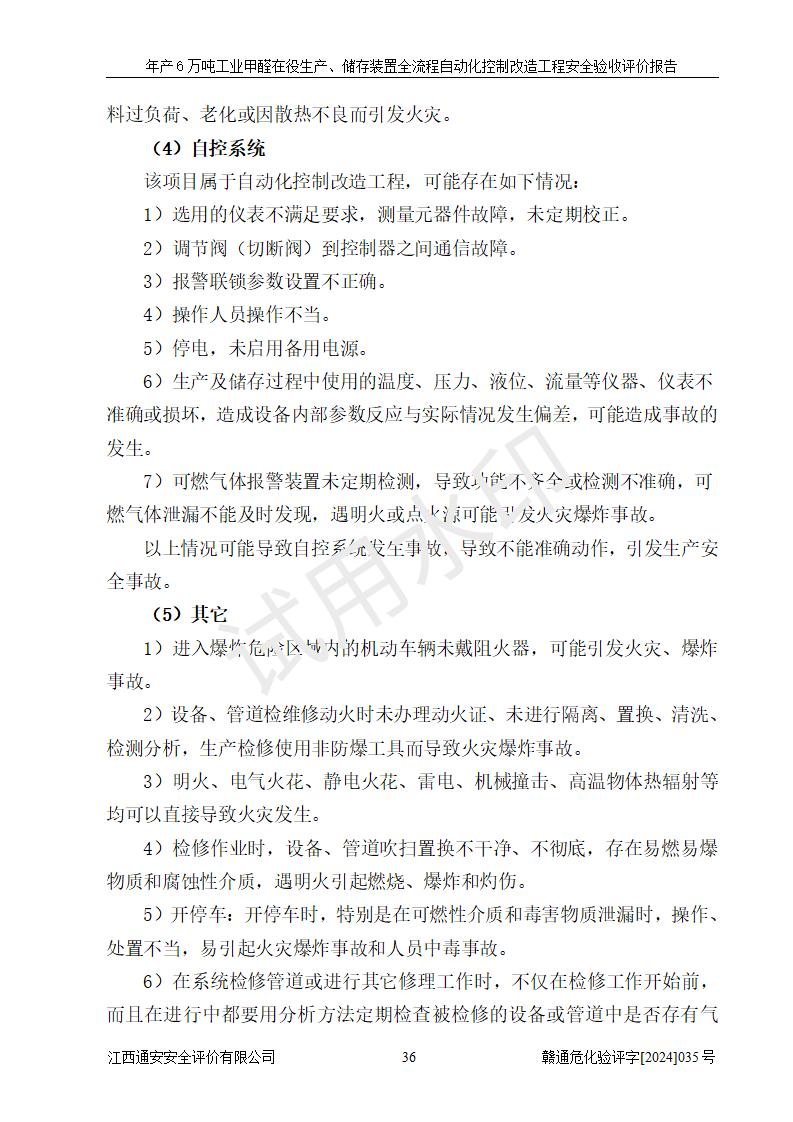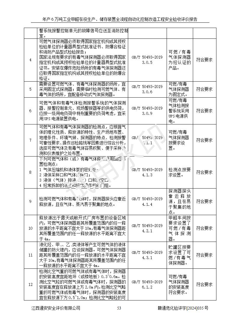 評價結(jié)論 | 信豐冠美化工有限公司年產(chǎn)6萬噸工業(yè)甲醛在役生產(chǎn)、儲存裝置全流程自動化控制改造設(shè)計方案中提出的控制措施已得到落實,自動化控制系統(tǒng)設(shè)置情況與設(shè)計方案一致,滿足《江西省應(yīng)急管理廳關(guān)于印發(fā)<江西省化工企業(yè)自動化提升實施方案>(試行)的通知》(贛應(yīng)急字〔2021〕190號)的要求,具備自動化控制改造工程竣工驗收條件。 | ||||||