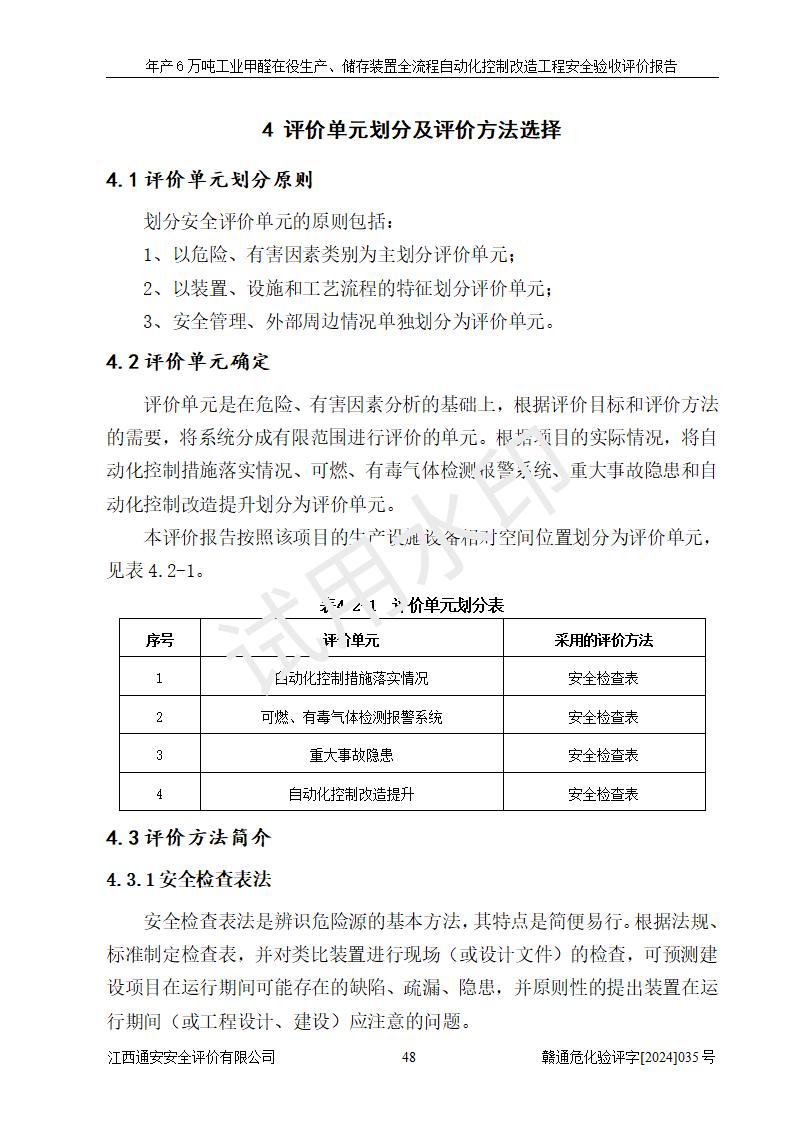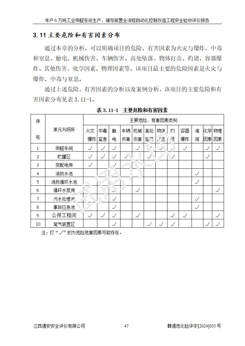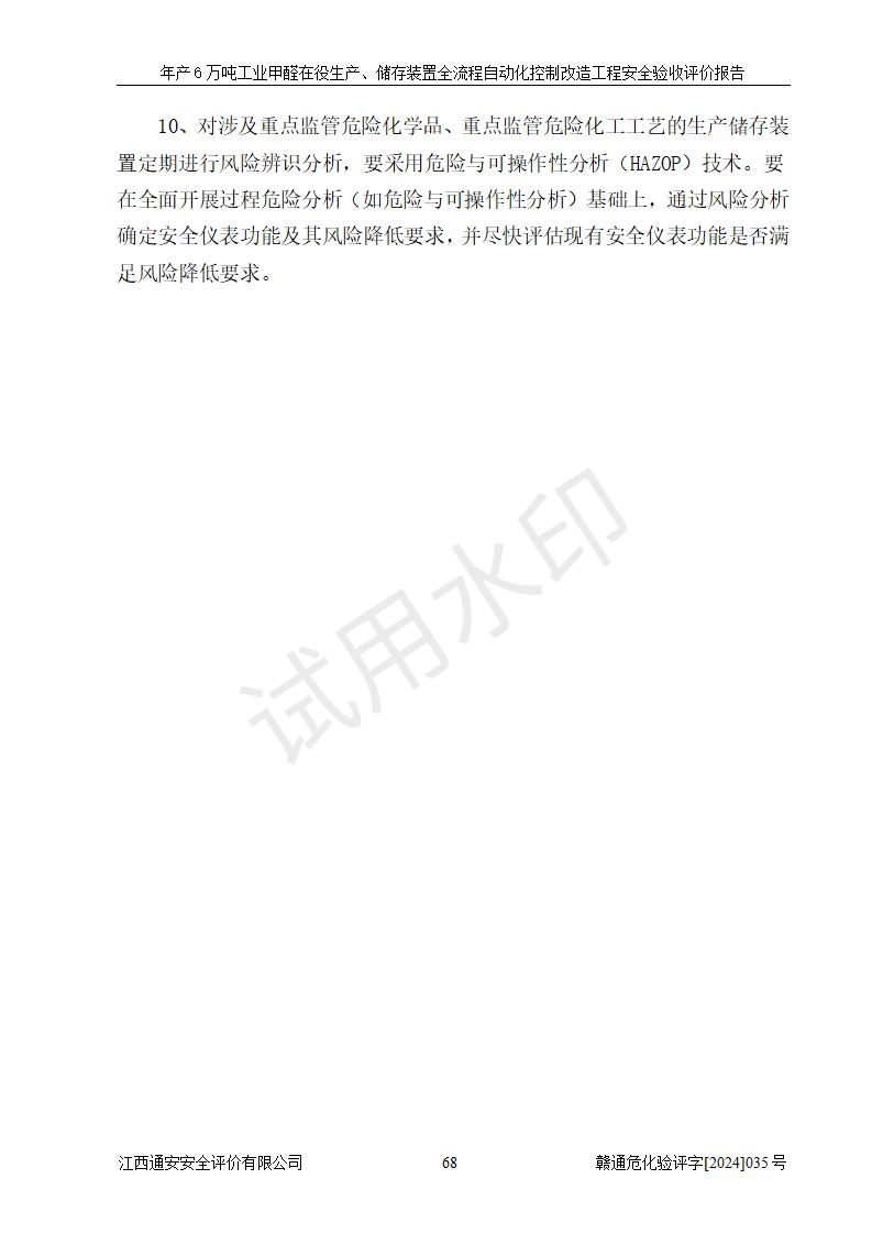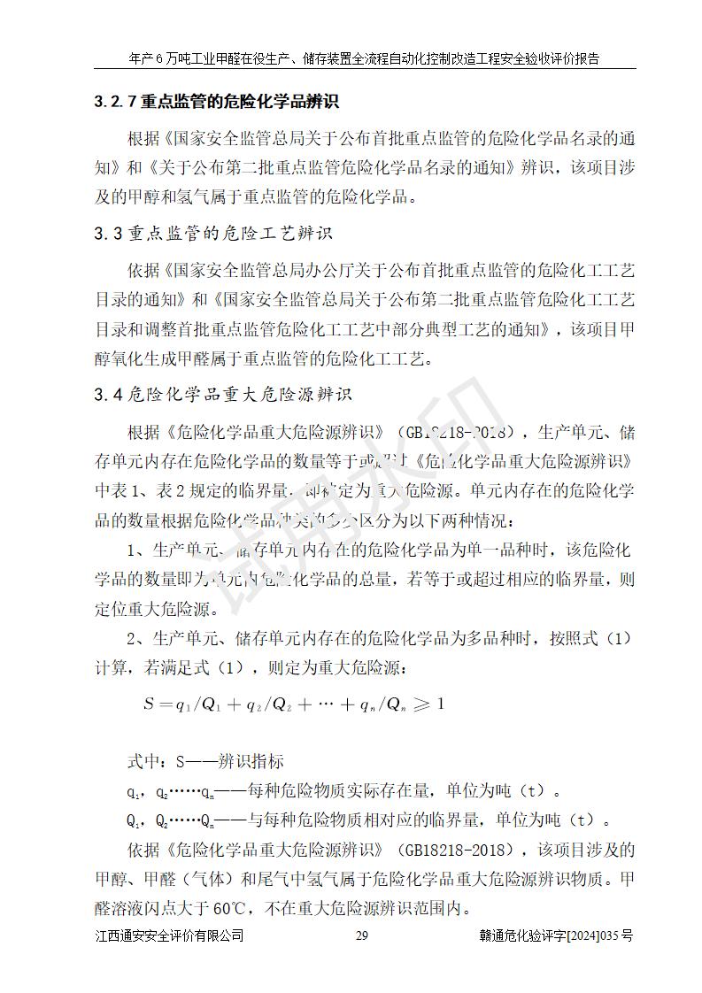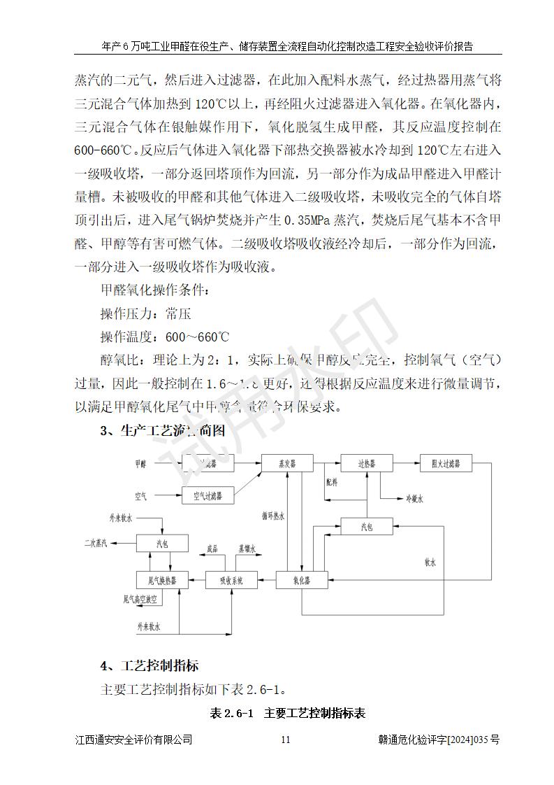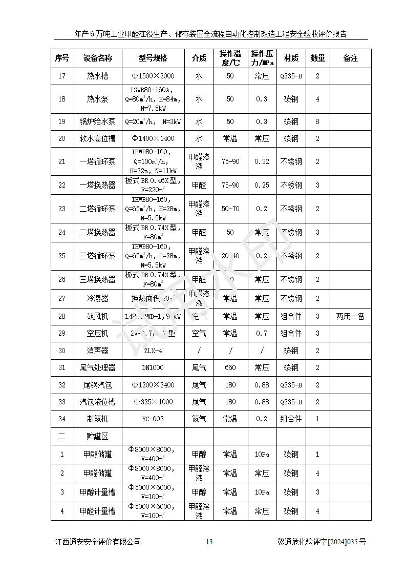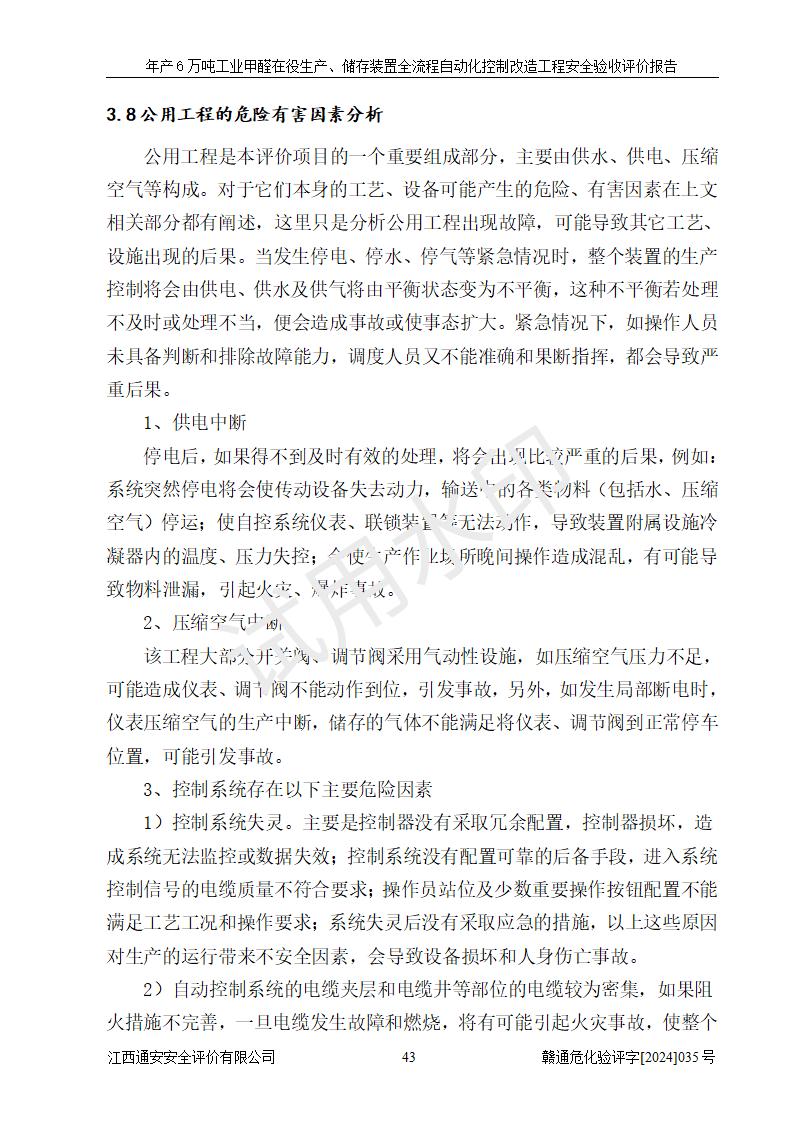 評價結(jié)論 | 信豐冠美化工有限公司年產(chǎn)6萬噸工業(yè)甲醛在役生產(chǎn)、儲存裝置全流程自動化控制改造設(shè)計方案中提出的控制措施已得到落實,自動化控制系統(tǒng)設(shè)置情況與設(shè)計方案一致,滿足《江西省應(yīng)急管理廳關(guān)于印發(fā)<江西省化工企業(yè)自動化提升實施方案>(試行)的通知》(贛應(yīng)急字〔2021〕190號)的要求,具備自動化控制改造工程竣工驗收條件。 | ||||||