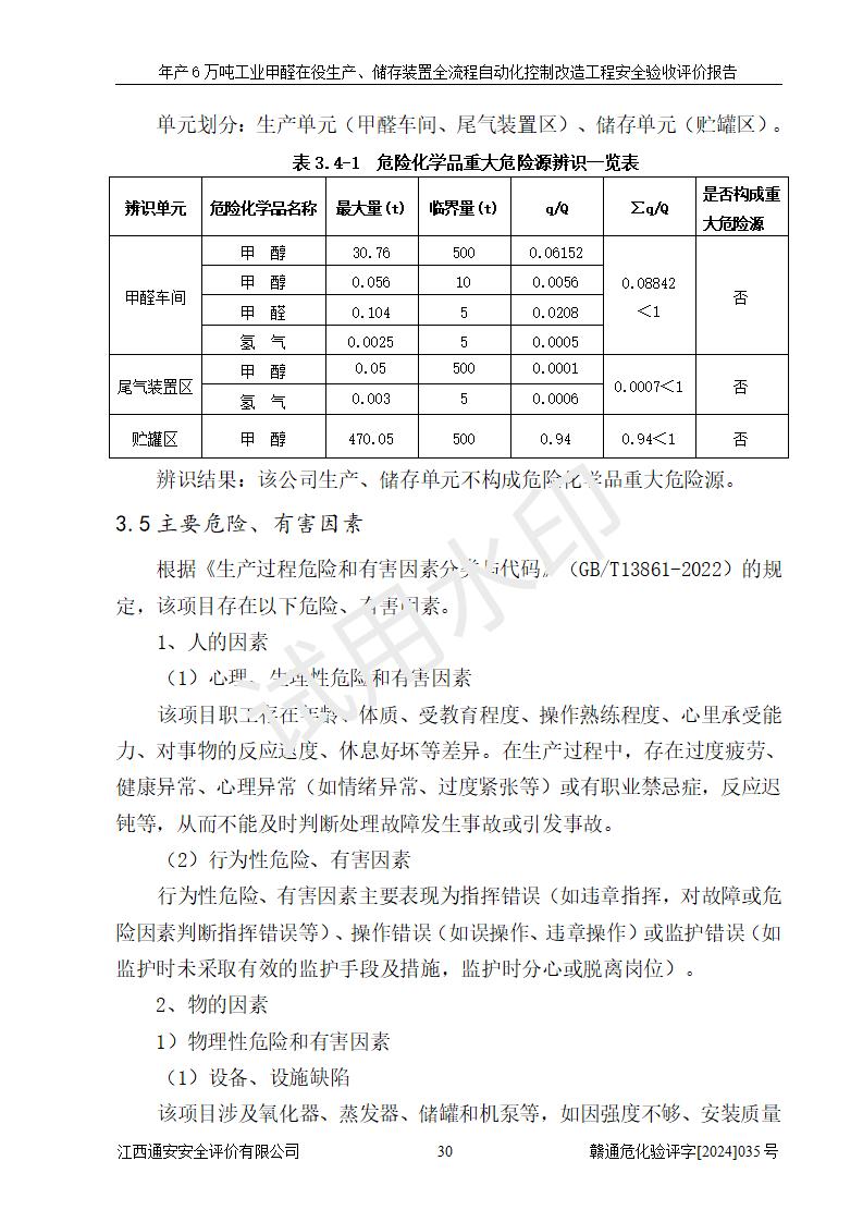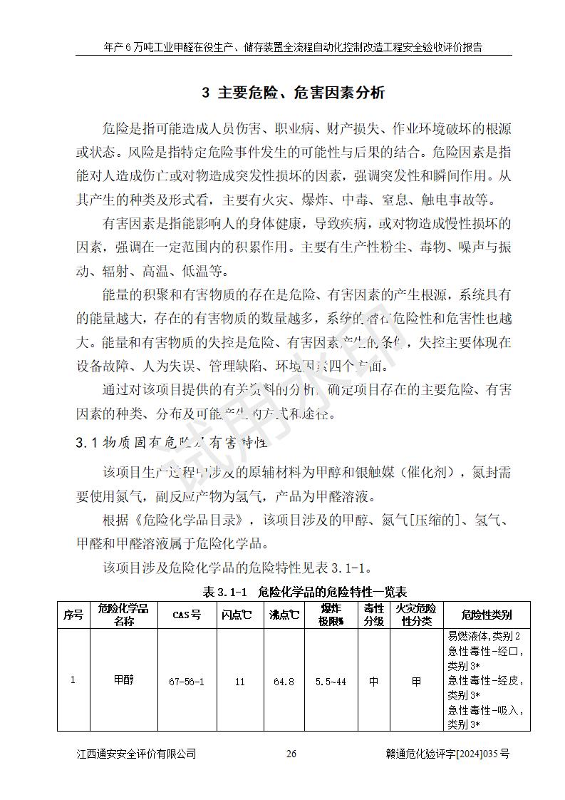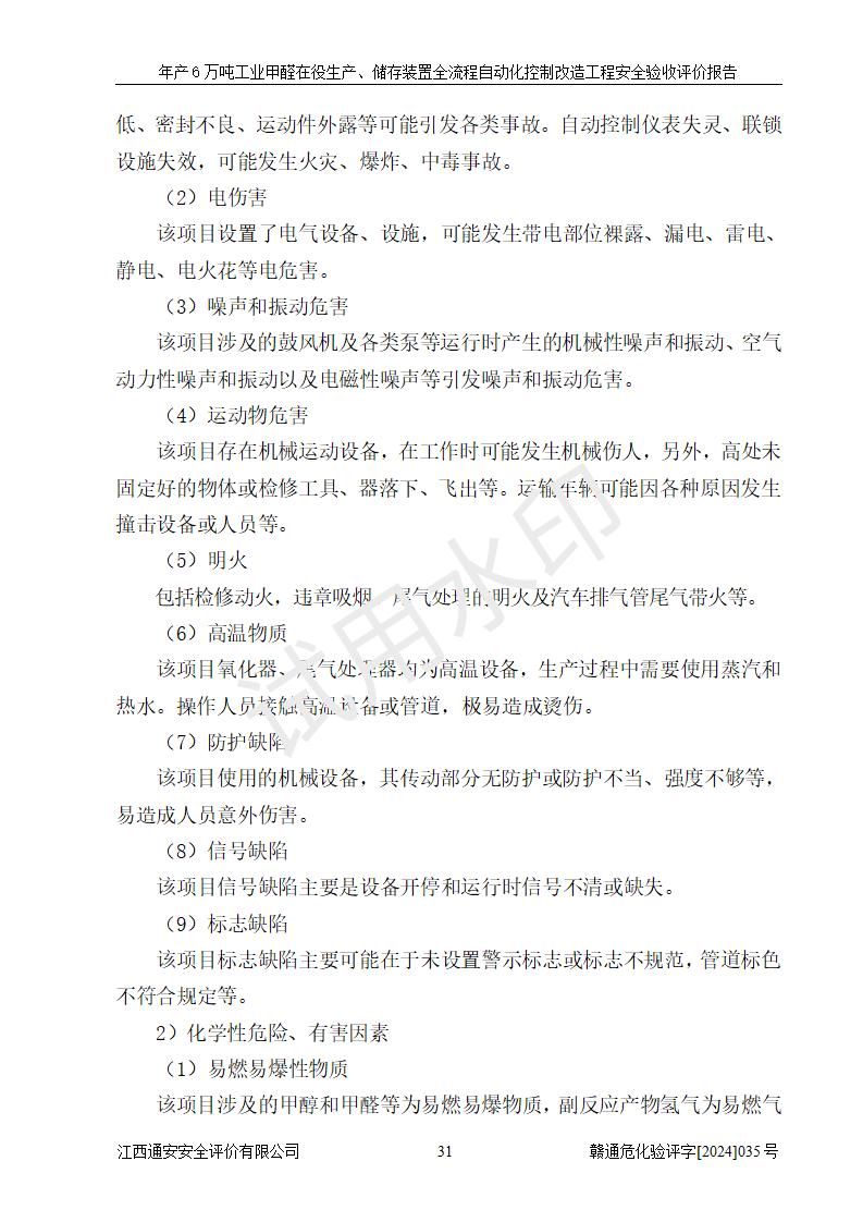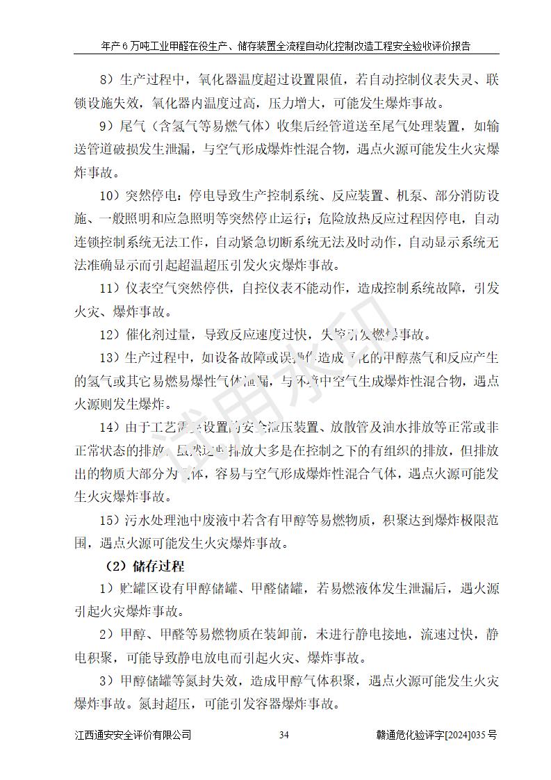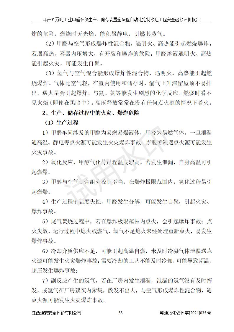 項目簡介 | 信豐冠美化工有限公司位于江西省贛州市信豐縣工業(yè)園偉邦路,法定**人為汪學(xué)斌,成立于2007年04月09日,注冊資本壹仟萬元整,營業(yè)執(zhí)照經(jīng)營范圍為工業(yè)甲醛、尿醛樹脂膠生產(chǎn)、銷售(憑許可證經(jīng)營)等。 信豐冠美化工有限公司2023年08月03日取得了《安全生產(chǎn)許可證》,許可證編號:(贛)WH安許證字[2008]0500號,許可范圍為工業(yè)甲醛溶液(60kt/a),**期2023年08月06日至2026年08月05日。該公司2022年8月30日取得了安全生產(chǎn)標準化證書,證書編號:贛AQBWⅡ[2022]015,**期至2025年8月。該公司現(xiàn)有員工23人,其中專職安全管理人員1人。 企業(yè)裝置設(shè)施原有**的自動化水平,配備有DCS系統(tǒng)和SIS系統(tǒng),廠區(qū)綜合辦公樓一樓設(shè)置了控制室。根據(jù)《江西省應(yīng)急管理廳關(guān)于印發(fā)<江西省化工企業(yè)自動化提升實施方案>(試行)的通知》(贛應(yīng)急字〔2021〕190號),企業(yè)委托河北英科石化工程有限公司編制了《信豐冠美化工有限公司年產(chǎn)6萬噸工業(yè)甲醛在役生產(chǎn)、儲存裝置全流程自動化控制改造設(shè)計方案》,且通過了專家評審。該自動化改造工程由山東山河公路機械有限公司負責(zé)施工、安裝、調(diào)試和試運行,并出具了調(diào)試報告。 信豐冠美化工有限公司年產(chǎn)6萬噸工業(yè)甲醛溶液項目生產(chǎn)過程中涉及的原輔材料為甲醇和銀觸媒(催化劑),氮封需要使用氮氣,副反應(yīng)產(chǎn)物為氫氣,產(chǎn)品為甲醛溶液。根據(jù)《危險化學(xué)品目錄》,該項目涉及的甲醇、氮氣、氫氣、甲醛和甲醛溶液屬于危險化學(xué)品。經(jīng)辨識,甲醇和氫氣屬于重點監(jiān)管的危險化學(xué)品,甲醛屬于高毒物品,甲醇屬于特別管控的危險化學(xué)品,不涉及監(jiān)控化學(xué)品、易制毒化學(xué)品、易制爆危險化學(xué)品和劇毒化學(xué)品,生產(chǎn)、儲存單元不構(gòu)成危險化學(xué)品重大危險源,涉及的氧化反應(yīng)屬于重點監(jiān)管的危險化工工藝。 | ||||||