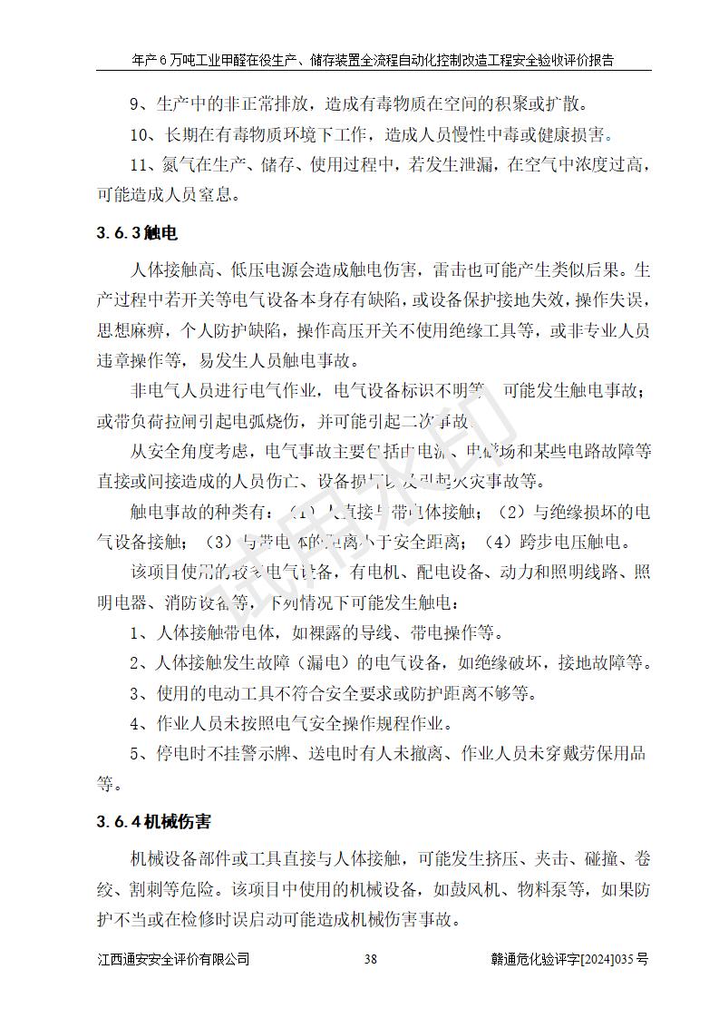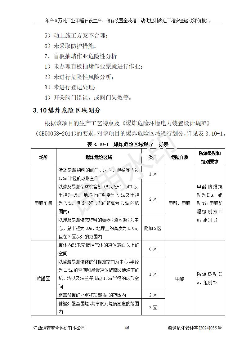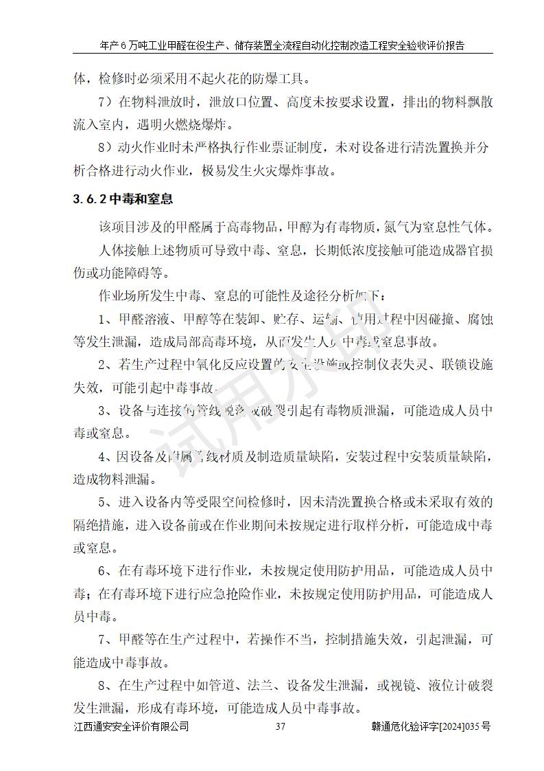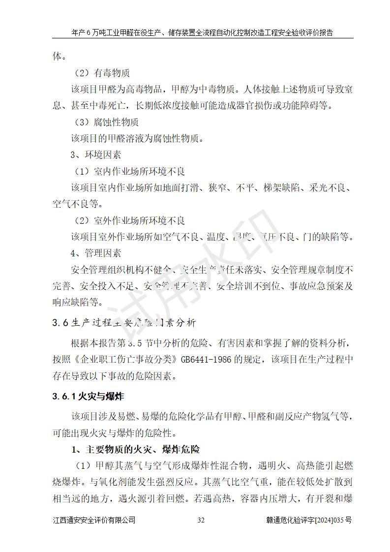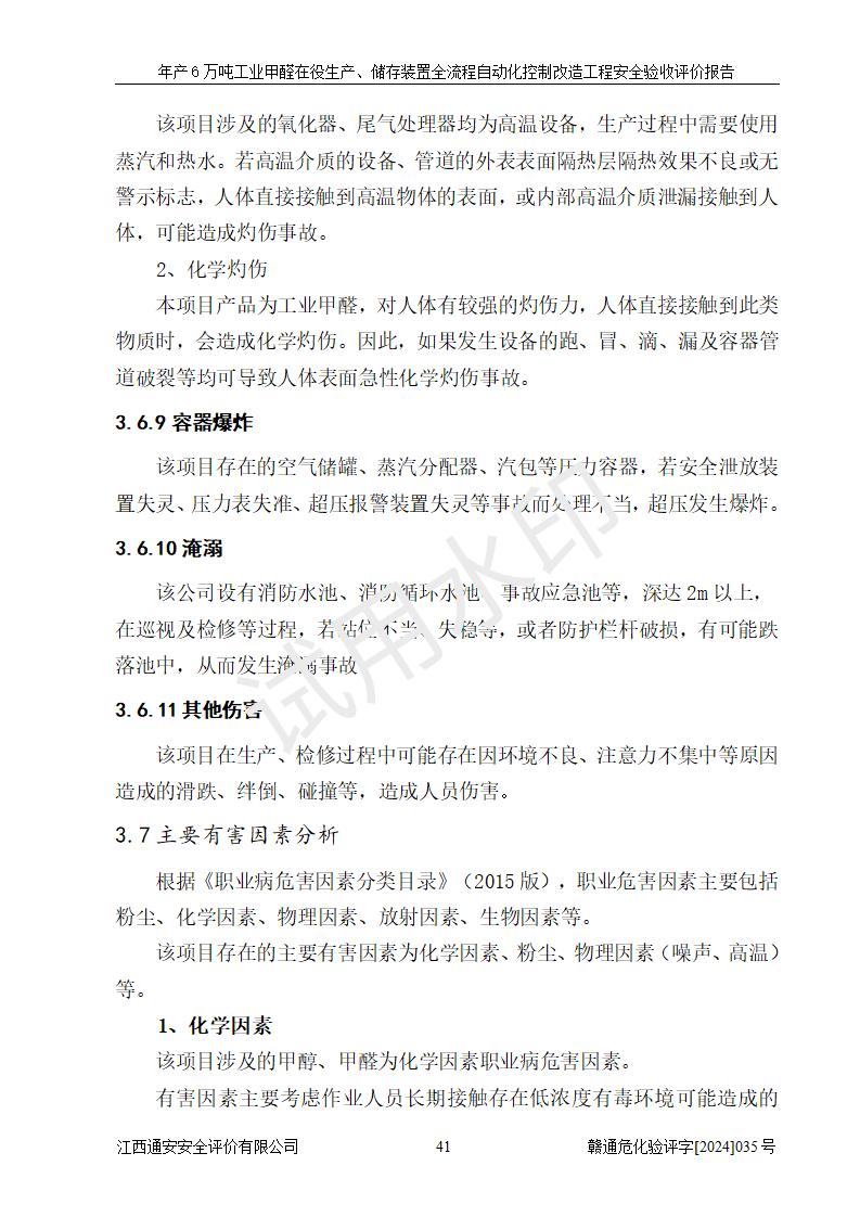 項目簡介 | 信豐冠美化工有限公司位于江西省贛州市信豐縣工業(yè)園偉邦路,法定**人為汪學(xué)斌,成立于2007年04月09日,注冊資本壹仟萬元整,營業(yè)執(zhí)照經(jīng)營范圍為工業(yè)甲醛、尿醛樹脂膠生產(chǎn)、銷售(憑許可證經(jīng)營)等。 信豐冠美化工有限公司2023年08月03日取得了《安全生產(chǎn)許可證》,許可證編號:(贛)WH安許證字[2008]0500號,許可范圍為工業(yè)甲醛溶液(60kt/a),**期2023年08月06日至2026年08月05日。該公司2022年8月30日取得了安全生產(chǎn)標準化證書,證書編號:贛AQBWⅡ[2022]015,**期至2025年8月。該公司現(xiàn)有員工23人,其中專職安全管理人員1人。 企業(yè)裝置設(shè)施原有**的自動化水平,配備有DCS系統(tǒng)和SIS系統(tǒng),廠區(qū)綜合辦公樓一樓設(shè)置了控制室。根據(jù)《江西省應(yīng)急管理廳關(guān)于印發(fā)<江西省化工企業(yè)自動化提升實施方案>(試行)的通知》(贛應(yīng)急字〔2021〕190號),企業(yè)委托河北英科石化工程有限公司編制了《信豐冠美化工有限公司年產(chǎn)6萬噸工業(yè)甲醛在役生產(chǎn)、儲存裝置全流程自動化控制改造設(shè)計方案》,且通過了專家評審。該自動化改造工程由山東山河公路機械有限公司負責(zé)施工、安裝、調(diào)試和試運行,并出具了調(diào)試報告。 信豐冠美化工有限公司年產(chǎn)6萬噸工業(yè)甲醛溶液項目生產(chǎn)過程中涉及的原輔材料為甲醇和銀觸媒(催化劑),氮封需要使用氮氣,副反應(yīng)產(chǎn)物為氫氣,產(chǎn)品為甲醛溶液。根據(jù)《危險化學(xué)品目錄》,該項目涉及的甲醇、氮氣、氫氣、甲醛和甲醛溶液屬于危險化學(xué)品。經(jīng)辨識,甲醇和氫氣屬于重點監(jiān)管的危險化學(xué)品,甲醛屬于高毒物品,甲醇屬于特別管控的危險化學(xué)品,不涉及監(jiān)控化學(xué)品、易制毒化學(xué)品、易制爆危險化學(xué)品和劇毒化學(xué)品,生產(chǎn)、儲存單元不構(gòu)成危險化學(xué)品重大危險源,涉及的氧化反應(yīng)屬于重點監(jiān)管的危險化工工藝。 | ||||||