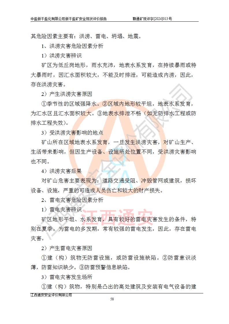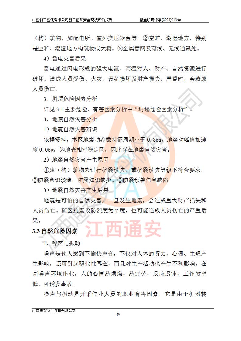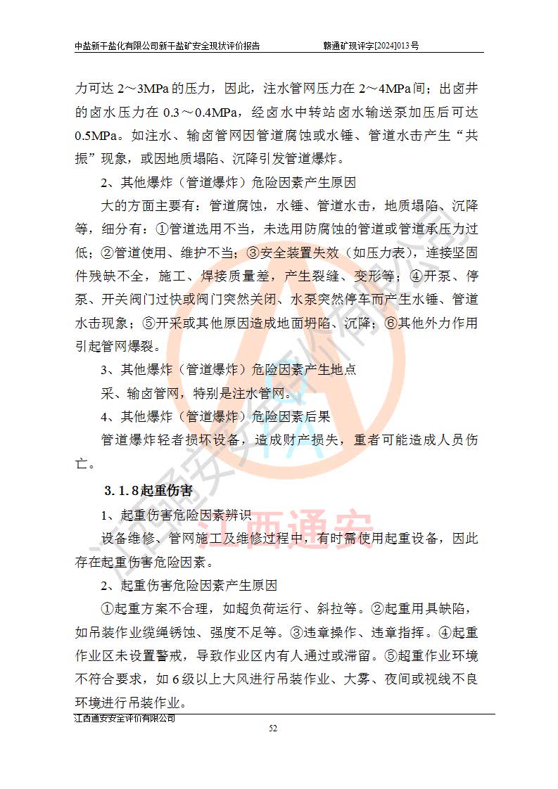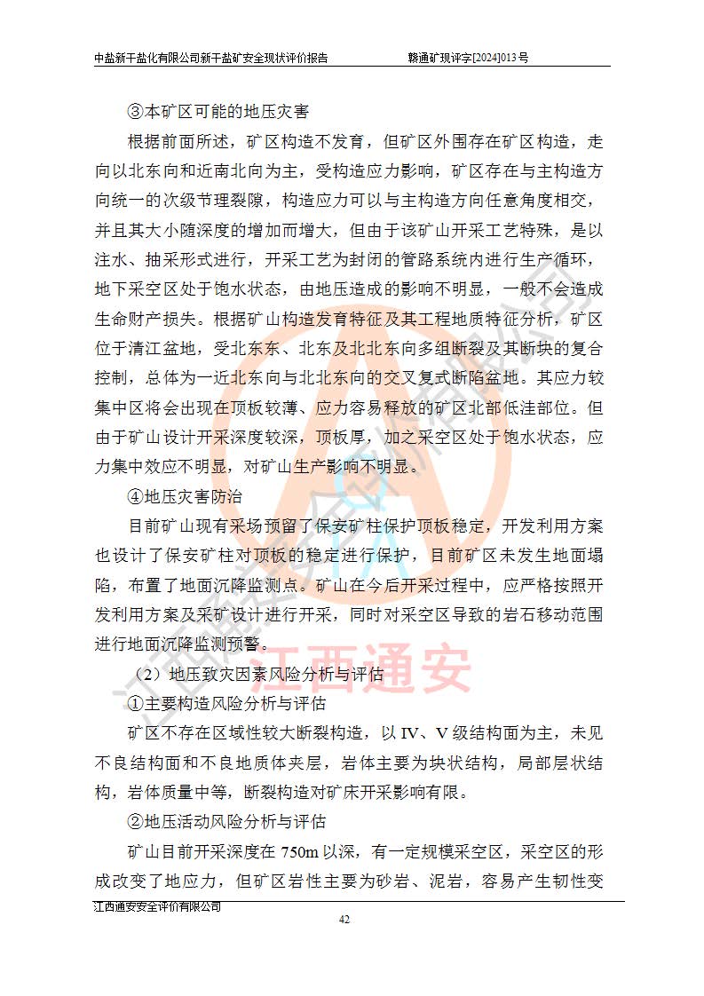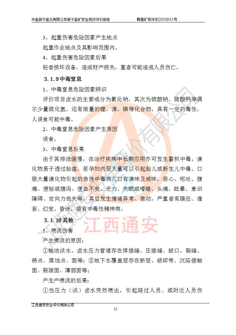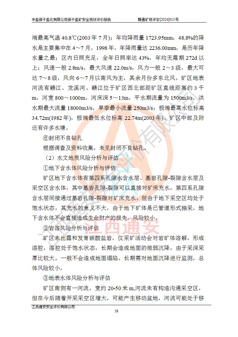 項(xiàng)目簡(jiǎn)介 | 中鹽新干鹽化有限公司位于江西省新干縣太洋州鎮(zhèn)朝雞山,屬于有限責(zé)任公司(國(guó)有控股),負(fù)責(zé)人王繼明,成立于2004年1月14日,經(jīng)營(yíng)范圍為食鹽及其他鹽產(chǎn)品、包裝材料、化工產(chǎn)品食品生產(chǎn)、銷售。 中鹽新干鹽化有限公司新干鹽礦項(xiàng)目屬于金屬、非金屬礦及其他礦采選業(yè)。項(xiàng)目地址位于江西省吉安市新干縣大洋洲鎮(zhèn)石歧堎村,已取得安全生產(chǎn)許可證,**期自2021年6月22日至2024年6月21日。礦山于2018年12月29日取得了新發(fā)的采礦許可證,**期至2028年12月29日。礦區(qū)面積是1.4332Km2,采用水溶開采方式,礦山可采儲(chǔ)量為2941.2萬噸,生產(chǎn)規(guī)模130萬m3/年,生產(chǎn)服務(wù)年限為19年。 礦山為進(jìn)一步加強(qiáng)安全生產(chǎn)管理,完善標(biāo)準(zhǔn)化建設(shè),委托江西通安安全評(píng)價(jià)有限公司承擔(dān)其鹽礦安全現(xiàn)狀評(píng)價(jià)工作。按照**有關(guān)法律、法規(guī)和技術(shù)標(biāo)準(zhǔn)的要求,我公司于2024年5月22日派出評(píng)價(jià)專家組到現(xiàn)場(chǎng)調(diào)查、了解情況,并收集了相關(guān)的資料、數(shù)據(jù),通過對(duì)新干鹽礦水溶開采作業(yè)中危險(xiǎn)、有害因素的識(shí)別和危險(xiǎn)程度分析,對(duì)中鹽新干鹽化有限公司新干鹽礦的安全管理、生產(chǎn)作業(yè)對(duì)安全生產(chǎn)法律法規(guī)及有關(guān)規(guī)程的符合性和適應(yīng)性進(jìn)行了安全評(píng)價(jià),對(duì)潛在的危險(xiǎn)、有害因素進(jìn)行分析,進(jìn)而提出較為合理可行的安全對(duì)策措施及建議,在此基礎(chǔ)上編寫了安全現(xiàn)狀評(píng)價(jià)報(bào)告。 | |||||