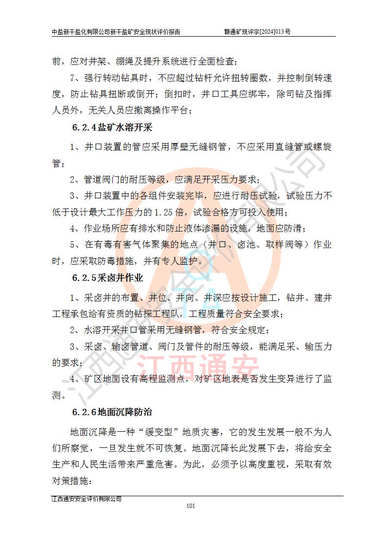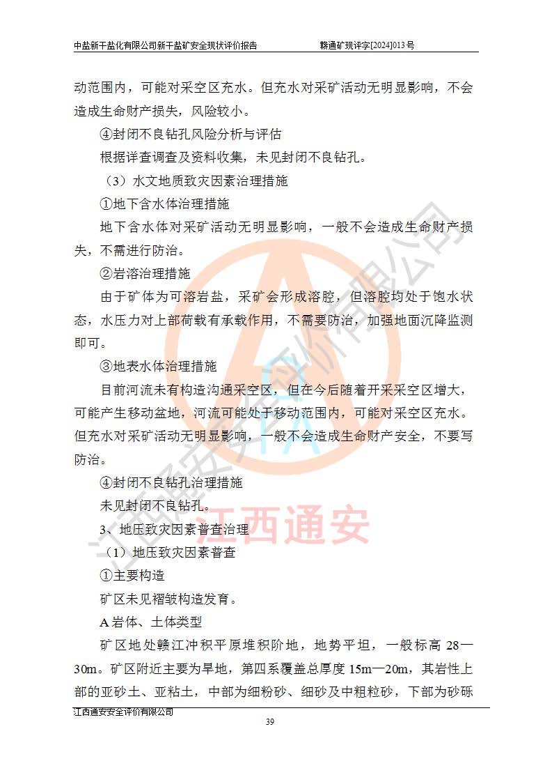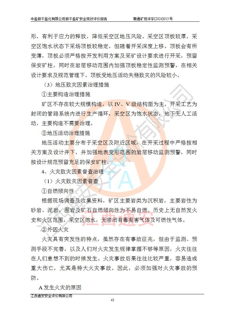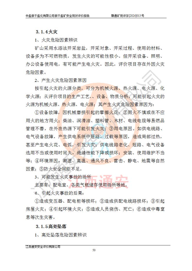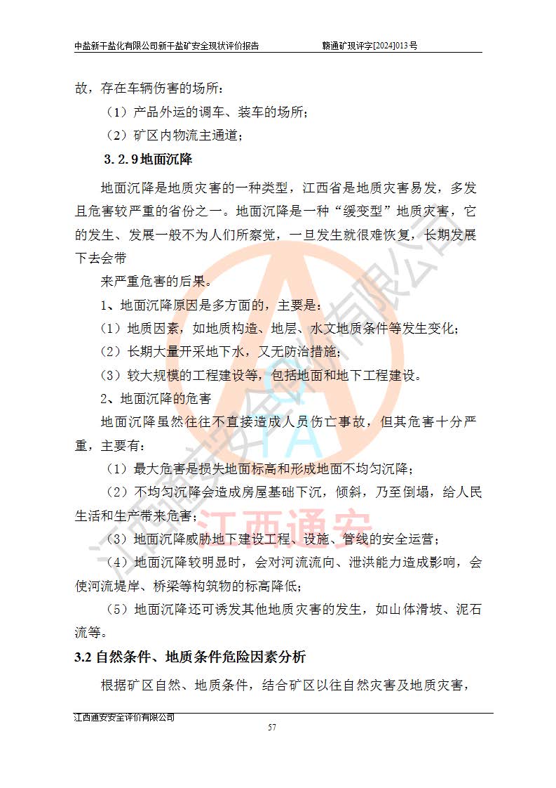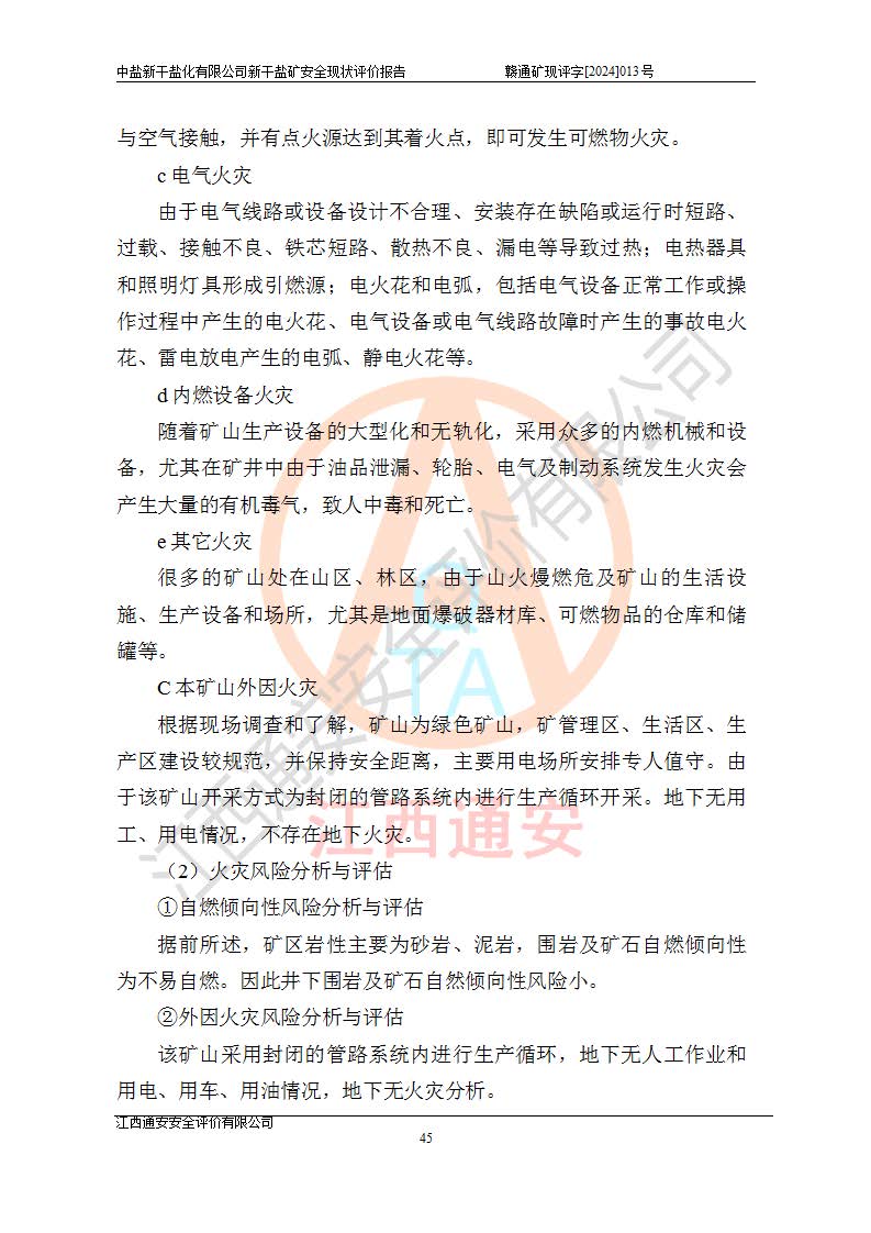 項(xiàng)目簡(jiǎn)介 | 中鹽新干鹽化有限公司位于江西省新干縣太洋州鎮(zhèn)朝雞山,屬于有限責(zé)任公司(國(guó)有控股),負(fù)責(zé)人王繼明,成立于2004年1月14日,經(jīng)營(yíng)范圍為食鹽及其他鹽產(chǎn)品、包裝材料、化工產(chǎn)品食品生產(chǎn)、銷售。 中鹽新干鹽化有限公司新干鹽礦項(xiàng)目屬于金屬、非金屬礦及其他礦采選業(yè)。項(xiàng)目地址位于江西省吉安市新干縣大洋洲鎮(zhèn)石歧堎村,已取得安全生產(chǎn)許可證,**期自2021年6月22日至2024年6月21日。礦山于2018年12月29日取得了新發(fā)的采礦許可證,**期至2028年12月29日。礦區(qū)面積是1.4332Km2,采用水溶開采方式,礦山可采儲(chǔ)量為2941.2萬噸,生產(chǎn)規(guī)模130萬m3/年,生產(chǎn)服務(wù)年限為19年。 礦山為進(jìn)一步加強(qiáng)安全生產(chǎn)管理,完善標(biāo)準(zhǔn)化建設(shè),委托江西通安安全評(píng)價(jià)有限公司承擔(dān)其鹽礦安全現(xiàn)狀評(píng)價(jià)工作。按照**有關(guān)法律、法規(guī)和技術(shù)標(biāo)準(zhǔn)的要求,我公司于2024年5月22日派出評(píng)價(jià)專家組到現(xiàn)場(chǎng)調(diào)查、了解情況,并收集了相關(guān)的資料、數(shù)據(jù),通過對(duì)新干鹽礦水溶開采作業(yè)中危險(xiǎn)、有害因素的識(shí)別和危險(xiǎn)程度分析,對(duì)中鹽新干鹽化有限公司新干鹽礦的安全管理、生產(chǎn)作業(yè)對(duì)安全生產(chǎn)法律法規(guī)及有關(guān)規(guī)程的符合性和適應(yīng)性進(jìn)行了安全評(píng)價(jià),對(duì)潛在的危險(xiǎn)、有害因素進(jìn)行分析,進(jìn)而提出較為合理可行的安全對(duì)策措施及建議,在此基礎(chǔ)上編寫了安全現(xiàn)狀評(píng)價(jià)報(bào)告。 | |||||