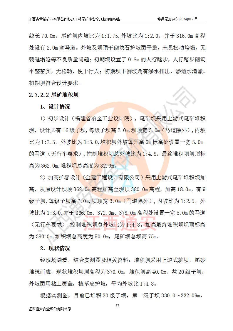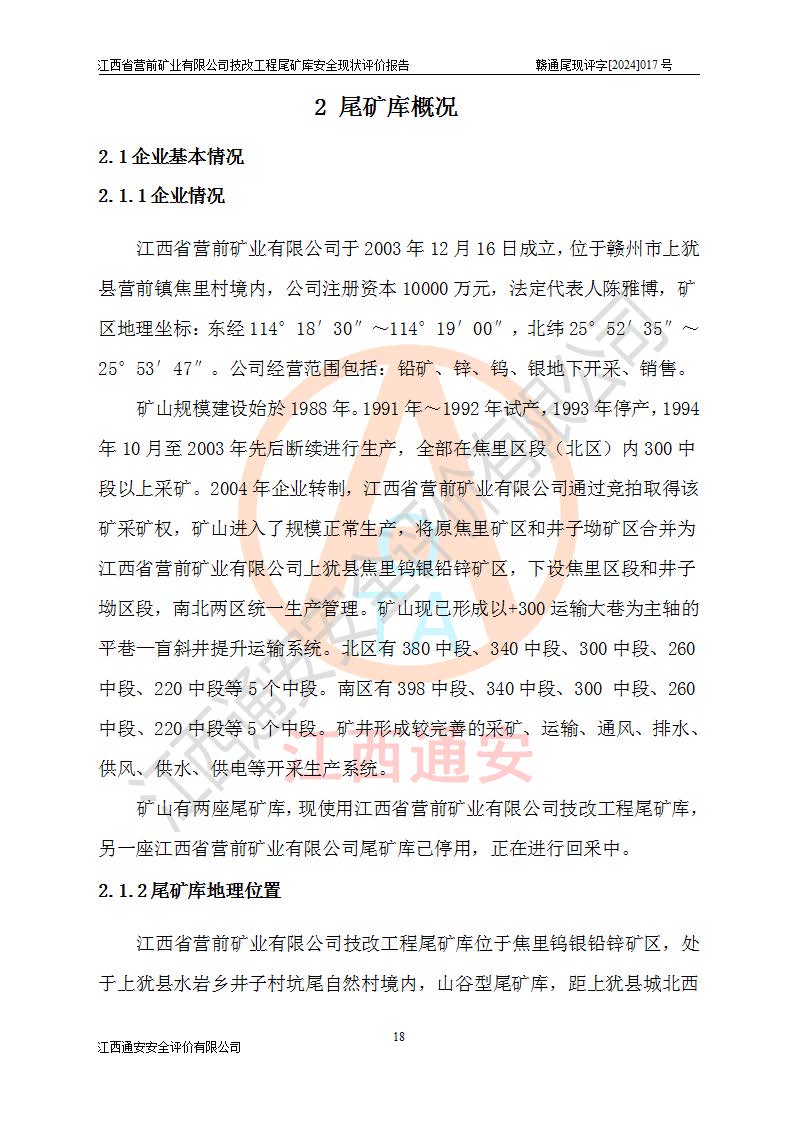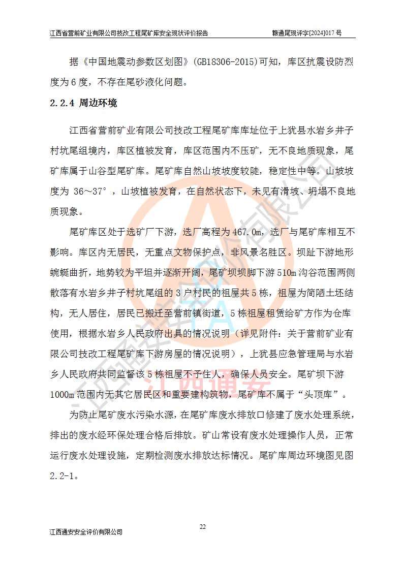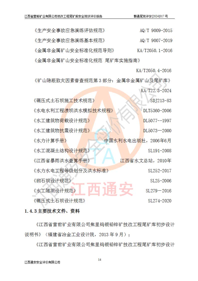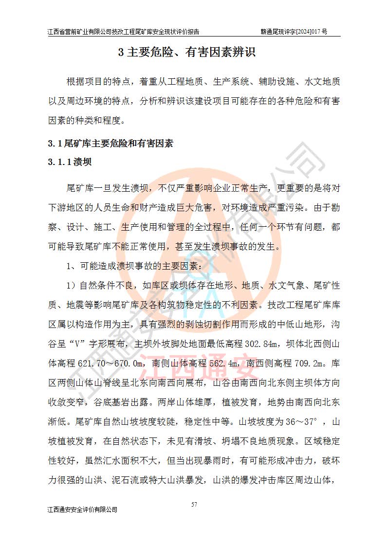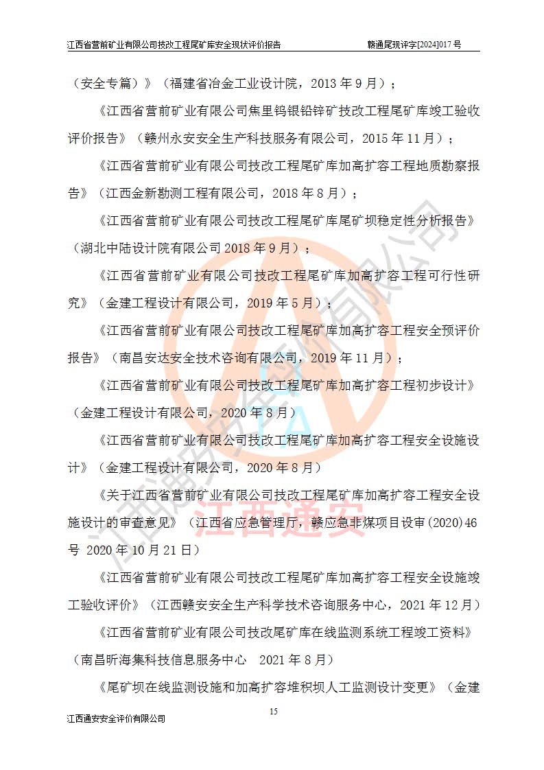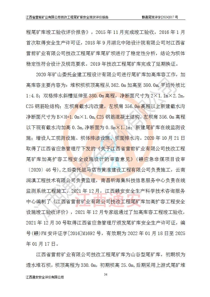 江西省營(yíng)前礦業(yè)有限公司于2003年12月16日成立,位于贛州市上猶縣營(yíng)前鎮(zhèn)焦里村境內(nèi),公司注冊(cè)資本10000萬元,法定**人陳雅博,礦區(qū)地理坐標(biāo):東經(jīng)114°18′30″~114°19′00″,北緯25°52′35″~25°53′47″。公司經(jīng)營(yíng)范圍包括:鉛礦、鋅、鎢、銀地下開采、銷售。 江西省營(yíng)前礦業(yè)有限公司技改工程尾礦庫位于焦里鎢銀鉛鋅礦區(qū),處于上猶縣水巖鄉(xiāng)井子村坑尾自然村境內(nèi),山谷型尾礦庫,溝谷呈“V”字形展布,技改工程尾礦庫原由福建省冶金工業(yè)設(shè)計(jì)院設(shè)計(jì),后由金建工程設(shè)計(jì)有限公司對(duì)該尾礦庫進(jìn)行了加高擴(kuò)容設(shè)計(jì),加高擴(kuò)容后總庫容503.14萬m3,壩高75.0m,為三等庫。尾礦庫主要由尾礦壩、庫外分洪系統(tǒng)(1#攔洪壩--1#分洪隧洞和2#攔洪壩--2#分洪隧洞--排水陡槽--消力池),庫內(nèi)排洪排水系統(tǒng)(排水斜槽—連接井—排水涵洞—排水隧洞—排水陡槽—消力池)等組成,尾礦壩壩型為初期壩+上游式堆積壩。 江西省營(yíng)前礦業(yè)有限公司技改工程尾礦庫于2021年12月30日取得江西省應(yīng)急管理廳版發(fā)的安全生產(chǎn)許可證,證書編號(hào)(贛)FM安許證字(2016)M1692號(hào),有限期從2022年1月18日到2025年1月17日,為三年期。依照《非煤礦礦山企業(yè)安全生產(chǎn)許可證延期換證工作》的通知,根據(jù)***《安全生產(chǎn)許可證條例》、《江西省安全生產(chǎn)條例》、《非煤礦山安全生產(chǎn)許可證實(shí)施辦法》、《江西省非煤礦礦山企業(yè)安全生產(chǎn)許可證辦法》規(guī)定的要求,受江西省營(yíng)前礦業(yè)有限公司委托,我公司承擔(dān)了技改工程尾礦庫延期換證安全現(xiàn)狀評(píng)價(jià)工作。 |