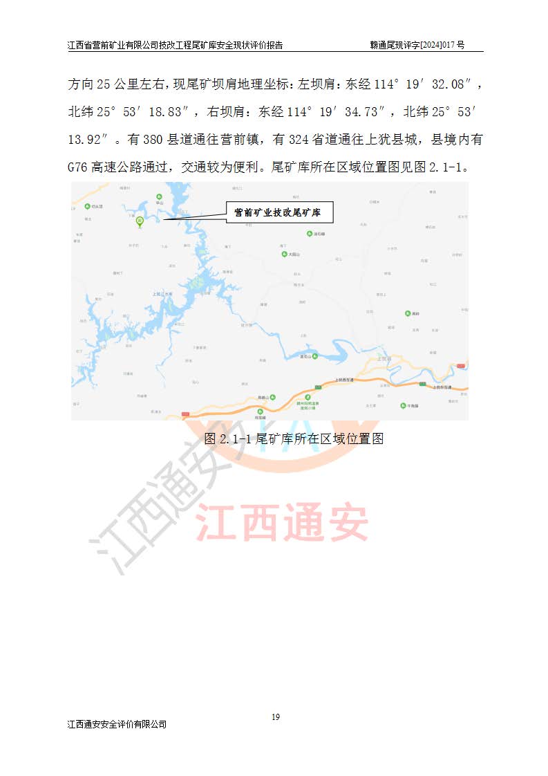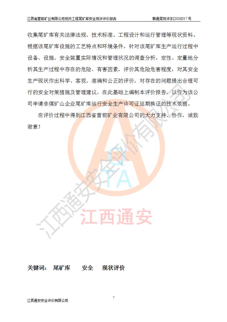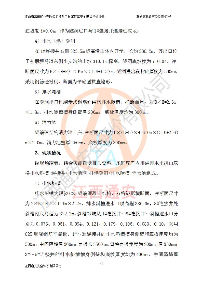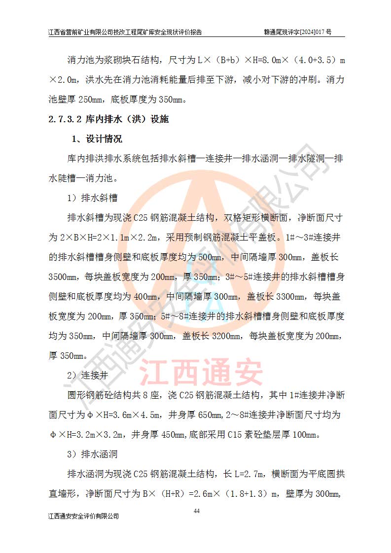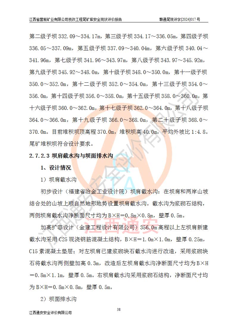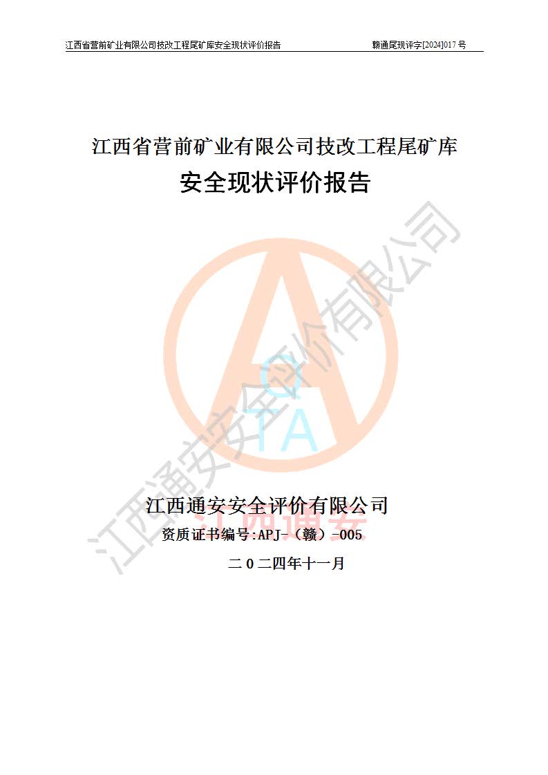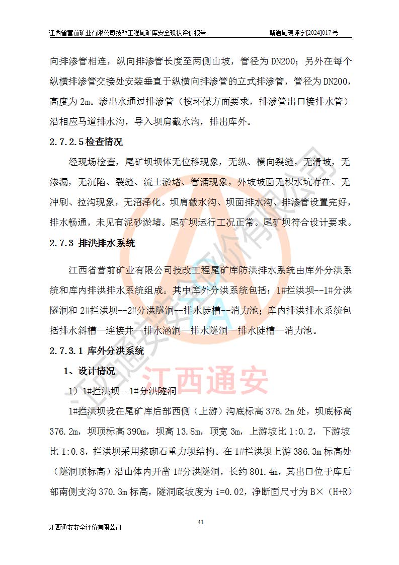江西省營(yíng)前礦業(yè)有限公司于2003年12月16日成立,位于贛州市上猶縣營(yíng)前鎮(zhèn)焦里村境內(nèi),公司注冊(cè)資本10000萬元,法定**人陳雅博,礦區(qū)地理坐標(biāo):東經(jīng)114°18′30″~114°19′00″,北緯25°52′35″~25°53′47″。公司經(jīng)營(yíng)范圍包括:鉛礦、鋅、鎢、銀地下開采、銷售。 江西省營(yíng)前礦業(yè)有限公司技改工程尾礦庫位于焦里鎢銀鉛鋅礦區(qū),處于上猶縣水巖鄉(xiāng)井子村坑尾自然村境內(nèi),山谷型尾礦庫,溝谷呈“V”字形展布,技改工程尾礦庫原由福建省冶金工業(yè)設(shè)計(jì)院設(shè)計(jì),后由金建工程設(shè)計(jì)有限公司對(duì)該尾礦庫進(jìn)行了加高擴(kuò)容設(shè)計(jì),加高擴(kuò)容后總庫容503.14萬m3,壩高75.0m,為三等庫。尾礦庫主要由尾礦壩、庫外分洪系統(tǒng)(1#攔洪壩--1#分洪隧洞和2#攔洪壩--2#分洪隧洞--排水陡槽--消力池),庫內(nèi)排洪排水系統(tǒng)(排水斜槽—連接井—排水涵洞—排水隧洞—排水陡槽—消力池)等組成,尾礦壩壩型為初期壩+上游式堆積壩。 江西省營(yíng)前礦業(yè)有限公司技改工程尾礦庫于2021年12月30日取得江西省應(yīng)急管理廳版發(fā)的安全生產(chǎn)許可證,證書編號(hào)(贛)FM安許證字(2016)M1692號(hào),有限期從2022年1月18日到2025年1月17日,為三年期。依照《非煤礦礦山企業(yè)安全生產(chǎn)許可證延期換證工作》的通知,根據(jù)***《安全生產(chǎn)許可證條例》、《江西省安全生產(chǎn)條例》、《非煤礦山安全生產(chǎn)許可證實(shí)施辦法》、《江西省非煤礦礦山企業(yè)安全生產(chǎn)許可證辦法》規(guī)定的要求,受江西省營(yíng)前礦業(yè)有限公司委托,我公司承擔(dān)了技改工程尾礦庫延期換證安全現(xiàn)狀評(píng)價(jià)工作。 |
