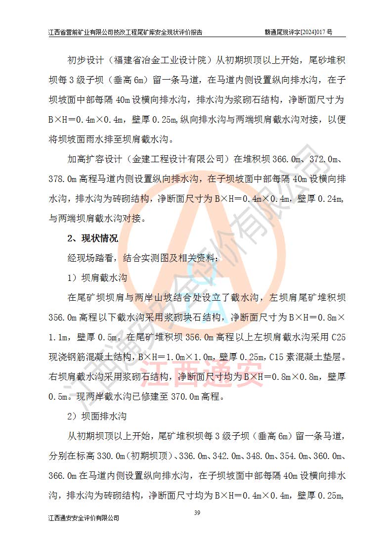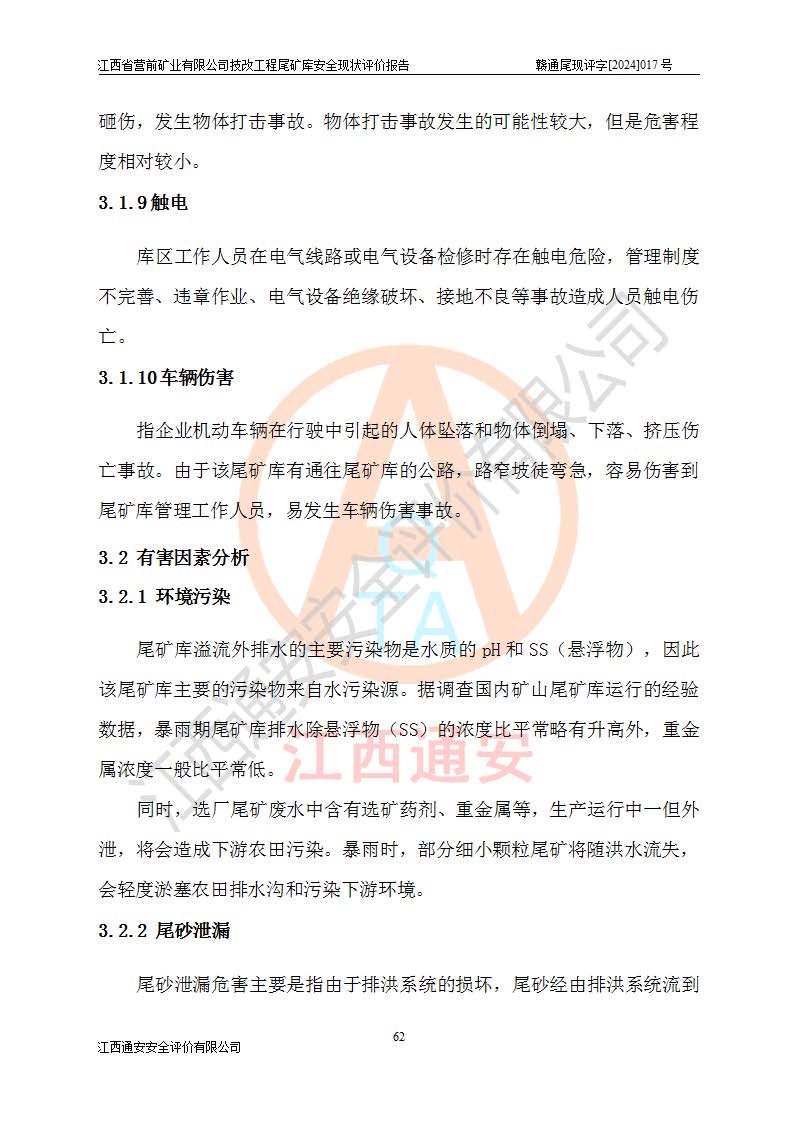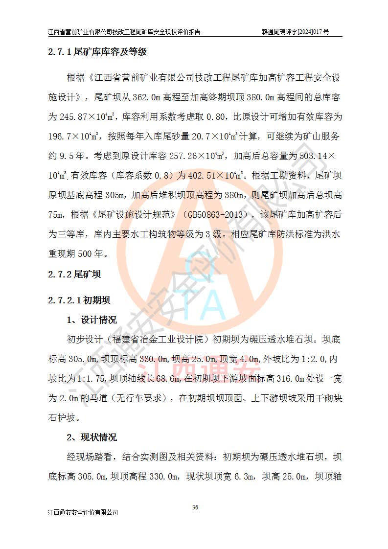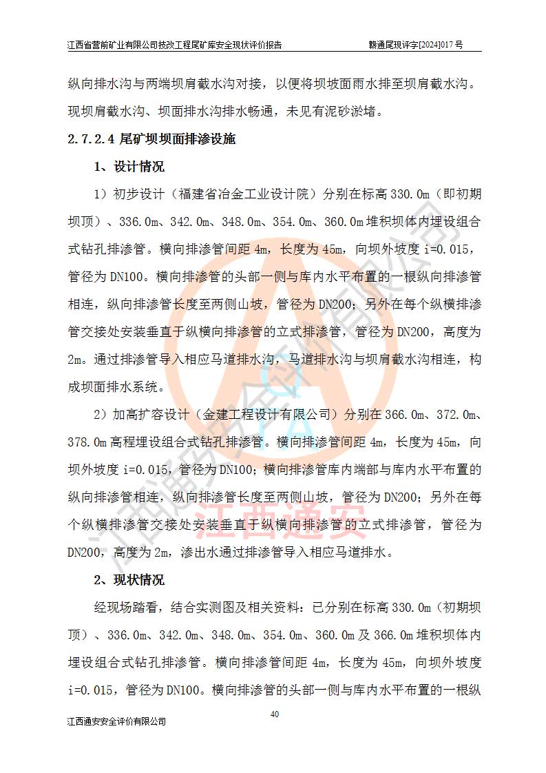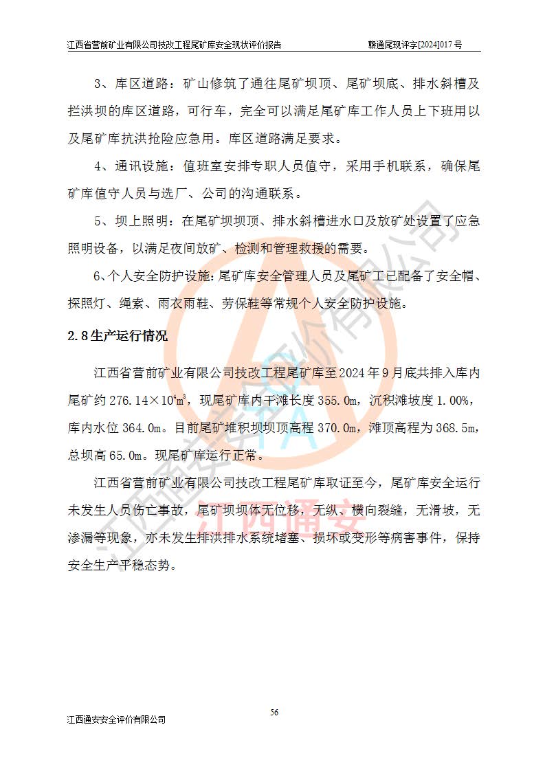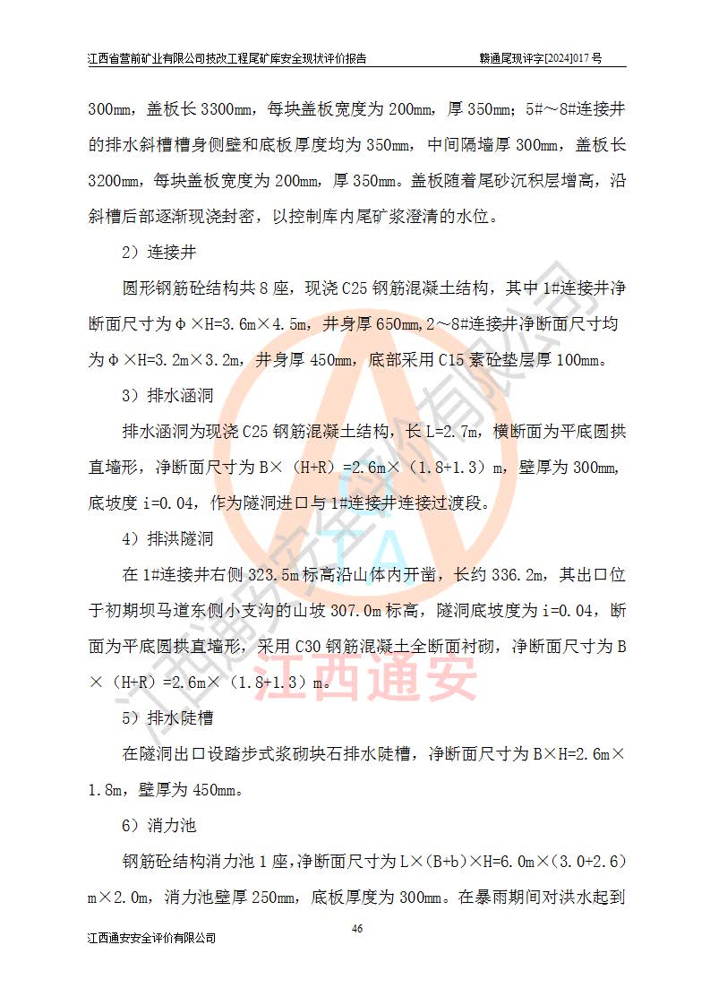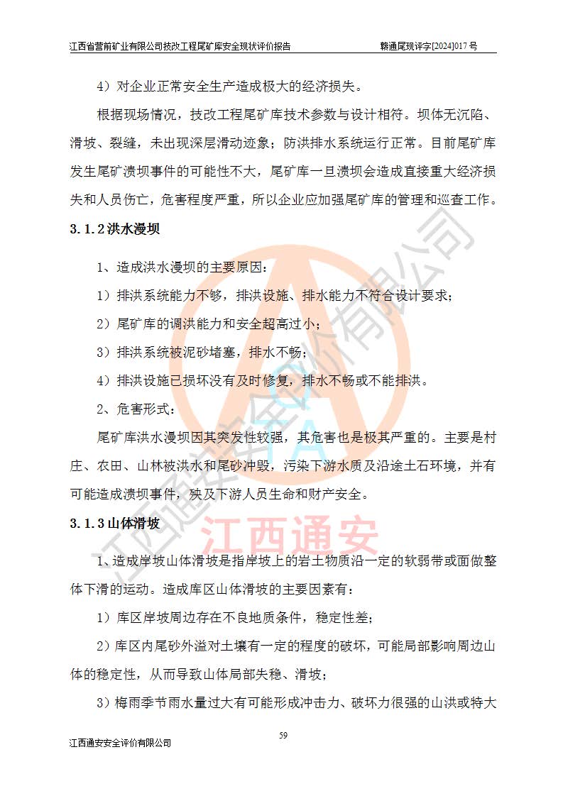 江西省營(yíng)前礦業(yè)有限公司于2003年12月16日成立,位于贛州市上猶縣營(yíng)前鎮(zhèn)焦里村境內(nèi),公司注冊(cè)資本10000萬元,法定**人陳雅博,礦區(qū)地理坐標(biāo):東經(jīng)114°18′30″~114°19′00″,北緯25°52′35″~25°53′47″。公司經(jīng)營(yíng)范圍包括:鉛礦、鋅、鎢、銀地下開采、銷售。 江西省營(yíng)前礦業(yè)有限公司技改工程尾礦庫位于焦里鎢銀鉛鋅礦區(qū),處于上猶縣水巖鄉(xiāng)井子村坑尾自然村境內(nèi),山谷型尾礦庫,溝谷呈“V”字形展布,技改工程尾礦庫原由福建省冶金工業(yè)設(shè)計(jì)院設(shè)計(jì),后由金建工程設(shè)計(jì)有限公司對(duì)該尾礦庫進(jìn)行了加高擴(kuò)容設(shè)計(jì),加高擴(kuò)容后總庫容503.14萬m3,壩高75.0m,為三等庫。尾礦庫主要由尾礦壩、庫外分洪系統(tǒng)(1#攔洪壩--1#分洪隧洞和2#攔洪壩--2#分洪隧洞--排水陡槽--消力池),庫內(nèi)排洪排水系統(tǒng)(排水斜槽—連接井—排水涵洞—排水隧洞—排水陡槽—消力池)等組成,尾礦壩壩型為初期壩+上游式堆積壩。 江西省營(yíng)前礦業(yè)有限公司技改工程尾礦庫于2021年12月30日取得江西省應(yīng)急管理廳版發(fā)的安全生產(chǎn)許可證,證書編號(hào)(贛)FM安許證字(2016)M1692號(hào),有限期從2022年1月18日到2025年1月17日,為三年期。依照《非煤礦礦山企業(yè)安全生產(chǎn)許可證延期換證工作》的通知,根據(jù)***《安全生產(chǎn)許可證條例》、《江西省安全生產(chǎn)條例》、《非煤礦山安全生產(chǎn)許可證實(shí)施辦法》、《江西省非煤礦礦山企業(yè)安全生產(chǎn)許可證辦法》規(guī)定的要求,受江西省營(yíng)前礦業(yè)有限公司委托,我公司承擔(dān)了技改工程尾礦庫延期換證安全現(xiàn)狀評(píng)價(jià)工作。 |