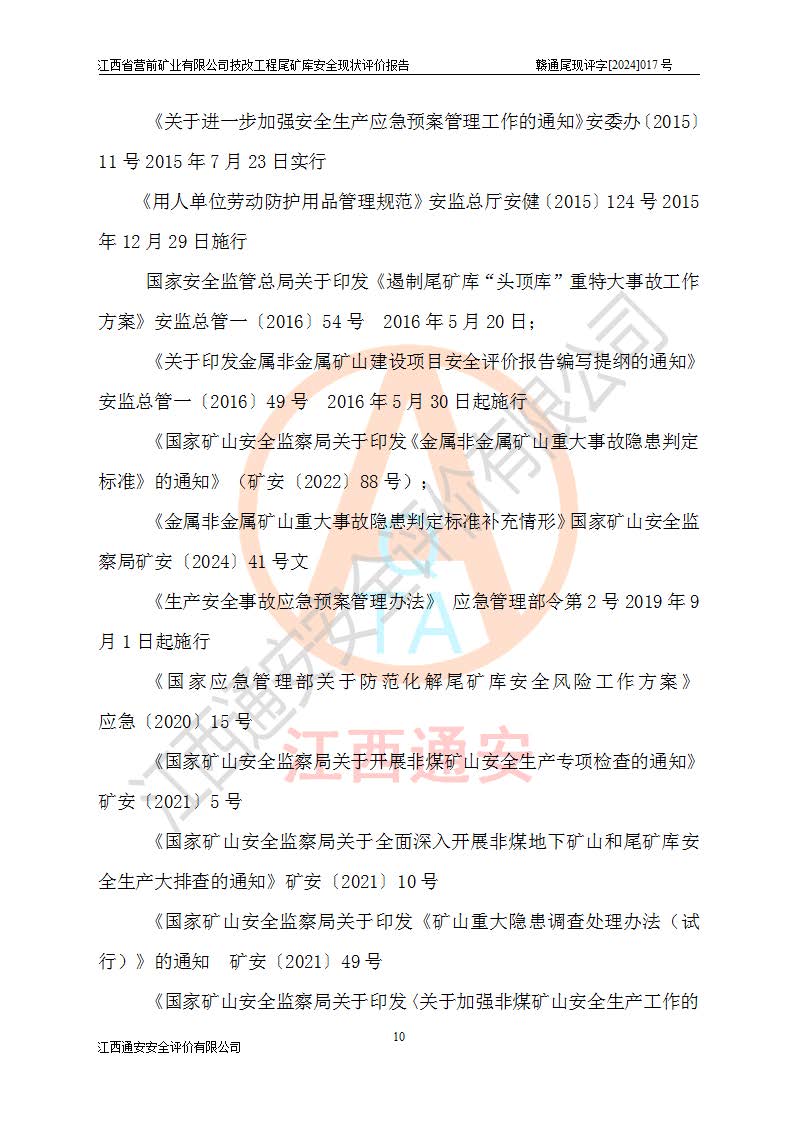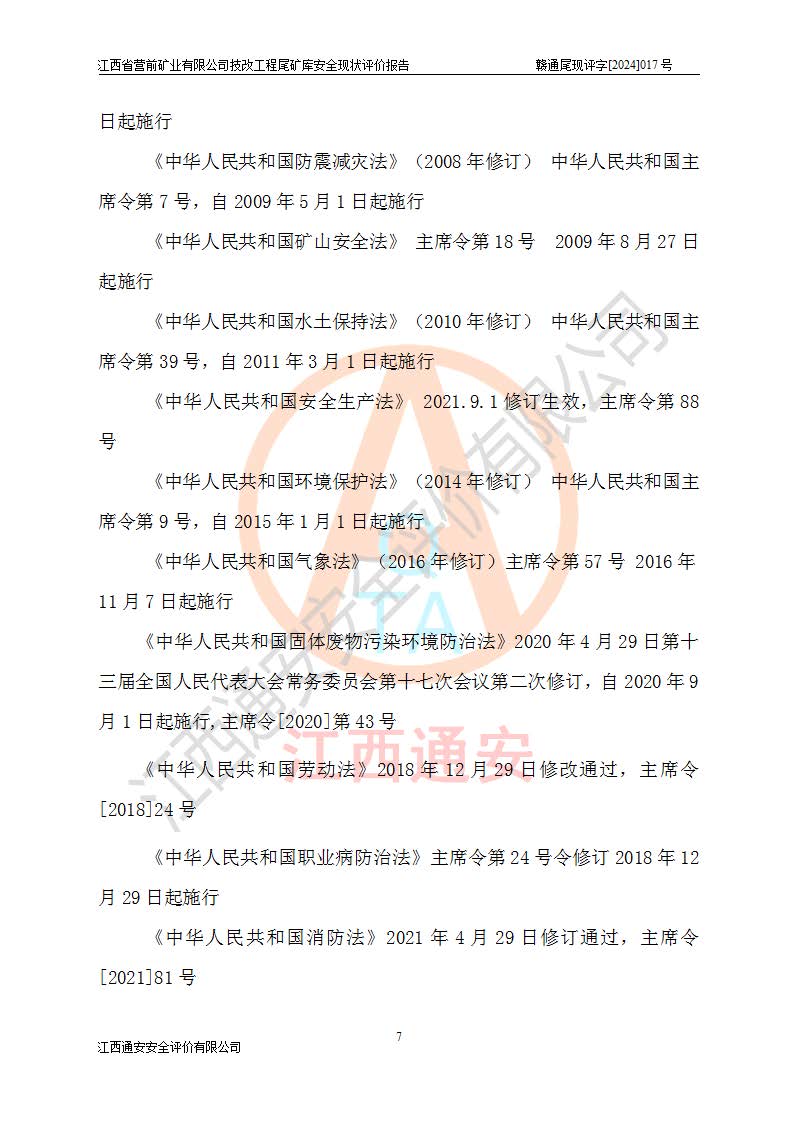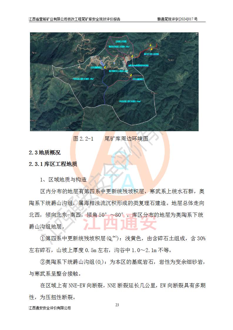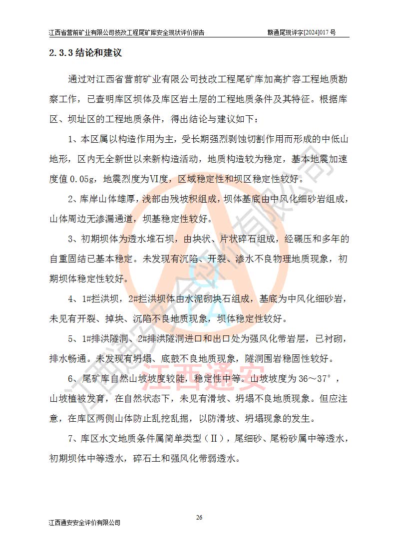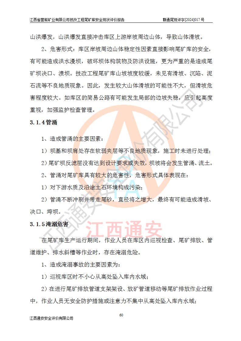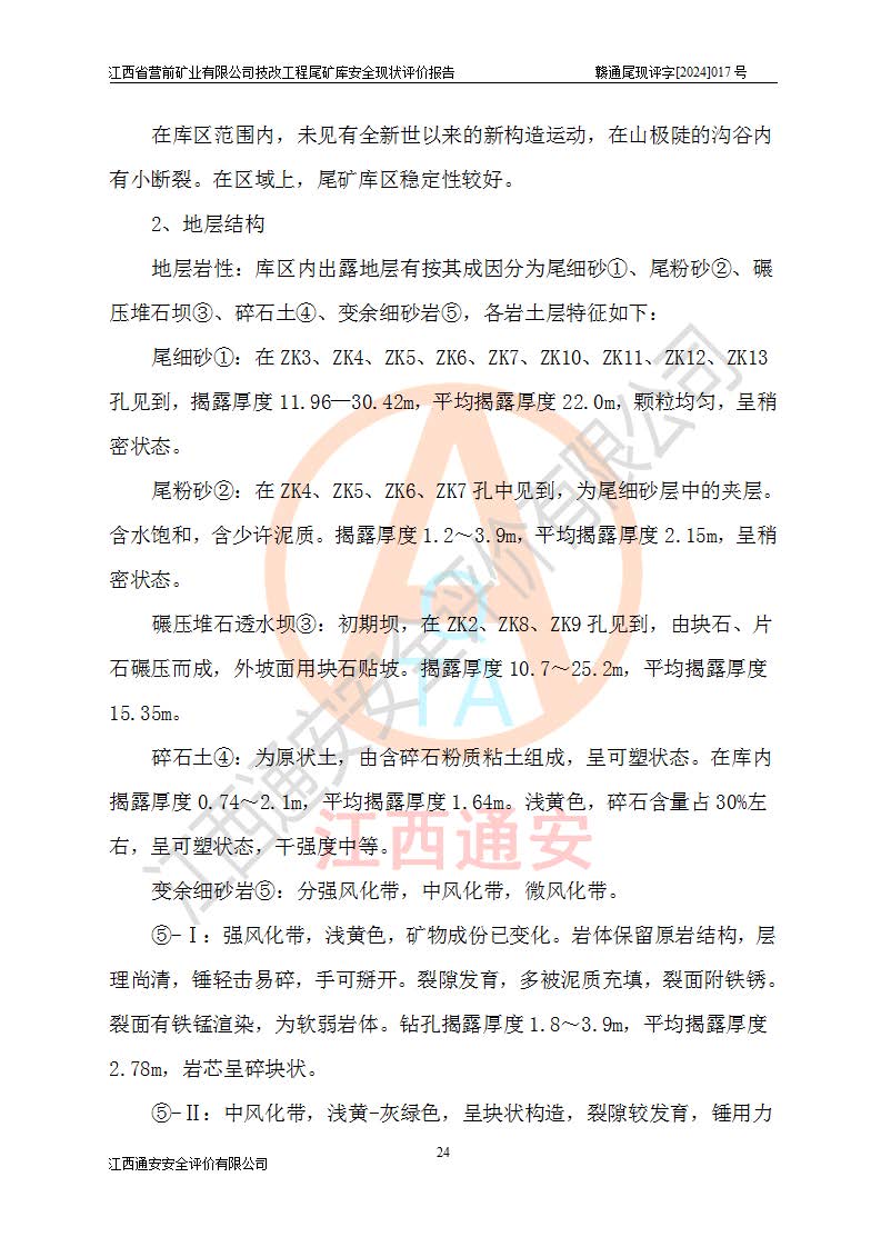 江西省營(yíng)前礦業(yè)有限公司于2003年12月16日成立,位于贛州市上猶縣營(yíng)前鎮(zhèn)焦里村境內(nèi),公司注冊(cè)資本10000萬元,法定**人陳雅博,礦區(qū)地理坐標(biāo):東經(jīng)114°18′30″~114°19′00″,北緯25°52′35″~25°53′47″。公司經(jīng)營(yíng)范圍包括:鉛礦、鋅、鎢、銀地下開采、銷售。 江西省營(yíng)前礦業(yè)有限公司技改工程尾礦庫位于焦里鎢銀鉛鋅礦區(qū),處于上猶縣水巖鄉(xiāng)井子村坑尾自然村境內(nèi),山谷型尾礦庫,溝谷呈“V”字形展布,技改工程尾礦庫原由福建省冶金工業(yè)設(shè)計(jì)院設(shè)計(jì),后由金建工程設(shè)計(jì)有限公司對(duì)該尾礦庫進(jìn)行了加高擴(kuò)容設(shè)計(jì),加高擴(kuò)容后總庫容503.14萬m3,壩高75.0m,為三等庫。尾礦庫主要由尾礦壩、庫外分洪系統(tǒng)(1#攔洪壩--1#分洪隧洞和2#攔洪壩--2#分洪隧洞--排水陡槽--消力池),庫內(nèi)排洪排水系統(tǒng)(排水斜槽—連接井—排水涵洞—排水隧洞—排水陡槽—消力池)等組成,尾礦壩壩型為初期壩+上游式堆積壩。 江西省營(yíng)前礦業(yè)有限公司技改工程尾礦庫于2021年12月30日取得江西省應(yīng)急管理廳版發(fā)的安全生產(chǎn)許可證,證書編號(hào)(贛)FM安許證字(2016)M1692號(hào),有限期從2022年1月18日到2025年1月17日,為三年期。依照《非煤礦礦山企業(yè)安全生產(chǎn)許可證延期換證工作》的通知,根據(jù)***《安全生產(chǎn)許可證條例》、《江西省安全生產(chǎn)條例》、《非煤礦山安全生產(chǎn)許可證實(shí)施辦法》、《江西省非煤礦礦山企業(yè)安全生產(chǎn)許可證辦法》規(guī)定的要求,受江西省營(yíng)前礦業(yè)有限公司委托,我公司承擔(dān)了技改工程尾礦庫延期換證安全現(xiàn)狀評(píng)價(jià)工作。 |