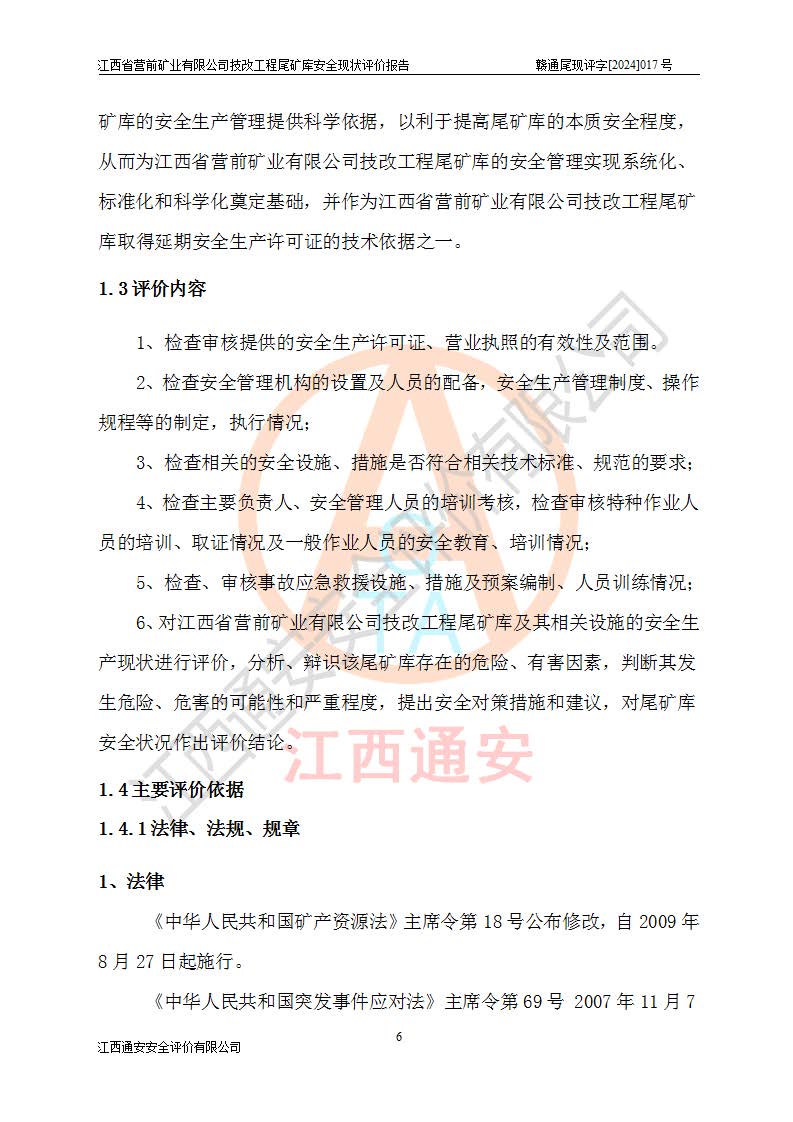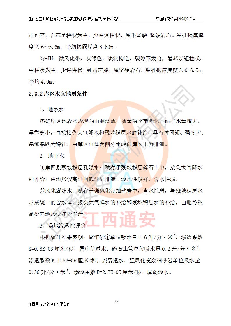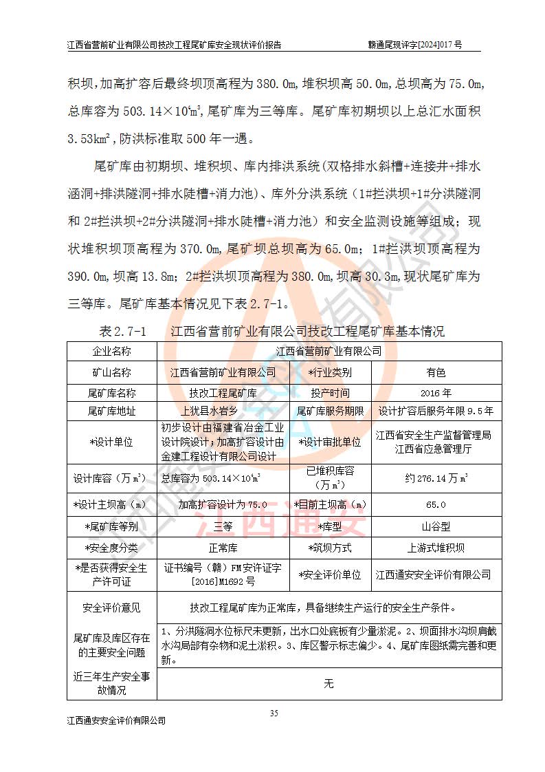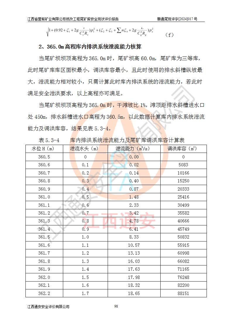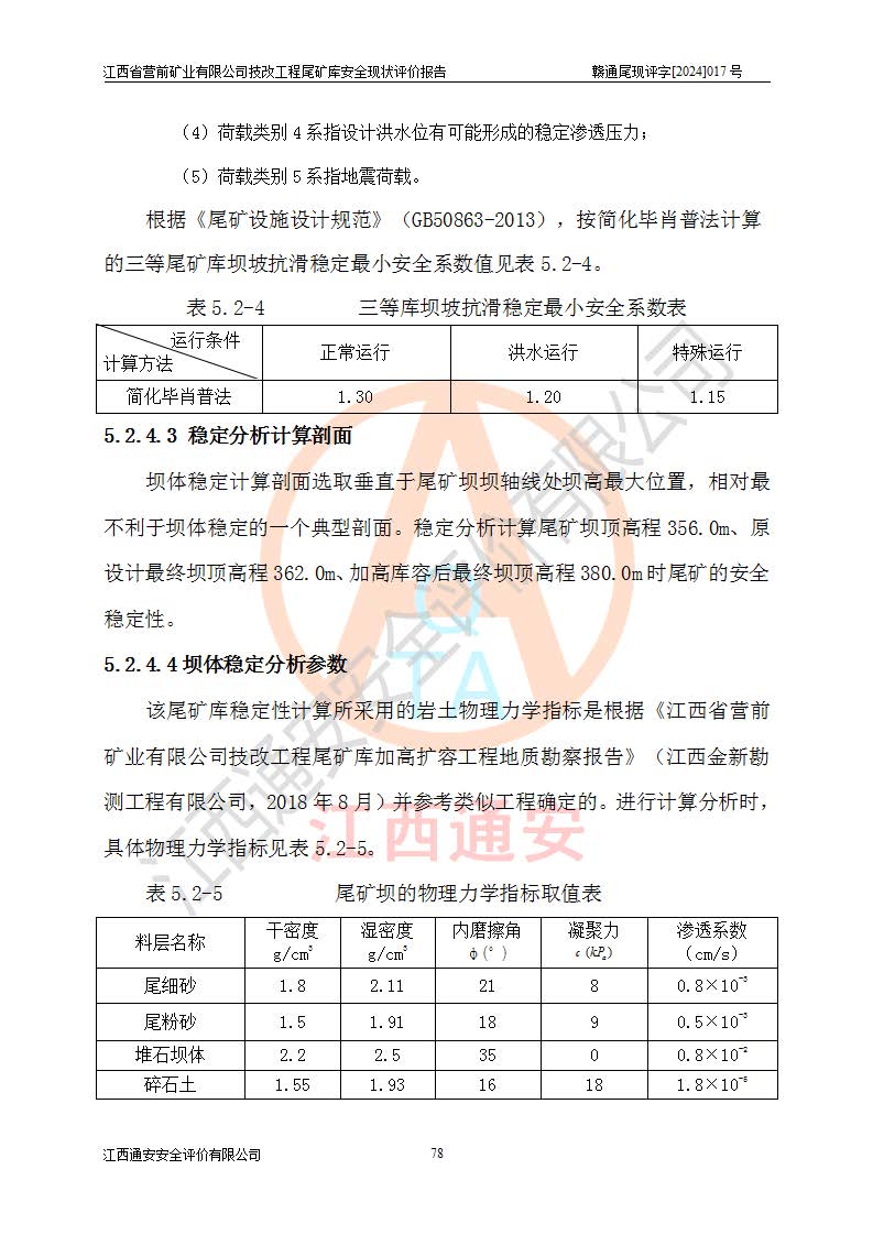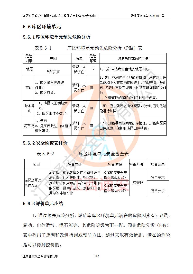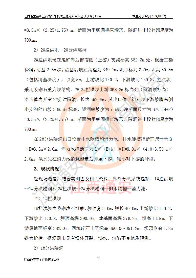 江西省營(yíng)前礦業(yè)有限公司于2003年12月16日成立,位于贛州市上猶縣營(yíng)前鎮(zhèn)焦里村境內(nèi),公司注冊(cè)資本10000萬元,法定**人陳雅博,礦區(qū)地理坐標(biāo):東經(jīng)114°18′30″~114°19′00″,北緯25°52′35″~25°53′47″。公司經(jīng)營(yíng)范圍包括:鉛礦、鋅、鎢、銀地下開采、銷售。 江西省營(yíng)前礦業(yè)有限公司技改工程尾礦庫位于焦里鎢銀鉛鋅礦區(qū),處于上猶縣水巖鄉(xiāng)井子村坑尾自然村境內(nèi),山谷型尾礦庫,溝谷呈“V”字形展布,技改工程尾礦庫原由福建省冶金工業(yè)設(shè)計(jì)院設(shè)計(jì),后由金建工程設(shè)計(jì)有限公司對(duì)該尾礦庫進(jìn)行了加高擴(kuò)容設(shè)計(jì),加高擴(kuò)容后總庫容503.14萬m3,壩高75.0m,為三等庫。尾礦庫主要由尾礦壩、庫外分洪系統(tǒng)(1#攔洪壩--1#分洪隧洞和2#攔洪壩--2#分洪隧洞--排水陡槽--消力池),庫內(nèi)排洪排水系統(tǒng)(排水斜槽—連接井—排水涵洞—排水隧洞—排水陡槽—消力池)等組成,尾礦壩壩型為初期壩+上游式堆積壩。 江西省營(yíng)前礦業(yè)有限公司技改工程尾礦庫于2021年12月30日取得江西省應(yīng)急管理廳版發(fā)的安全生產(chǎn)許可證,證書編號(hào)(贛)FM安許證字(2016)M1692號(hào),有限期從2022年1月18日到2025年1月17日,為三年期。依照《非煤礦礦山企業(yè)安全生產(chǎn)許可證延期換證工作》的通知,根據(jù)***《安全生產(chǎn)許可證條例》、《江西省安全生產(chǎn)條例》、《非煤礦山安全生產(chǎn)許可證實(shí)施辦法》、《江西省非煤礦礦山企業(yè)安全生產(chǎn)許可證辦法》規(guī)定的要求,受江西省營(yíng)前礦業(yè)有限公司委托,我公司承擔(dān)了技改工程尾礦庫延期換證安全現(xiàn)狀評(píng)價(jià)工作。 |