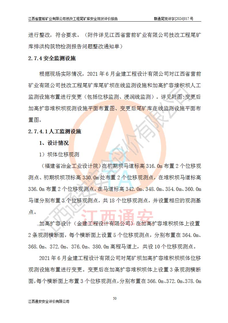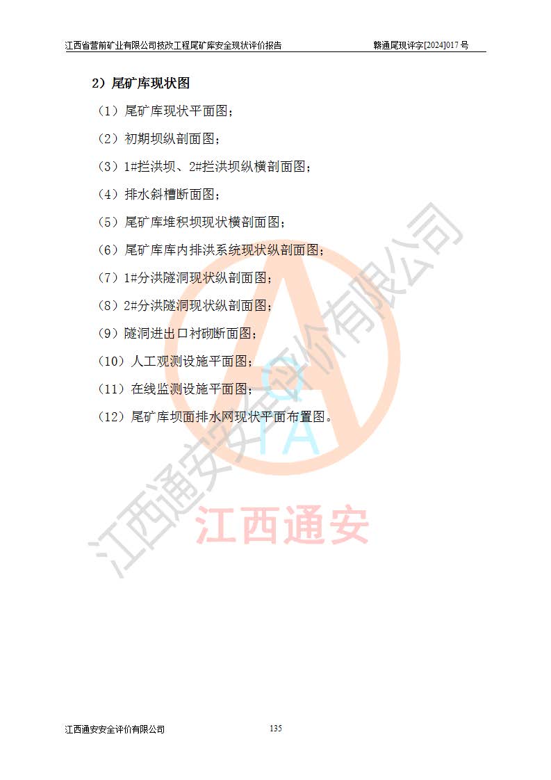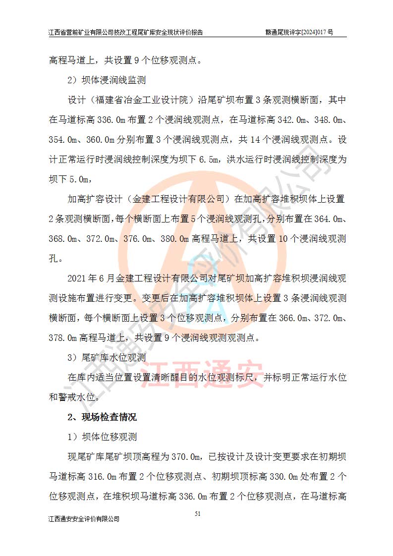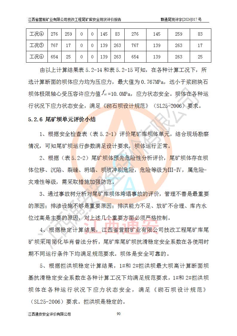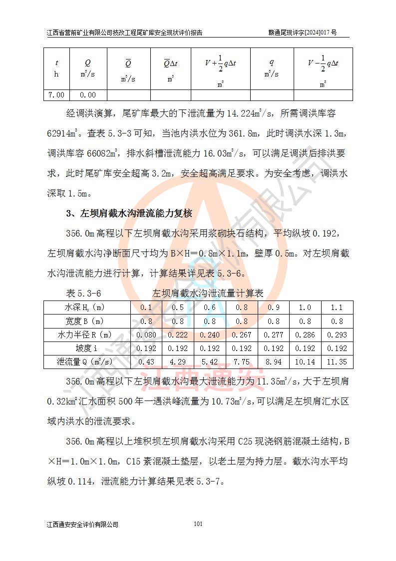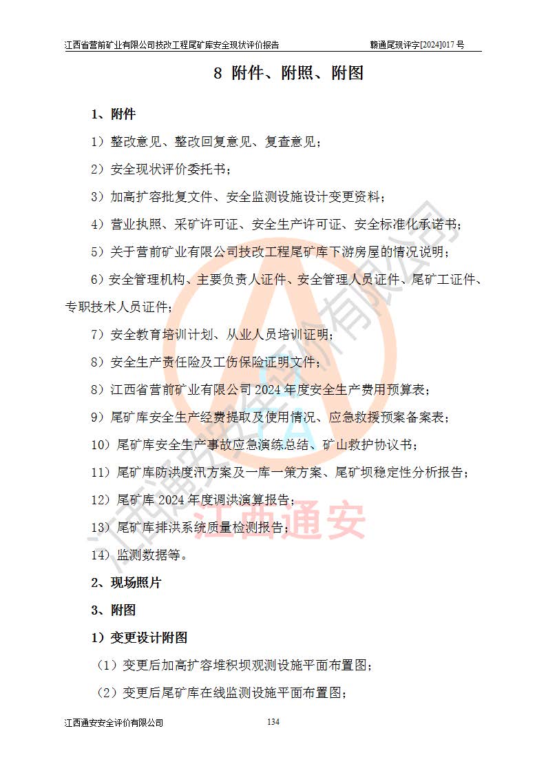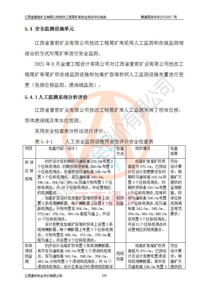 江西省營(yíng)前礦業(yè)有限公司于2003年12月16日成立,位于贛州市上猶縣營(yíng)前鎮(zhèn)焦里村境內(nèi),公司注冊(cè)資本10000萬元,法定**人陳雅博,礦區(qū)地理坐標(biāo):東經(jīng)114°18′30″~114°19′00″,北緯25°52′35″~25°53′47″。公司經(jīng)營(yíng)范圍包括:鉛礦、鋅、鎢、銀地下開采、銷售。 江西省營(yíng)前礦業(yè)有限公司技改工程尾礦庫位于焦里鎢銀鉛鋅礦區(qū),處于上猶縣水巖鄉(xiāng)井子村坑尾自然村境內(nèi),山谷型尾礦庫,溝谷呈“V”字形展布,技改工程尾礦庫原由福建省冶金工業(yè)設(shè)計(jì)院設(shè)計(jì),后由金建工程設(shè)計(jì)有限公司對(duì)該尾礦庫進(jìn)行了加高擴(kuò)容設(shè)計(jì),加高擴(kuò)容后總庫容503.14萬m3,壩高75.0m,為三等庫。尾礦庫主要由尾礦壩、庫外分洪系統(tǒng)(1#攔洪壩--1#分洪隧洞和2#攔洪壩--2#分洪隧洞--排水陡槽--消力池),庫內(nèi)排洪排水系統(tǒng)(排水斜槽—連接井—排水涵洞—排水隧洞—排水陡槽—消力池)等組成,尾礦壩壩型為初期壩+上游式堆積壩。 江西省營(yíng)前礦業(yè)有限公司技改工程尾礦庫于2021年12月30日取得江西省應(yīng)急管理廳版發(fā)的安全生產(chǎn)許可證,證書編號(hào)(贛)FM安許證字(2016)M1692號(hào),有限期從2022年1月18日到2025年1月17日,為三年期。依照《非煤礦礦山企業(yè)安全生產(chǎn)許可證延期換證工作》的通知,根據(jù)***《安全生產(chǎn)許可證條例》、《江西省安全生產(chǎn)條例》、《非煤礦山安全生產(chǎn)許可證實(shí)施辦法》、《江西省非煤礦礦山企業(yè)安全生產(chǎn)許可證辦法》規(guī)定的要求,受江西省營(yíng)前礦業(yè)有限公司委托,我公司承擔(dān)了技改工程尾礦庫延期換證安全現(xiàn)狀評(píng)價(jià)工作。 |