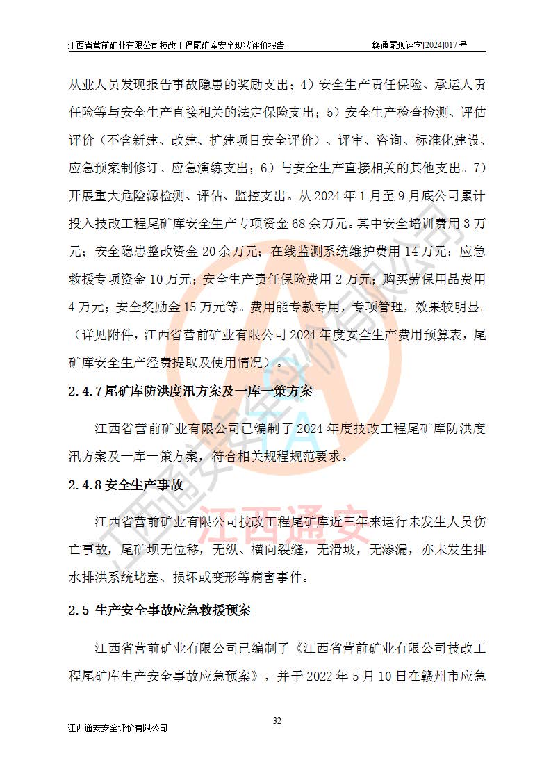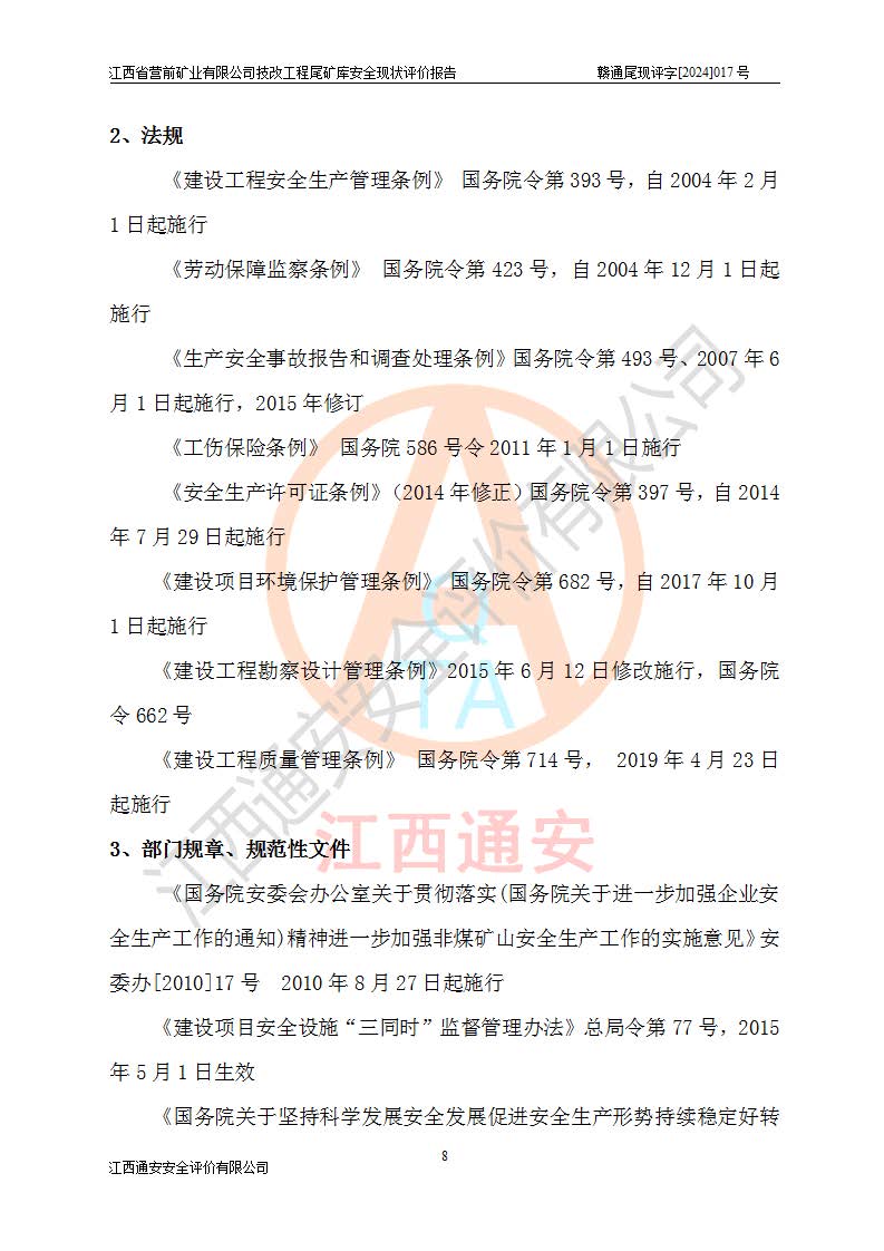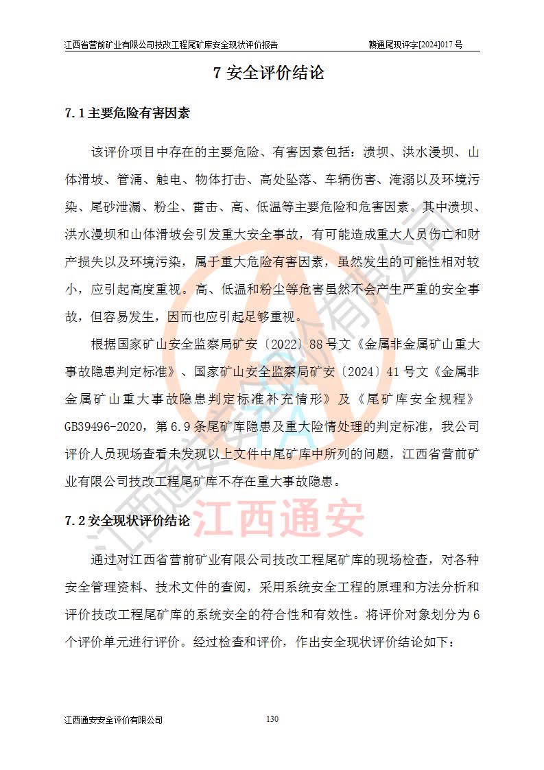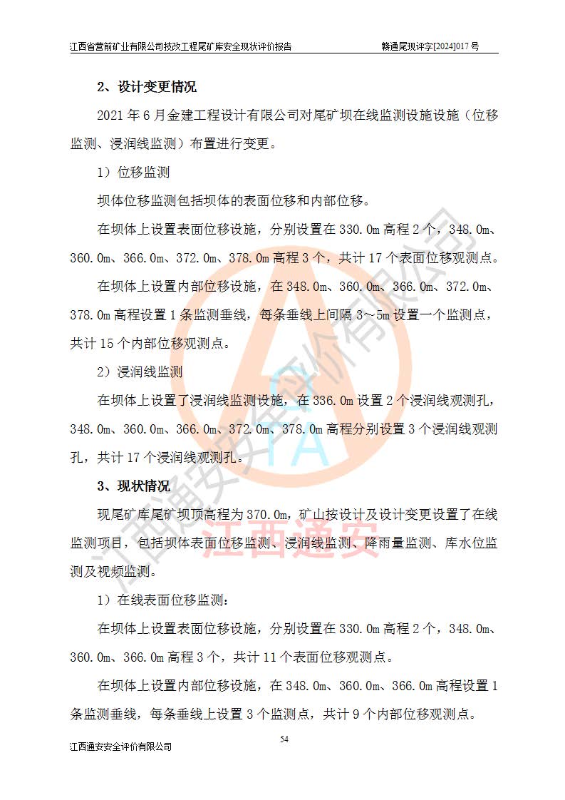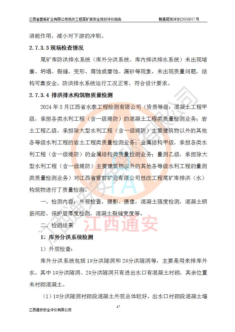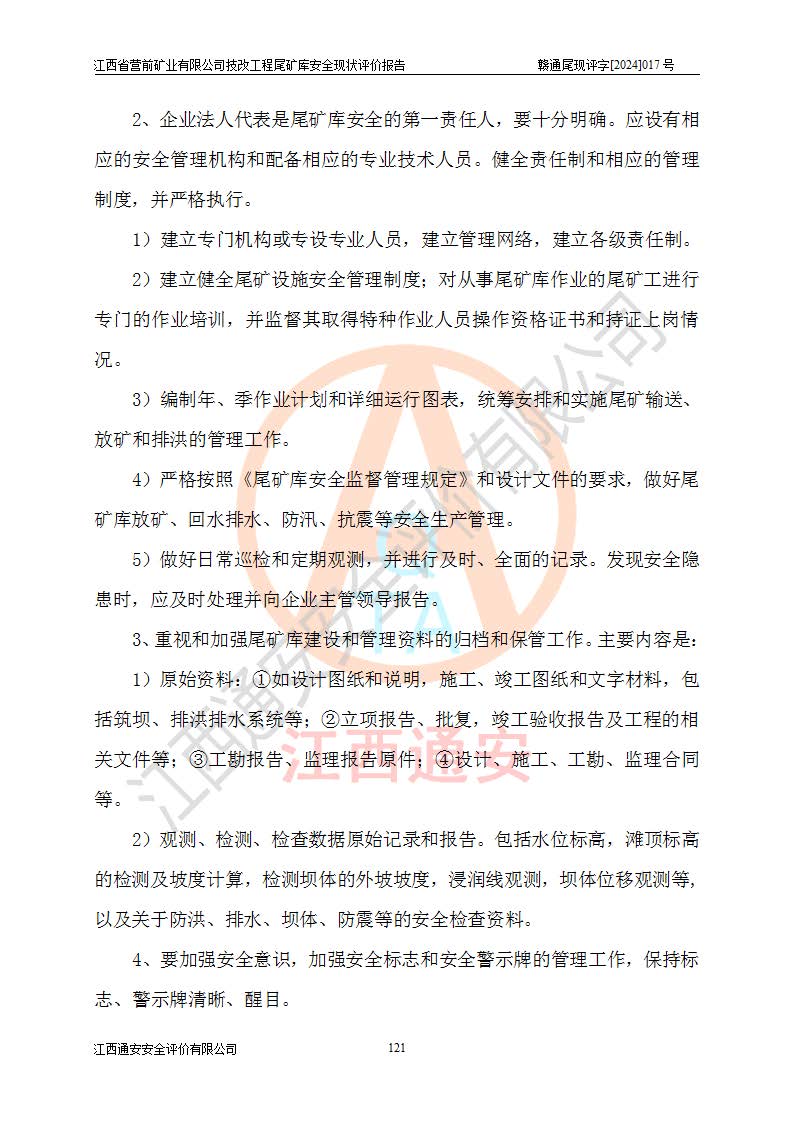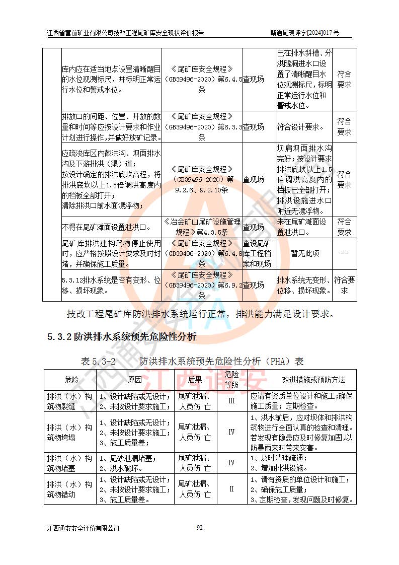 江西省營(yíng)前礦業(yè)有限公司于2003年12月16日成立,位于贛州市上猶縣營(yíng)前鎮(zhèn)焦里村境內(nèi),公司注冊(cè)資本10000萬元,法定**人陳雅博,礦區(qū)地理坐標(biāo):東經(jīng)114°18′30″~114°19′00″,北緯25°52′35″~25°53′47″。公司經(jīng)營(yíng)范圍包括:鉛礦、鋅、鎢、銀地下開采、銷售。 江西省營(yíng)前礦業(yè)有限公司技改工程尾礦庫位于焦里鎢銀鉛鋅礦區(qū),處于上猶縣水巖鄉(xiāng)井子村坑尾自然村境內(nèi),山谷型尾礦庫,溝谷呈“V”字形展布,技改工程尾礦庫原由福建省冶金工業(yè)設(shè)計(jì)院設(shè)計(jì),后由金建工程設(shè)計(jì)有限公司對(duì)該尾礦庫進(jìn)行了加高擴(kuò)容設(shè)計(jì),加高擴(kuò)容后總庫容503.14萬m3,壩高75.0m,為三等庫。尾礦庫主要由尾礦壩、庫外分洪系統(tǒng)(1#攔洪壩--1#分洪隧洞和2#攔洪壩--2#分洪隧洞--排水陡槽--消力池),庫內(nèi)排洪排水系統(tǒng)(排水斜槽—連接井—排水涵洞—排水隧洞—排水陡槽—消力池)等組成,尾礦壩壩型為初期壩+上游式堆積壩。 江西省營(yíng)前礦業(yè)有限公司技改工程尾礦庫于2021年12月30日取得江西省應(yīng)急管理廳版發(fā)的安全生產(chǎn)許可證,證書編號(hào)(贛)FM安許證字(2016)M1692號(hào),有限期從2022年1月18日到2025年1月17日,為三年期。依照《非煤礦礦山企業(yè)安全生產(chǎn)許可證延期換證工作》的通知,根據(jù)***《安全生產(chǎn)許可證條例》、《江西省安全生產(chǎn)條例》、《非煤礦山安全生產(chǎn)許可證實(shí)施辦法》、《江西省非煤礦礦山企業(yè)安全生產(chǎn)許可證辦法》規(guī)定的要求,受江西省營(yíng)前礦業(yè)有限公司委托,我公司承擔(dān)了技改工程尾礦庫延期換證安全現(xiàn)狀評(píng)價(jià)工作。 |