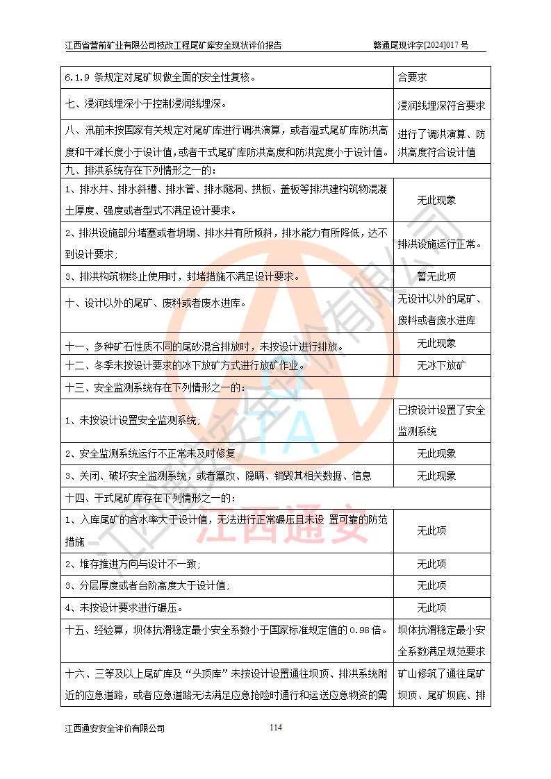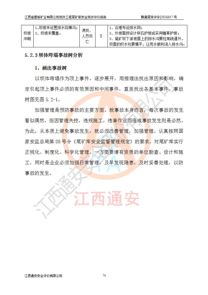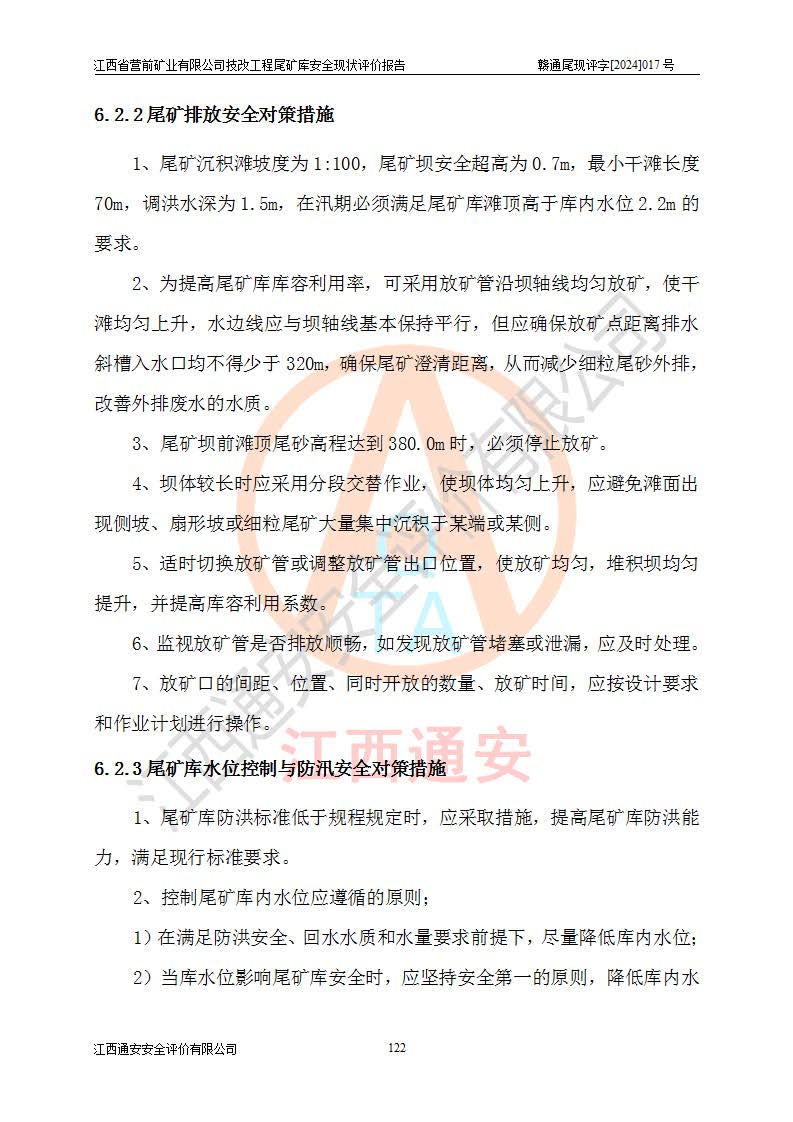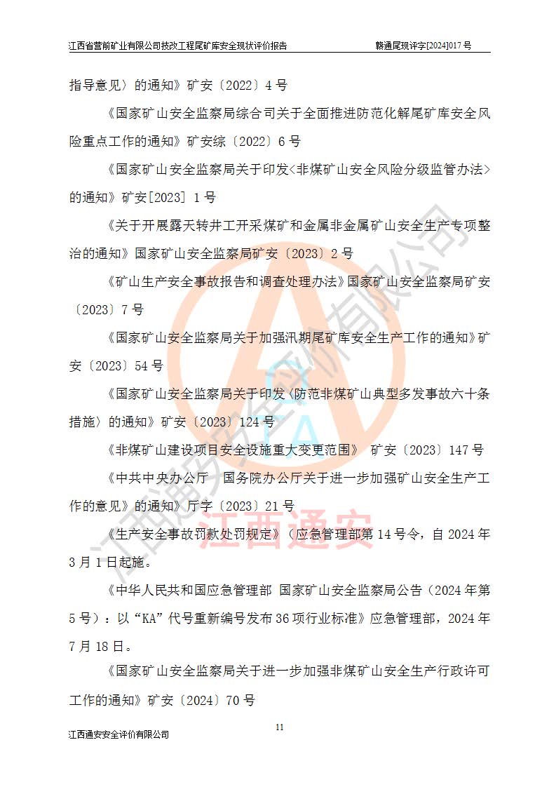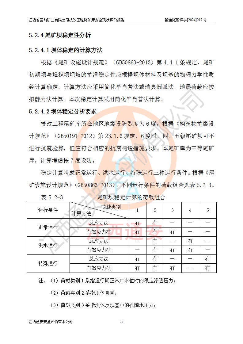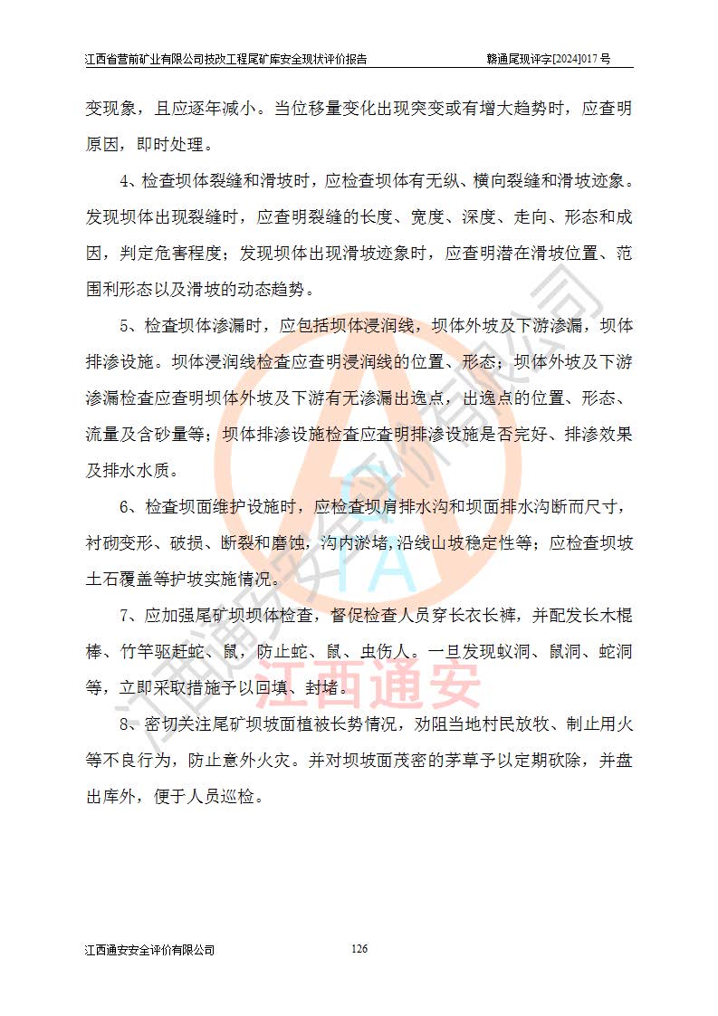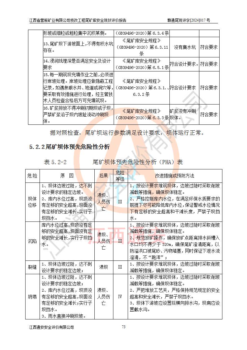 江西省營(yíng)前礦業(yè)有限公司于2003年12月16日成立,位于贛州市上猶縣營(yíng)前鎮(zhèn)焦里村境內(nèi),公司注冊(cè)資本10000萬元,法定**人陳雅博,礦區(qū)地理坐標(biāo):東經(jīng)114°18′30″~114°19′00″,北緯25°52′35″~25°53′47″。公司經(jīng)營(yíng)范圍包括:鉛礦、鋅、鎢、銀地下開采、銷售。 江西省營(yíng)前礦業(yè)有限公司技改工程尾礦庫位于焦里鎢銀鉛鋅礦區(qū),處于上猶縣水巖鄉(xiāng)井子村坑尾自然村境內(nèi),山谷型尾礦庫,溝谷呈“V”字形展布,技改工程尾礦庫原由福建省冶金工業(yè)設(shè)計(jì)院設(shè)計(jì),后由金建工程設(shè)計(jì)有限公司對(duì)該尾礦庫進(jìn)行了加高擴(kuò)容設(shè)計(jì),加高擴(kuò)容后總庫容503.14萬m3,壩高75.0m,為三等庫。尾礦庫主要由尾礦壩、庫外分洪系統(tǒng)(1#攔洪壩--1#分洪隧洞和2#攔洪壩--2#分洪隧洞--排水陡槽--消力池),庫內(nèi)排洪排水系統(tǒng)(排水斜槽—連接井—排水涵洞—排水隧洞—排水陡槽—消力池)等組成,尾礦壩壩型為初期壩+上游式堆積壩。 江西省營(yíng)前礦業(yè)有限公司技改工程尾礦庫于2021年12月30日取得江西省應(yīng)急管理廳版發(fā)的安全生產(chǎn)許可證,證書編號(hào)(贛)FM安許證字(2016)M1692號(hào),有限期從2022年1月18日到2025年1月17日,為三年期。依照《非煤礦礦山企業(yè)安全生產(chǎn)許可證延期換證工作》的通知,根據(jù)***《安全生產(chǎn)許可證條例》、《江西省安全生產(chǎn)條例》、《非煤礦山安全生產(chǎn)許可證實(shí)施辦法》、《江西省非煤礦礦山企業(yè)安全生產(chǎn)許可證辦法》規(guī)定的要求,受江西省營(yíng)前礦業(yè)有限公司委托,我公司承擔(dān)了技改工程尾礦庫延期換證安全現(xiàn)狀評(píng)價(jià)工作。 |