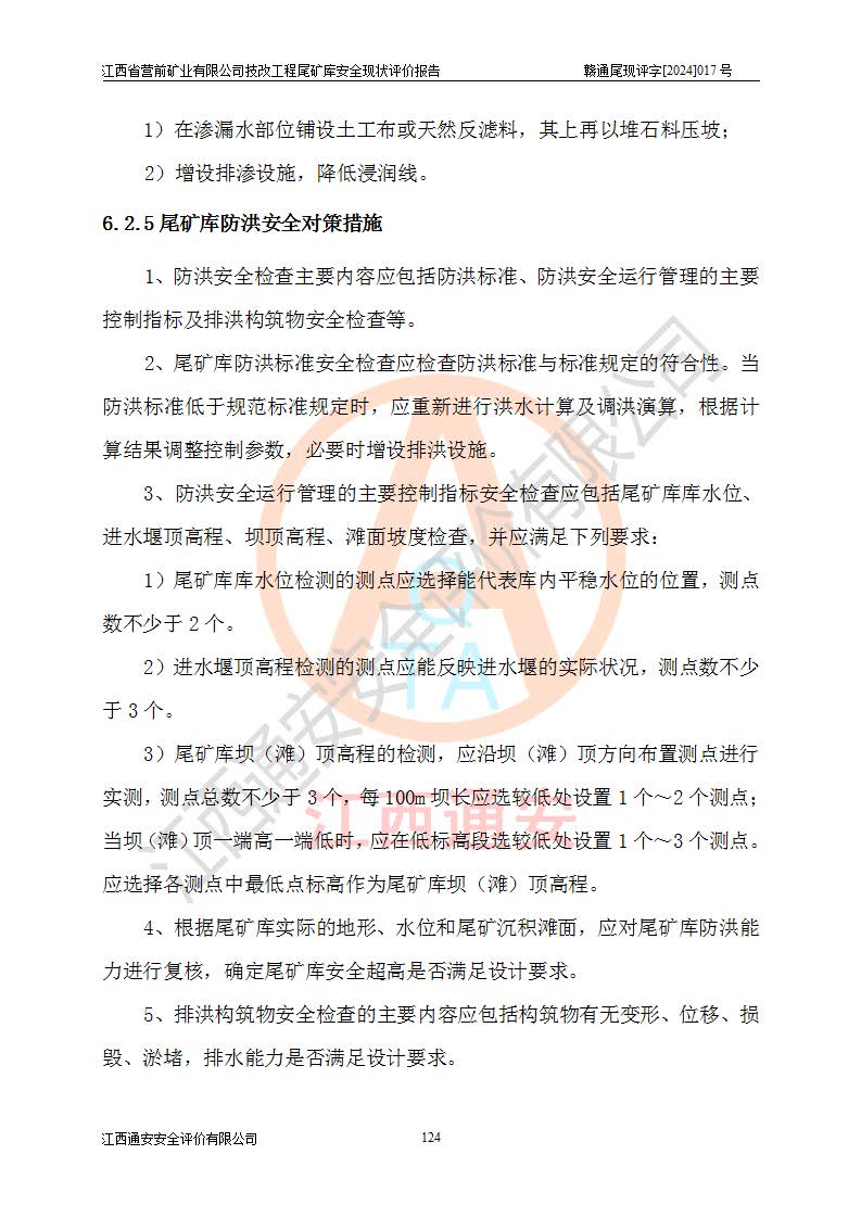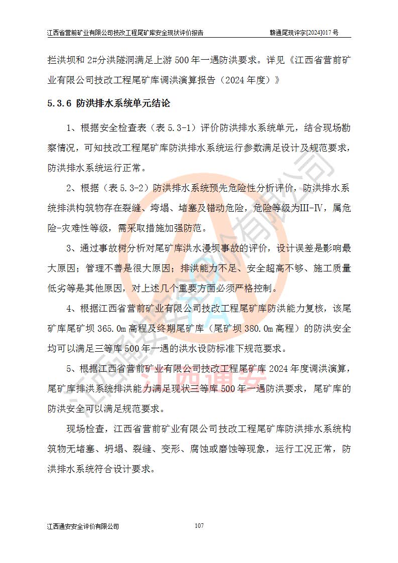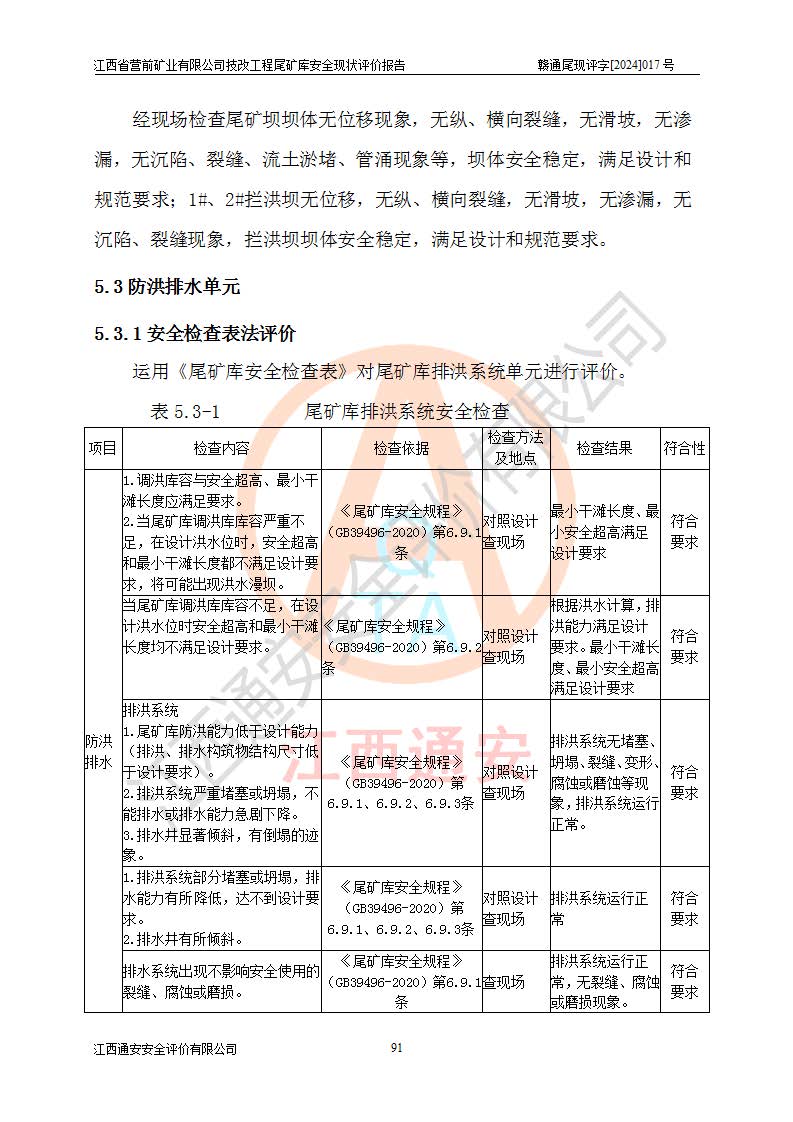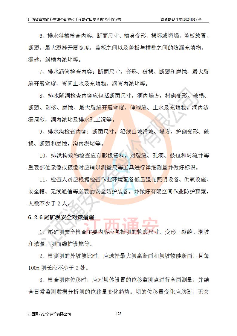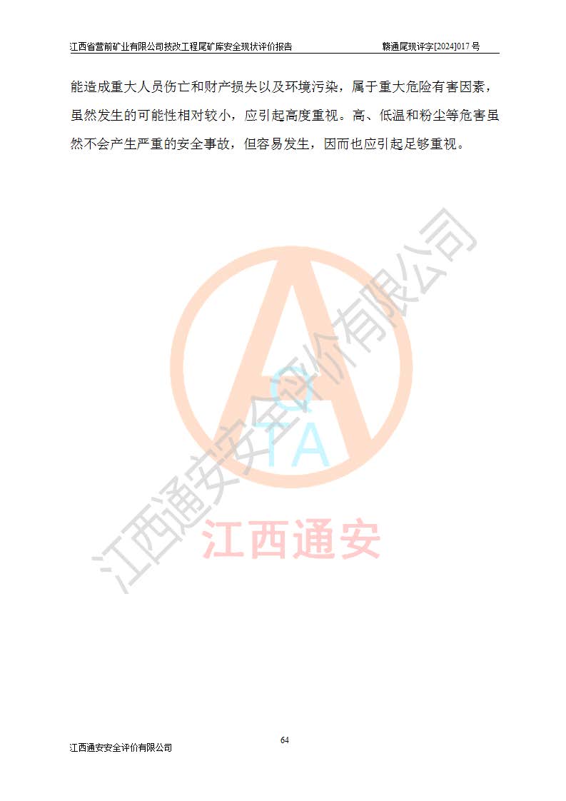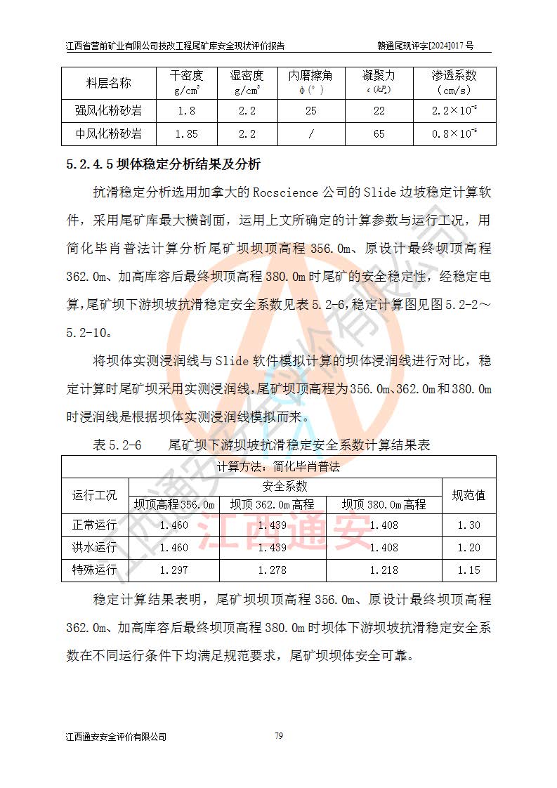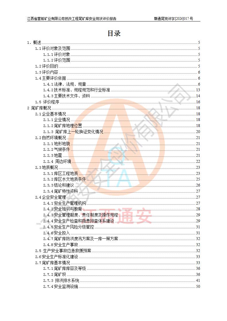 江西省營(yíng)前礦業(yè)有限公司于2003年12月16日成立,位于贛州市上猶縣營(yíng)前鎮(zhèn)焦里村境內(nèi),公司注冊(cè)資本10000萬元,法定**人陳雅博,礦區(qū)地理坐標(biāo):東經(jīng)114°18′30″~114°19′00″,北緯25°52′35″~25°53′47″。公司經(jīng)營(yíng)范圍包括:鉛礦、鋅、鎢、銀地下開采、銷售。 江西省營(yíng)前礦業(yè)有限公司技改工程尾礦庫位于焦里鎢銀鉛鋅礦區(qū),處于上猶縣水巖鄉(xiāng)井子村坑尾自然村境內(nèi),山谷型尾礦庫,溝谷呈“V”字形展布,技改工程尾礦庫原由福建省冶金工業(yè)設(shè)計(jì)院設(shè)計(jì),后由金建工程設(shè)計(jì)有限公司對(duì)該尾礦庫進(jìn)行了加高擴(kuò)容設(shè)計(jì),加高擴(kuò)容后總庫容503.14萬m3,壩高75.0m,為三等庫。尾礦庫主要由尾礦壩、庫外分洪系統(tǒng)(1#攔洪壩--1#分洪隧洞和2#攔洪壩--2#分洪隧洞--排水陡槽--消力池),庫內(nèi)排洪排水系統(tǒng)(排水斜槽—連接井—排水涵洞—排水隧洞—排水陡槽—消力池)等組成,尾礦壩壩型為初期壩+上游式堆積壩。 江西省營(yíng)前礦業(yè)有限公司技改工程尾礦庫于2021年12月30日取得江西省應(yīng)急管理廳版發(fā)的安全生產(chǎn)許可證,證書編號(hào)(贛)FM安許證字(2016)M1692號(hào),有限期從2022年1月18日到2025年1月17日,為三年期。依照《非煤礦礦山企業(yè)安全生產(chǎn)許可證延期換證工作》的通知,根據(jù)***《安全生產(chǎn)許可證條例》、《江西省安全生產(chǎn)條例》、《非煤礦山安全生產(chǎn)許可證實(shí)施辦法》、《江西省非煤礦礦山企業(yè)安全生產(chǎn)許可證辦法》規(guī)定的要求,受江西省營(yíng)前礦業(yè)有限公司委托,我公司承擔(dān)了技改工程尾礦庫延期換證安全現(xiàn)狀評(píng)價(jià)工作。 |