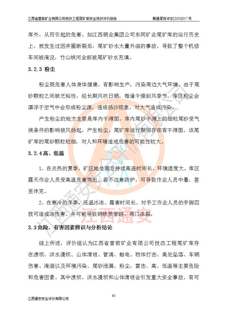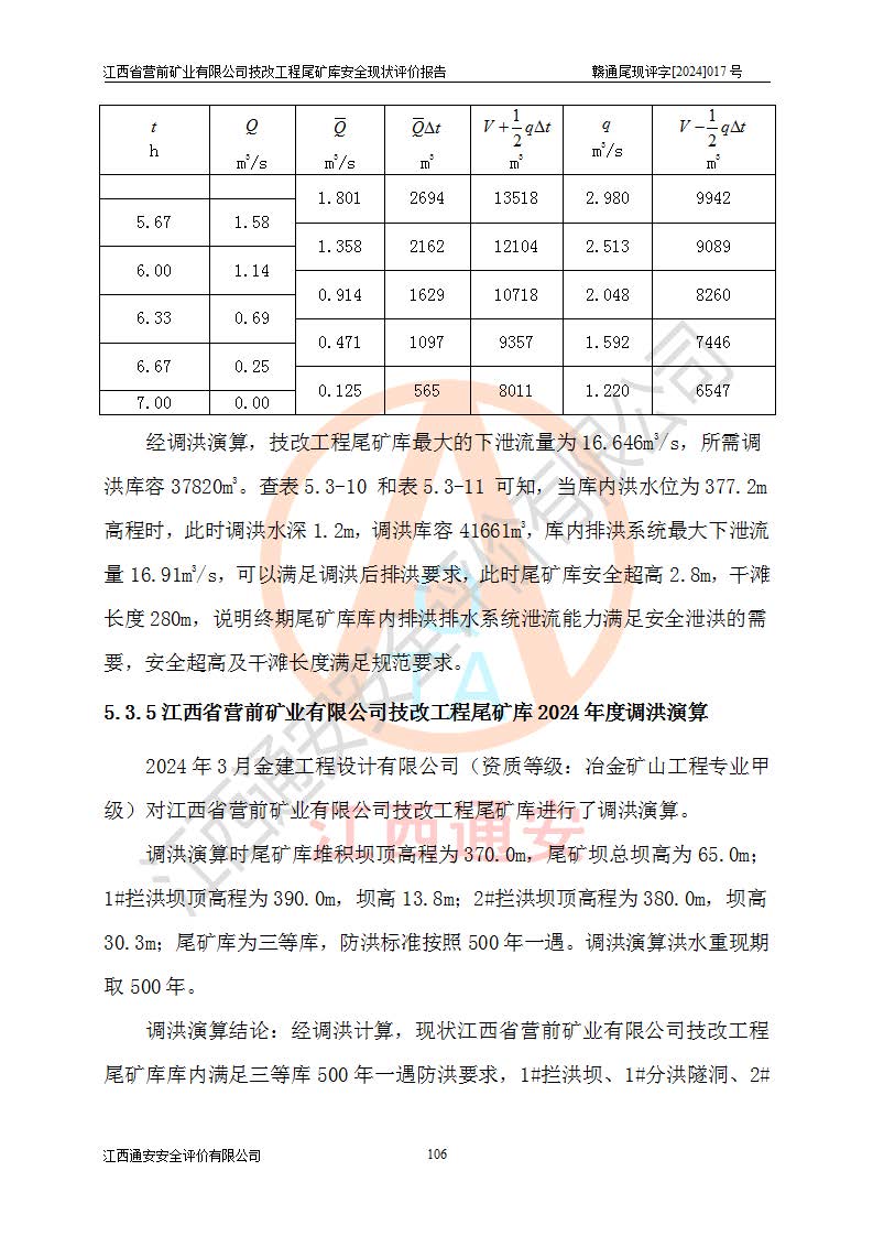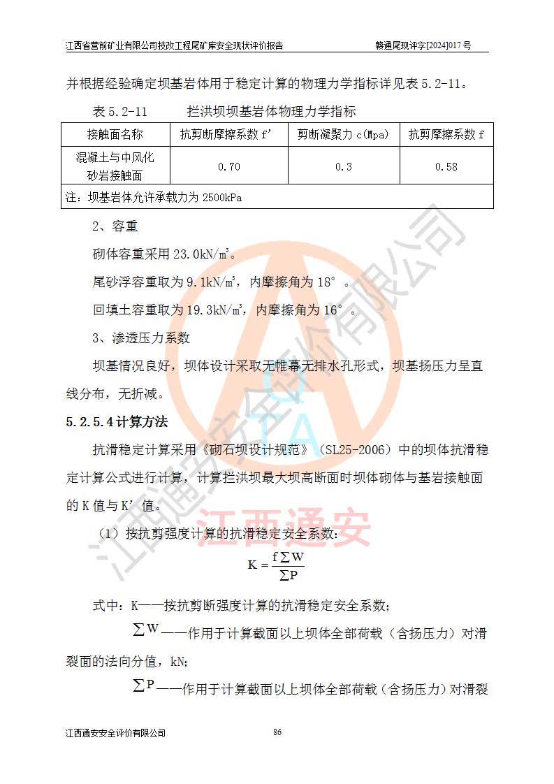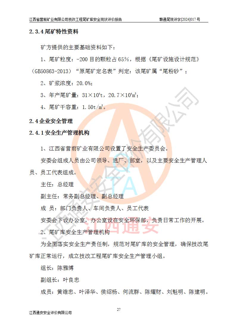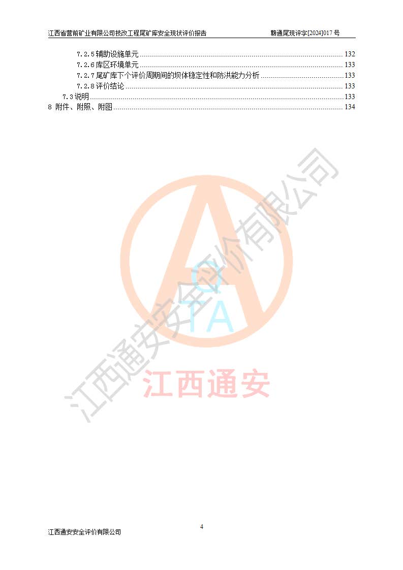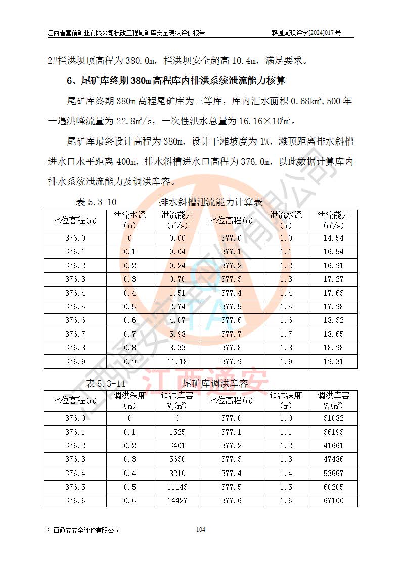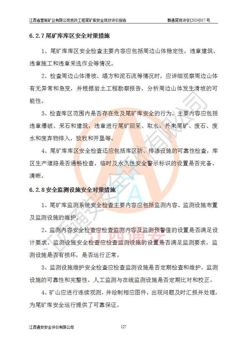 江西省營(yíng)前礦業(yè)有限公司于2003年12月16日成立,位于贛州市上猶縣營(yíng)前鎮(zhèn)焦里村境內(nèi),公司注冊(cè)資本10000萬元,法定**人陳雅博,礦區(qū)地理坐標(biāo):東經(jīng)114°18′30″~114°19′00″,北緯25°52′35″~25°53′47″。公司經(jīng)營(yíng)范圍包括:鉛礦、鋅、鎢、銀地下開采、銷售。 江西省營(yíng)前礦業(yè)有限公司技改工程尾礦庫位于焦里鎢銀鉛鋅礦區(qū),處于上猶縣水巖鄉(xiāng)井子村坑尾自然村境內(nèi),山谷型尾礦庫,溝谷呈“V”字形展布,技改工程尾礦庫原由福建省冶金工業(yè)設(shè)計(jì)院設(shè)計(jì),后由金建工程設(shè)計(jì)有限公司對(duì)該尾礦庫進(jìn)行了加高擴(kuò)容設(shè)計(jì),加高擴(kuò)容后總庫容503.14萬m3,壩高75.0m,為三等庫。尾礦庫主要由尾礦壩、庫外分洪系統(tǒng)(1#攔洪壩--1#分洪隧洞和2#攔洪壩--2#分洪隧洞--排水陡槽--消力池),庫內(nèi)排洪排水系統(tǒng)(排水斜槽—連接井—排水涵洞—排水隧洞—排水陡槽—消力池)等組成,尾礦壩壩型為初期壩+上游式堆積壩。 江西省營(yíng)前礦業(yè)有限公司技改工程尾礦庫于2021年12月30日取得江西省應(yīng)急管理廳版發(fā)的安全生產(chǎn)許可證,證書編號(hào)(贛)FM安許證字(2016)M1692號(hào),有限期從2022年1月18日到2025年1月17日,為三年期。依照《非煤礦礦山企業(yè)安全生產(chǎn)許可證延期換證工作》的通知,根據(jù)***《安全生產(chǎn)許可證條例》、《江西省安全生產(chǎn)條例》、《非煤礦山安全生產(chǎn)許可證實(shí)施辦法》、《江西省非煤礦礦山企業(yè)安全生產(chǎn)許可證辦法》規(guī)定的要求,受江西省營(yíng)前礦業(yè)有限公司委托,我公司承擔(dān)了技改工程尾礦庫延期換證安全現(xiàn)狀評(píng)價(jià)工作。 |
