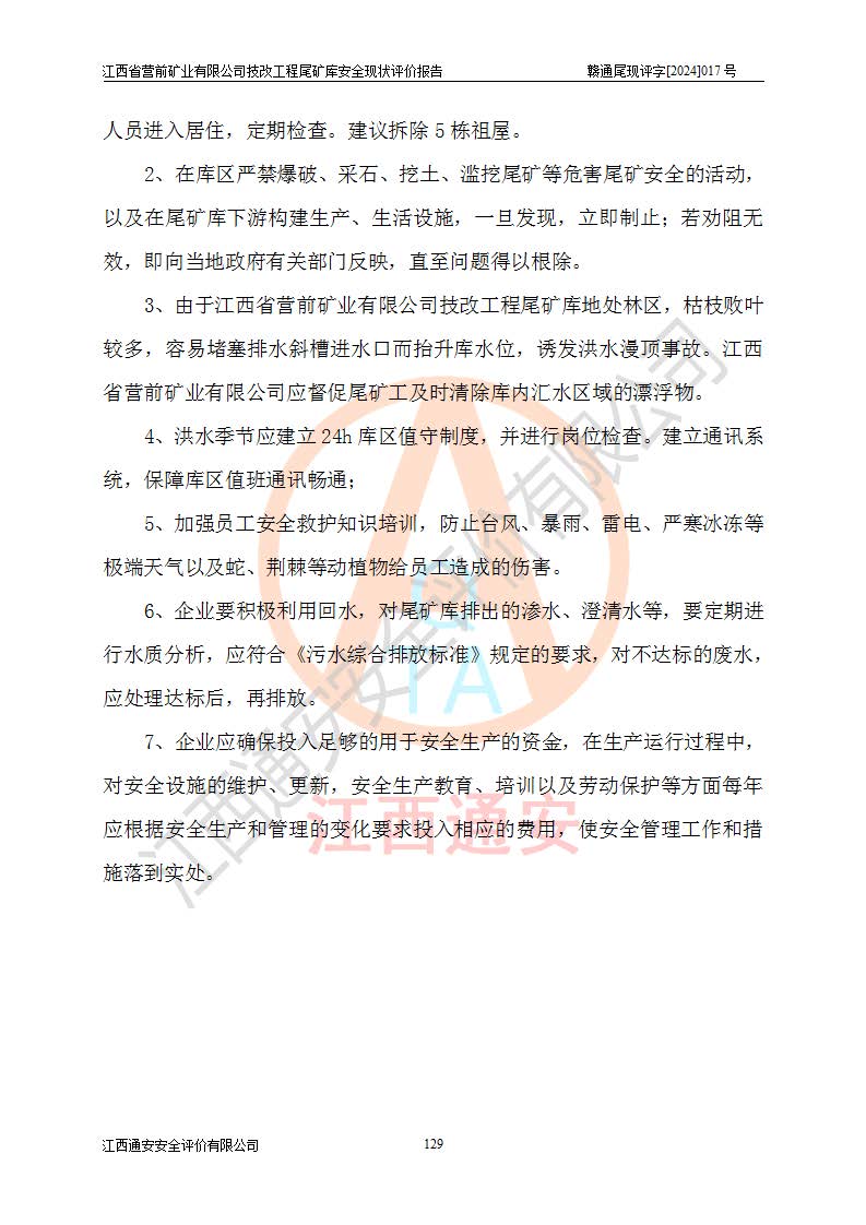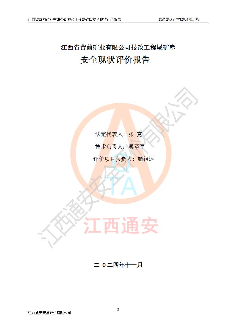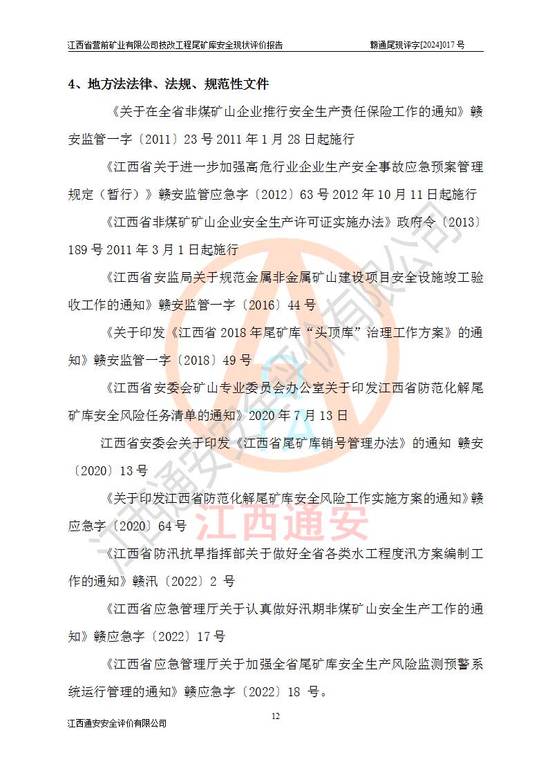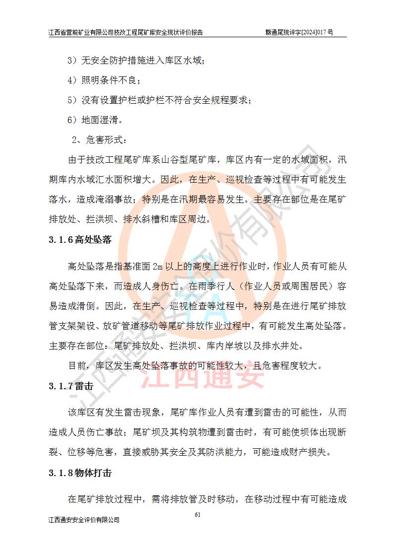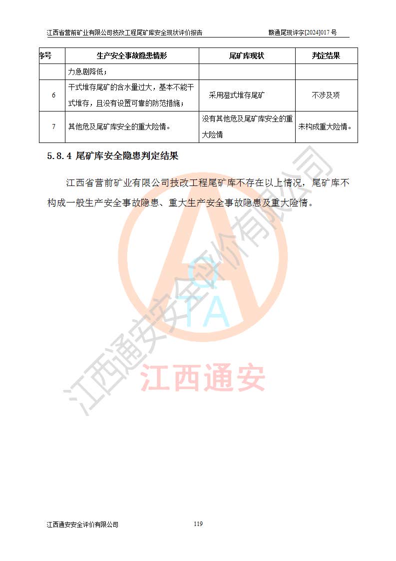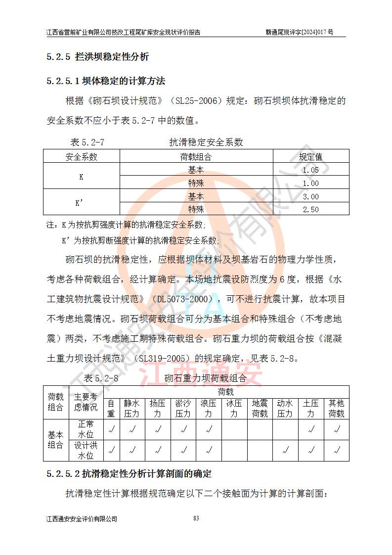江西省營(yíng)前礦業(yè)有限公司于2003年12月16日成立,位于贛州市上猶縣營(yíng)前鎮(zhèn)焦里村境內(nèi),公司注冊(cè)資本10000萬元,法定**人陳雅博,礦區(qū)地理坐標(biāo):東經(jīng)114°18′30″~114°19′00″,北緯25°52′35″~25°53′47″。公司經(jīng)營(yíng)范圍包括:鉛礦、鋅、鎢、銀地下開采、銷售。 江西省營(yíng)前礦業(yè)有限公司技改工程尾礦庫位于焦里鎢銀鉛鋅礦區(qū),處于上猶縣水巖鄉(xiāng)井子村坑尾自然村境內(nèi),山谷型尾礦庫,溝谷呈“V”字形展布,技改工程尾礦庫原由福建省冶金工業(yè)設(shè)計(jì)院設(shè)計(jì),后由金建工程設(shè)計(jì)有限公司對(duì)該尾礦庫進(jìn)行了加高擴(kuò)容設(shè)計(jì),加高擴(kuò)容后總庫容503.14萬m3,壩高75.0m,為三等庫。尾礦庫主要由尾礦壩、庫外分洪系統(tǒng)(1#攔洪壩--1#分洪隧洞和2#攔洪壩--2#分洪隧洞--排水陡槽--消力池),庫內(nèi)排洪排水系統(tǒng)(排水斜槽—連接井—排水涵洞—排水隧洞—排水陡槽—消力池)等組成,尾礦壩壩型為初期壩+上游式堆積壩。 江西省營(yíng)前礦業(yè)有限公司技改工程尾礦庫于2021年12月30日取得江西省應(yīng)急管理廳版發(fā)的安全生產(chǎn)許可證,證書編號(hào)(贛)FM安許證字(2016)M1692號(hào),有限期從2022年1月18日到2025年1月17日,為三年期。依照《非煤礦礦山企業(yè)安全生產(chǎn)許可證延期換證工作》的通知,根據(jù)***《安全生產(chǎn)許可證條例》、《江西省安全生產(chǎn)條例》、《非煤礦山安全生產(chǎn)許可證實(shí)施辦法》、《江西省非煤礦礦山企業(yè)安全生產(chǎn)許可證辦法》規(guī)定的要求,受江西省營(yíng)前礦業(yè)有限公司委托,我公司承擔(dān)了技改工程尾礦庫延期換證安全現(xiàn)狀評(píng)價(jià)工作。 |