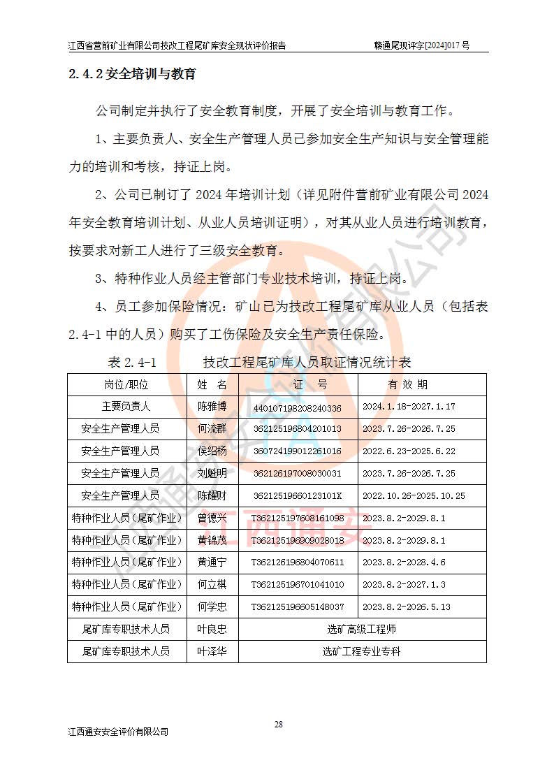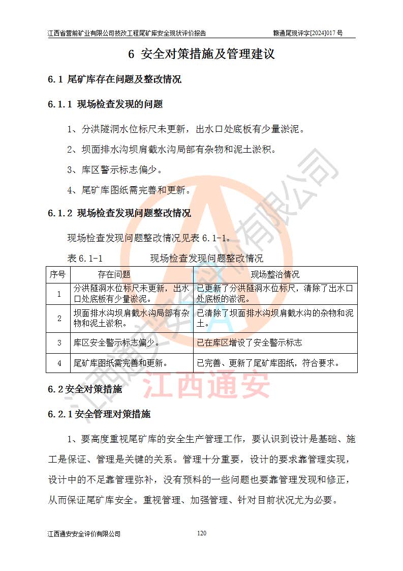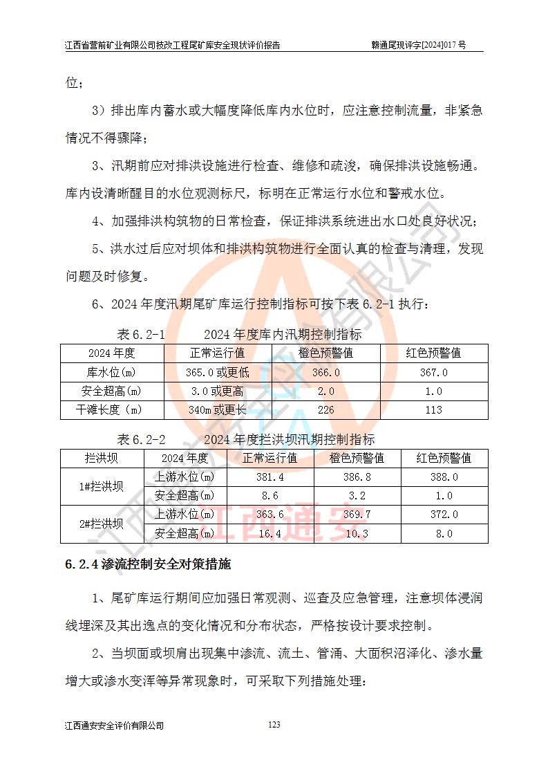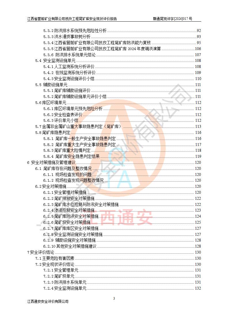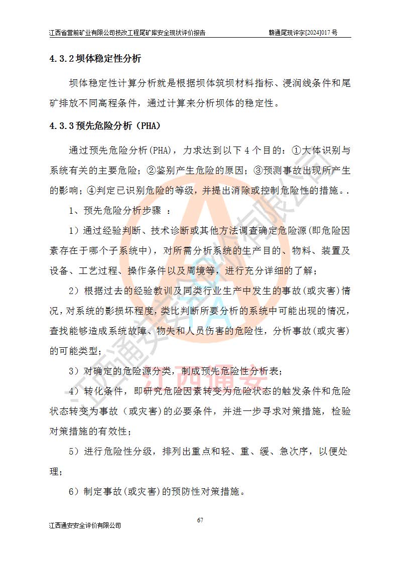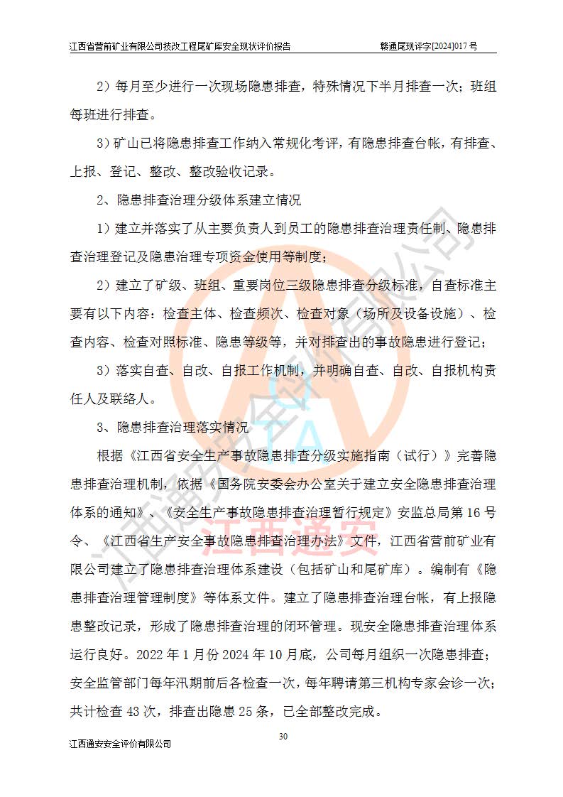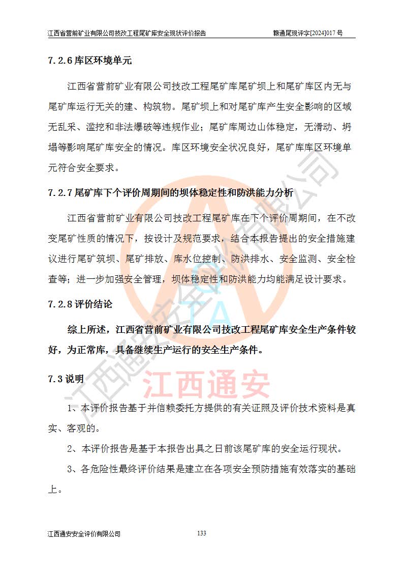 江西省營(yíng)前礦業(yè)有限公司于2003年12月16日成立,位于贛州市上猶縣營(yíng)前鎮(zhèn)焦里村境內(nèi),公司注冊(cè)資本10000萬元,法定**人陳雅博,礦區(qū)地理坐標(biāo):東經(jīng)114°18′30″~114°19′00″,北緯25°52′35″~25°53′47″。公司經(jīng)營(yíng)范圍包括:鉛礦、鋅、鎢、銀地下開采、銷售。 江西省營(yíng)前礦業(yè)有限公司技改工程尾礦庫位于焦里鎢銀鉛鋅礦區(qū),處于上猶縣水巖鄉(xiāng)井子村坑尾自然村境內(nèi),山谷型尾礦庫,溝谷呈“V”字形展布,技改工程尾礦庫原由福建省冶金工業(yè)設(shè)計(jì)院設(shè)計(jì),后由金建工程設(shè)計(jì)有限公司對(duì)該尾礦庫進(jìn)行了加高擴(kuò)容設(shè)計(jì),加高擴(kuò)容后總庫容503.14萬m3,壩高75.0m,為三等庫。尾礦庫主要由尾礦壩、庫外分洪系統(tǒng)(1#攔洪壩--1#分洪隧洞和2#攔洪壩--2#分洪隧洞--排水陡槽--消力池),庫內(nèi)排洪排水系統(tǒng)(排水斜槽—連接井—排水涵洞—排水隧洞—排水陡槽—消力池)等組成,尾礦壩壩型為初期壩+上游式堆積壩。 江西省營(yíng)前礦業(yè)有限公司技改工程尾礦庫于2021年12月30日取得江西省應(yīng)急管理廳版發(fā)的安全生產(chǎn)許可證,證書編號(hào)(贛)FM安許證字(2016)M1692號(hào),有限期從2022年1月18日到2025年1月17日,為三年期。依照《非煤礦礦山企業(yè)安全生產(chǎn)許可證延期換證工作》的通知,根據(jù)***《安全生產(chǎn)許可證條例》、《江西省安全生產(chǎn)條例》、《非煤礦山安全生產(chǎn)許可證實(shí)施辦法》、《江西省非煤礦礦山企業(yè)安全生產(chǎn)許可證辦法》規(guī)定的要求,受江西省營(yíng)前礦業(yè)有限公司委托,我公司承擔(dān)了技改工程尾礦庫延期換證安全現(xiàn)狀評(píng)價(jià)工作。 |