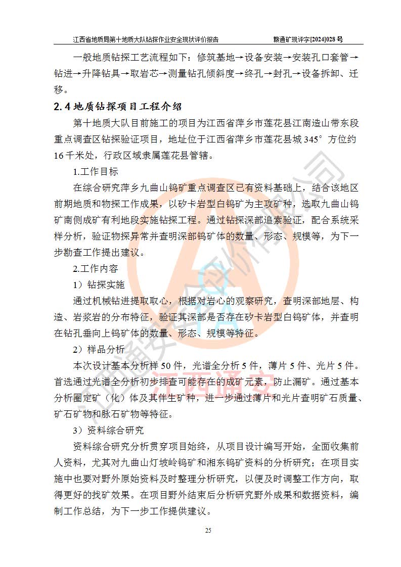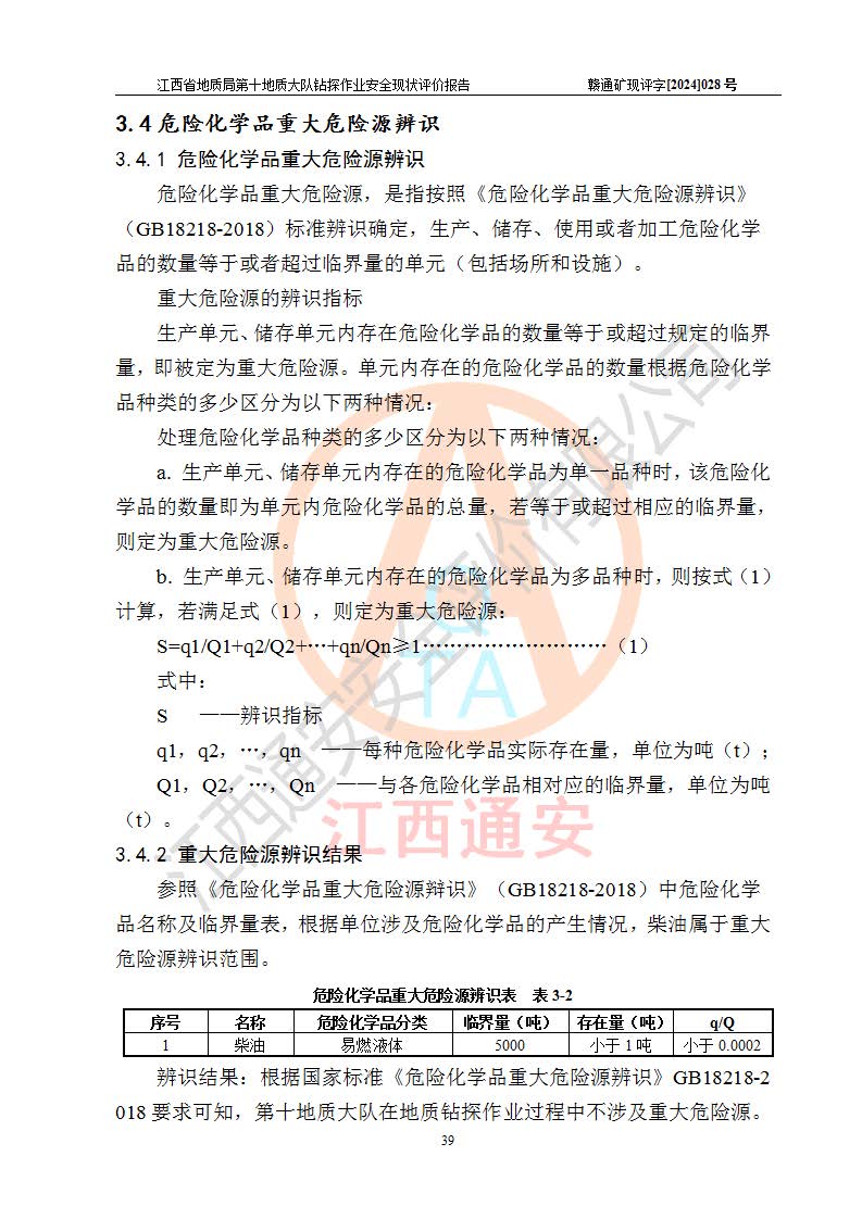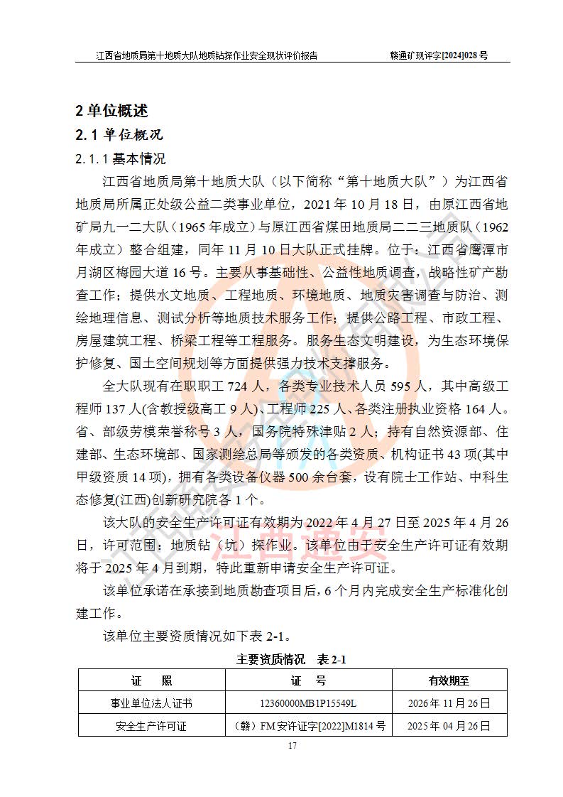項(xiàng)目簡(jiǎn)介 | 江西省地質(zhì)局第十地質(zhì)大隊(duì)為省地質(zhì)局所屬正處級(jí)公益二類事業(yè)單位,2021年10月18日由原省地礦局九一二大隊(duì)(1965年成立)與原省煤田地質(zhì)局二二三地質(zhì)隊(duì)(1962年成立)整合組建,同年11月10日大隊(duì)正式掛牌,位于:江西省鷹潭市梅園大道16號(hào)。主要從事基礎(chǔ)性、公益性地質(zhì)調(diào)查,戰(zhàn)略性礦產(chǎn)勘查工作;提供水文地質(zhì)、工程地質(zhì)、環(huán)境地質(zhì)、地質(zhì)災(zāi)害調(diào)查與防治、測(cè)繪地理信息、測(cè)試分析等地質(zhì)技術(shù)服務(wù)工作;提供公路工程、市政工程、房屋建筑工程、橋梁工程等工程服務(wù)。服務(wù)生態(tài)文明建設(shè),為生態(tài)環(huán)境保護(hù)修復(fù)、國土空間規(guī)劃等方面提供強(qiáng)力技術(shù)支撐服務(wù)。 該隊(duì)現(xiàn)有各類資質(zhì)49項(xiàng),擁有區(qū)域地質(zhì)調(diào)查、液體礦產(chǎn)勘查、固體礦產(chǎn)勘查、水工環(huán)地質(zhì)調(diào)查、氣體礦產(chǎn)勘查、地質(zhì)鉆探、地質(zhì)災(zāi)害評(píng)估、地質(zhì)災(zāi)害勘查設(shè)計(jì)、工程測(cè)量、地理信息系統(tǒng)工程,界線與不動(dòng)產(chǎn)測(cè)繪、工程勘察專業(yè)類(巖土工程)等**12項(xiàng);地質(zhì)災(zāi)害評(píng)估和勘查設(shè)計(jì)、地質(zhì)災(zāi)害監(jiān)理、測(cè)繪航空攝影(無人飛行器航攝)、大地測(cè)量、攝影測(cè)量與遙感、海洋測(cè)繪、地圖編制、土地規(guī)劃機(jī)、工程勘察專業(yè)類(水文地質(zhì)勘察)、工程設(shè)計(jì)環(huán)境工程專項(xiàng)(污染修復(fù)工程)、江西省環(huán)境污染治理工程設(shè)計(jì)能力評(píng)價(jià)等乙級(jí)20項(xiàng);工程施工類具有市政公用工程施工總承包、建筑工程施工總承包、建筑裝修裝飾工程專業(yè)承包、鋼結(jié)構(gòu)工程專業(yè)承包、地基與基礎(chǔ)工程、**工程專業(yè)承包等二級(jí)資質(zhì)7項(xiàng);具有檢測(cè)類資質(zhì)三項(xiàng):中國合格評(píng)定****委員會(huì)實(shí)驗(yàn)室**證書(CNAS資質(zhì)證書)、檢驗(yàn)檢測(cè)機(jī)構(gòu)****證書(CMA資格證書)、農(nóng)產(chǎn)品質(zhì)量安全檢測(cè)機(jī)構(gòu)考核合格證書(CATL資質(zhì)證書),檢測(cè)能力具有16大類,74小類,3600多項(xiàng)檢測(cè)參數(shù),業(yè)務(wù)領(lǐng)域涵蓋地質(zhì)、環(huán)境、農(nóng)業(yè)、水利、食品等。并通過了質(zhì)量管理體系、環(huán)境管理體系和職業(yè)健康安全管理體系認(rèn)證。 該大隊(duì)上一輪安全生產(chǎn)許可證**期為2022年4月27日至2025年4月26日,許可范圍:地質(zhì)鉆(坑)探作業(yè)。該單位由于安全生產(chǎn)許可證**期將于2025年4月到期,特此重新申請(qǐng)安全生產(chǎn)許可證。按照《安全生產(chǎn)法》、《礦山安全法》和《關(guān)于做好非煤礦山企業(yè)安全生產(chǎn)許可證延期換證工作的通知》等有關(guān)規(guī)定,該單位在申請(qǐng)安全生產(chǎn)許可證前應(yīng)進(jìn)行安全現(xiàn)狀評(píng)價(jià)。 | |||||
