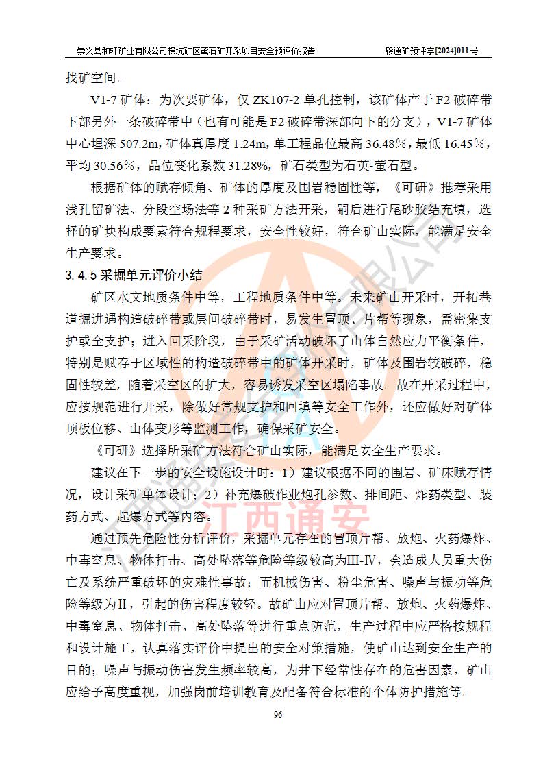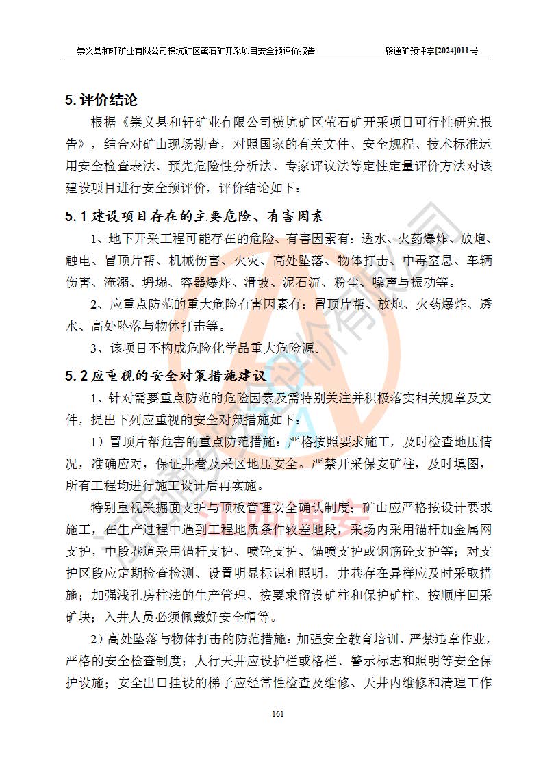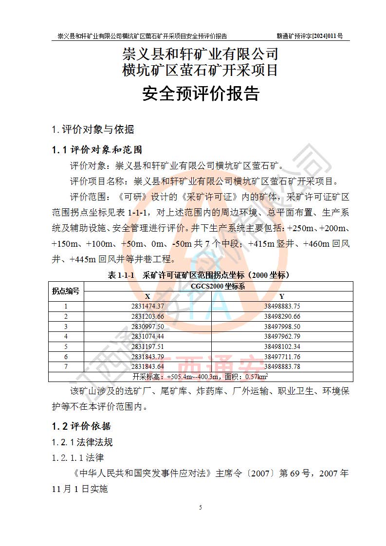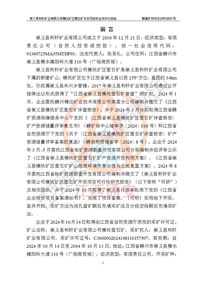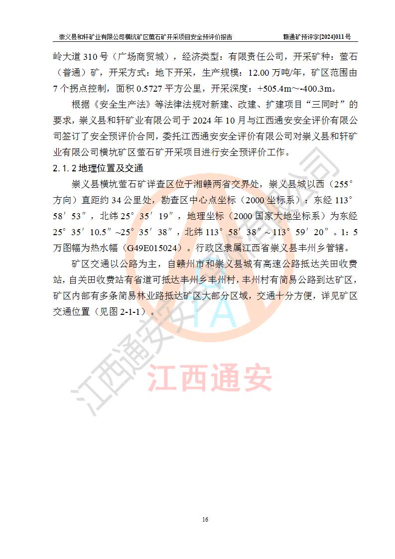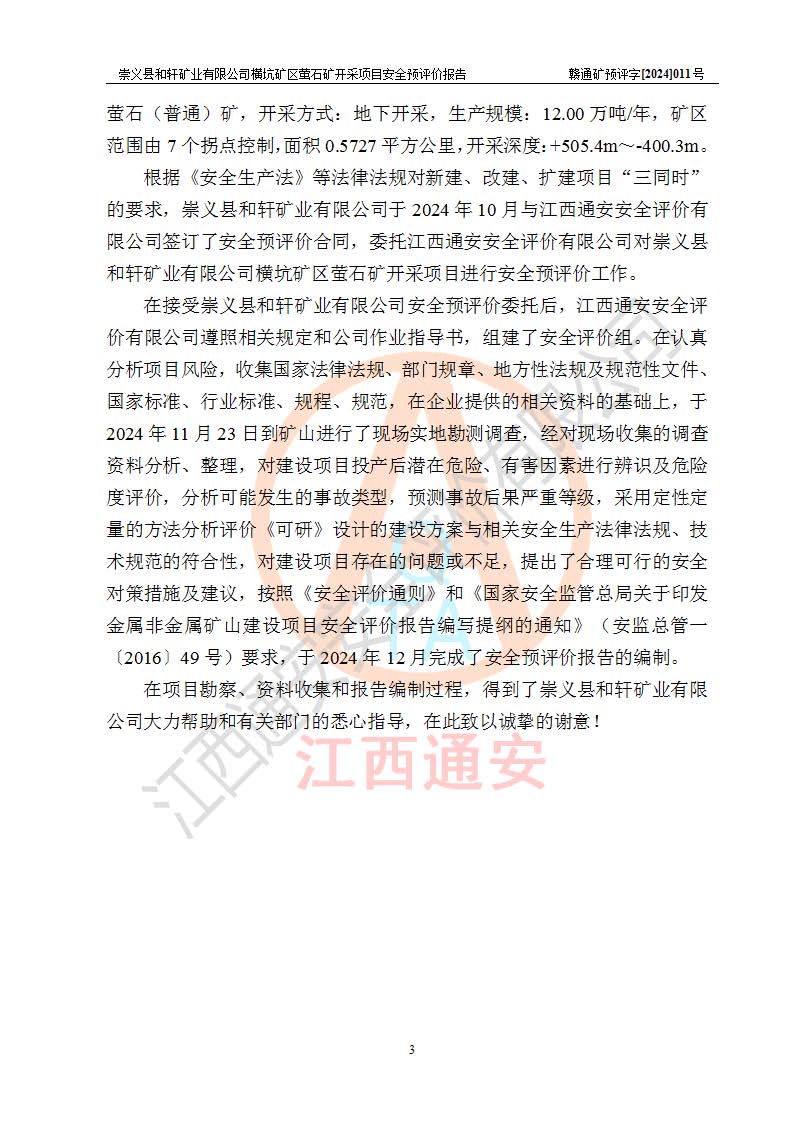 報告名稱 | 崇義縣和軒礦業(yè)有限公司橫坑礦區(qū)螢石礦開采項目安全預評價報告 | |||||