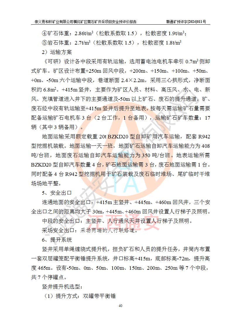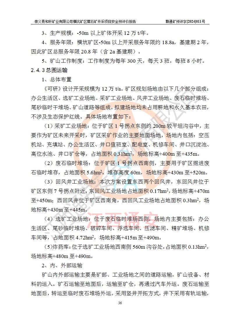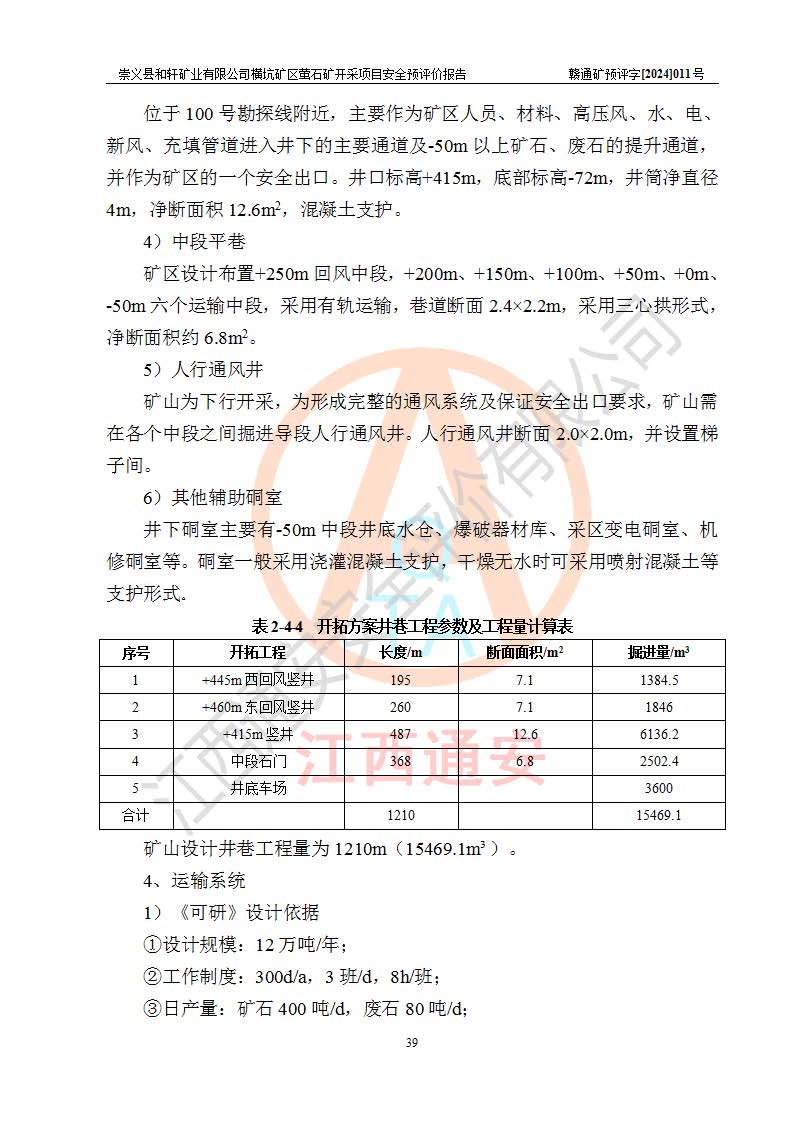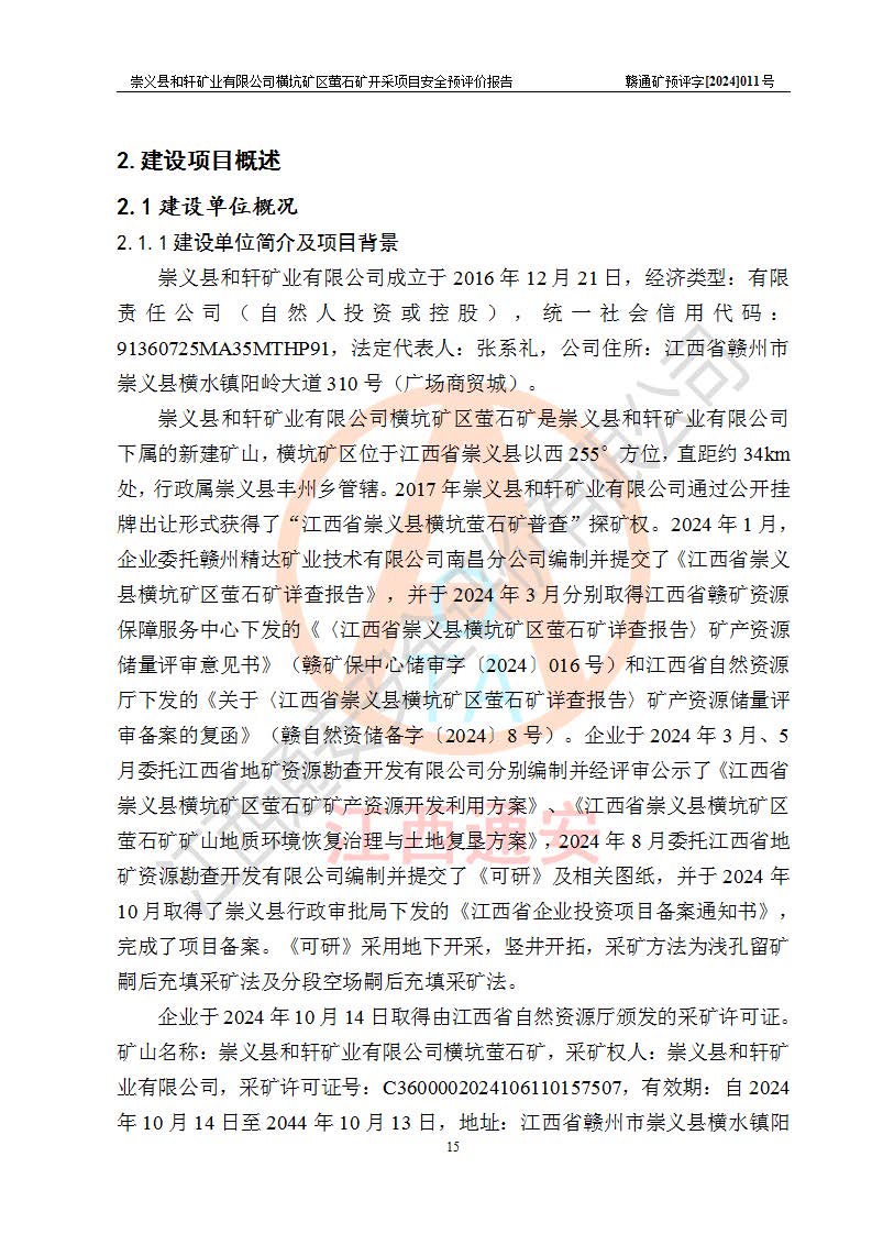 項目簡介 | 崇義縣和軒礦業(yè)有限公司成立于2016年12月21日,經(jīng)濟類型:有限責任公司(自然人投資或控股),統(tǒng)一社會信用代碼:91360725MA35MTHP91,法定**人:張系禮,公司住所:江西省贛州市崇義縣橫水鎮(zhèn)陽嶺大道310號(廣場商貿城)。 崇義縣和軒礦業(yè)有限公司橫坑礦區(qū)螢石礦是崇義縣和軒礦業(yè)有限公司下屬的新建礦山,橫坑礦區(qū)位于江西省崇義縣以西255°方位,直距約34km處,行政屬崇義縣豐州鄉(xiāng)管轄。2017年崇義縣和軒礦業(yè)有限公司通過公開掛牌出讓形式獲得了“江西省崇義縣橫坑螢石礦普查”探礦權。2024年1月,企業(yè)委托贛州精達礦業(yè)技術有限公司南昌分公司編制并提交了《江西省崇義縣橫坑礦區(qū)螢石礦詳查報告》,并于2024年3月分別取得江西省贛礦資源保障服務中心下發(fā)的《〈江西省崇義縣橫坑礦區(qū)螢石礦詳查報告〉礦產(chǎn)資源儲量評審意見書》(贛礦保中心儲審字〔2024〕016號)和江西省自然資源廳下發(fā)的《關于〈江西省崇義縣橫坑礦區(qū)螢石礦詳查報告〉礦產(chǎn)資源儲量評審備案的復函》(贛自然資儲備字〔2024〕8號)。企業(yè)于2024年3月、5月委托江西省地礦資源勘查開發(fā)有限公司分別編制并經(jīng)評審公示了《江西省崇義縣橫坑礦區(qū)螢石礦礦產(chǎn)資源開發(fā)利用方案》、《江西省崇義縣橫坑礦區(qū)螢石礦礦山地質環(huán)境恢復治理與土地復墾方案》,2024年8月委托江西省地礦資源勘查開發(fā)有限公司編制并提交了《崇義縣和軒礦業(yè)有限公司橫坑礦區(qū)螢石礦開采項目可行性研究報告》(以下簡稱“可研”)及相關圖紙,并于2024年10月取得了崇義縣行政審批局下發(fā)的《江西省企業(yè)投資項目備案通知書》,完成了項目備案?!犊裳小凡捎玫叵麻_采,豎井開拓,采礦方法為淺孔留礦嗣后充填采礦法及分段空場嗣后充填采礦法。 企業(yè)于2024年10月14日取得由江西省自然資源廳頒發(fā)的采礦許可證。礦山名稱:崇義縣和軒礦業(yè)有限公司橫坑螢石礦,采礦權人:崇義縣和軒礦業(yè)有限公司,采礦許可證號:C3600002024106110157507,**期:自2024年10月14日至2044年10月13日,地址:江西省贛州市崇義縣橫水鎮(zhèn)陽嶺大道310號(廣場商貿城),經(jīng)濟類型:有限責任公司,開采礦種:螢石(普通)礦,開采方式:地下開采,生產(chǎn)規(guī)模:12.00萬噸/年,礦區(qū)范圍由7個拐點控制,面積0.5727平方**,開采深度:+505.4m~-400.3m。 | |||||