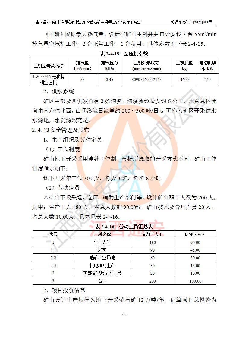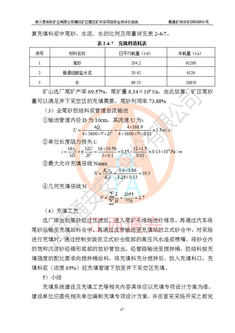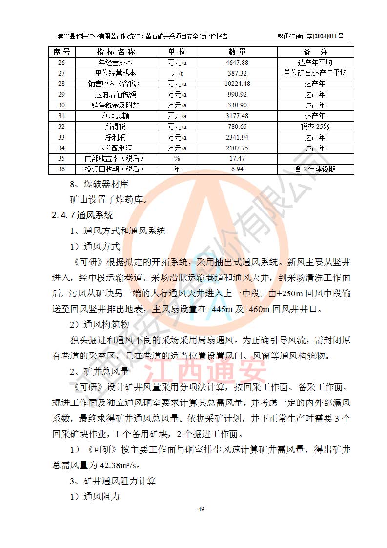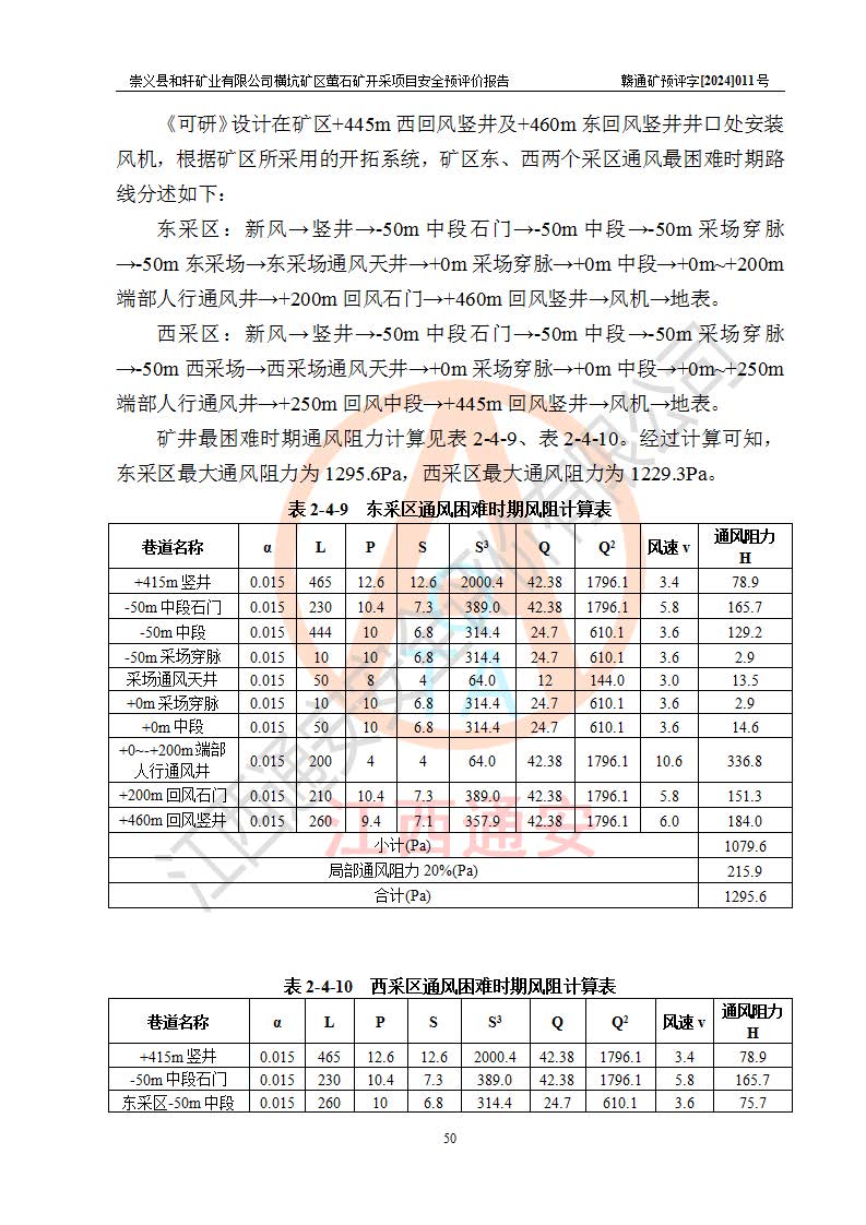 項目簡介 | 崇義縣和軒礦業(yè)有限公司成立于2016年12月21日,經(jīng)濟類型:有限責任公司(自然人投資或控股),統(tǒng)一社會信用代碼:91360725MA35MTHP91,法定**人:張系禮,公司住所:江西省贛州市崇義縣橫水鎮(zhèn)陽嶺大道310號(廣場商貿城)。 崇義縣和軒礦業(yè)有限公司橫坑礦區(qū)螢石礦是崇義縣和軒礦業(yè)有限公司下屬的新建礦山,橫坑礦區(qū)位于江西省崇義縣以西255°方位,直距約34km處,行政屬崇義縣豐州鄉(xiāng)管轄。2017年崇義縣和軒礦業(yè)有限公司通過公開掛牌出讓形式獲得了“江西省崇義縣橫坑螢石礦普查”探礦權。2024年1月,企業(yè)委托贛州精達礦業(yè)技術有限公司南昌分公司編制并提交了《江西省崇義縣橫坑礦區(qū)螢石礦詳查報告》,并于2024年3月分別取得江西省贛礦資源保障服務中心下發(fā)的《〈江西省崇義縣橫坑礦區(qū)螢石礦詳查報告〉礦產(chǎn)資源儲量評審意見書》(贛礦保中心儲審字〔2024〕016號)和江西省自然資源廳下發(fā)的《關于〈江西省崇義縣橫坑礦區(qū)螢石礦詳查報告〉礦產(chǎn)資源儲量評審備案的復函》(贛自然資儲備字〔2024〕8號)。企業(yè)于2024年3月、5月委托江西省地礦資源勘查開發(fā)有限公司分別編制并經(jīng)評審公示了《江西省崇義縣橫坑礦區(qū)螢石礦礦產(chǎn)資源開發(fā)利用方案》、《江西省崇義縣橫坑礦區(qū)螢石礦礦山地質環(huán)境恢復治理與土地復墾方案》,2024年8月委托江西省地礦資源勘查開發(fā)有限公司編制并提交了《崇義縣和軒礦業(yè)有限公司橫坑礦區(qū)螢石礦開采項目可行性研究報告》(以下簡稱“可研”)及相關圖紙,并于2024年10月取得了崇義縣行政審批局下發(fā)的《江西省企業(yè)投資項目備案通知書》,完成了項目備案?!犊裳小凡捎玫叵麻_采,豎井開拓,采礦方法為淺孔留礦嗣后充填采礦法及分段空場嗣后充填采礦法。 企業(yè)于2024年10月14日取得由江西省自然資源廳頒發(fā)的采礦許可證。礦山名稱:崇義縣和軒礦業(yè)有限公司橫坑螢石礦,采礦權人:崇義縣和軒礦業(yè)有限公司,采礦許可證號:C3600002024106110157507,**期:自2024年10月14日至2044年10月13日,地址:江西省贛州市崇義縣橫水鎮(zhèn)陽嶺大道310號(廣場商貿城),經(jīng)濟類型:有限責任公司,開采礦種:螢石(普通)礦,開采方式:地下開采,生產(chǎn)規(guī)模:12.00萬噸/年,礦區(qū)范圍由7個拐點控制,面積0.5727平方**,開采深度:+505.4m~-400.3m。 | |||||