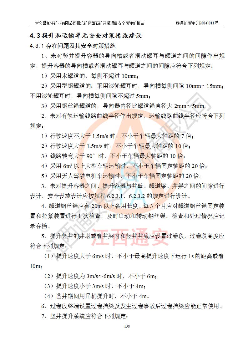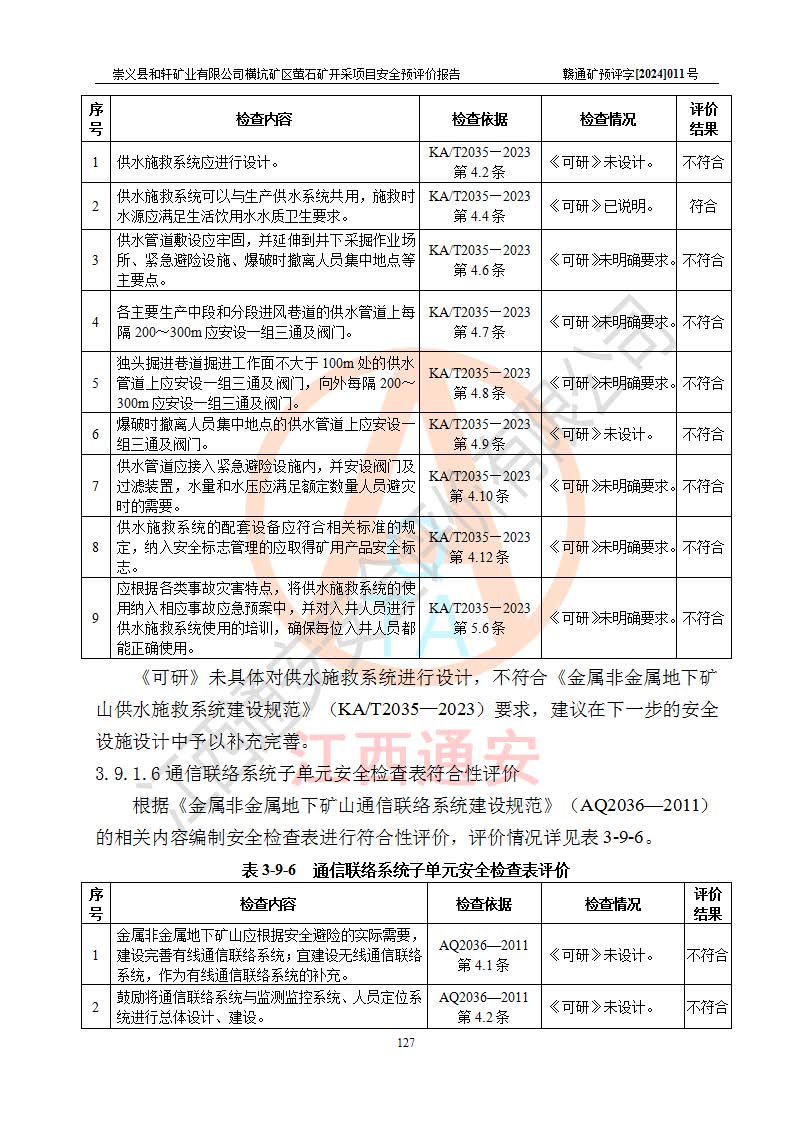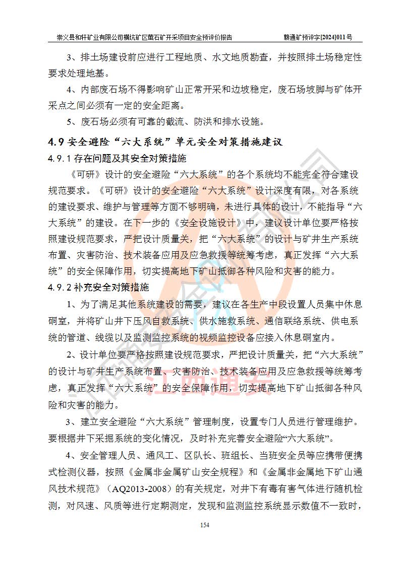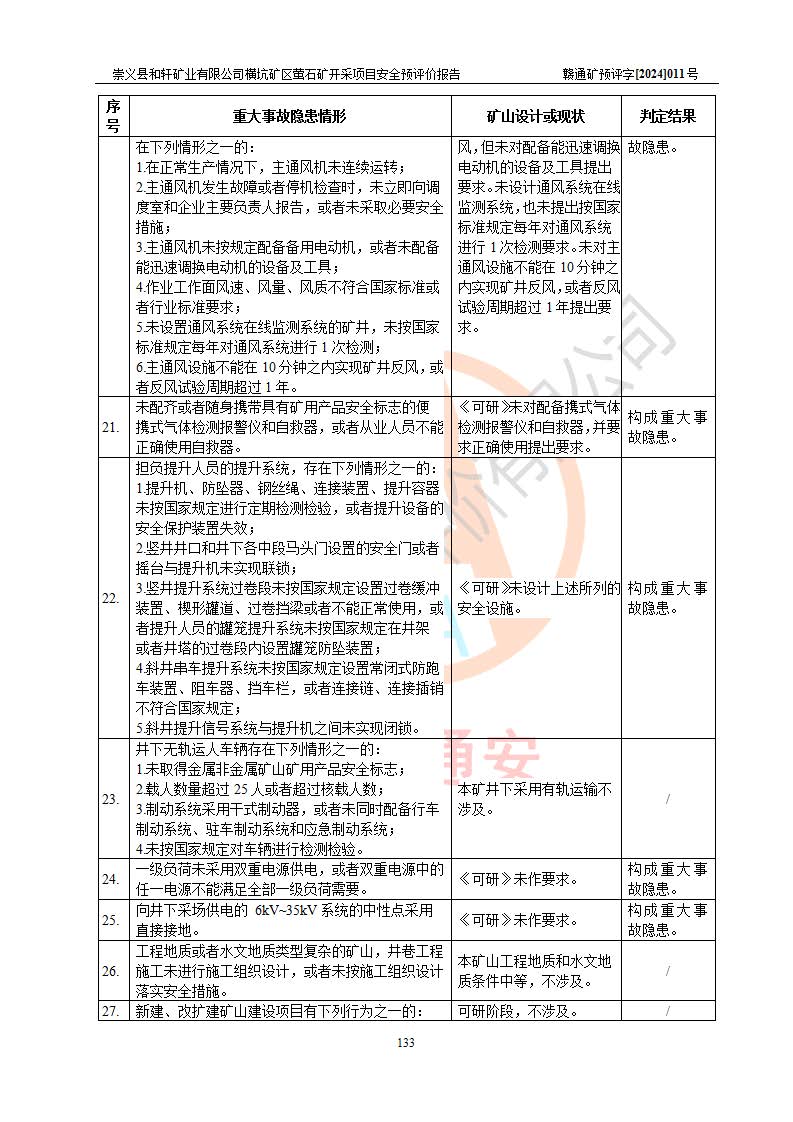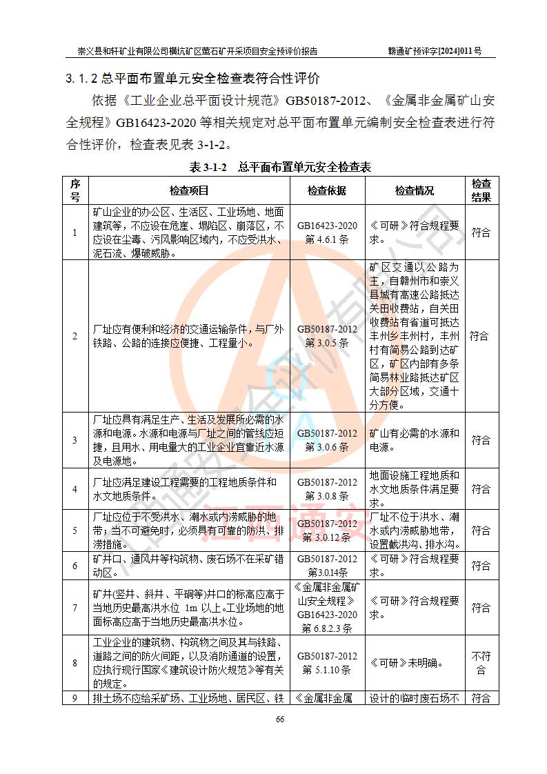 評價結論 | 崇義縣和軒礦業(yè)有限公司橫坑礦區(qū)螢石礦開采項目充分采納《可研》及本《安全預評價報告》中提出的安全對策措施與建議,并按下一步的《安全設施設計》進行建設施工,從安全生產(chǎn)角度符合**有關法律、法規(guī)、標準和規(guī)范的要求。 | |||||