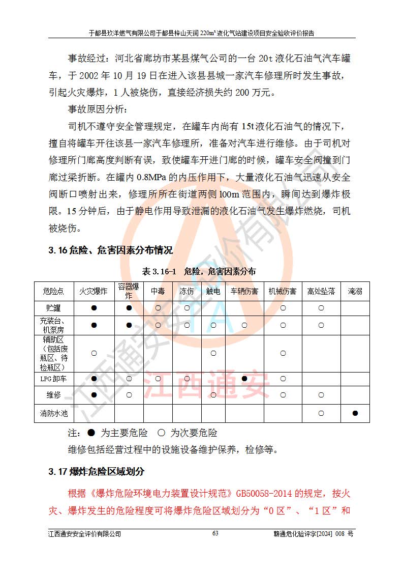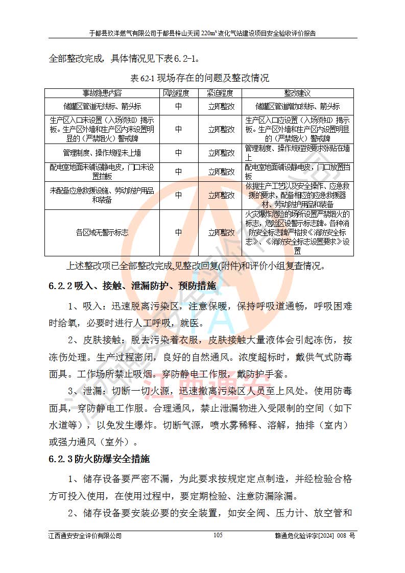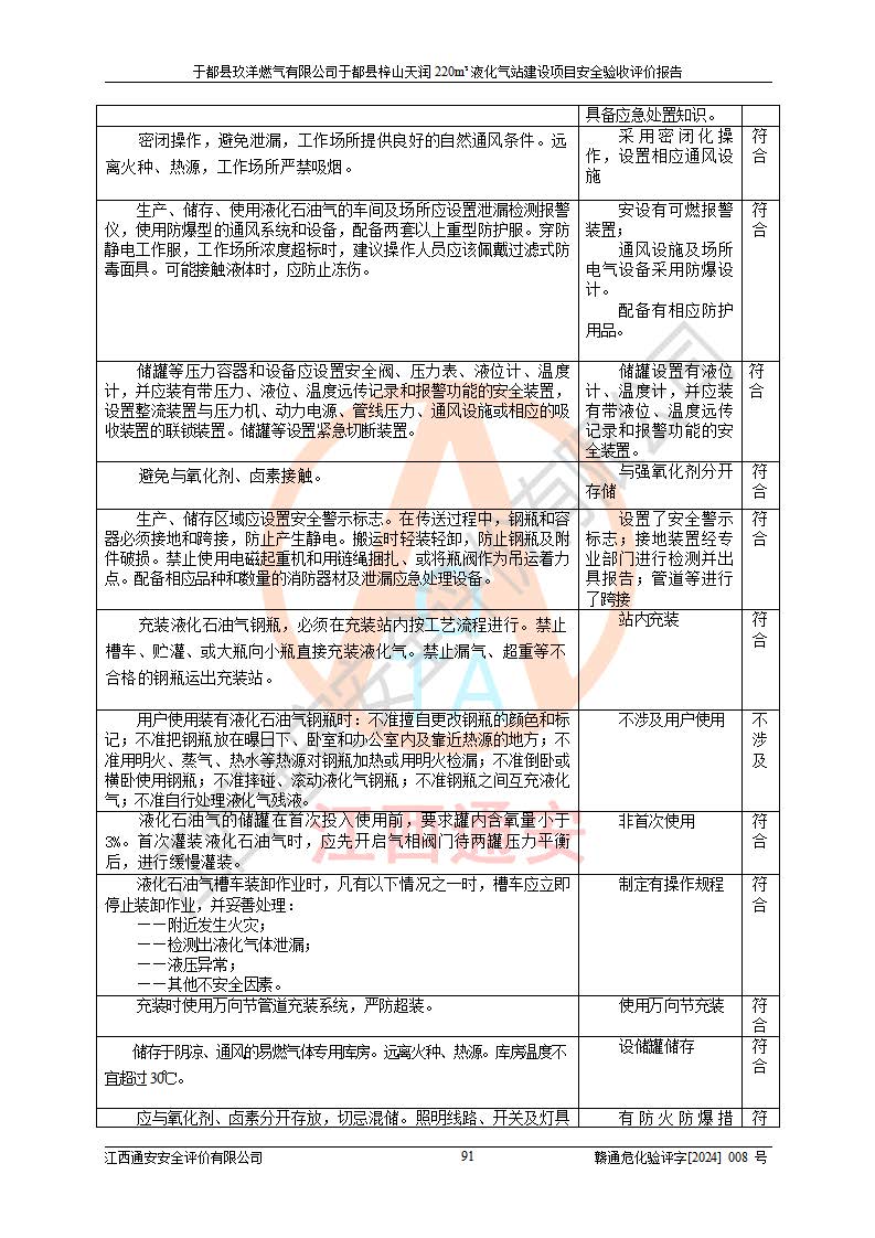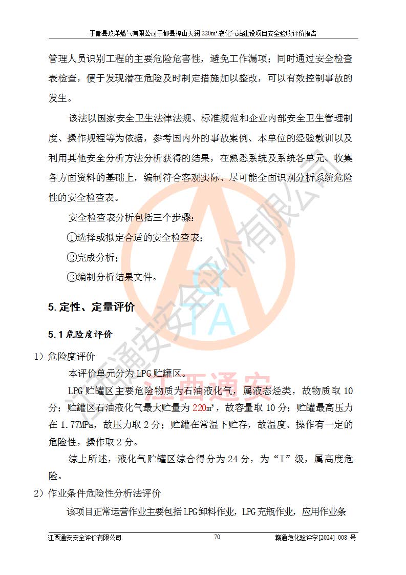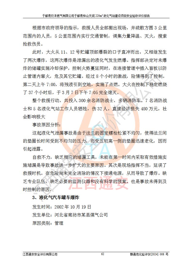 其它 | 根據(jù)**有關(guān)城市燃?xì)夤芾矸煞ㄒ?guī)、規(guī)章、標(biāo)準(zhǔn)、規(guī)范及于都縣玖洋燃?xì)庥邢薰咎峁┑挠嘘P(guān)資料,通過對(duì)該液化氣站的現(xiàn)場(chǎng)勘察,對(duì)液化氣站的主要危險(xiǎn)危害因素的分析,采用危險(xiǎn)度評(píng)價(jià)法、作業(yè)條件危險(xiǎn)性分析法等評(píng)價(jià)方法,對(duì)該液化氣站進(jìn)行安全驗(yàn)收評(píng)價(jià),總結(jié)如下: ⑴于都縣梓山天潤(rùn)220m3液化氣站周邊100m范圍內(nèi)無公共設(shè)施、學(xué)校、醫(yī)院及文物保護(hù)單位。該液化氣站選址和平面布置經(jīng)實(shí)測(cè)對(duì)照《液化石油氣供應(yīng)工程設(shè)計(jì)規(guī)范》(GB51142-2015)的要求,符合**和行業(yè)相關(guān)標(biāo)準(zhǔn)。 ⑵該液化氣站的主要危險(xiǎn)、有害因素是火災(zāi)、爆炸,容器爆炸,其次是觸電、機(jī)械傷害、物體打擊、高處墜落、**傷害、凍傷、中毒等。 ⑶該液化氣站儲(chǔ)存的LPG構(gòu)成了重大危險(xiǎn)源。LPG是易燃易爆的甲類氣體。制定的應(yīng)急救援預(yù)案應(yīng)加強(qiáng)演練,不斷完善應(yīng)急救援預(yù)案內(nèi)容。 ⑷危險(xiǎn)度評(píng)價(jià)中液化氣儲(chǔ)罐區(qū)為“I”級(jí),屬**危險(xiǎn);作業(yè)條件危險(xiǎn)性評(píng)價(jià)中LPG卸料單元為“比較危險(xiǎn),需要注意”、鋼瓶充裝單元為“比較危險(xiǎn),需要注意”;現(xiàn)場(chǎng)檢查表中,有應(yīng)急救援預(yù)案, 有應(yīng)急演練圖片記錄,符合《液化石油氣供應(yīng)工程設(shè)計(jì)規(guī)范》(GB51142-2015)的安全要求。 ⑸該液化氣站對(duì)儲(chǔ)罐、管道等設(shè)備等設(shè)施都進(jìn)行了檢驗(yàn)檢測(cè);消防、安全設(shè)施已完善,進(jìn)一步提高了設(shè)備和設(shè)施的完好性、可靠性。 ⑹該液化氣站有比較健全的安全管理制度、安全操作規(guī)程;有關(guān)人員經(jīng)過有關(guān)**主管部門培訓(xùn),設(shè)立了專職安全負(fù)責(zé)人,從組織機(jī)構(gòu)、安全生產(chǎn)管理上**了安全措施的基本落實(shí)。 綜上所述,本評(píng)價(jià)認(rèn)為于都縣玖洋燃?xì)庥邢薰居诙伎h梓山天潤(rùn)220m3液化氣站符合**有關(guān)城市燃?xì)夤芾矸煞ㄒ?guī)、規(guī)章、標(biāo)準(zhǔn)、規(guī)范的安全要求,滿足安全生產(chǎn)的需要。 該公司針對(duì)主要危險(xiǎn)、危害因素在設(shè)計(jì)和實(shí)施過程中采取了相應(yīng)的安全設(shè)施和技術(shù)措施,并做到了與主體工程同時(shí)設(shè)計(jì)、同時(shí)建設(shè)、同時(shí)投入使用。項(xiàng)目建立了安全生產(chǎn)管理體系以及各項(xiàng)安全生產(chǎn)管理制度,安全設(shè)施齊備并**,安全生產(chǎn)狀況良好,現(xiàn)場(chǎng)與設(shè)計(jì)圖紙一致,人員配置符合要求,特種作業(yè)人員持證上崗,隱患排查治理及時(shí),未發(fā)生人員傷亡及設(shè)備事故。該項(xiàng)目安全條件符合相關(guān)的安全法律、法規(guī)和標(biāo)準(zhǔn)規(guī)范的要求,滿足安全生產(chǎn)條件,符合安全經(jīng)營(yíng)要求。 | ||||
